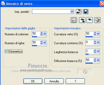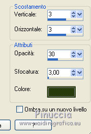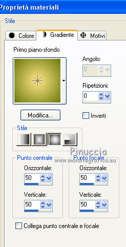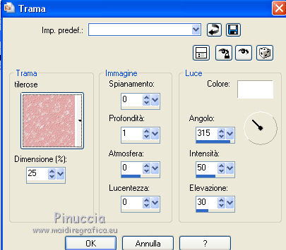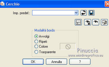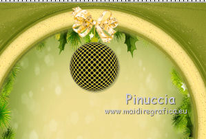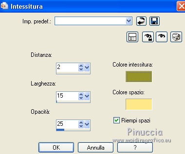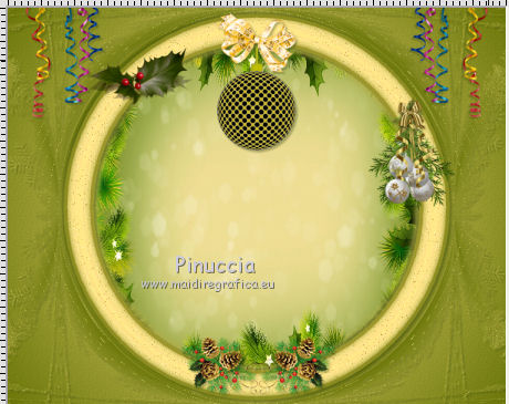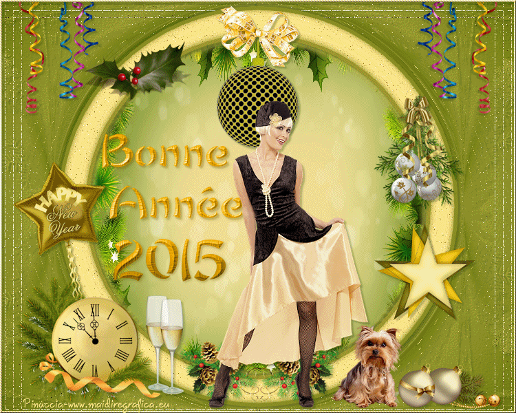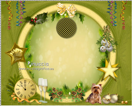 qui puoi trovare qualche risposta ai tuoi dubbi. Se l'argomento che ti interessa non è presente, ti prego di segnalarmelo. Questo tutorial è una creazione di ©Titoune e non può essere copiato su altri siti nè essere offerto per il download. Lo stesso vale per la mia traduzione. Il tutorial è stato creato con PSP X5, ma può essere eseguito anche con le altre versioni di PSP. Secondo la versione utilizzata (anteriore a PSP X) potresti ottenere dei risultati differenti. Dalla versione X4, il comando Immagine>Rifletti è stato sostituito con Immagine>Capovolgi in orizzontale, e il comando Immagine>Capovolgi con Immagine>Capovolgi in verticale. Nelle versioni X5 e X6, le funzioni sono state migliorate rendendo disponibile il menu Oggetti. Con il nuovo X7 sono tornati i comandi Rifletti/Capovolgi, ma con nuove differenze. Vedi la scheda sull'argomento qui Per tradure il tutorial ho usato PSP X. Occorrente: Un tube a scelta. Il resto del materiale qui Il tube utilizzato è di Ming Yue Filtri in caso di dubbi, ricorda di consultare la mia sezione filtri qui Penta.com - Jeans qui Filters Unlimited 2.0 qui Graphics Plus - Cross shadow qui DSB Flux - Bright Noise qui I filtri Penta, e Graphics Plus si possono usare da soli o importati in Filters Unlimited (come fare vedi qui) Se un filtro fornito appare con questa icona Animation Shop qui ![]() Metti la trama nella cartella Trame. Metti la selezione nella cartella Selezioni. 1. Imposta il colore di primo piano con #ffe887, e il colore di sfondo con #6b770b. Passa il colore di primo piano a Gradiente di primo piano/sfondo, stile Sprazzo di luce. ![]() 2. Apri una nuova immagine trasparente 750 x 600 pixels, e riempila con il gradiente.3. Apri l'elemento frame e vai a Modifica>Copia. Torna al tuo lavoro e vai a Modifica>Incolla come nuovo livello. Non spostarlo. 4. Attiva lo strumento Bacchetta magica ![]() e clicca al centro della cornice per selezionarla. Selezione>Modifica>Contrai - 5 pixels. Selezione>Modifica>Sfuma - 10 pixels. Livelli>Nuovo livello raster. Livelli>Disponi>Sposta giù. 5. Apri l'immagine 1604423 e vai a Modifica>Copia. Torna al tuo lavoro e vai a Modifica>Incolla nella selezione. Selezione>Deseleziona. Attiva nuovamente il livello della cornice. 6. Effetti>Effetti 3D>Sfalsa ombra, colore #283b0c. ![]() Ripeti l'Effetto Sfalsa ombra, cambiando verticale e orizzontale con -3. 7. Attiva il livello Raster 1. Selezione>Carica/Salva selezione>Carica selezione da disco. Cerca e carica la selezione "selection_scrap_ready_for_2015". ![]() Selezione>Innalza selezione a livello. Selezione>Deseleziona. 8. Effetti>Effetti di trama>Intessitura. Colore intessitura #97942a colore spazio #ffe887. ![]() 9. Effetti>Effetti geometrici>Cerchio. ![]() Effetti>Effetti 3D>Sfalsa ombra, colore #283b0c. ![]() Rinomina questo livello "motivo". 10. Attiva nuovamente il livello Raster 1. Effetti>Effetti di trama>Trama - seleziona la trama tilerose, con i seguenti settaggi. ![]() 11. Attiva il livello superiore. Apri l'elemento SDRITN-Elements (52), e vai a Modifica>Copia. Torna al tuo lavoro e vai a Modifica>Incolla come nuovo livello. Spostalo nella parte superiore della cornice.Vedi l'esempio finale. Porta questo livello sotto il livello della cornice. Effetti>Effetti 3D>Sfalsa ombra, con i settaggi precedenti. 12. Attiva nuovamente il livello superiore. Apri l'elemento SDRITN-Elements (46), e vai a Modifica>Copia. Torna al tuo lavoro e vai a Modifica>Incolla come nuovo livello. Spostalo nella parte superiore della cornice.![]() Effetti>Effetti 3D>Sfalsa ombra, con i settaggi precedenti. 13. Apri l'elemento SDRITN-Elements (74), e vai a Modifica>Copia. Torna al tuo lavoro e vai a Modifica>Incolla come nuovo livello. Spostalo in alto a sinistra.Vedi l'esempio finale. Effetti>Effetti 3D>Sfalsa ombra, con i settaggi precedenti. Livelli>Duplica. Immagine>Rifletti. 14. Apri l'elemento 0_a519a_d2b2f111_L, e vai a Modifica>Copia. Torna al tuo lavoro e vai a Modifica>Incolla come nuovo livello. Spostalo nella parte superiore della cornice.Vedi l'esempio finale. Effetti>Effetti 3D>Sfalsa ombra, con i settaggi precedenti. 15. Apri l'elemento 0_aceb5_6f20d0e1_L, e vai a Modifica>Copia. Torna al tuo lavoro e vai a Modifica>Incolla come nuovo livello. Spostalo nella parte superiore sinistra della cornice.Vedi l'esempio finale. Niente Sfalsa ombra. 16. Apri l'elemento 0_1038b0_3d36465d_L, e vai a Modifica>Copia. Torna al tuo lavoro e vai a Modifica>Incolla come nuovo livello. Spostalo nella parte superiore destra della cornice.![]() Effetti>Effetti 3D>Sfalsa ombra, con i settaggi precedenti. 17. Apri l'elemento SDRITN-Elements (26), e vai a Modifica>Copia. Torna al tuo lavoro e vai a Modifica>Incolla come nuovo livello. Spostalo nella parte destra della cornice.Vedi l'esempio finale. Effetti>Effetti 3D>Sfalsa ombra, con i settaggi precedenti. 18. Apri l'elemento 0_948de_df365690_L, e vai a Modifica>Copia. Torna al tuo lavoro e vai a Modifica>Incolla come nuovo livello. Spostalo nella parte inferiore destra della cornice.Vedi l'esempio finale. Effetti>Effetti 3D>Sfalsa ombra, con i settaggi precedenti. 19. Apri l'elemento YORKIE4523PJW, e vai a Modifica>Copia. Torna al tuo lavoro e vai a Modifica>Incolla come nuovo livello. Spostalo in basso a destra.![]() Effetti>Effetti 3D>Sfalsa ombra, con i settaggi precedenti. 20. Apri l'elemento SDRITN-Elements (34), e vai a Modifica>Copia. Torna al tuo lavoro e vai a Modifica>Incolla come nuovo livello. Spostalo nella parte inferiore sinistra della cornice.Vedi l'esempio finale. Effetti>Effetti 3D>Sfalsa ombra, con i settaggi precedenti. 21. Apri l'elemento SDRITN-Elements (14), e vai a Modifica>Copia. Torna al tuo lavoro e vai a Modifica>Incolla come nuovo livello. Spostalo nella parte inferiore sinistra della cornice.![]() Effetti>Effetti 3D>Sfalsa ombra, con i settaggi precedenti. 22. Apri, copia e incolla sul tuo lavoro come nuovo livello gli elementi: "wordart_bonne" "wordart_annee" e "wordart_2015". Posiziona gli ele