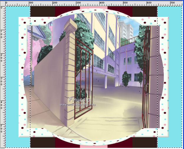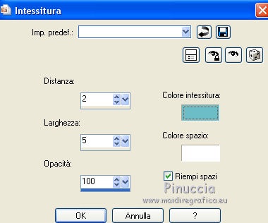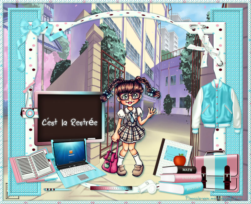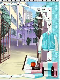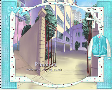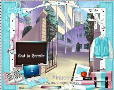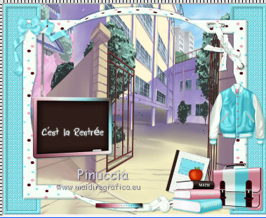 qui puoi trovare qualche risposta ai tuoi dubbi. Se l'argomento che ti interessa non è presente, ti prego di segnalarmelo. Questo tutorial è una creazione di ©Titoune e non può essere copiato su altri siti nè essere offerto per il download. Lo stesso vale per la mia traduzione. Il tutorial è stato creato con Corel17, ma può essere eseguito anche con le altre versioni di PSP. Secondo la versione utilizzata (anteriore a PSP X) potresti ottenere dei risultati differenti. Dalla versione X4, il comando Immagine>Rifletti è stato sostituito con Immagine>Capovolgi in orizzontale, e il comando Immagine>Capovolgi con Immagine>Capovolgi in verticale. Nelle versioni X5 e X6, le funzioni sono state migliorate rendendo disponibile il menu Oggetti. Con il nuovo X7 sono tornati i comandi Rifletti/Capovolgi, ma con nuove differenze. Vedi la scheda sull'argomento qui Per tradurre il tutorial ho usato PSP X. Occorrente: Un tube a scelta. Il resto del materiale qui ![]() 1. Apri una nuova immagine trasparente 750 x 600 pixels. Selezione>Seleziona tutto. 2. Apri l'elemento Paper1, e vai a Modifica>Copia. Torna al tuo lavoro e vai a Modifica>Incolla nella selezione. Selezione>Deseleziona. 3. Selezione>Modifica>Contrai - 45 pixels. Premi sulla tastiera il tasto CANC ![]() Selezione>Deseleziona. 4. Immagine>Ridimenisona, all'85%, tutti i livelli non selezionato. 5. Effetti>Effetti 3D>Smusso a incasso. ![]() 6. Effetti>Effetti geometrici>Sfera. ![]() 7. Clicca al centro della cornice per selezionarla con la bacchetta magica ![]() Selezione>Modifica>Espandi - 5 pixels. 8. Livelli>Nuovo livello raster. Livelli>Disponi>Sposta giù. Apri l'immagine school_background_by_eudetenis-d5ok9ie e vai a Modifica>Copia. Torna al tuo lavoro e vai a Modifica>Incolla nella selezione. Selezione>Deseleziona. 9. Selezione>Seleziona tutto. Livelli>Nuovo livello raster. Livelli>Disponi>Sposta giù. 10. Apri l'elemento Paper 3, e vai a Modifica>Copia. Torna al tuo lavoro e vai a Modifica>Incolla nella selezione. Selezione>Deseleziona. 11. Seleziona le due strisce blu con la bacchetta magica , tolleranza 10,![]() Selezione>Innalza selezione a livello. 12. Effetti>Effetti di trama>Intessitura. colore intessitura #6cbdc5; colore spazio bianco #ffffff. ![]() 13. Selezione>Mobile. Selezione>Immobilizza. Selezione>Modifica>Contrai - 10 pixels. Selezione>Inverti. Effetti>Effetti 3D>Smusso a incasso, con i settaggi precedenti. Effetti>Effetti 3D>Sfalsa ombra, colore #145e66. ![]() Ripeti l'Effetto Sfalsa ombra, cambiando verticale e orizzontale con -3. 14. Selezione>Seleziona tutto. Attiva nuovamente il livello inferiore. Premi sulla tastiera il tasto CANC ![]() 15. Apri l'immagine school_background_by_eudetenis-d5ok9ie e vai a Modifica>Copia. Torna al tuo lavoro e vai a Modifica>Incolla nella selezione. Selezione>Deseleziona. Attiva il livello della cornice. Effetti>Effetti 3D>Sfalsa ombra, con i settaggi precedenti. 16. Apri l'elemento Bow2, e vai a Modifica>Copia. Torna al tuo lavoro e vai a Modifica>Incolla come nuovo livello. Spostalo in alto a sinistra.Vedi l'esempio finale. Effetti>Effetti 3D>Sfalsa ombra, colore #145e66. ![]() 17. Apri l'elemento Eyelet, e vai a Modifica>Copia. Torna al tuo lavoro e vai a Modifica>Incolla come nuovo livello. Spostalo in alto a destra.Vedi l'esempio finale. Effetti>Effetti 3D>Sfalsa ombra, con i settaggi precedenti. 18. Apri l'elemento Jacket, e vai a Modifica>Copia. Torna al tuo lavoro e vai a Modifica>Incolla come nuovo livello. Spostalo sulla parte destra della cornice.![]() Effetti>Effetti 3D>Sfalsa ombra, con i settaggi precedenti. 19. Apri l'elemento Book Bag, e vai a Modifica>Copia. Torna al tuo lavoro e vai a Modifica>Incolla come nuovo livello. Spostalo in basso a destra.Vedi l'esempio finale. Effetti>Effetti 3D>Sfalsa ombra, con i settaggi precedenti. 20. Apri l'elemento Notebook2, e vai a Modifica>Copia. Torna al tuo lavoro e vai a Modifica>Incolla come nuovo livello. Spostalo nella parte inferiore.Vedi l'esempio finale. Effetti>Effetti 3D>Sfalsa ombra, con i settaggi precedenti. 21. Apri l'elemento Books, e vai a Modifica>Copia. Torna al tuo lavoro e vai a Modifica>Incolla come nuovo livello. Spostalo in basso.![]() Effetti>Effetti 3D>Sfalsa ombra, con i settaggi precedenti. 22. Apri l'elemento Whistle, e vai a Modifica>Copia. Torna al tuo lavoro e vai a Modifica>Incolla come nuovo livello. Spostalo nella parte inferiore.Vedi l'esempio finale. Effetti>Effetti 3D>Sfalsa ombra, con i settaggi precedenti. 23. Apri l'elemento Ruler, e vai a Modifica>Copia. Torna al tuo lavoro e vai a Modifica>Incolla come nuovo livello. Spostalo in basso.Vedi l'esempio finale. Effetti>Effetti 3D>Sfalsa ombra, con i settaggi precedenti. 24. Apri l'elemento Chalkboard, e vai a Modifica>Copia. Torna al tuo lavoro e vai a Modifica>Incolla come nuovo livello. Spostalo a sinistra.Vedi l'esempio finale. Effetti>Effetti 3D>Sfalsa ombra, con i settaggi precedenti. 25. Apri l'elemento wordart, e vai a Modifica>Copia. Torna al tuo lavoro e vai a Modifica>Incolla come nuovo livello. Immagine>Ridimensiona, al 40%, tutti i livelli non selezionato. Posiziona l'elemento sulla lavagna.![]() Effetti>Effetti 3D>Sfalsa ombra, con i settaggi precedenti. 26. Apri l'elemento Laptop, e vai a Modifica>Copia. Torna al tuo lavoro e vai a Modifica>Incolla come nuovo livello. Spostalo in basso a sinistra.Vedi l'esempio finale. Effetti>Effetti 3D>Sfalsa ombra, con i settaggi precedenti. 27. Apri l'elemento Planner, e vai a Modifica>Copia. Torna al tuo lavoro e vai a Modifica>Incolla come nuovo livello. Spostalo in basso a sinistra.Vedi l'esempio finale. Effetti>Effetti 3D>Sfalsa ombra, con i settaggi precedenti. 28. Apri l'elemento Pen3, e vai a Modifica>Copia. Torna al tuo lavoro e vai a Modifica>Incolla come nuovo livello. Spostalo nella parte inferiore.Vedi l'esempio finale. Effetti>Effetti 3D>Sfalsa ombra, con i settaggi precedenti. 29. Apri l'elemento Clip1, e vai a Modifica>Copia. Torna al tuo lavoro e vai a Modifica>Incolla c