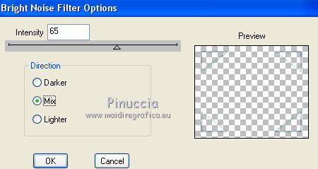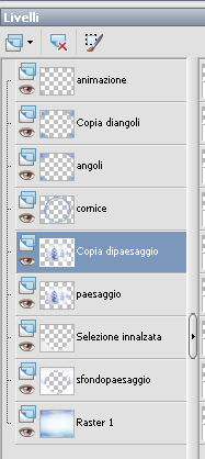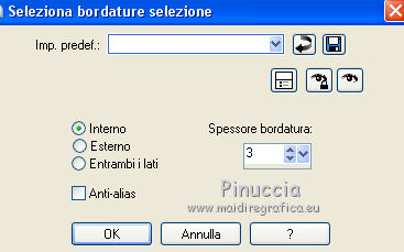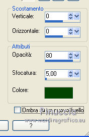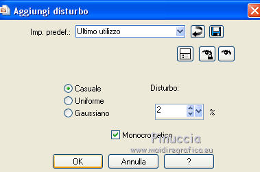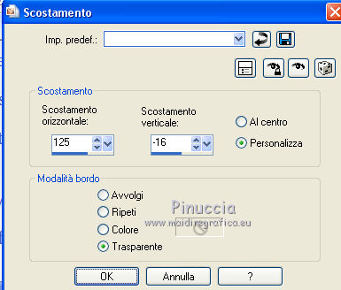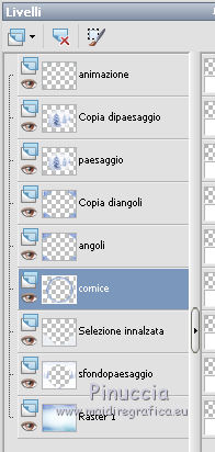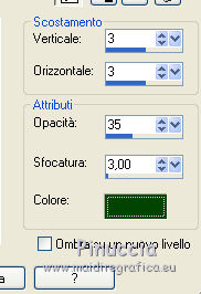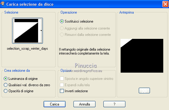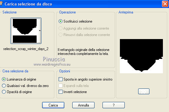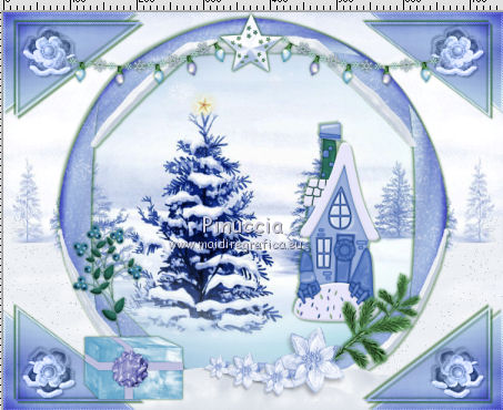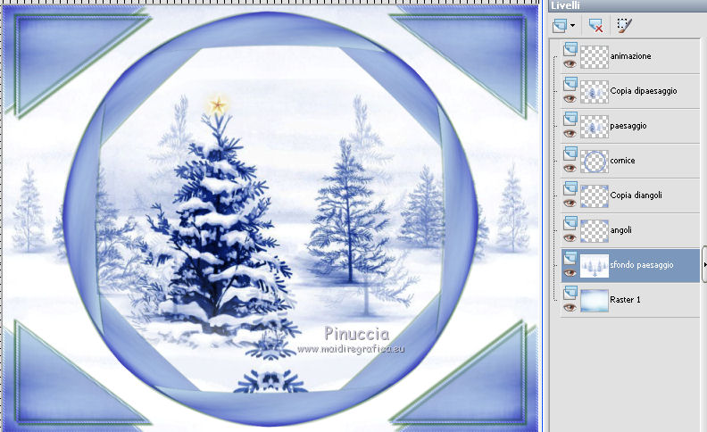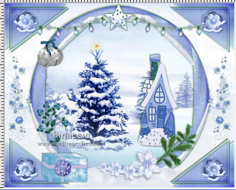 qui puoi trovare qualche risposta ai tuoi dubbi. Se l'argomento che ti interessa non è presente, ti prego di segnalarmelo. Questo tutorial è una creazione di ©Titoune e non può essere copiato su altri siti nè essere offerto per il download. Lo stesso vale per la mia traduzione. Il tutorial è stato creato con PSP X5, ma può essere eseguito anche con le altre versioni di PSP. Secondo la versione utilizzata (anteriore a PSP X) potresti ottenere dei risultati differenti. Dalla versione X4, il comando Immagine>Rifletti è stato sostituito con Immagine>Capovolgi in orizzontale, e il comando Immagine>Capovolgi con Immagine>Capovolgi in verticale. Nelle versioni X5 e X6, le funzioni sono state migliorate rendendo disponibile il menu Oggetti. Con il nuovo X7 sono tornati i comandi Rifletti/Capovolgi, ma con nuove differenze. Vedi la scheda sull'argomento qui Per tradure il tutorial ho usato PSP X. Occorrente: Un tube a scelta. Il resto del materiale qui Il tube utilizzato è di Belles Graphics Filtri in caso di dubbi, ricorda di consultare la mia sezione filtri qui Simple - Top Left Mirror qui Alien Skin Eye Candy 5 Nature - Snow Drift qui Penta.com - Jeans qui ![]() Metti la maschera 20-20 nella cartella Maschere. Metti le selezioni nella cartella Selezioni. 1. Apri una nuova immagine trasparente 750 x 600 pixels. Selezione>Seleziona tutto. 2. Apri l'elemento hpd_OAWD_P8, e vai a Modifica>Copia. Torna al tuo lavoro e vai a Modifica>Incolla nella selezione. Selezione>Deseleziona. Livelli>Duplica. Chiudi momentaneamente il livello Raster 1, e rimani posizionato sul livello della copia. 3. Selezione>Carica/Salva selezione>Carica selezione da disco. Cerca e carica la selezione "selection_scrap_winter_days". ![]() Selezione>Inverti. Premi sulla tastiera il tasto CANC. Selezione>Deseleziona. Effetti>Plugins>Simmple - Top Left Mirror. Rinomina questo livello "angoli". 4. Selezione>Seleziona tutto. Selezione>Mobile. Selezione>Immobilizza. Selezione>Modifica>Seleziona bordature selezione. ![]() Selezione>Innalza selezione a livello. Selezione>Deseleziona. Effetti>Plugins>Penta.com - Jeans, con i settaggi standard. ![]() Rinomina questo livello "bordo angoli". 5. Attiva il livello "angoli". Livelli>Duplica. 6. Immagine>Ridimensiona, al 95%, tutti i livelli non selezionato. Livelli>Disponi>Porta in alto. Attiva il livello "bordo angoli". Livelli>Duplica. 7. Immagine>Ridimensiona, al 95%, tutti i livelli non selezionato. Livelli>Disponi>Porta in alto. Rinomina questo livello "animazione". 8, Attiva nuovamente il livello "bordo angoli". Livelli>Unisci>Unisci giù. 9. Effetti>Effetti 3D>Sfalsa ombra, colore #034503. ![]() Ripeti l'Effetto Sfalsa ombra, cambiando verticale e orizzontale con -3. Ripeti l'Effetto Sfalsa ombra, sui livelli "copia di angoli" e sul livello "animazione". 10. Riapri il livello Raster 1, e attiva il livello "copia di angoli". Livelli>Duplica. 11. Effetti>Effetti geometrici>Cerchio. ![]() Livelli>Duplica. 12. Immagine>Ruota per gradi - 45 gradi a sinistra. ![]() Livelli>Unisci>Unisci giù. Rinomina questo livello "cornice". 13. Rimani posizionato su questo livello. Attiva lo strumento Bacchetta magica ![]() e clicca al centro della cornice per selezionarla. Selezione>Modifica>Espandi - 5 pixels. 14. Apri l'immagine del paesaggio 925911__christmas-snow-trees_p. Immagine>Rifletti. Maiuscola+D - 2 volte per duplicare l'immagine. puoi chiudere l'originale senza salvare le modifiche Sulla prima copia: Livelli>Innalza livello di sfondo. Immagine>Ridimensiona, al 65%, tutti i livelli non selezionato. 15. Livelli>Carica/Salva maschera>Carica maschera da disco. Cerca e carica la maschera 20-20. ![]() Livelli>Unisci>Unisci gruppo. Modifica>Copia. Torna al tuo lavoro e vai a Modifica>Incolla come nuovo livello. Porta questo livello sotto il livello "cornice". Selezione>Inverti. Premi sulla tastiera il tasto CANC. Rinomina questo livello "paesaggio". Livelli>Duplica, e cambia la modalità di miscelatura di questo livello in Moltiplica. Selezione>Deseleziona. 16. Attiva il livello Raster 1. Livelli>Nuovo livello raster. Selezione>Seleziona tutto. Attiva la seconda copia del paesaggio e vai a Modifica>Copia. Torna al tuo lavoro e vai a Modifica>Incolla nella selezione. Selezione>Deseleziona. Immagine>Rifletti. 17. Effetti>Effetti di riflesso>Specchio rotante. ![]() Rinomina questo livello "sfondo paesaggio". ![]() 18. Attiva nuovamente il livello "cornice". Con la bacchetta magica ![]() clicca al centro della cornice per selezionarla. Selezione>Modifica>Espandi - 5 pixels. 19. Attiva il livello "sfondo paesaggio". Premi sulla tastiera il tasto CANC. Selezione>Deseleziona. 20. Selezione>Carica/Salva selezione>Carica selezione da disco. Cerca e carica la selezione "selection_scrap_winter_days2". ![]() Selezione>Innalza selezione a livello. 21. Effetti>Plugins>Alien Skin Eye Candy 5 Nature - Snow Drift. ![]() 22. Regola>Aggiungi/Rimuovi disturbo>Aggiungi disturbo. ![]() Selezione>Deseleziona. 23. Attiva il livello "cornice". Effetti>Plugins>Alien Skin Eye Candy 5 Nature - Snow Drift. ![]() Effetti>Effetti 3D>Sfalsa ombra, con i settaggi precedenti. 24. Porta il livello della cornice sotto il livello "angoli". ![]() Porta i livelli del paesaggio e la copia sotto il livello "cornice". ![]() Rimani posizionato sul livello sotto la cornice. 25. Apri l'elemento hpd_OAWD_El41, e vai a Modifica>Copia. Torna al tuo lavoro e vai a Modifica>Incolla come nuovo livello. 26. Effetti>Effetti di immagine>Scostamento. ![]() Effetti>Effetti 3D>Sfalsa ombra, con i settaggi precedenti. 27. Attiva il livello superiore. Apri l'elemento hpd_OAWD_El69, e vai a Modifica>Copia. Torna al tuo lavoro e vai a Modifica>Incolla come nuovo livello. Spostalo nell'angolo in alto a sinistra.Vedi l'esempio finale. Effetti>Plugins>Simple - Top Left Mirror. Cambia la modalità di miscelatura di questo livello in Luminanza (esistente). 28. Effetti>Plugins>Alien Skin Eye Candy 5 Nature - Snow Drift. ![]() Effetti>Effetti 3D>Sfalsa omb