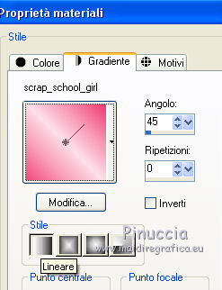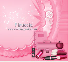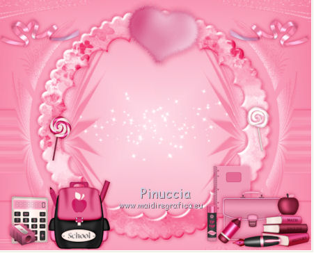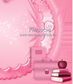 qui puoi trovare qualche risposta ai tuoi dubbi. Se l'argomento che ti interessa non è presente, ti prego di segnalarmelo. Questo tutorial è una creazione di ©Titoune e non può essere copiato su altri siti nè essere offerto per il download. Lo stesso vale per la mia traduzione. Il tutorial è stato creato con PSP X5, ma può essere eseguito anche con le altre versioni di PSP. Secondo la versione utilizzata (anteriore a PSP X) potresti ottenere dei risultati differenti. Dalla versione X4, il comando Immagine>Rifletti è stato sostituito con Immagine>Capovolgi in orizzontale, e il comando Immagine>Capovolgi con Immagine>Capovolgi in verticale. Nelle versioni X5 e X6, le funzioni sono state migliorate rendendo disponibile il menu Oggetti. Vedi la scheda sull'argomento qui Per tradure il tutorial ho usato PSP X. Occorrente: Un tube a scelta. Il resto del materiale qui Il tube utilizzato è di CibjBijoux. ![]() Metti il gradiente nella cartella gradienti. 1. Passa il colore di primo piano a Gradiente e seleziona il gradiente "scrap_school_girl", stile Lineare. ![]() 2. Apri una nuova immagine trasparente 750 x 600 pixels, e riempila con il gradiente.Livelli>Duplica. Immagine>Rifletti. Abbassa l'opacità di questo livello al 50%. Livelli>Unisci>Unisci giù. 3. Livelli>Duplica. Immagine>Ridimensiona, all'85%, tutti i livelli non selezionato. 4. Immagine>Ruota per gradi - 5 gradi a destra. ![]() 5. Effetti>Effetti di riflesso>Specchio rotante. ![]() 6. Effetti>Effetti geometrici>Sfera. ![]() Effetti>Effetti 3D>Sfalsa ombra, colore #da0a49. ![]() 7. Effetti>Effetti geometrici>Prospettiva orizzontale. ![]() Effetti>Effetti di riflesso>Specchio rotante, con i settaggi precedenti. Immagine>Ridimensiona, all'85%, tutti i livelli non selezionato. 8. Effetti>Effetti geometrici>Cerchio. ![]() 9. Effetti>Effetti geometrici>Prospettiva verticale. ![]() 10. Apri l'elemento SD-School Girl-frame2 e vai a Modifica>Copia. Torna al tuo lavoro e vai a Modifica>Incolla come nuovo livello. Non spostarlo. Effetti>Effetti 3D>Sfalsa ombra, con i settaggi precedenti. 11. Attiva il livello inferiore. Apri l'elemento SD-School Girl-sparkles3 e vai a Modifica>Copia. Torna al tuo lavoro e vai a Modifica>Incolla come nuovo livello. Non spostarlo. 12. Attiva il livello superiore. Apri l'elemento SD-School Girl-fluffyheart2 e vai a Modifica>Copia. Torna al tuo lavoro e vai a Modifica>Incolla come nuovo livello. Spostalo nella parte superiore della cornice.Vedi l'esempio finale. Effetti>Effetti 3D>Sfalsa ombra, con i settaggi precedenti. 13. Apri l'elemento SD-School Girl-curly ribbon1 e vai a Modifica>Copia. Torna al tuo lavoro e vai a Modifica>Incolla come nuovo livello. Spostalo in alto a sinistra.![]() Effetti>Effetti 3D>Sfalsa ombra, con i settaggi precedenti. Livelli>Duplica. Immagine>Rifletti. 14. Apri l'elemento SD-School Girl-lollipop2 e vai a Modifica>Copia. Torna al tuo lavoro e vai a Modifica>Incolla come nuovo livello. Spostalo nella parte destra della cornice.Vedi l'esempio finale. Effetti>Effetti 3D>Sfalsa ombra, con i settaggi precedenti. 15. Apri l'elemento SD-School Girl-note book2 e vai a Modifica>Copia. Torna al tuo lavoro e vai a Modifica>Incolla come nuovo livello. Spostalo nella parte inferiore destra della cornice.Vedi l'esempio finale. Effetti>Effetti 3D>Sfalsa ombra, con i settaggi precedenti. 16. Apri l'elemento SD-School Girl-briefcase1 e vai a Modifica>Copia. Torna al tuo lavoro e vai a Modifica>Incolla come nuovo livello. Spostalo nella parte inferiore destra della cornice.Vedi l'esempio finale. Effetti>Effetti 3D>Sfalsa ombra, con i settaggi precedenti. 17. Apri l'elemento SD-School Girl-books1 e vai a Modifica>Copia. Torna al tuo lavoro e vai a Modifica>Incolla come nuovo livello. Spostalo nell'angolo in basso a destra.Vedi l'esempio finale. Effetti>Effetti 3D>Sfalsa ombra, con i settaggi precedenti. 18. Apri l'elemento SD-School Girl-apple1 e vai a Modifica>Copia. Torna al tuo lavoro e vai a Modifica>Incolla come nuovo livello. Spostalo in basso a destra, sui libri.![]() Effetti>Effetti 3D>Sfalsa ombra, con i settaggi precedenti. 19. Apri l'elemento SD-School Girl-fountain pen2 e vai a Modifica>Copia. Torna al tuo lavoro e vai a Modifica>Incolla come nuovo livello. Spostalo in basso a destra.Vedi l'esempio finale. Effetti>Effetti 3D>Sfalsa ombra, con i settaggi precedenti. 20. Apri l'elemento SD-School Girl-colored pencil1 e vai a Modifica>Copia. Torna al tuo lavoro e vai a Modifica>Incolla come nuovo livello. Spostalo in basso a destra.Vedi l'esempio finale. Effetti>Effetti 3D>Sfalsa ombra, con i settaggi precedenti. 21. Apri l'elemento SD-School Girl-kids glue2 e vai a Modifica>Copia. Torna al tuo lavoro e vai a Modifica>Incolla come nuovo livello. Sposta anche questo elemento in basso a destra.![]() Effetti>Effetti 3D>Sfalsa ombra, con i settaggi precedenti. 22. Apri l'elemento SD-School Girl-school bag e vai a Modifica>Copia. Torna al tuo lavoro e vai a Modifica>Incolla come nuovo livello. Spostalo in basso a sinistra.Vedi l'esempio finale. Effetti>Effetti 3D>Sfalsa ombra, con i settaggi precedenti. 23. Apri l'elemento SD-School Girl-calculator1 e vai a Modifica>Copia. Torna al tuo lavoro e vai a Modifica>Incolla come nuovo livello. Spostalo in basso a sinistra.Vedi l'esempio finale. Effetti>Effetti 3D>Sfalsa ombra, con i settaggi precedenti. 24. Apri l'elemento SD-School Girl-pencil sharpener1 e vai a Modifica>Copia. Torna al tuo lavoro e vai a Modifica>Incolla come nuovo livello. Sposta anche questo elemento in basso a sinistra.Vedi l'esempio finale. Effetti>Effetti 3D>Sfalsa ombra, con i settaggi precedenti. 25. Apri l'elemento SD-School Girl-lollipop1 e vai a Modifica>Copia. Torna al tuo lavoro e vai a Modifica>Incolla come nuovo livello. Spostalo nella parte sinistra della cornice.![]() Effetti>Effetti 3D>Sfalsa ombra, con i settaggi precedenti. 26. Apri l'elemento wordart_back_to_school e vai a Modifica>Copia. Torna al tuo lavoro e vai a Modifica>Incolla come nuovo livello. Spos