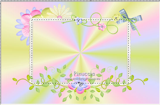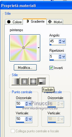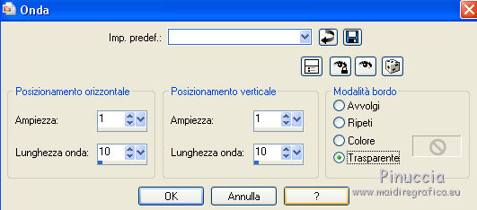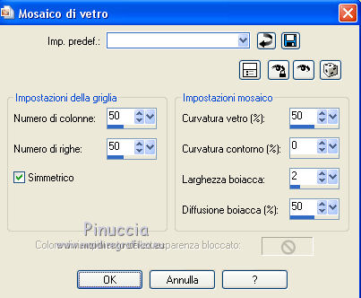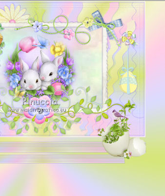 qui puoi trovare qualche risposta ai tuoi dubbi. Se l'argomento che ti interessa non è presente, ti prego di segnalarmelo. Questo tutorial è una creazione di ©Titoune e non può essere copiato su altri siti nè essere offerto per il download. Lo stesso vale per la mia traduzione. Il tutorial è stato creato con PSP X5, ma può essere eseguito anche con le altre versioni di PSP. Secondo la versione utilizzata (anteriore a PSP X) potresti ottenere dei risultati differenti. Dalla versione X4, il comando Immagine>Rifletti è stato sostituito con Immagine>Capovolgi in orizzontale, e il comando Immagine>Capovolgi con Immagine>Capovolgi in verticale. Nelle versioni X5 e X6, le funzioni sono state migliorate rendendo disponibile il menu Oggetti. Con il nuovo X7 sono tornati i comandi Rifletti/Capovolgi, ma con nuove differenze. Vedi la scheda sull'argomento qui Per tradurre il tutorial ho usato PSP X. Occorrente: Un tube a scelta. Il resto del materiale qui Tube utilizzato "martine_chatons" Ded Tubed. Filtri in caso di dubbi, ricorda di consultare la mia sezione filtri qui Filters Unlimited 2.0 qui VM Extravaganza - Shoutin qui Penta.com - Jeans qui I filtri VM Extravaganza e Penta.com si possono usare da soli o importati in Filters Unlimited (come fare vedi qui) Se un filtro fornito appare con questa icona ![]() Metti il gradiente nella cartella gradienti. Apri la maschera in PSP e minimizzala con il resto del materiale. 1. Passa il colore di primo piano a Gradiente, e seleziona il gradiente "printemps", con i seguenti settaggi. ![]() 2. Apri una nuova immagine trasparente 1080 x 700 pixels, e riempila con il gradiente.3. Apri l'elemento 4easterframe, e vai a Modifica>Copia. Torna al tuo lavoro e vai a Modifica>Incolla come nuovo livello. 4. Immagine>Ridimensiona, al 135%, tutti i livelli non selezionato. 5. Attiva il livello Raster 1. Livelli>Duplica. Effetti>Plugins>VM Extravaganza - Shoutin, con i settaggi standard. ![]() 6. Attiva lo strumento Bacchetta magica ![]() e clicca nella parte bianca per selezionarla. ![]() Premi sulla tastiera il tasto CANC ![]() Selezione>Deseleziona. Non preoccuparti se per il momento non vedrai nulla. Rinomina questo livello "shoutin". 7. Attiva il livello della cornice. Attiva lo strumento Selezione , rettangoloe traccia una selezione intorno alla cornice. ![]() 8. Attiva il livello "shoutin". Premi sulla tastiera il tasto CANC. Selezione>Deseleziona. 9. Rimani posizionato sul livello "shoutin". Effetti>Effetti 3D>Sfalsa ombra, colore #7d6def. ![]() 10. Effetti>Effetti di distorsione>Onda. ![]() 11. Livelli>Duplica. Effetti>Effetti geometrici>Prospettiva verticale. ![]() 12. Effetti>Effetti di riflesso>Specchio rotante. ![]() 13. Attiva il livello della cornice. Come prima, attiva lo strumento Selezione , rettangolo,e traccia una selezione intorno alla cornice. Livelli>Nuovo livello raster. Livelli>Disponi>Sposta giù. 14. Apri l'immagine images5IZR1L82, e vai a Modifica>Copia. Torna al tuo lavoro e vai a Modifica>Incolla nella selezione. Selezione>Deseleziona. Rinomina questo livello "motivo". 15. Apri l'elemento PennyParkerEasterMew032714032, e vai a Modifica>Copia. Torna al tuo lavoro e vai a Modifica>Incolla come nuovo livello. 16. Immagine>Ridimensiona, al 75%, tutti i livelli non selezionato. ![]() 17. Attiva il livello della cornice. Effetti>Effetti 3D>Sfalsa ombra, colore #7d6def. ![]() Ripeti l'Effetto Sfalsa ombra, cambiando verticale e orizzontale con -3. 18. Apri l'elemento lh_Birds_2006_AS, e vai a Modifica>Copia. Torna al tuo lavoro e vai a Modifica>Incolla come nuovo livello. Immagine>Rifletti. 19. Immagine>Ridimensiona, al 55%, tutti i livelli non selezionato. Spostalo in alto a sinistra.Vedi l'esempio finale. Effetti>Effetti 3D>Sfalsa ombra, colore #7d6def. ![]() 20. Apri l'elemento EasterBunny-12, e vai a Modifica>Copia. Torna al tuo lavoro e vai a Modifica>Incolla come nuovo livello. Spostalo a sinistra.Vedi l'esempio finale. Effetti>Effetti 3D>Sfalsa ombra, con i settaggi precedenti. 21. Apri l'elemento EasterBunny-11, e vai a Modifica>Copia. Torna al tuo lavoro e vai a Modifica>Incolla come nuovo livello. Spostalo a destra.Vedi l'esempio finale. Effetti>Effetti 3D>Sfalsa ombra, con i settaggi precedenti. 22. Apri l'elemento Bow 1, e vai a Modifica>Copia. Torna al tuo lavoro e vai a Modifica>Incolla come nuovo livello. Immagine>Ridimensiona, al 25%, tutti i livelli non selezionato. Spostalo sull'uovo a sinistra.Vedi l'esempio finale. Effetti>Effetti 3D>Sfalsa ombra, con i settaggi precedenti. Livelli>Duplica. Immagine>Rifletti. Posiziona questo nastro sull'uovo a destra.![]() 23. Attiva il livello inferiore. Selezione>Seleziona tutto. Selezione>Modifica>Contrai - 5 pixels. Selezione>Inverti. Selezione>Innalza selezione a livello. Livelli>Disponi>Porta in alto. Effetti>Plugins>Penta.com - Jeans, con i settaggi standard. ![]() Selezione>Deseleziona. 24. Livelli>Duplica. Attiva il livello sottostante dell'originale. Immagine>Ridimensiona, al 99%, tutti i livelli non selezionato. 25. Effetti>Effetti di trama>Mosaico di vetro. ![]() Effetti>Effetti 3D>Sfalsa ombra, con i settaggi precedenti. Porta questo livello sotto il livello "motivo". 26. Attiva nuovamente il livello superiore. Effetti>Effetti 3D>Sfalsa ombra, colore #7d6def. ![]() Ripeti l'Effetto Sfalsa ombra, cambiando verticale e orizzontale con -3. 27. Attiva il livello inferiore. Modifica>Copia. Selezione>Seleziona tutto. Immagine>Ritaglia la selezione. 28. Immagine>Dimensioni tela - 1280 x 1500 pixels. ![]() 29. Livelli>Nuovo livello raster. Livelli>Disponi>Sposta giù. Selezione>Seleziona tutto. Modifica>Incolla nella selezione. Selezione>Deseleziona. Regola>Sfocatura>Sfocatura gaussiana - raggio 45. ![]() 30. Apri una nuova immagine trasparente 1080 x 350 pixels. Selezione>Seleziona tutto. Modifica>Incolla nella selezione. Selezione>Deseleziona. 31. Livelli>Nuovo livello maschera>Da immagine. Apri il menu sotto la finestra di origine e vedrai la lista dei files aperti. Seleziona