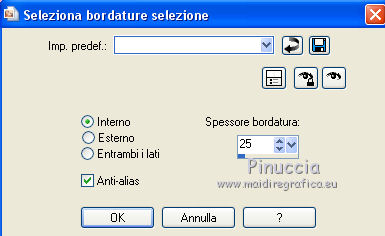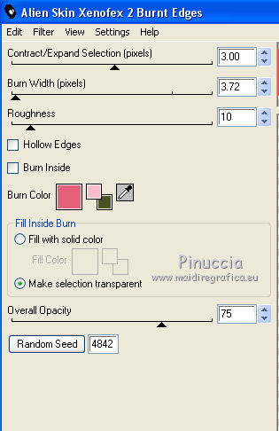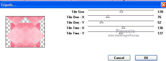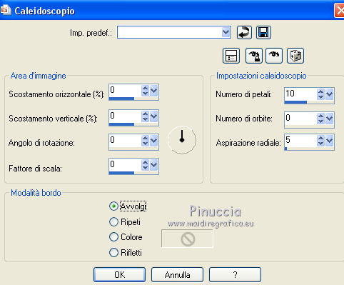 qui puoi trovare qualche risposta ai tuoi dubbi. Se l'argomento che ti interessa non è presente, ti prego di segnalarmelo. Questo tutorial è una creazione di ©Titoune e non può essere copiato su altri siti nè essere offerto per il download. Lo stesso vale per la mia traduzione. Il tutorial è stato creato con PSP X5, ma può essere eseguito anche con le altre versioni di PSP. Secondo la versione utilizzata (anteriore a PSP X) potresti ottenere dei risultati differenti. Dalla versione X4, il comando Immagine>Rifletti è stato sostituito con Immagine>Capovolgi in orizzontale, e il comando Immagine>Capovolgi con Immagine>Capovolgi in verticale. Nelle versioni X5 e X6, le funzioni sono state migliorate rendendo disponibile il menu Oggetti. Vedi la scheda sull'argomento qui Per tradure il tutorial ho usato PSP X. Occorrente: Un tube a scelta. Il resto del materiale qui Filtri in caso di dubbi, ricorda di consultare la mia sezione filtri qui VM Instant Art - Tripolis qui Alien Skin Xenofex 2 - Burnt Edges qui ![]() Metti le selezioni nella cartella Selezioni. 1. Imposta il colore di primo piano con un colore scelto dal tuo paesaggio, che ti servirà per colorizzare gli elementi dello scrap. Per l'esempio #fcbcc9. Prendi nota dei valori di tonalità (H) e saturazione (S) di questo colore. Per l'esempio: Regola>Tonalità e saturazione>Viraggio e trascrivi i valori annotati nelle rispettive caselle. ![]() 2. Apri una nuova immagine trasparente 750 x 600 pixels. Selezione>Seleziona tutto. Copia. Torna al tuo lavoro e vai a Modifica>Incolla nella selezione. Selezione>Deseleziona. 4. Regola>Tonalità e saturazione>Viraggio. ![]() 5. Livelli>Duplica. Immagine>Ridimensiona, all'85%, tutti i livelli non selezionato. 6. Effetti>Plugins>VM Instant Art - Tripolis, con i settaggi standard. ![]() 7. Effetti>Effetti 3D>Sfalsa ombra, colore #4b274c. ![]() Ripeti l'Effetto Sfalsa ombra, cambiando verticale e orizzontale con -3. 8. Effetti>Effetti geometrici>Prospettiva verticale. ![]() 9. Effetti>Effetti geometrici>Sfera. ![]() 10. Effetti>Plugins>Alien Skin Xenofex 2 - Burnt Edges - colore #e56179. ![]() 11. Attiva il livello Raster 1. Effetti>Plugins>Alien Skin Xenofex 2 - Burnt Edges, con i settaggi precedenti. Modifica>Copia. Selezione>Seleziona tutto. Immagine>Ritaglia la selezione. 12. Immagine>Dimensioni tela - 800 x 650 pixels. ![]() 13. Selezione>Seleziona tutto. Livelli>Nuovo livello raster. Livelli>Disponi>Sposta giù. Modifica>Incolla nella selezione. Selezione>Mobile. 14. Selezione>Modifica>Seleziona bordature selezione. ![]() 15. Effetti>Effetti artistici>Mezzitoni. ![]() 16. Effetti>Effetti 3D>Smusso a incasso. ![]() Selezione>Deseleziona. 17. Attiva nuovamente il livello Raster 1. Effetti>Effetti 3D>Sfalsa ombra, con i settaggi precedenti. 18. Attiva il livello superiore. Apri l'elemento "element 15" e vai a Modifica>Copia. Torna al tuo lavoro e vai a Modifica>Incolla come nuovo livello. 19. Effetti>Effetti di immagine>Scostamento. ![]() 20. Effetti>Effetti di riflesso>Specchio rotante. ![]() 21. Effetti>Effetti di riflesso>Caleidoscopio. ![]() Rinomina questo livello "cornice". 22. Attiva lo strumento Bacchetta magica ![]() e clicca al centro della cornice per selezionarla. Selezione>Modifica>Espandi - 5 pixels. 23. Livelli>Nuovo livello raster. Livelli>Disponi>Sposta giù. Apri l'immagine del paesaggio e vai a Modifica>Copia. Torna al tuo lavoro e vai a Modifica>Incolla nella selezione. Selezione>Deseleziona. 24. Attiva il livello della cornice. Effetti>Effetti 3D>Sfalsa ombra, colore #4b274c. ![]() 25. Apri l'elemento "element 11" e vai a Modifica>Copia. Torna al tuo lavoro e vai a Modifica>Incolla come nuovo livello. Spostalo in basso a sinistra.Effetti>Effetti 3D>Sfalsa ombra, con i settaggi precedenti. 26. Apri l'elemento "element 10" e vai a Modifica>Copia. Torna al tuo lavoro e vai a Modifica>Incolla come nuovo livello. Spostalo in basso a destra.Effetti>Effetti 3D>Sfalsa ombra, con i settaggi precedenti. 27. Apri l'elemento "element 4" e vai a Modifica>Copia. Torna al tuo lavoro e vai a Modifica>Incolla come nuovo livello. Spostalo in basso a sinistra.![]() Effetti>Effetti 3D>Sfalsa ombra, con i settaggi precedenti. Livelli>Duplica. Immagine>Rifletti. 28. Apri l'elemento "element 1". Selezione>Carica/Salva selezione>Carica selezione da disco. Cerca e carica la selezione "selection_element1". ![]() Regola>Tonalità e saturazione>Viraggio, con i settaggi precedenti. Selezione>Deseleziona. Modifica>Copia. Torna al tuo lavoro e vai a Modifica>Incolla come nuovo livello. Spostalo in basso a destra.Vedi l'esempio finale. Effetti>Effetti 3D>Sfalsa ombra, con i settaggi precedenti. 29. Apri l'elemento "element 2". Selezione>Carica/Salva selezione>Carica selezione da disco. Cerca e carica la selezione "selection_element2". ![]() Regola>Tonalità e saturazione>Viraggio, con i settaggi precedenti. Selezione>Deseleziona. Modifica>Copia. Torna al tuo lavoro e vai a Modifica>Incolla come nuovo livello. Spostalo in basso a sinistra.Vedi l'esempio finale. Effetti>Effetti 3D>Sfalsa ombra, con i settaggi precedenti. 30. Apri l'elemento "element 8". Selezione>Carica/Salva selezione>Carica selezione da disco. Cerca e carica la selezione "selection_element8". ![]() Regola>Tonalità e saturazione>Viraggio, con i settaggi precedenti. Selezione>Deseleziona. Modifica>Copia. Torna al tuo lavoro e vai a Modifica>Incolla come nuovo livello. Spostalo nella parte inferiore sinistra della cornice.![]() Effetti>Effetti 3D>Sfalsa ombra, con i settaggi precedenti. Livelli>Duplica. Immagine>Rifletti. 31. Apri l'elemento "element 7" e vai a Modifica>Copia. Torna al tuo lavoro e vai a Modifica>Incolla come nuovo livello. Spostalo nella parte inferiore della cornice.Vedi l'esempio finale. Effetti>Effetti 3D>Sfalsa ombra, con i settaggi precedenti. 32. Apri l'elemento "element 15_2" Modifica>Copia. Torna al tuo lavoro e vai a Modifica>Incolla come nuovo livello. Spostalo in alto a sinistra.![]() Effetti>Effetti 3D>Sfal