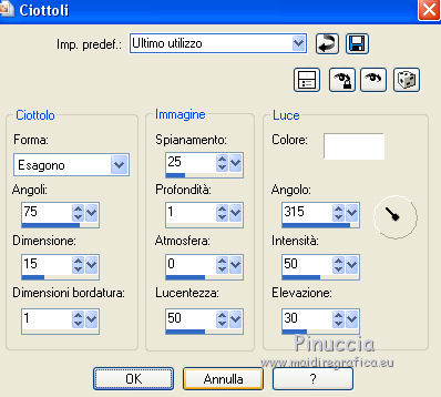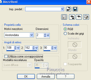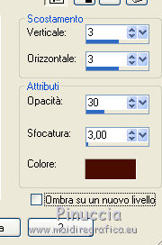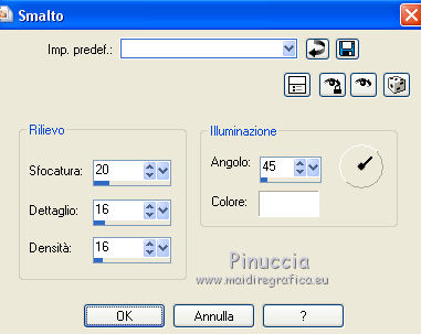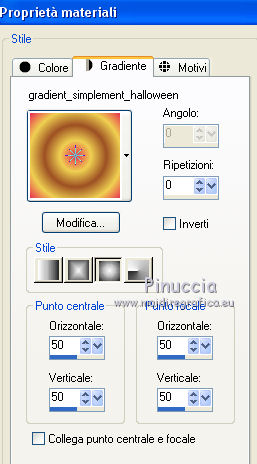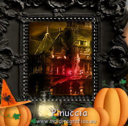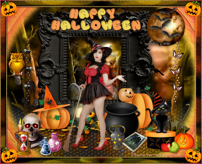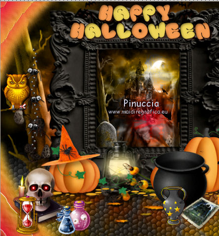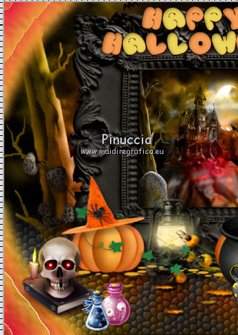qui puoi trovare qualche risposta ai tuoi dubbi. Se l'argomento che ti interessa non è presente, ti prego di segnalarmelo. Questo tutorial è una creazione di ©Titoune e non può essere copiato su altri siti nè essere offerto per il download. Lo stesso vale per la mia traduzione. Il tutorial è stato creato con Corel17, ma può essere eseguito anche con le altre versioni di PSP. Secondo la versione utilizzata (anteriore a PSP X) potresti ottenere dei risultati differenti. Dalla versione X4, il comando Immagine>Rifletti è stato sostituito con Immagine>Capovolgi in orizzontale, e il comando Immagine>Capovolgi con Immagine>Capovolgi in verticale. Nelle versioni X5 e X6, le funzioni sono state migliorate rendendo disponibile il menu Oggetti. Con il nuovo X7 sono tornati i comandi Rifletti/Capovolgi, ma con nuove differenze. Vedi la scheda sull'argomento qui Per tradurre il tutorial ho usato PSP X. Occorrente: Un tube a scelta. Il resto del materiale qui Il tube utilizzato è di Linda. ![]() Metti il gradiente nella cartella Gradienti. Metti le selezioni nella cartella Selezioni. 1. Passa il colore di primo piano a Gradiente, e seleziona il gradiente "gradient_simplement_halloween", stile Sprazzo di luce. ![]() 2. Apri una nuova immagine trasparente 750 x 600 pixels, e riempila con il gradiente.3. Selezione>Carica/salva selezione>Carica selezione da disco. Cerca e carica la selezione "sélection_scrap_simplement_halloween". ![]() Selezione>Innalza selezione a livello. Selezione>Deseleziona. 4. Effetti>Effetti di trama>Nappa. ![]() 5. Effetti>Effetti artistici>Smalto. ![]() 6. Attiva il livello raster 1. Selezione>Seleziona tutto. Livelli>Nuovo livello raster. 7. Apri l'elemento !cid_X_MA1_1286835319@aol, e vai a Modifica>Copia. Torna al tuo lavoro e vai a Modifica>Incolla nella selezione. Selezione>Deseleziona. Cambia la modalità di miscelatura di questo livello in Luminanza (esistente). 8. Selezione>Carica/salva selezione>Carica selezione da disco. Cerca e carica la selezione "sélection_scrap_simplement_halloween2". ![]() Selezione>Innalza selezione a livello. Selezione>Deseleziona. 9. Regola>Sfocatura>Sfocatura gaussiana - raggio 40. ![]() 10. Effetti>Effetti di trama>Ciottoli. ![]() Cambia la modalità di miscelatura di questo livello in Luminanza (esistente). 11. Attiva il livello superiore. Apri l'elemento 0_c7e0d_5480d51a_L (cluster), e vai a Modifica>Copia. Torna al tuo lavoro e vai a Modifica>Incolla come nuovo livello. 12. Effetti>Effetti di immagine>Scostamento. ![]() 13. Attiva lo strumento Selezione , rettangolo,e traccia una selezione intorno alla cornice. ![]() 14. Livelli>Nuovo livello raster. Livelli>Disponi>Sposta giù. Attiva nuovamente l'elemento !cid_X_MA1_1286835319@aol e vai a Modifica>Copia. Torna al tuo lavoro e vai a Modifica>Incolla nella selezione. Selezione>Deseleziona. Cambia la modalità di miscelatura di questo livello in Luminanza (esistente). 15. Attiva nuovamente il livello superiore. Apri l'elemento batmoon, e vai a Modifica>Copia. Torna al tuo lavoro e vai a Modifica>Incolla come nuovo livello. Spostalo nella parte superiore destra.Vedi l'esempio finale. 16. Effetti>Effetti 3D>Sfalsa ombra, colore ##4b0d00. ![]() 17. Apri l'elemento LIBHalloHdg, e vai a Modifica>Copia. Torna al tuo lavoro e vai a Modifica>Incolla come nuovo livello. Spostalo nella parte superiore della cornice.Vedi l'esempio finale. Effetti>Effetti 3D>Sfalsa ombra, con i settaggi precedenti. 18. Apri l'elemento eyes, e vai a Modifica>Copia. Torna al tuo lavoro e vai a Modifica>Incolla come nuovo livello. Spostalo nella parte destra.Vedi l'esempio finale. Effetti>Effetti 3D>Sfalsa ombra, con i settaggi precedenti. 19. Apri l'elemento "element5" (calderone), e vai a Modifica>Copia. Torna al tuo lavoro e vai a Modifica>Incolla come nuovo livello. Spostalo nella parte inferiore.Vedi l'esempio finale. Effetti>Effetti 3D>Sfalsa ombra, con i settaggi precedenti. 20. Apri l'elemento "element12" (foto), e vai a Modifica>Copia. Torna al tuo lavoro e vai a Modifica>Incolla come nuovo livello. Spostalo nella parte inferiore.Vedi l'esempio finale. Effetti>Effetti 3D>Sfalsa ombra, con i settaggi precedenti. 21. Apri l'elemento c842a62c (gatto), e vai a Modifica>Copia. Torna al tuo lavoro e vai a Modifica>Incolla come nuovo livello. Spostalo in basso a destra.![]() Effetti>Effetti 3D>Sfalsa ombra, con i settaggi precedenti. 22. Apri l'elemento "element14" (vaso), e vai a Modifica>Copia. Torna al tuo lavoro e vai a Modifica>Incolla come nuovo livello. Spostalo in basso a destra.Vedi l'esempio finale. Effetti>Effetti 3D>Sfalsa ombra, con i settaggi precedenti. 23. Apri l'elemento "element3" (candela), e vai a Modifica>Copia. Torna al tuo lavoro e vai a Modifica>Incolla come nuovo livello. Spostalo in basso a sinistra.Vedi l'esempio finale. Effetti>Effetti 3D>Sfalsa ombra, con i settaggi precedenti. 24. Apri l'elemento "element15" (fiala rosa), e vai a Modifica>Copia. Torna al tuo lavoro e vai a Modifica>Incolla come nuovo livello. Spostalo in basso a sinistra.Vedi l'esempio finale. Effetti>Effetti 3D>Sfalsa ombra, con i settaggi precedenti. 25. Apri l'elemento "element16" (fiala blu), e vai a Modifica>Copia. Torna al tuo lavoro e vai a Modifica>Incolla come nuovo livello. Spostalo in basso a sinistra.![]() Effetti>Effetti 3D>Sfalsa ombra, con i settaggi precedenti. 26. Apri l'elemento "element17" (clessidra), e vai a Modifica>Copia. Torna al tuo lavoro e vai a Modifica>Incolla come nuovo livello. Spostalo nella parte inferiore sinistra.Vedi l'esempio finale. Effetti>Effetti 3D>Sfalsa ombra, con i settaggi precedenti. 27. Apri l'elemento spiders, e vai a Modifica>Copia. Torna al tuo lavoro e vai a Modifica>Incolla come nuovo livello. Spostalo a sinistra.Vedi l'esempio finale. Effetti>Effetti 3D>Sfalsa ombra, con i settaggi precedenti. 28. Apri l'elemento owl, e vai a Modifica>Copia. Torna al tuo lavoro e vai a Modifica>Incolla come nuovo livello. Spostalo a sinistra.![]() Effetti>Effetti 3D>Sfalsa ombr