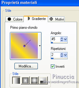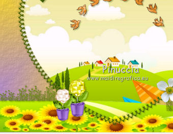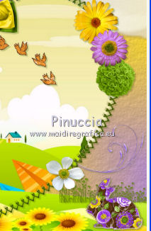 qui puoi trovare qualche risposta ai tuoi dubbi. Se l'argomento che ti interessa non è presente, ti prego di segnalarmelo. Questo tutorial è una creazione di ©Titoune e non può essere copiato su altri siti nè essere offerto per il download. Lo stesso vale per la mia traduzione. Il tutorial è stato creato con PSP X5, ma può essere eseguito anche con le altre versioni di PSP. Secondo la versione utilizzata (anteriore a PSP X) potresti ottenere dei risultati differenti. Dalla versione X4, il comando Immagine>Rifletti è stato sostituito con Immagine>Capovolgi in orizzontale, e il comando Immagine>Capovolgi con Immagine>Capovolgi in verticale. Nelle versioni X5 e X6, le funzioni sono state migliorate rendendo disponibile il menu Oggetti. Vedi la scheda sull'argomento qui Per tradure il tutorial ho usato PSP X. Occorrente: Un tube a scelta. Il resto del materiale qui ![]() 1. Imposta il colore di primo piano con #ffe10f, e il colore di sfondo con #a47ce8. Passa il colore di primo piano a Gradiente di primo piano/sfondo, stile Lineare. ![]() 2. Apri una nuova immagine trasparente 750 x 600 pixels, e riempila con il gradiente.Livelli>Duplica. Immagine>Rifletti. Abbassa l'opacità di questo livello al 50%. Livelli>Unisci>Unisci giù. 3. Apri l'elemento dba-ISS-stiches4, e vai a Modifica>Copia. Torna al tuo lavoro e vai a Modifica>Incolla come nuovo livello. Non spostarlo. Attiva lo strumento Bacchetta magica ![]() e clicca al centro del cuore per selezionarlo. Selezione>Inverti. 4. Attiva il livello inferiore. Effetti>Effetti di trama>Trama - seleziona la trama Grana fine nuvoloso, con i seguenti settaggi. ![]() Selezione>Innalza selezione a livello. Selezione>Inverti. 5. Livelli>Nuovo livello raster. Livelli>Disponi>Sposta giù. 6. Apri l'immagine l'image [wallcoo_com]_vector_illustration_10 e vai a Modifica>Copia. Torna al tuo lavoro e vai a Modifica>Incolla nella selezione. Selezione>Deseleziona. Rinomina questo livello "paesaggio". 7. Attiva il livello della cornice. Effetti>Effetti 3D>Sfalsa ombra, colore #3f5a03. ![]() Ripeti l'Effetto Sfalsa mobra, cambiando verticale e orizzontale con -3. 8. Apri l'elemento landscape_flowers, e vai a Modifica>Copia. Torna al tuo lavoro e vai a Modifica>Incolla come nuovo livello. Spostalo in basso.Se stai usando X15 o X16: Oggetti>Allinea>Inferiore Vedi l'esempio finale. Effetti>Effetti 3D>Sfalsa ombra, con i settaggi precedenti. Porta questo livello sotto il livello della cornice. 9. Rimani su questo livello. Apri l'elemento grass, e vai a Modifica>Copia. Torna al tuo lavoro e vai a Modifica>Incolla come nuovo livello. 10. Effetti>Effetti di immagine>Scostamento. ![]() Effetti>Effetti 3D>Sfalsa ombra, colore #3f5a03. ![]() 11. Apri l'elemento dba-ISS-cloud1, e vai a Modifica>Copia. Torna al tuo lavoro e vai a Modifica>Incolla come nuovo livello. Spostalo in alto.Vedi l'esempio finale. Porta questo livello sotto il livello del paesaggio. ![]() Effetti>Effetti 3D>Sfalsa ombra, con i settaggi precedenti. 12. Rimani su questo livello. Apri l'elemento dba-ISS-swirl2, e vai a Modifica>Copia. Torna al tuo lavoro e vai a Modifica>Incolla come nuovo livello. Spostalo in basso a destra.Vedi l'esempio finale. Effetti>Effetti 3D>Sfalsa ombra, con i settaggi precedenti. 13. Attiva il livello superiore. Apri l'elemento dba-ISS-birds4, e vai a Modifica>Copia. Torna al tuo lavoro e vai a Modifica>Incolla come nuovo livello. Spostalo in alto.Vedi l'esempio finale. Effetti>Effetti 3D>Sfalsa ombra, con i settaggi precedenti. 14. Apri l'elemento dba-ISS-bow2, e vai a Modifica>Copia. Torna al tuo lavoro e vai a Modifica>Incolla come nuovo livello. Spostalo in alto.Vedi l'esempio finale. Effetti>Effetti 3D>Sfalsa ombra, con i settaggi precedenti. 15. Apri l'elemento dba-ISS-eyelet1, e vai a Modifica>Copia. Torna al tuo lavoro e vai a Modifica>Incolla come nuovo livello. Spostalo in alto a sinistra.![]() Effetti>Effetti 3D>Sfalsa ombra, con i settaggi precedenti. 16. Apri l'elemento dba-ISS-flower4, e vai a Modifica>Copia. Torna al tuo lavoro e vai a Modifica>Incolla come nuovo livello. Spostalo in alto a destra.Vedi l'esempio finale. Effetti>Effetti 3D>Sfalsa ombra, con i settaggi precedenti. 17. Apri l'elemento dba-ISS-ball1, e vai a Modifica>Copia. Torna al tuo lavoro e vai a Modifica>Incolla come nuovo livello. Spostalo in alto a destra.Vedi l'esempio finale. Effetti>Effetti 3D>Sfalsa ombra, con i settaggi precedenti. 18. Apri l'elemento dba-ISS-flower8, e vai a Modifica>Copia. Torna al tuo lavoro e vai a Modifica>Incolla come nuovo livello. Spostalo in alto a destra.![]() Effetti>Effetti 3D>Sfalsa ombra, con i settaggi precedenti. 19. Apri l'elemento dba-ISS-flower6, e vai a Modifica>Copia. Torna al tuo lavoro e vai a Modifica>Incolla come nuovo livello. Spostalo in basso a destra.Vedi l'esempio finale. Effetti>Effetti 3D>Sfalsa ombra, con i settaggi precedenti. 20. Apri l'elemento dba-ISS-rabbit1, e vai a Modifica>Copia. Torna al tuo lavoro e vai a Modifica>Incolla come nuovo livello. Spostalo in basso a destra.![]() Effetti>Effetti 3D>Sfalsa ombra, con i settaggi precedenti. 21. Apri l'elemento dba-ISS-flower2, e vai a Modifica>Copia. Torna al tuo lavoro e vai a Modifica>Incolla come nuovo livello. Spostalo in basso a sinistra.Vedi l'esempio finale. Effetti>Effetti 3D>Sfalsa ombra, con i settaggi precedenti. 22. Apri l'elemento dba-ISS-flower3, e vai a Modifica>Copia. Torna al tuo lavoro e vai a Modifica>Incolla come nuovo livello. Spostalo in basso a sinistra.![]() Effetti>Effetti 3D>Sfalsa ombra, con i settaggi precedenti. 23. Apri l'elemento dba-ISS-tree2, e vai a Modifica>Copia. Torna al tuo lavoro e vai a Modifica>Incolla come nuovo livello. Spostalo in basso a sinistra.Vedi l'esempio finale. Effetti>Effetti 3D>Sfalsa ombra, con i settaggi precedenti. 24. Apri l'elemento dba-ISS-basket1, e vai a Modifica>Copia. Torna al tuo lavoro e vai a Modifica>Incolla come nuovo livello. Spostalo in basso a sinistra.![]() Effetti>Effetti 3D>Sfalsa ombra, con i settaggi 