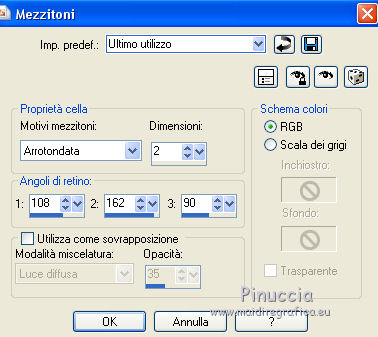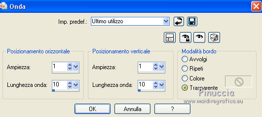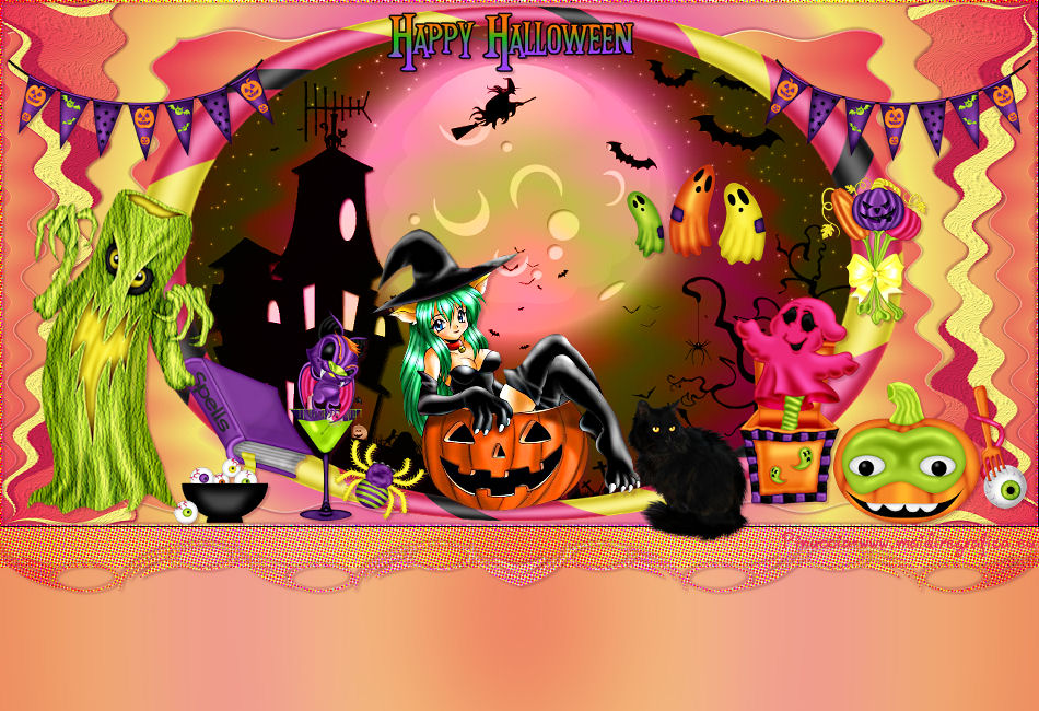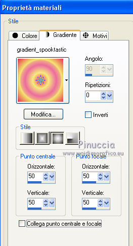 qui puoi trovare qualche risposta ai tuoi dubbi. Se l'argomento che ti interessa non è presente, ti prego di segnalarmelo. Questo tutorial è una creazione di ©Titoune e non può essere copiato su altri siti nè essere offerto per il download. Lo stesso vale per la mia traduzione. Il tutorial è stato creato con Corel18, ma può essere eseguito anche con le altre versioni di PSP. Secondo la versione utilizzata (anteriore a PSP X) potresti ottenere dei risultati differenti. Dalla versione X4, il comando Immagine>Rifletti è stato sostituito con Immagine>Capovolgi in orizzontale, e il comando Immagine>Capovolgi con Immagine>Capovolgi in verticale. Nelle versioni X5 e X6, le funzioni sono state migliorate rendendo disponibile il menu Oggetti. Con il nuovo X7 sono tornati i comandi Rifletti/Capovolgi, ma con nuove differenze. Vedi la scheda sull'argomento qui Per tradurre il tutorial ho usato PSP X. Occorrente: Un tube a scelta. Il resto del materiale qui Il tube utilizzato è di Thafs. Filtri in caso di dubbi, ricorda di consultare la mia sezione filtri qui Simple - Top Left Mirror qui ![]() Metti la selezione nella cartella Selezioni. Metti la trama nella cartella Trame. Metti il gradiente nella cartella Gradiente. Apri la maschera in PSP e minimizzala con il resto del materiale. 1. Passa il colore di primo piano a Gradiente, e seleziona il gradiente gradient_spooktastic, stile Sprazzo di luce. ![]() 2. Apri una nuova immagine trasparente 1280 x 650 pixels, e riempila con il gradiente.Livelli>Duplica. 3. Immagine>Ridimensiona, al 90%, tutti i livelli non selezionato. Effetti>Effetti di bordo>Aumenta. 4. Effetti>Effetti geometrici>Inclina - colore #d41c61. ![]() 5. Effetti>Effetti geometrici>Prospettiva verticale. ![]() 6. Effetti>Effetti di riflesso>Specchio rotante. ![]() 7. Attiva lo strumento Bacchetta magica , modalità Aggiungi,e clicca nei triangoli per selezionarli. ![]() Selezione>Modifica>Contrai - 2 pixels. 8. Attiva il livello Raster 1. Selezione>Innalza selezione a livello. Livelli>Disponi>Porta in alto. 9. Effetti>Effetti geometrici>Prospettiva verticale, colore #c2234a. ![]() 10. Effetti>Effetti geometrici>Prospettiva orizzontale, colore #f5ea7b. ![]() Effetti>Plugins>Simple - Top Left Mirror. 11. Effetti>Effetti di trama>Trama - seleziona la trama Tilerose. ![]() Selezione>Deseleziona. 12. Effetti>Effetti di distorsione>Onda. ![]() 13. Effetti>Effetti 3D>Sfalsa ombra, colore #7a162d. ![]() Ripeti l'Effetto Sfalsa ombra, cambiando verticale e orizzontale con -3. 14. Attiva il livello sottostante. Ripeti Effetti>Effetti di distorsione>Onda, con i settaggi precedenti. Effetti>Effetti 3D>Sfalsa ombra, con i settaggi precedenti. 15. Attiva il livello superiore. Apri l'elemento s_ee17, e vai a Modifica>Copia. Torna al tuo lavoro e vai a Modifica>Incolla come nuovo livello. 16. Effetti>Effetti geometrici>Sfera. ![]() 17. Effetti>Effetti geometrici>Cilindro verticale. ![]() 18. Attiva lo strumento Bacchetta magica ![]() e clicca al centro della cornice per selezionarla. Selezione>Modifica>Espandi - 5 pixels. Livelli>Nuovo livello raster. Livelli>Disponi>Sposta giù. 19. Apri l'immagine happy-halloween-3, e vai a Modifica>Copia. Torna al tuo lavoro e vai a Modifica>Incolla nella selezione. Selezione>Deseleziona. Cambia la modalità di miscelatura di questo livello in Luminanza (esistente). 20. Apri l'elemento s_ee31, e vai a Modifica>Copia. Torna al tuo lavoro e vai a Modifica>Incolla come nuovo livello. Spostalo nella parte destra del paesaggio.Vedi l'esempio finale. Effetti>Effetti 3D>Sfalsa ombra, colore #7a16d2. ![]() 21. Attiva nuovamente il livello superiore. Apri l'elemento s_ee33, e vai a Modifica>Copia. Torna al tuo lavoro e vai a Modifica>Incolla come nuovo livello. Spostalo nella parte superiore della cornice.Vedi l'esempio finale. Effetti>Effetti 3D>Sfalsa ombra, con i settaggi precedenti. Livelli>Duplica. Immagine>Rifletti. 22. Apri l'elemento s_ee27, e vai a Modifica>Copia. Torna al tuo lavoro e vai a Modifica>Incolla come nuovo livello. Spostalo nella parte superiore sinistra della cornice.Vedi l'esempio finale. Effetti>Effetti 3D>Sfalsa ombra, con i settaggi precedenti. 23. Apri l'elemento s_ee28, e vai a Modifica>Copia. Torna al tuo lavoro e vai a Modifica>Incolla come nuovo livello. Spostalo nella parte destra della cornice.![]() Effetti>Effetti 3D>Sfalsa ombra, con i settaggi precedenti. 24. Apri l'elemento s-ee30, e vai a Modifica>Copia. Torna al tuo lavoro e vai a Modifica>Incolla come nuovo livello. Spostalo in basso a destra.Vedi l'esempio finale. Effetti>Effetti 3D>Sfalsa ombra, con i settaggi precedenti. 25. Apri l'elemento s_ee32, e vai a Modifica>Copia. Torna al tuo lavoro e vai a Modifica>Incolla come nuovo livello. Spostalo in basso a destra.Vedi l'esempio finale. Effetti>Effetti 3D>Sfalsa ombra, con i settaggi precedenti. 26. Apri l'elemento s_ee26, e vai a Modifica>Copia. Torna al tuo lavoro e vai a Modifica>Incolla come nuovo livello. Spostalo in basso a destra.Vedi l'esempio finale. Effetti>Effetti 3D>Sfalsa ombra, con i settaggi precedenti. 27. Apri l'elemento s_ee15, e vai a Modifica>Copia. Torna al tuo lavoro e vai a Modifica>Incolla come nuovo livello. Spostalo nella parte inferiore.![]() Effetti>Effetti 3D>Sfalsa ombra, con i settaggi precedenti. 28. Apri l'elemento s_ee22, e vai a Modifica>Copia. Torna al tuo lavoro e vai a Modifica>Incolla come nuovo livello. Spostalo in basso a sinistra.Vedi l'esempio finale. Effetti>Effetti 3D>Sfalsa ombra, con i settaggi precedenti. 29. Apri l'elemento s_ee20, e vai a Modifica>Copia. Torna al tuo lavoro e vai a Modifica>Incolla come nuovo livello. Spostalo in basso a sinistra.Vedi l'esempio finale. Effetti>Effetti 3D>Sfalsa ombra, con i settaggi precedenti. 30. Apri l'elemento s_ee14, e vai a Modifica>Copia. Torna al tuo lavoro e vai a Modifica>Incolla come nuovo livello. Spostalo in basso a sinistra.Vedi l'esempio finale. Effetti>Effetti 3D>Sfalsa ombra, con i settaggi precedenti. 31. Apri l'elemento s_ee