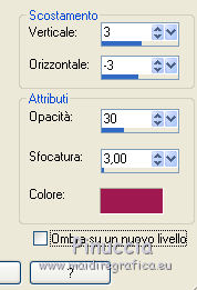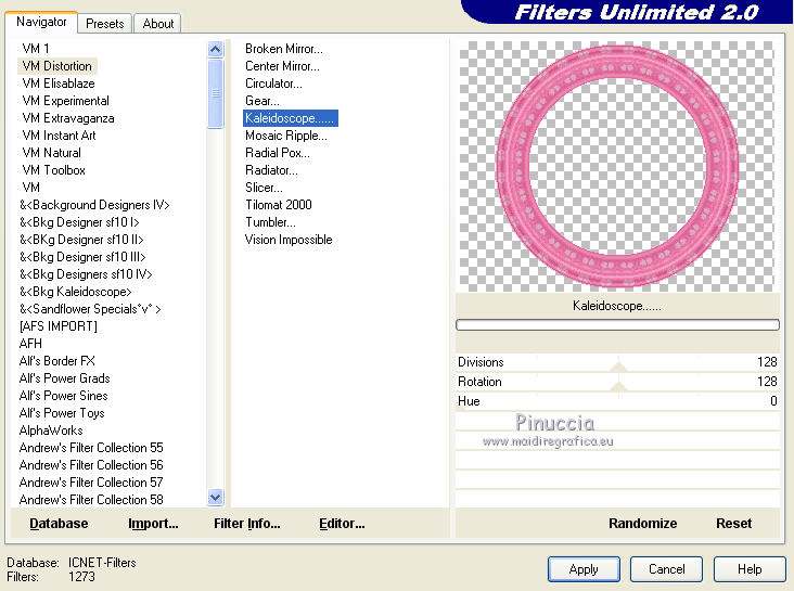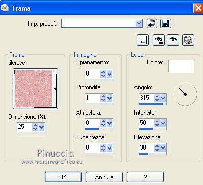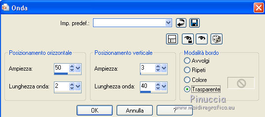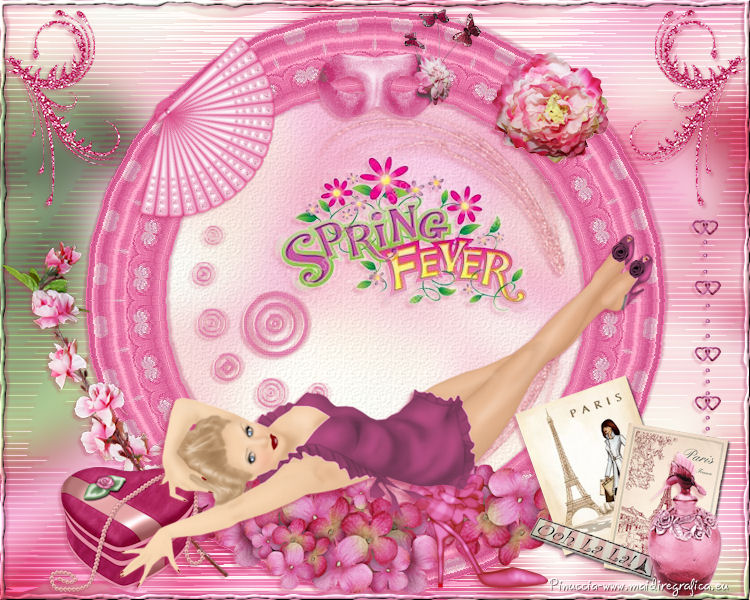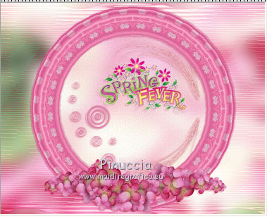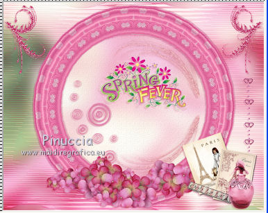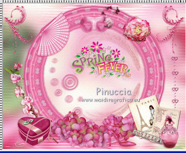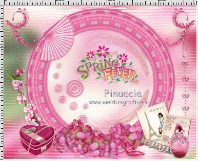 qui puoi trovare qualche risposta ai tuoi dubbi. Se l'argomento che ti interessa non č presente, ti prego di segnalarmelo. Questo tutorial č una creazione di ©Titoune e non puņ essere copiato su altri siti nč essere offerto per il download. Lo stesso vale per la mia traduzione. Il tutorial č stato creato con PSP X5, ma puņ essere eseguito anche con le altre versioni di PSP. Secondo la versione utilizzata (anteriore a PSP X) potresti ottenere dei risultati differenti. Dalla versione X4, il comando Immagine>Rifletti č stato sostituito con Immagine>Capovolgi in orizzontale, e il comando Immagine>Capovolgi con Immagine>Capovolgi in verticale. Nelle versioni X5 e X6, le funzioni sono state migliorate rendendo disponibile il menu Oggetti. Con il nuovo X7 sono tornati i comandi Rifletti/Capovolgi, ma con nuove differenze. Vedi la scheda sull'argomento qui Per tradurre il tutorial ho usato PSP X. Occorrente: Un tube a scelta. Il resto del materiale qui Il tube "EZSpirit1945" č di © Hellonlegs Exclusive Filtri in caso di dubbi, ricorda di consultare la mia sezione filtri qui Filters Unlimited 2.0 qui VM Distortion - Kaleidoscope qui Eye Candy 4000 - Jiggle qui I filtri VM Distortion si possono usare da soli o importati in Filters Unlimited (come fare vedi qui) Se un filtro fornito appare con questa icona ![]() Metti la trama Tilerose nella cartella Trame. 1. Apri una nuova immagine trasparente 750 x 600 pixels. Selezione>Seleziona tutto. 2. Apri l'elemento WP_DITA_BUTTON2. Attiva lo strumento Selezione , rettangolo,e traccia una selezione come nell'esempio. ![]() Modifica>Copia. Torna al tuo lavoro e vai a Modifica>Incolla nella selezione. Selezione>Deseleziona. Regola>Sfocatura>Sfocatura gaussiana - raggio 20. ![]() 3. Apri l'elemento WP_DITA_FRAME2 e vai a Modifica>Copia. Torna al tuo lavoro e vai a Modifica>Incolla come nuovo livello. 4. Immagine>Ridimensiona, al 95%, tutti i livelli non selezionato. Effetti>Plugins>Filters Unlimited 2.0 - VM Distortion - Kaleidoscope, con i settaggi standard. ![]() Regola>Messa a fuoco>Metti a fuoco. 6. Effetti>Effetti 3D>Sfalsa ombra, colore #9f1950. ![]() Ripeti l'Effetto Sfalsa ombra, cambiando verticale e orizzontale con -3/3. 7. Attiva lo strumento Bacchetta magica ![]() e clicca nella parte esterna della cornice: ![]() Attiva il livello Raster 1. Selezione>Innalza selezione a livello. Selezione>Deseleziona. 8. Effetti>Effetti di distorsione>Onda. ![]() Rinomina questo livello "onda". Cambia la modalitą di miscelatura di questo livello in Sovrapponi. 9. Attiva il livello della cornice. Attiva lo strumento Bacchetta magica ![]() e clicca al centro della cornice per selezionarla. Selezione>Modifica>Espandi - 3 pixels. 10. Attiva il livello "onda". Premi sulla tastiera il tasto CANC ![]() 11. Attiva il livello Raster 1. Effetti>Effetti di trama>Trama - seleziona la trama Tilerose con i seguenti settaggi. ![]() Selezione>Deseleziona. 12. Attiva il livello "onda". Effetti>Effetti 3D>Sfalsa ombra, con i settaggi precedenti. 13. Attiva il livello della cornice. Apri l'elemento WP_DITA_FLOWER5, e vai a Modifica>Copia. Torna al tuo lavoro e vai a Modifica>Incolla come nuovo livello. Spostalo nella parte inferiore della cornice.Vedi l'esempio finale. Effetti>Effetti 3D>Sfalsa ombra, colore #ba355c. ![]() 14. Apri l'elemento WP_DITA_CIRCLES, e vai a Modifica>Copia. Torna al tuo lavoro e vai a Modifica>Incolla come nuovo livello. Spostalo nella parte inferiore sinistra della cornice.Vedi l'esempio finale. Porta questo livello sotto il livello della cornice. Effetti>Effetti 3D>Sfalsa ombra, con i settaggi precedenti. 15. Apri l'elemento WP_DITA_SWIRL2, e vai a Modifica>Copia. Torna al tuo lavoro e vai a Modifica>Incolla come nuovo livello. Spostalo nella parte inferiore destra della cornice.Vedi l'esempio finale. Effetti>Effetti 3D>Sfalsa ombra, con i settaggi precedenti. Livelli>Duplica. Immagine>Capovolgi. 16. Apri l'elemento wordart_spring_fever, e vai a Modifica>Copia. Torna al tuo lavoro e vai a Modifica>Incolla come nuovo livello. Spostalo come nell'esempio.![]() Effetti>Effetti 3D>Sfalsa ombra, con i settaggi precedenti. 17. Attiva il livello superiore. Apri l'elemento WP_DITA_SWIRL, e vai a Modifica>Copia. Torna al tuo lavoro e vai a Modifica>Incolla come nuovo livello. Spostalo in alto a sinistra.Vedi l'esempio finale. Effetti>Effetti 3D>Sfalsa ombra, con i settaggi precedenti. Livelli>Duplica. Immagine>Rifletti. 18. Apri l'elemento WP_DITA_HEART4, e vai a Modifica>Copia. Torna al tuo lavoro e vai a Modifica>Incolla come nuovo livello. Spostalo a destra.Vedi l'esempio finale. Effetti>Effetti 3D>Sfalsa ombra, con i settaggi precedenti. 19. Apri l'elemento WP_DITA_CARDS, e vai a Modifica>Copia. Torna al tuo lavoro e vai a Modifica>Incolla come nuovo livello. Spostalo in basso a destra.Vedi l'esempio finale. Effetti>Effetti 3D>Sfalsa ombra, con i settaggi precedenti. 20. Apri l'elemento WP_DITA_BOTTLE1, e vai a Modifica>Copia. Torna al tuo lavoro e vai a Modifica>Incolla come nuovo livello. Spostalo in basso a destra.![]() Effetti>Effetti 3D>Sfalsa ombra, con i settaggi precedenti. 21. Apri l'elemento WP_DITA_SHOE1, e vai a Modifica>Copia. Torna al tuo lavoro e vai a Modifica>Incolla come nuovo livello. Spostalo nella parte inferiore.Vedi l'esempio finale. Effetti>Effetti 3D>Sfalsa ombra, con i settaggi precedenti. 22. Apri l'elemento WP_DITA_FLOWER1, e vai a Modifica>Copia. Torna al tuo lavoro e vai a Modifica>Incolla come nuovo livello. Spostalo in basso a sinistra.Vedi l'esempio finale. Effetti>Effetti 3D>Sfalsa ombra, con i settaggi precedenti. 23. Apri l'elemento WP_DITA_BOXES3, e vai a Modifica>Copia. Torna al tuo lavoro e vai a Modifica>Incolla come nuovo livello. Spostalo in basso a sinistra.Vedi l'esempio finale. Effetti>Effetti 3D>Sfalsa ombra, con i settaggi precedenti. 24. Apri l'elemento WP_DITA_FAN1, e vai a Modifica>Copia. Torna al tuo lavoro e vai a Modifica>Incolla come nuovo livello. Spostalo in alto a sinistra.![]() Effetti>Effetti