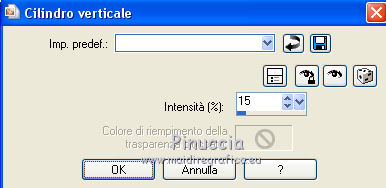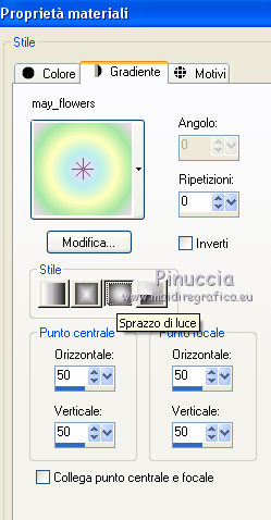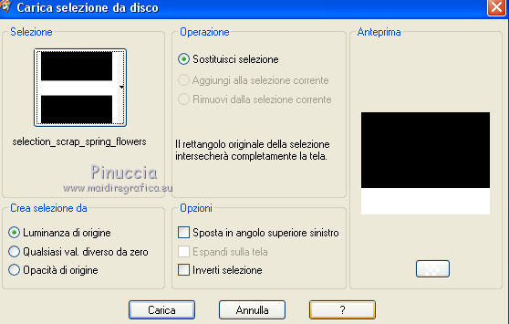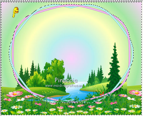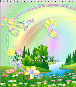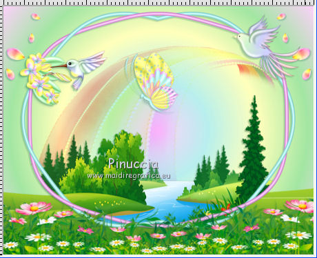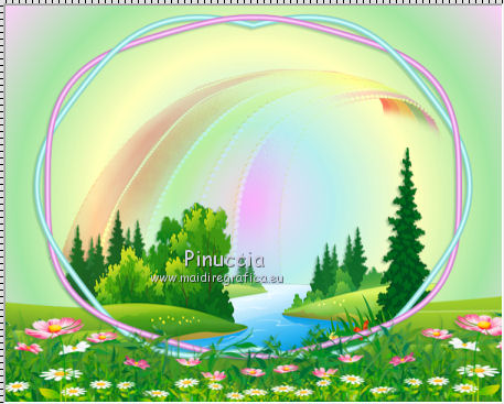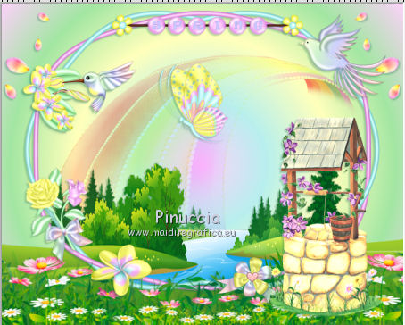 qui puoi trovare qualche risposta ai tuoi dubbi. Se l'argomento che ti interessa non è presente, ti prego di segnalarmelo. Questo tutorial è una creazione di ©Titoune e non può essere copiato su altri siti nè essere offerto per il download. Lo stesso vale per la mia traduzione. Il tutorial è stato creato con PSP X5, ma può essere eseguito anche con le altre versioni di PSP. Secondo la versione utilizzata (anteriore a PSP X) potresti ottenere dei risultati differenti. Dalla versione X4, il comando Immagine>Rifletti è stato sostituito con Immagine>Capovolgi in orizzontale, e il comando Immagine>Capovolgi con Immagine>Capovolgi in verticale. Nelle versioni X5 e X6, le funzioni sono state migliorate rendendo disponibile il menu Oggetti. Con il nuovo X7 sono tornati i comandi Rifletti/Capovolgi, ma con nuove differenze. Vedi la scheda sull'argomento qui Per tradurre il tutorial ho usato PSP X. Occorrente: Un tube a scelta. Il resto del materiale qui Filtri in caso di dubbi, ricorda di consultare la mia sezione filtri qui Simple - Top Left Mirror qui Penta.com - Jeans qui ![]() Metti il gradiente nella cartella Gradienti. Metti le selezioni nella cartella Selezioni. 1. Passa il colore di primo piano a Gradiente e seleziona il gradiente "may_flowers", con i seguenti settaggi. ![]() 2. Apri una nuova immagine trasparente 750 x 600 pixels, e riempila con il gradiente.Selezione>Carica/Salva selezione>Carica selezione da disco. Cerca e carica la selezione "selection_scrap_spring_flowers". ![]() 3. Livelli>Nuovo livello raster. Apri l'elemento grass e vai a Modifica>Copia. Torna al tuo lavoro e vai a Modifica>Incolla nella selezione. 4. Livelli>Nuovo livello raster. Selezione>Carica/Salva selezione>Carica selezione da disco. Cerca e carica la selezione "selection_scrap_spring_flowers2". ![]() 5. Apri l'elemento grass_flowers e vai a Modifica>Copia. Torna al tuo lavoro e vai a Modifica>Incolla nella selezione. Selezione>Deseleziona. 6. Effetti>Effetti 3D>Sfalsa ombra, colore #00501d. ![]() 7. Apri l'elemento frame e vai a Modifica>Copia. Torna al tuo lavoro e vai a Modifica>Incolla come nuovo livello. 8. Effetti>Effetti geometrici>Cilindro verticale. ![]() 9. Effetti>Effetti di immagine>Scostamento. ![]() Porta questo livello sotto il livello dei fiori. 10. Apri l'elemento Grass_Lake_and_Trees_Transparent_PNG_Clipart e vai a Modifica>Copia. Torna al tuo lavoro e vai a Modifica>Incolla come nuovo livello. Livelli>Disponi>Sposta giù (sotto il livello della cornice). 11. Effetti>Effetti di immagine>Scostamento. ![]() 12. Attiva nuovamente il livello della cornice. Attiva lo strumento Bacchetta magica ![]() e clicca all'esterno della cornice. ![]() Selezione>Modifica>Espandi - 3 pixels. Attiva il livello del paesaggio. Premi sulla tastiera il tasto CANC ![]() Selezione>Deseleziona. Effetti>Effetti 3D>Sfalsa ombra, con i settaggi precedenti. Attiva il livello della cornice. Ripeti l'Effetto Sfalsa con i settaggi precedenti, ma colore #317f60. ![]() Attiva il livello "grass" (il secondo livello dal basso). Modifica>Ripeti Sfalsa ombra. 13. Attiva il livello Raster 1. Apri l'elemento Rainbow e vai a Modifica>Copia. Torna al tuo lavoro e vai a Modifica>Incolla come nuovo livello. Posiziona l'elemento nel paesaggio.Vedi l'esempio finale. Cambia la modalità di miscelatura di questo livello in Moltiplica. ![]() 14. Attiva nuovamente il livello superiore. Apri l'elemento Scattered Petals, e vai a Modifica>Copia. Torna al tuo lavoro e vai a Modifica>Incolla come nuovo livello. Spostalo in alto a sinistra.Vedi l'esempio finale. Effetti>Effetti 3D>Sfalsa ombra, con i settaggi precedenti. Livelli>Duplica. Immagine>Rifletti. 15. Apri l'elemento Bird 1, e vai a Modifica>Copia. Torna al tuo lavoro e vai a Modifica>Incolla come nuovo livello. Spostalo in alto a destra.Vedi l'esempio finale. Effetti>Effetti 3D>Sfalsa ombra, con i settaggi precedenti. 16. Apri l'elemento Butterfly 1, e vai a Modifica>Copia. Torna al tuo lavoro e vai a Modifica>Incolla come nuovo livello. Spostalo nel paesaggio.Vedi l'esempio finale. Effetti>Effetti 3D>Sfalsa ombra, con i settaggi precedenti. 17. Apri l'elemento Hummingbird, e vai a Modifica>Copia. Torna al tuo lavoro e vai a Modifica>Incolla come nuovo livello. Spostalo in alto a sinistra.![]() Effetti>Effetti 3D>Sfalsa ombra, con i settaggi precedenti. 18. Apri l'elemento Roses 1, e vai a Modifica>Copia. Torna al tuo lavoro e vai a Modifica>Incolla come nuovo livello. Spostalo in basso a sinistra.Vedi l'esempio finale. Effetti>Effetti 3D>Sfalsa ombra, con i settaggi precedenti. 19. Apri l'elemento Flower 4, e vai a Modifica>Copia. Torna al tuo lavoro e vai a Modifica>Incolla come nuovo livello. Spostalo in basso.![]() Effetti>Effetti 3D>Sfalsa ombra, con i settaggi precedenti. 20. Apri l'elemento Bow 1, e vai a Modifica>Copia. Torna al tuo lavoro e vai a Modifica>Incolla come nuovo livello. Spostalo in basso.Vedi l'esempio finale. Effetti>Effetti 3D>Sfalsa ombra, con i settaggi precedenti. 21. Apri l'elemento Wordart, e vai a Modifica>Copia. Torna al tuo lavoro e vai a Modifica>Incolla come nuovo livello. Spostalo nella parte superiore della cornice.Vedi l'esempio finale. Effetti>Effetti 3D>Sfalsa ombra, con i settaggi precedenti. 22. Apri l'elemento Wishing Well, e vai a Modifica>Copia. Torna al tuo lavoro e vai a Modifica>Incolla come nuovo livello. Spostalo in basso a destra.![]() Effetti>Effetti 3D>Sfalsa ombra, con i settaggi precedenti. 23. Apri il tuo tube, e vai a Modifica>Copia. Torna al tuo lavoro e vai a Modifica>Incolla come nuovo livello. Immagine>Ridimensiona, se e quanto necessario, tutti i livelli non selezionato. Spostalo dove preferisci o vedi il mio esempio.Effetti>Effetti 3D>Sfalsa ombra, con i settaggi precedenti. 24. Assicurati di essere posizionato sul livello superiore. Livelli>Nuovo livello raster. Selezione>Seleziona tutto. 25. Apri l'elemento Paper 1, e vai a Modifica>Copia. Torna al tuo lavoro e vai a Modifica>Incolla nella selezione. 26. Selezione>M