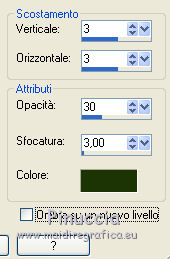 qui puoi trovare qualche risposta ai tuoi dubbi. Se l'argomento che ti interessa non è presente, ti prego di segnalarmelo. Questo tutorial è una creazione di ©Titoune e non può essere copiato su altri siti nè essere offerto per il download. Lo stesso vale per la mia traduzione. Il tutorial è stato creato con PSP X5, ma può essere eseguito anche con le altre versioni di PSP. Secondo la versione utilizzata (anteriore a PSP X) potresti ottenere dei risultati differenti. Vedi la mia scheda riguardante le funzioni Rifletti>Capovolgi in X4 e X5 qui Per tradure il tutorial ho usato PSP X. Occorrente: Un tube a scelta. Il resto del materiale qui Il tube utilizzato è di Roby. ![]() 1. Apri una nuova immagine trasparente 750 x 600 pixels. Selezione>Seleziona tutto. 2. Apri l'elemento Paper 4 e vai a Modifica>Copia. Torna al tuo lavoro e vai a Modifica>Incolla nella selezione. Selezione>Deseleziona. 3. Apri l'elemento 23 e vai a Modifica>Copia. Torna al tuo lavoro e vai a Modifica>Incolla come nuovo livello. Lascialo come sta. 4. Effetti>Effetti 3D>Sfalsa ombra, colore #1d3406. ![]() Ripeti l'Effetto Sfalsa ombra, cambiando verticale e orizzontale con -3. 5. Apri l'elemento 22 e vai a Modifica>Copia. Torna al tuo lavoro e vai a Modifica>Incolla come nuovo livello. Spostalo nella parte superiore della cornice.Vedi l'esempio finale. Effetti>Effetti 3D>Sfalsa ombra, colore #1d3406. ![]() 6. Apri l'elemento 25 e vai a Modifica>Copia. Torna al tuo lavoro e vai a Modifica>Incolla come nuovo livello. Spostalo al centro della cornice.Vedi l'esempio finale. Livelli>Disponi>Sposta giù (sotto il livello della cornice). ![]() Effetti>Effetti 3D>Sfalsa ombra, con i settaggi precedenti. 7. Attiva nuovamente il livello superiore. Apri l'elemento 15 e vai a Modifica>Copia. Torna al tuo lavoro e vai a Modifica>Incolla come nuovo livello. Spostalo nella parte superiore destra della cornice.Vedi l'esempio finale. Effetti>Effetti 3D>Sfalsa ombra, con i settaggi precedenti. 8. Apri l'elemento 3 e vai a Modifica>Copia. Torna al tuo lavoro e vai a Modifica>Incolla come nuovo livello. Spostalo nella parte destra della cornice.![]() Effetti>Effetti 3D>Sfalsa ombra, con i settaggi precedenti. 9. Apri l'elemento 20 e vai a Modifica>Copia. Torna al tuo lavoro e vai a Modifica>Incolla come nuovo livello. Spostalo in alto a sinistra.Vedi l'esempio finale. Effetti>Effetti 3D>Sfalsa ombra, con i settaggi precedenti. 10. Apri l'elemento 17 e vai a Modifica>Copia. Torna al tuo lavoro e vai a Modifica>Incolla come nuovo livello. Spostalo nella parte sinistra della cornice.![]() Effetti>Effetti 3D>Sfalsa ombra, con i settaggi precedenti. 11. Apri l'elemento 2 e vai a Modifica>Copia. Torna al tuo lavoro e vai a Modifica>Incolla come nuovo livello. Spostalo in basso a sinistra.Vedi l'esempio finale. Effetti>Effetti 3D>Sfalsa ombra, con i settaggi precedenti. Livelli>Duplica. Immagine>Rifletti. 12. Apri l'elemento 14 e vai a Modifica>Copia. Torna al tuo lavoro e vai a Modifica>Incolla come nuovo livello. Spostalo in basso a destra.Vedi l'esempio finale. Effetti>Effetti 3D>Sfalsa ombra, con i settaggi precedenti. Livelli>Disponi>Sposta giù. 13. Attiva nuovamente il livello superiore. Apri l'elemento 18 e vai a Modifica>Copia. Torna al tuo lavoro e vai a Modifica>Incolla come nuovo livello. Spostalo in basso a sinistra.Vedi l'esempio finale. Effetti>Effetti 3D>Sfalsa ombra, con i settaggi precedenti. 14. Apri l'elemento 1 e vai a Modifica>Copia. Torna al tuo lavoro e vai a Modifica>Incolla come nuovo livello. Spostalo in basso.Vedi l'esempio finale. Effetti>Effetti 3D>Sfalsa ombra, con i settaggi precedenti. 15. Apri l'elemento 16 e vai a Modifica>Copia. Torna al tuo lavoro e vai a Modifica>Incolla come nuovo livello. Spostalo in basso.![]() Effetti>Effetti 3D>Sfalsa ombra, con i settaggi precedenti. 16. Apri l'elemento LKD_GivingThanksTS_bird e vai a Modifica>Copia. Torna al tuo lavoro e vai a Modifica>Incolla come nuovo livello. Spostalo nella cornice, in basso a destra.Vedi l'esempio finale. Effetti>Effetti 3D>Sfalsa ombra, con i settaggi precedenti. 17. Apri il wordart spring-2bgpsoq e vai a Modifica>Copia. Torna al tuo lavoro e vai a Modifica>Incolla come nuovo livello. Spostalo nella cornice.Vedi l'esempio finale. Effetti>Effetti 3D>Sfalsa ombra, con i settaggi precedenti. 17. Apri il tuo tube e vai a Modifica>Copia. Torna al tuo lavoro e vai a Modifica>Incolla come nuovo livello. Immagine>Ridimensiona, se e quanto necessario, tutti i livelli non selezionato. Spostalo dove preferisci,o vedi il mio esempio. Effetti>Effetti 3D>Sfalsa ombra, con i settaggi precedenti. 19. Assicurati di essere posizionato sul livello superiore. Apri l'elemento titoune_border e vai a Modifica>Copia. Torna al tuo lavoro e vai a Modifica>Incolla come nuovo livello. Effetti>Effetti 3D>Sfalsa ombra, con i settaggi precedenti. Firma il tuo lavoro. Livelli>Unisci>Unisci tutto e salva in formato jpg. ![]() Se hai problemi o dubbi, o trovi un link non funzionante, scrivimi. 23 Marzo 2014 |