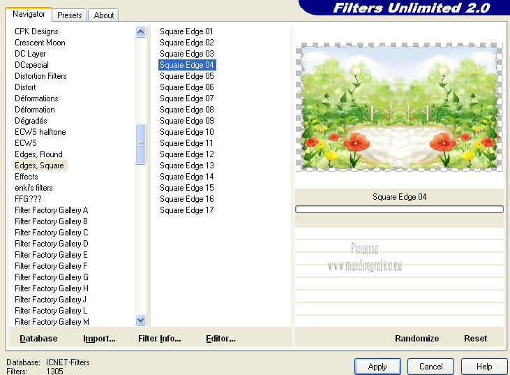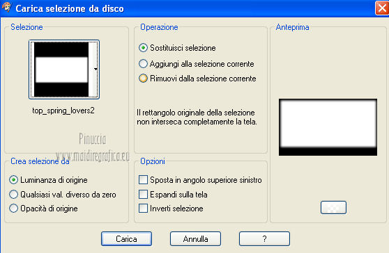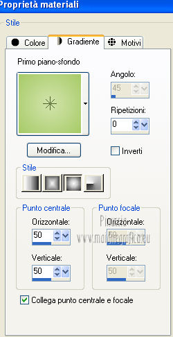 qui puoi trovare qualche risposta ai tuoi dubbi. Se l'argomento che ti interessa non è presente, ti prego di segnalarmelo. Questo tutorial è una creazione di ©Titoune e non può essere copiato su altri siti nè essere offerto per il download. Lo stesso vale per la mia traduzione. Il tutorial è stato creato con PSP X5, ma può essere eseguito anche con le altre versioni di PSP. Secondo la versione utilizzata (anteriore a PSP X) potresti ottenere dei risultati differenti. Per tradurlo, ho usato PSP X. Grazie ai creatori dei tubes che mettono a disposizione il loro lavoro in vari gruppi di condivisione. Rispetta il lavoro degli autori, non cambiare il nome del file e non cancellare il watermark. Occorrente: Un tube a scelta. Il resto del materiale qui Filtri: Adjust - Variations qui Filters Unlimited 2.0 qui ![]() Metti le selezioni nella cartella Selezioni. Apri la maschera in PSP e minimizzala con il resto del materiale. 1. Imposta il colore di primo piano con #d2e4ac, e il colore di sfondo con #a6ca66. Passa il colore di primo piano a Gradiente, stile Sprazzo di luce, con i seguenti settaggi. ![]() 2. Apri l'immagine Vector_spring_illustration_ViewIllustrator_2009. Rimani su questa immagine. Attiva lo strumento Selezione , rettangolo,e seleziona una piccola porzione per fare una trama. ![]() Modifica>Copia, e minimizza l'immagine che ti servirà ancora. Sulla tua area di lavoro: Modifica>Incolla come nuova IMMAGINE. 3. Regola>Sfocatura>Sfocatura gaussiana - raggio 25. ![]() Modifica>Copia. 4. Apri una nuova immagine trasparente 1280 x 750 pixels. Selezione>Seleziona tutto. Modifica>Incolla nella selezione. Selezione>Deseleziona. 5. Effetti>Effetti di trama>Nappa, con i settaggi standard. ![]() 6. Livelli>Nuovo livello maschera>Da immagine. Apri il menu sotto la finestra di origine e vedrai la lista dei files aperti. Seleziona la maschera PrettyJu_MaskBordure33, con i seguenti settaggi: ![]() Livelli>Unisci>Unisci gruppo. 7. Selezione>Carica/Salva selezione>Carica selezione da disco. Cerca e carica la selezione "top_spring_lover". ![]() 8. Effetti>Plugins>Adjust - Variatons, un clic su Original per annullare eventuali precedenti settaggi memorizzati dal filtro, tre clic su Darker e ok. 9. Selezione>Carica/Salva selezione>Carica selezione da disco. Cerca e carica la selezione "top_spring_lover2". ![]() Livelli>Nuovo livello raster. 10. Attiva nuovamente l'immagine Vector_spring_illustration_ViewIllustrator_2009. Rimani su questa immagine. Livelli>Innalza livello di sfondo. Effetti>Effetti di riflesso>Specchio rotante l'effetto è stato applicato sull'immagine fornita per dare al giardino la forma di un cuore. Se stai usando un'altra immagine, dovrai valutare. ![]() Risultato ![]() 11. Effetti>Plugins>Filters Unlimited 2.0 - Edges Square - Square Edge 04. ![]() Modifica>Copia. Torna al tuo lavoro che hai lasciato in attesa con la selezione attiva. Modifica>Incolla nella selezione. Selezione>Deseleziona. Livelli>Duplica. 12. Attiva il livello sottostante dell'originale. Effetti>Effetti 3D>Sfalsa ombra, con il colore #233d05. ![]() Ripeti l'Effetto Sfalsa ombra, cambiando verticale e orizzontale con -3. 13. Attiva nuovamente il livello superiore. Apri l'elemento bordure_top_spring_lovers e vai a Modifica>Copia. Torna al tuo lavoro e vai a Modifica>Incolla come nuovo livello. Sposta l'elemento contro il bordo superiore.Se stai usando PSP X5: Oggetti>Allinea>Superiore ![]() Effetti>Effetti 3D>Sfalsa ombra, con i settaggi precedenti. 14. Apri l'elemento 2420d368 (i due fiori) e vai a Modifica>Copia. Torna al tuo lavoro e vai a Modifica>Incolla come nuovo livello. Spostalo in basso.Vedi l'esempio finale. Effetti>Effetti 3D>Sfalsa ombra, con i settaggi precedenti. 15. Apri l'elemento fdabdbb5 (il cestino di fiori) e vai a Modifica>Copia. Torna al tuo lavoro e vai a Modifica>Incolla come nuovo livello. Spostalo in basso.Effetti>Effetti 3D>Sfalsa ombra, con i settaggi precedenti. ![]() 16. Apri l'elemento d8b2fd21 (vasi) e vai a Modifica>Copia. Torna al tuo lavoro e vai a Modifica>Incolla come nuovo livello. Spostalo a destra.Effetti>Effetti 3D>Sfalsa ombra, con i settaggi precedenti. ![]() 17. Apri l'elemento wordart_spring_lover e vai a Modifica>Copia. Torna al tuo lavoro e vai a Modifica>Incolla come nuovo livello. Spostalo in alto a destra.Vedi l'esempio finale. Effetti>Effetti 3D>Sfalsa ombra, con i settaggi precedenti. 18. Apri il tuo tube e vai a Modifica>Copia. Torna al tuo lavoro e vai a Modifica>Incolla come nuovo livello. Immagine>Ridimensiona, se e quanto necessario, tutti i livelli non selezionato. Spostalo dove preferisci o vedi il mio esempio.Effetti>Effetti 3D>Sfalsa ombra, con i settaggi precedenti. 19. Attiva il livello inferiore della maschera. Selezione>Seleziona tutto. Immagine>Ritaglia la selezione. 20. Immagine>Dimensioni tela - 1280 x 1500 pixels. ![]() 21. Livelli>Nuovo livello raster. Livelli>Disponi>Sposta giù. Riempi con il gradiente.22. Attiva nuovamente il livello della maschera. Effetti>Effetti 3D>Sfalsa ombra, con i settaggi precedenti. Selezione>Carica/Salva selezione>Carica selezione da disco. Cerca e carica la selezione "top_spring_lover3". ![]() Selezione>Innalza selezione a livello. Livelli>Disponi>Sposta su - 2 volte. Il livello deve trovarsi sopra i livelli del paesaggio. ![]() 24. Effetti>Effetti 3D>Smusso a incasso. ![]() Selezione>Deseleziona. Effetti>Effetti 3D>Sfalsa ombram, con i settaggi precedenti. 25. Firma il tuo lavoro. Livelli>Unisci>Unisci tutto e salva in formato jpg. ![]() Se hai problemi o dubbi, o trovi un link non funzionante, scrivimi. 6 Aprile 2013 |