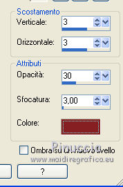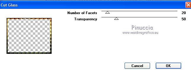 qui puoi trovare qualche risposta ai tuoi dubbi. Se l'argomento che ti interessa non è presente, ti prego di segnalarmelo. Questo tutorial è una creazione di ©Titoune e non può essere copiato su altri siti nè essere offerto per il download. Lo stesso vale per la mia traduzione. Il tutorial è stato creato con PSP X5, ma può essere eseguito anche con le altre versioni di PSP. Secondo la versione utilizzata (anteriore a PSP X) potresti ottenere dei risultati differenti. Dalla versione X4, il comando Immagine>Rifletti è stato sostituito con Immagine>Capovolgi in orizzontale, e il comando Immagine>Capovolgi con Immagine>Capovolgi in verticale. Nelle versioni X5 e X6, le funzioni sono state migliorate rendendo disponibile il menu Oggetti. Vedi la scheda sull'argomento qui Per tradure il tutorial ho usato PSP X. Occorrente: Un tube a scelta. Il resto del materiale qui Filtri Graphics Plus - Cut Glass qui ![]() 1. Apri una nuova immagine trasparente 750 x 600 pixels. Selezione>Seleziona tutto. 2. Apri l'elemento Disyas_SprinIMSoul_P8 e vai a Modifica>Copia. Torna al tuo lavoro e vai a Modifica>Incolla nella selezione. Selezione>Deseleziona. 3. Apri l'elemento Desclics_SpringInMySoul_004, e vai a Modifica>Copia. Torna al tuo lavoro e vai a Modifica>Incolla come nuovo livello. Lascialo come sta. 4. Effetti>Effetti 3D>Sfalsa ombra, colore #862022. ![]() 5. Apri l'elemento Desclics_SpringInMySoul_039, e vai a Modifica>Copia. Torna al tuo lavoro e vai a Modifica>Incolla come nuovo livello. Spostalo nella parte inferiore della cornice.Vedi l'esempio finale. Effetti>Effetti 3D>Sfalsa ombra, con i settaggi precedenti. 6. Apri l'elemento Desclics_SpringInMySoul_044, e vai a Modifica>Copia. Torna al tuo lavoro e vai a Modifica>Incolla come nuovo livello. Spostalo nella parte inferiore sinistra della cornice.Vedi l'esempio finale. Effetti>Effetti 3D>Sfalsa ombra, con i settaggi precedenti. 7. Apri l'elemento Desclics_SpringInMySoul_026, e vai a Modifica>Copia. Torna al tuo lavoro e vai a Modifica>Incolla come nuovo livello. Spostalo nella parte inferiore della cornice.![]() Effetti>Effetti 3D>Sfalsa ombra, con i settaggi precedenti. 8. Apri l'elemento Desclics_SpringInMySoul_002, e vai a Modifica>Copia. Torna al tuo lavoro e vai a Modifica>Incolla come nuovo livello. Spostalo nella parte superiore sinistra della cornice.Vedi l'esempio finale. Effetti>Effetti 3D>Sfalsa ombra, con i settaggi precedenti. 9. Apri l'elemento Desclics_SpringInMySoul_015, e vai a Modifica>Copia. Torna al tuo lavoro e vai a Modifica>Incolla come nuovo livello. Spostalo in alto a sinistra.Vedi l'esempio finale. Effetti>Effetti 3D>Sfalsa ombra, con i settaggi precedenti. 10. Apri l'elemento Desclics_SpringInMySoul_047, e vai a Modifica>Copia. Torna al tuo lavoro e vai a Modifica>Incolla come nuovo livello. Spostalo nella parte superiore della cornice.![]() Effetti>Effetti 3D>Sfalsa ombra, con i settaggi precedenti. 11. Apri l'elemento Desclics_SpringInMySoul_041, e vai a Modifica>Copia. Torna al tuo lavoro e vai a Modifica>Incolla come nuovo livello. Spostalo nella parte superiore destra della cornice.Vedi l'esempio finale. Effetti>Effetti 3D>Sfalsa ombra, con i settaggi precedenti. 12. Apri l'elemento Desclics_SpringInMySoul_046, e vai a Modifica>Copia. Torna al tuo lavoro e vai a Modifica>Incolla come nuovo livello. Spostalo in alto a destra.![]() Effetti>Effetti 3D>Sfalsa ombra, con i settaggi precedenti. 13. Apri l'elemento Desclics_SpringInMySoul_012, e vai a Modifica>Copia. Torna al tuo lavoro e vai a Modifica>Incolla come nuovo livello. Spostalo in basso a destra della cornice.![]() Effetti>Effetti 3D>Sfalsa ombra, con i settaggi precedenti. 14. Apri l'elemento Desclics_SpringInMySoul_028, e vai a Modifica>Copia. Torna al tuo lavoro e vai a Modifica>Incolla come nuovo livello. Spostalo in basso a destra della cornice.Vedi l'esempio finale. Effetti>Effetti 3D>Sfalsa ombra, con i settaggi precedenti. 15. Apri l'elemento Desclics_SpringInMySoul_010, e vai a Modifica>Copia. Torna al tuo lavoro e vai a Modifica>Incolla come nuovo livello. Spostalo in basso a destra.![]() Effetti>Effetti 3D>Sfalsa ombra, con i settaggi precedenti. 16. Apri il tuo tube e vai a Modifica>Copia. Torna al tuo lavoro e vai a Modifica>Incolla come nuovo livello. Immagine>Ridimensiona, se e quanto necessario, tutti i livelli non selezionato. Spostalo dove preferisci,o vedi l mio esempio. Effetti>Effetti 3D>Sfalsa ombra, con i settaggi precedenti. 17. Attiva il livello inferiore. Selezione>Seleziona tutto. Selezione>Modifica>Contrai - 15 pixels. Selezione>Inverti. Selezione>Innalza selezione a livello. 18. Effetti>Plugins>Graphics Plus - Cut Glass, con i settaggi standard. ![]() 19. Effetti>Effetti 3D>Smusso a incasso. ![]() Selezione>Deseleziona. Firma il tuo lavoro. Livelli>Unisci>Unisci tutto e salva in formato jpg. ![]() Le vostre versioni. Grazie ![]() Lina ![]() Se hai problemi o dubbi, o trovi un link non funzionante, scrivimi. 1 Giugno 2014 |