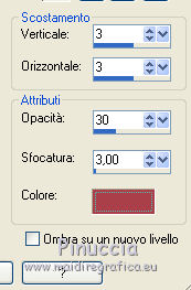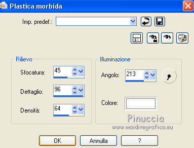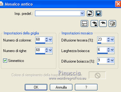 qui puoi trovare qualche risposta ai tuoi dubbi. Se l'argomento che ti interessa non è presente, ti prego di segnalarmelo. Questo tutorial è una creazione di ©Titoune e non può essere copiato su altri siti nè essere offerto per il download. Lo stesso vale per la mia traduzione. Il tutorial è stato creato con PSP X5, ma può essere eseguito anche con le altre versioni di PSP. Secondo la versione utilizzata (anteriore a PSP X) potresti ottenere dei risultati differenti. Vedi la mia scheda riguardante le funzioni Rifletti>Capovolgi in X4 e X5 qui Per tradure il tutorial ho usato PSP X. Occorrente: Un tube a scelta. Il resto del materiale qui Filtri Penta.com - Jeans qui DSB Flux - Bright Noise qui ![]() Animation Shop qui 1. Apri una nuova immagine trasparente 750 x 600 pixels. 2. Apri l'elemento Frame e vai a Modifica>Copia. Torna al tuo lavoro e vai a Modifica>Incolla come nuovo livello. Non spostarlo. 3. Attiva lo strumento Bacchetta magica ![]() e clicca al centro della cornice per selezionarla. Selezione>Modifica>Espandi - 3 pixels. Livelli>Nuovo livello raster. Livelli>Disponi>Sposta giù. 4. Apri l'immagine 1233368-bigthumbnail, e vai a Modifica>Copia. Torna al tuo lavoro e vai a Modifica>Incolla nella selezione. Selezione>Inverti. Attiva nuovamente il livello inferiore. 5. Modifica>Incolla nella selezione. Selezione>Innalza selezione a livello. Regola>Sfocatura>Sfocatura gaussiana - raggio 15. ![]() 6. Effetti>Effetti di trama>Plastica morbida. ![]() Selezione>Deseleziona. 7. Attiva il livello della cornice. Effetti>Effetti 3D>Sfalsa ombra, colore #aa3f49. ![]() Ripeti l'Effetto Sfalsa ombra, cambiando verticale e orizzontale con -3. 8. Apri l'elemento Grass e vai a Modifica>Copia. Torna al tuo lavoro e vai a Modifica>Incolla come nuovo livello. Spostalo in basso, sul bordo.Vedi l'esempio finale. Effetti>Effetti 3D>Sfalsa ombra, colore #aa3f49. ![]() Porta questo livello sotto il livello della cornice. 9. Attiva il livello superiore. Apri l'elemento BWC_SpringParty_EL11, e vai a Modifica>Copia. Torna al tuo lavoro e vai a Modifica>Incolla come nuovo livello. Spostalo nella parte inferiore sinistra della cornice.Vedi l'esempio finale. Effetti>Effetti 3D>Sfalsa ombra, con i settaggi precedenti. 10. Apri l'elemento BWC_SpringParty_EL10, e vai a Modifica>Copia. Torna al tuo lavoro e vai a Modifica>Incolla come nuovo livello. Spostalo a sinistra.Vedi l'esempio finale. Effetti>Effetti 3D>Sfalsa ombra, con i settaggi precedenti. 11. Apri l'elemento BWC_SpringParty_EL19, e vai a Modifica>Copia. Torna al tuo lavoro e vai a Modifica>Incolla come nuovo livello. Spostalo in basso a sinistra.![]() Effetti>Effetti 3D>Sfalsa ombra, con i settaggi precedenti. 12. Apri l'elemento BWC_SpringParty_EL8, e vai a Modifica>Copia. Torna al tuo lavoro e vai a Modifica>Incolla come nuovo livello. Spostalo in basso a sinistra.![]() Effetti>Effetti 3D>Sfalsa ombra, con i settaggi precedenti. 13. Apri l'elemento BWC_SpringParty_EL4, e vai a Modifica>Copia. Torna al tuo lavoro e vai a Modifica>Incolla come nuovo livello. Spostalo in alto a sinistra.Vedi l'esempio finale. Effetti>Effetti 3D>Sfalsa ombra, con i settaggi precedenti. Porta questo livello sotto il livello dei palloncini. ![]() 14. Attiva il livello superiore. Apri l'elemento BWC_SpringParty_EL13, e vai a Modifica>Copia. Torna al tuo lavoro e vai a Modifica>Incolla come nuovo livello. Spostalo nella parte superore sinistra della cornice.Vedi l'esempio finale. Effetti>Effetti 3D>Sfalsa ombra, con i settaggi precedenti. 15. Apri l'elemento BWC_SpringParty_EL17, e vai a Modifica>Copia. Torna al tuo lavoro e vai a Modifica>Incolla come nuovo livello. Spostalo nella parte superiore della cornice.![]() Effetti>Effetti 3D>Sfalsa ombra, con i settaggi precedenti. 16. Apri l'elemento BWC_SpringParty_EL6, e vai a Modifica>Copia. Torna al tuo lavoro e vai a Modifica>Incolla come nuovo livello. Spostalo in alto a destra.Vedi l'esempio finale. Effetti>Effetti 3D>Sfalsa ombra, con i settaggi precedenti. 17. Apri l'elemento BWC_SpringParty_EL3, e vai a Modifica>Copia. Torna al tuo lavoro e vai a Modifica>Incolla come nuovo livello. Spostalo nella parte superiore destra della cornice.Vedi l'esempio finale. Effetti>Effetti 3D>Sfalsa ombra, con i settaggi precedenti. 18. Apri l'elemento BWC_SpringParty_EL12, e vai a Modifica>Copia. Torna al tuo lavoro e vai a Modifica>Incolla come nuovo livello. Spostalo nella parte inferiore destra della cornice.![]() Effetti>Effetti 3D>Sfalsa ombra, con i settaggi precedenti. 19. Apri l'elemento BWC_SpringParty_EL2, e vai a Modifica>Copia. Torna al tuo lavoro e vai a Modifica>Incolla come nuovo livello. Spostalo a destra.Vedi l'esempio finale. Effetti>Effetti 3D>Sfalsa ombra, con i settaggi precedenti. 20. Apri l'elemento BWC_SpringParty_EL9, e vai a Modifica>Copia. Torna al tuo lavoro e vai a Modifica>Incolla come nuovo livello. Spostalo in basso a destra.Vedi l'esempio finale. Effetti>Effetti 3D>Sfalsa ombra, con i settaggi precedenti. 21. Apri l'elemento BWC_SpringParty_EL5, e vai a Modifica>Copia. Torna al tuo lavoro e vai a Modifica>Incolla come nuovo livello. Spostalo in basso.Vedi l'esempio finale. Effetti>Effetti 3D>Sfalsa ombra, con i settaggi precedenti. 22. Apri l'elemento BWC_SpringParty_EL18, e vai a Modifica>Copia. Torna al tuo lavoro e vai a Modifica>Incolla come nuovo livello. Spostalo in basso.![]() Effetti>Effetti 3D>Sfalsa ombra, con i settaggi precedenti. 23. Apri l'elemento wordart_spring, e vai a Modifica>Copia. Torna al tuo lavoro e vai a Modifica>Incolla come nuovo livello. Spostalo nella cornice.Vedi l'esempio finale. Effetti>Effetti 3D>Sfalsa ombra, con i settaggi precedenti. 24. Apri il tuo tube, e vai a Modifica>Copia. Torna al tuo lavoro e vai a Modifica>Incolla come nuovo livello. Immagine>Ridimensiona, se e quanto necessario, tutti i livelli non selezionato. Spostalo dove preferisci,o vedi il mio esempio. Effetti>Effetti 3D>Sfalsa ombra, con i settaggi precedenti. 25. Attiva il livello inferiore. 