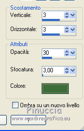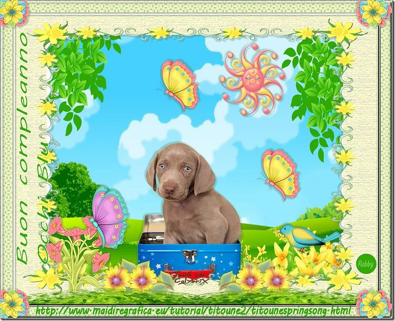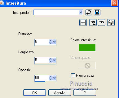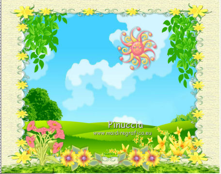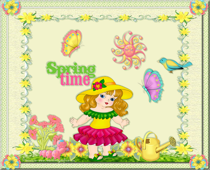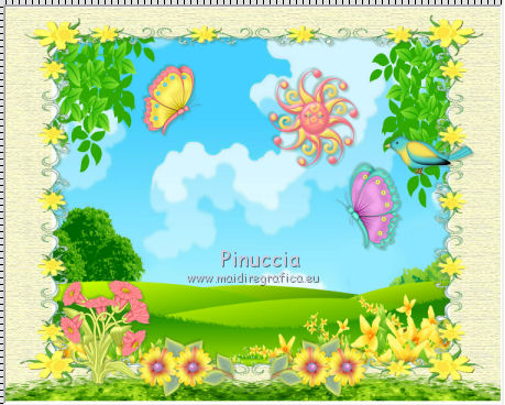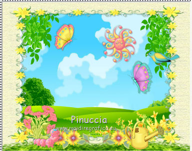 qui puoi trovare qualche risposta ai tuoi dubbi. Se l'argomento che ti interessa non è presente, ti prego di segnalarmelo. Questo tutorial è una creazione di ©Titoune e non può essere copiato su altri siti nè essere offerto per il download. Lo stesso vale per la mia traduzione. Il tutorial è stato creato con Corel17, ma può essere eseguito anche con le altre versioni di PSP. Secondo la versione utilizzata (anteriore a PSP X) potresti ottenere dei risultati differenti. Dalla versione X4, il comando Immagine>Rifletti è stato sostituito con Immagine>Capovolgi in orizzontale, e il comando Immagine>Capovolgi con Immagine>Capovolgi in verticale. Nelle versioni X5 e X6, le funzioni sono state migliorate rendendo disponibile il menu Oggetti. Con il nuovo X7 sono tornati i comandi Rifletti/Capovolgi, ma con nuove differenze. Vedi la scheda sull'argomento qui Per tradurre il tutorial ho usato PSP X. Occorrente: Un tube a scelta. Il resto del materiale qui Il tube utilizzato è di Nikita. Filtri in caso di dubbi, ricorda di consultare la mia sezione filtri qui Filters Unlimited 2.0 qui Simple - Top Left Mirror qui I filtri Simple si possono usare da soli o importati in Filters Unlimited (come fare vedi qui) Se un filtro fornito appare con questa icona ![]() 1. Apri una nuova immagine trasparente 750 x 600 pixels. Selezione>Seleziona tutto. 2. Apri l'elemento 10-springPF1, e vai a Modifica>Copia. Torna al tuo lavoro e vai a Modifica>Incolla nella selezione. Selezione>Deseleziona. Rinomina questo livello "cornice". 3. Attiva lo strumento Selezione , rettangolo,e traccia una selezione intorno alla cornice. ![]() 4. Livelli>Nuovo livello raster. Livelli>Disponi>Sposta giù. 5. Apri l'immagine del paesaggio. Immagine>Rifletti. Modifica>Copia. Torna al tuo lavoro e vai a Modifica>Incolla nella selezione. Selezione>Deseleziona. 6. Attiva il livello superiore. Apri l'elemento grass, e vai a Modifica>Copia. Torna al tuo lavoro e vai a Modifica>Incolla come nuovo livello. Spostalo in basso.Vedi l'esempio finale. 7. Attiva il livello della cornice. Effetti>Effetti 3D>Sfalsa ombra, colore #3e6d3b. ![]() Ripeti l'Effetto Sfalsa ombra, cambiando verticale e orizzontale con -3. 8. Apri l'elemento Flower6, e vai a Modifica>Copia. Torna al tuo lavoro e vai a Modifica>Incolla come nuovo livello. Spostalo nella parte inferiore della cornice.Vedi l'esempio finale. Effetti>Effetti 3D>Sfalsa ombra, con i settaggi precedenti. Livelli>Duplica. Immagine>Rifletti. 9. Apri l'elemento Flower1, e vai a Modifica>Copia. Torna al tuo lavoro e vai a Modifica>Incolla come nuovo livello. Spostalo in basso a sinistra.Effetti>Effetti 3D>Sfalsa ombra, con i settaggi precedenti. 10. Apri l'elemento Sun1, e vai a Modifica>Copia. Torna al tuo lavoro e vai a Modifica>Incolla come nuovo livello. Spostalo nella parte superiore destra del paesaggio.![]() Effetti>Effetti 3D>Sfalsa ombra, con i settaggi precedenti. 11. Apri l'elemento Bird1, e vai a Modifica>Copia. Torna al tuo lavoro e vai a Modifica>Incolla come nuovo livello. Spostalo dove preferisci,o vedi il mio esempio. Effetti>Effetti 3D>Sfalsa ombra, con i settaggi precedenti. 12. Copia e incolla sul tuo lavoro gli elementi BFly 1 e BFly2 e posizionali nel paesaggio.![]() Effetti>Effetti 3D>Sfalsa ombra, con i settaggi precedenti. 13. Apri l'elemento WateringCan, e vai a Modifica>Copia. Torna al tuo lavoro e vai a Modifica>Incolla come nuovo livello. Spostalo nella parte inferiore.Vedi l'esempio finale. Effetti>Effetti 3D>Sfalsa ombra, con i settaggi precedenti. 14. Apri l'elemento Caterpillar, e vai a Modifica>Copia. Torna al tuo lavoro e vai a Modifica>Incolla come nuovo livello. Immagine>Rifletti. Spostalo in basso a sinistra.![]() Effetti>Effetti 3D>Sfalsa ombra, con i settaggi precedenti. 15. Apri l'elemento wordart_spring, e vai a Modifica>Copia. Torna al tuo lavoro e vai a Modifica>Incolla come nuovo livello. Immagine>Ridimensiona, a tuo piacimento, tutti i livelli non selezionato. Posiziona l'elemento dove preferisci, o vedi il mio esempio.Effetti>Effetti 3D>Sfalsa ombra, con i settaggi precedenti. 16. Apri il tuo tube, e vai a Modifica>Copia. Torna al tuo lavoro e vai a Modifica>Incolla come nuovo livello. Immagine>Ridimensiona, se e quanto necessario, tutti i livelli non selezionato. Spostalo dove preferisci o vedi il mio esempio.Effetti>Effetti 3D>Sfalsa ombra, con i settaggi precedenti. 17. Attiva il livello "cornice". Selezione>Seleziona tutto. Selezione>Modifica>Contrai - 5 pixels. Selezione>Inverti. Selezione>Innalza selezione a livello. Livelli>Disponi>Porta in alto. 18. Effetti>Effetti 3D>Smusso a incasso. ![]() Selezione>Deseleziona. Effetti>Effetti 3D>Sfalsa ombra, con i settaggi precedenti. 19. Attiva il livello della cornice. Imposta il colore di primo piano con #f2f3ca. 20. Selezione>Seleziona tutto. Immagine>Ritaglia la selezione. Immagine>Dimensioni tela - 800 x 650 pixels. ![]() 21. Livelli>Nuovo livello raster. Livelli>Disponi>Porta sotto. Riempi con il colore di primo piano.22. Selezione>Seleziona tutto. Selezione>Modifica>Contrai - 25 pixels. Selezione>Inverti. 23. Effetti>Effetti di trama>Intessitura - colore intessitura #30a702. ![]() 24. Selezione>Seleziona tutto. Selezione>Modifica>Contrai - 5 pixels. Selezione>Inverti. Selezione>Innalza selezione a livello. Livelli>Disponi>Porta in alto. Effetti>Effetti 3D>Smusso a incasso, con i settaggi precedenti. Selezione>Deseleziona. Effetti>Effetti 3D>Sfalsa ombra, con i settaggi precedenti. 25. Apri l'elemento Bow1, e vai a Modifica>Copia. Torna al tuo lavoro e vai a Modifica>Incolla come nuovo livello. Spostalo nell'angolo in alto a sinistra.Effetti>Plugins>Simple - Top Left Mirror. Effetti>Effetti 3D>Sfalsa ombra, con i settaggi precedenti. 26. Firma il tuo lavoro. Livelli>Unisci>Unisci tutto e salva in formato jpg. Le vostre versioni.Grazie ![]() Robby ![]() Se hai problemi o dubbi, o trovi un link non funzionante, scrivimi. 4 Giugno 2015 |