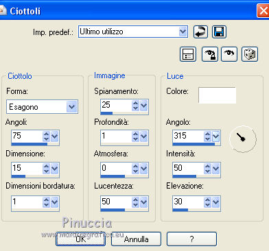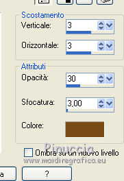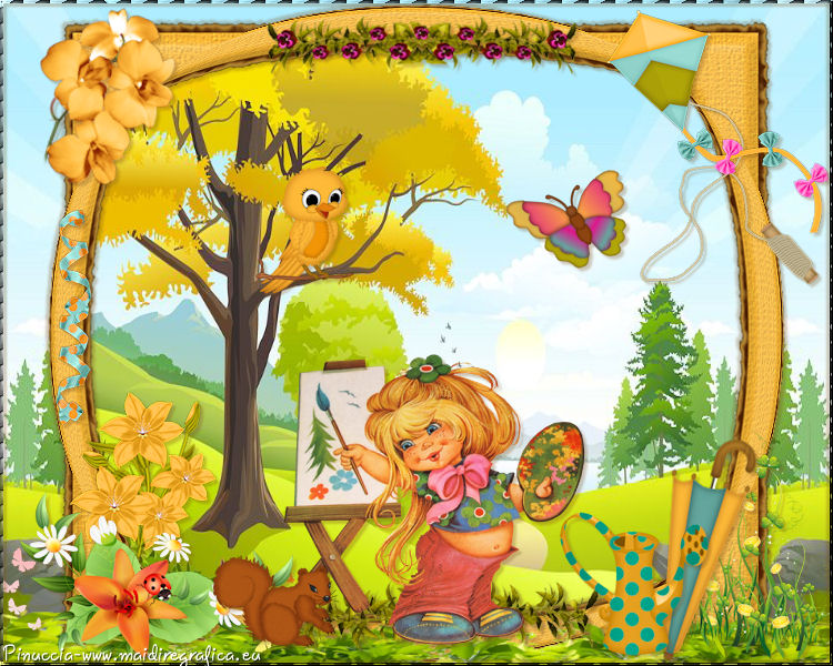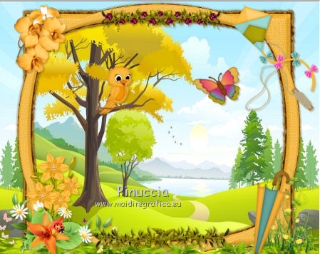 qui puoi trovare qualche risposta ai tuoi dubbi. Se l'argomento che ti interessa non è presente, ti prego di segnalarmelo. Questo tutorial è una creazione di ©Titoune e non può essere copiato su altri siti nè essere offerto per il download. Lo stesso vale per la mia traduzione. Il tutorial è stato creato con Corel17, ma può essere eseguito anche con le altre versioni di PSP. Secondo la versione utilizzata (anteriore a PSP X) potresti ottenere dei risultati differenti. Dalla versione X4, il comando Immagine>Rifletti è stato sostituito con Immagine>Capovolgi in orizzontale, e il comando Immagine>Capovolgi con Immagine>Capovolgi in verticale. Nelle versioni X5 e X6, le funzioni sono state migliorate rendendo disponibile il menu Oggetti. Con il nuovo X7 sono tornati i comandi Rifletti/Capovolgi, ma con nuove differenze. Vedi la scheda sull'argomento qui Per tradurre il tutorial ho usato PSP X. Occorrente: Un tube a scelta. Il resto del materiale qui Il tube utilizzato è di Jer. ![]() 1. Apri una nuova immagine 750 x 600 pixels. Selezione>Seleziona tutto. 2. Apri l'immagine 547782_clouds_trees_grass.., e vai a Modifica>Copia. Torna al tuo lavoro e vai a Modifica>Incolla nella selezione. Selezione>Deseleziona. Immagine>Rifletti. 3. Effetti>Effetti di riflesso>Specchio rotante. ![]() 4. Apri l'elemento BBD_STF_FRAME_3, e vai a Modifica>Copia. Torna al tuo lavoro e vai a Modifica>Incolla come nuovo livello. Non spostarlo. 5. Attiva lo strumento Bacchetta magica ![]() e clicca al centro della cornice per selezionarla. Selezione>Modifica>Espandi - 3 pixels. 6. Livelli>Nuovo livello raster. Livelli>Disponi>Sposta giù. Attiva nuovamente l'immagine 547782_clouds_trees_grass_.., e vai a Modifica>Copia. Torna al tuo lavoro e vai a Modifica>Incolla nella selezione. Selezione>Deseleziona. 7. Attiva nuovamente il livello della cornice. Effetti>Effetti 3D>Sfalsa ombra, colore #784b17. ![]() Ripeti l'Effetto Sfalsa ombra, cambiando verticale e orizzontale con -3. 8. Apri l'elemento leaves, e vai a Modifica>Copia. Torna al tuo lavoro e vai a Modifica>Incolla come nuovo livello. Spostalo in basso.Con Corel17: Oggetti>Allinea>Inferiore Effetti>Effetti 3D>Sfalsa ombra, colore #784b17. ![]() 9. Apri l'elemento BBD_STF_BABY ROBIN_01, e vai a Modifica>Copia. Torna al tuo lavoro e vai a Modifica>Incolla come nuovo livello. Spostalo nella parte sinistra della cornice.Vedi l'esempio finale. Effetti>Effetti 3D>Sfalsa ombra, con i settaggi precedenti. 10. Apri l'elemento BBD_STF_BUTTERFLY_01, e vai a Modifica>Copia. Torna al tuo lavoro e vai a Modifica>Incolla come nuovo livello. Spostalo nel paesaggio come nell'esempio finale,o dove preferisci. Effetti>Effetti 3D>Sfalsa ombra, con i settaggi precedenti. 11. Apri l'elemento BBD_STF_FLOWERS_02, e vai a Modifica>Copia. Torna al tuo lavoro e vai a Modifica>Incolla come nuovo livello. Spostalo in basso a sinistra.Vedi l'esempio finale. Effetti>Effetti 3D>Sfalsa ombra, con i settaggi precedenti. 12. Apri l'elemento SassyD-LLElements (39), e vai a Modifica>Copia. Torna al tuo lavoro e vai a Modifica>Incolla come nuovo livello. Spostalo in basso a sinistra.Vedi l'esempio finale. Effetti>Effetti 3D>Sfalsa ombra, con i settaggi precedenti. 13. Apri l'elemento BBD_STF_FLOWERS_01, e vai a Modifica>Copia. Torna al tuo lavoro e vai a Modifica>Incolla come nuovo livello. Spostalo in alto a sinistra.![]() Effetti>Effetti 3D>Sfalsa ombra, con i settaggi precedenti. 14. Apri l'elementoBBD_STF_BORDER_01, e vai a Modifica>Copia. Torna al tuo lavoro e vai a Modifica>Incolla come nuovo livello. Spostalo nella parte superiore della cornice.Vedi l'esempio finale. Effetti>Effetti 3D>Sfalsa ombra, con i settaggi precedenti. 15. Apri l'elemento BBD_STF_KITE_03, e vai a Modifica>Copia. Torna al tuo lavoro e vai a Modifica>Incolla come nuovo livello. Spostalo in alto a destra.Vedi l'esempio finale. Effetti>Effetti 3D>Sfalsa ombra, con i settaggi precedenti. 16. Apri l'elemento BBD_LIG_DECO 02, e vai a Modifica>Copia. Torna al tuo lavoro e vai a Modifica>Incolla come nuovo livello. Spostalo in basso a destra.Vedi l'esempio finale. Effetti>Effetti 3D>Sfalsa ombra, con i settaggi precedenti. 17. Apri l'elemento BBD_STF_BORDER_02, e vai a Modifica>Copia. Torna al tuo lavoro e vai a Modifica>Incolla come nuovo livello. Spostalo nella parte inferiore della cornice.Vedi l'esempio finale. Effetti>Effetti 3D>Sfalsa ombra, con i settaggi precedenti. 18. Apri l'elemento BBD_STF_UMBRELLA_0202, e vai a Modifica>Copia. Torna al tuo lavoro e vai a Modifica>Incolla come nuovo livello. Spostalo in basso a destra.![]() Effetti>Effetti 3D>Sfalsa ombra, con i settaggi precedenti. 19. Apri l'elemento BBD_STF_WATERCAN_02, e vai a Modifica>Copia. Torna al tuo lavoro e vai a Modifica>Incolla come nuovo livello. Spostalo in basso, accanto all'ombrello.Vedi l'esempio finale. Effetti>Effetti 3D>Sfalsa ombra, con i settaggi precedenti. 20. Apri l'elemento BBD_STF_SQUIRRIEL_01, e vai a Modifica>Copia. Torna al tuo lavoro e vai a Modifica>Incolla come nuovo livello. Spostalo in basso.Vedi l'esempio finale. Effetti>Effetti 3D>Sfalsa ombra, con i settaggi precedenti. 21. Apri l'elemento BBD_STF_RIBBON DOTS_02, e vai a Modifica>Copia. Torna al tuo lavoro e vai a Modifica>Incolla come nuovo livello. Spostalo nella parte sinistra della cornice.Vedi l'esempio finale. Effetti>Effetti 3D>Sfalsa ombra, con i settaggi precedenti. 22. Apri il tuo tube, e vai a Modifica>Copia. Torna al tuo lavoro e vai a Modifica>Incolla come nuovo livello. Immagine>Ridimensiona, se e quanto necessario, tutti i livelli non selezionato. Spostalo dove preferisci o vedi il mio esempio.Effetti>Effetti 3D>Sfalsa ombra, con i settaggi precedenti. 23. Attiva il livello inferiore. Selezione>Seleziona tutto. Selezione>Modifica>Contrai - 3 pixels. Selezione>Inverti. Selezione>Innalza selezione a livello. 24. Effetti>Effetti di trama>Ciottoli. ![]() Livelli>Disponi>Porta in alto. Selezione>Deseleziona. 25. Effetti>Effetti 3D>Smusso a incasso. ![]() 26. Ef