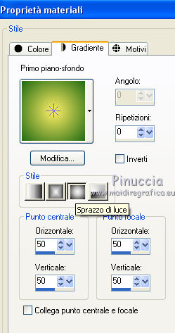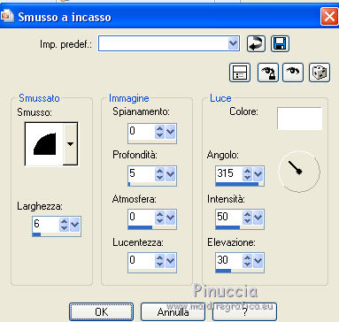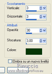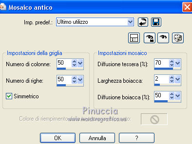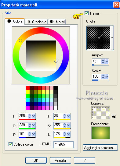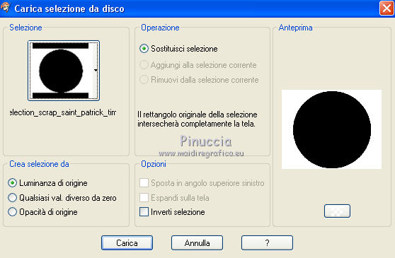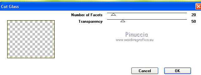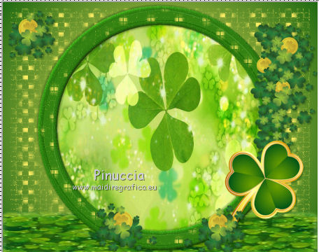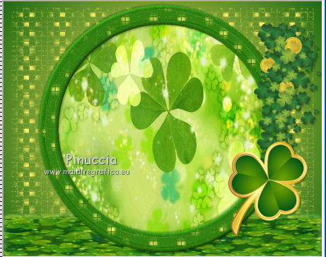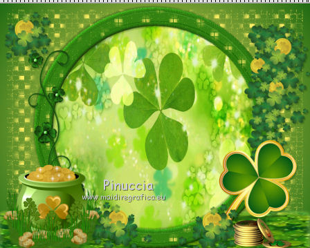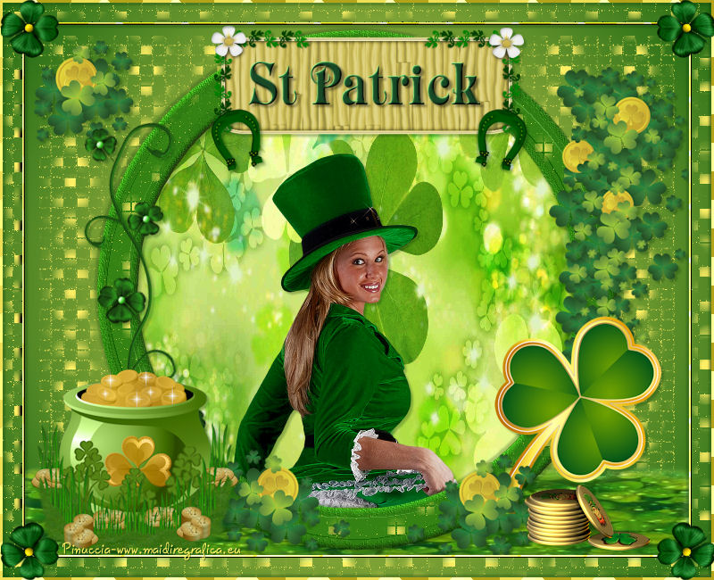 qui puoi trovare qualche risposta ai tuoi dubbi. Se l'argomento che ti interessa non è presente, ti prego di segnalarmelo. Questo tutorial è una creazione di ©Titoune e non può essere copiato su altri siti nè essere offerto per il download. Lo stesso vale per la mia traduzione. Il tutorial è stato creato con PSP X5, ma può essere eseguito anche con le altre versioni di PSP. Secondo la versione utilizzata (anteriore a PSP X) potresti ottenere dei risultati differenti. Dalla versione X4, il comando Immagine>Rifletti è stato sostituito con Immagine>Capovolgi in orizzontale, e il comando Immagine>Capovolgi con Immagine>Capovolgi in verticale. Nelle versioni X5 e X6, le funzioni sono state migliorate rendendo disponibile il menu Oggetti. Con il nuovo X7 sono tornati i comandi Rifletti/Capovolgi, ma con nuove differenze. Vedi la scheda sull'argomento qui Per tradurre il tutorial ho usato PSP X. Occorrente: Un tube a scelta. Il resto del materiale qui Filtri in caso di dubbi, ricorda di consultare la mia sezione filtri qui Graphics Plus - Cut Glass qui ![]() Metti la selezione nella cartella Selezioni. 1. Imposta il colore di primo piano con #ffef65, e il colore di sfondo con #206a13. Passa il colore di primo piano a Gradiente di primo piano/sfondo, stile Sprazzo di luce. ![]() 2. Apri una nuova immagine trasparente 750 x 600 pixels, e riempila con il gradiente.3. Livelli>Nuovo livello raster. Selezione>Carica/Salva selezione>Carica selezione da disco. Cerca e carica la selezione "selection_scrap_saint_patrick_time". ![]() 4. Apri il menu della paletta del colore di primo piano, e riporta a Colore, quindi clicca su Trama e seleziona la trama Griglia con i seguenti settaggi. ![]() Riempi la selezione con il colore+trama.Selezione>Deseleziona. 5. Effetti>Effetti di trama>Mosaico antico. ![]() Immagine>Ridimensiona, al 95%, tutti i livelli non selezionato. 6. Apri l'elemento frame, e vai a Modifica>Copia. Torna al tuo lavoro e vai a Modifica>Incolla come nuovo livello. Non spostarlo. Selezione>Seleziona tutto. Selezione>Mobile. Selezione>Immobilizza. Selezione>Modifica>Contrai - 7 pixels. 7. Livelli>Nuovo livello raster. Riempi con il colore+trama.Effetti>Effetti di trama>Mosaico antico, con i settaggi precedenti. Selezione>Deseleziona. Livelli>Unisci>Unisci giù. 8. Effetti>Effetti 3D>Smusso a incasso. ![]() 9. Effetti>Effetti 3D>Sfalsa ombra, colore #093608. ![]() Ripeti l'Effetto Sfalsa ombra, cambiando verticale e orizzontale con -3. 10. attiva lo strumento Bacchetta magica ![]() e clicca al centro della cornice per selezionarla. Selezione>Modifica>Espandi - 6 pixels. Livelli>Nuovo livello raster. Livelli>Disponi>Sposta giù. 11. Apri l'immagine 127978, e vai a Modifica>Copia. Torna al tuo lavoro e vai a Modifica>Incolla nella selezione. Selezione>Deseleziona. 12. Livelli>Duplica. Cambia la modalità di miscelatura di questo livello in Moltiplica, o secondo l'immagine che stai usando. 13. Apri l'elemento clovers, e vai a Modifica>Copia. Torna al tuo lavoro e vai a Modifica>Incolla come nuovo livello. Spostalo in basso.Porta questo livello sotto il livello del paesaggio. Livelli>Duplica. 14. Attiva nuovamente il livello superiore. Apri l'elemento 3a6fd272, e vai a Modifica>Copia. Torna al tuo lavoro e vai a Modifica>Incolla come nuovo livello. Spostalo nella parte destra della cornice.Vedi l'esempio finale. Effetti>Effetti 3D>Sfalsa ombra, colore #093608. ![]() 15. Apri l'elemento 0_de984_dbdcb22d_L, e vai a Modifica>Copia. Torna al tuo lavoro e vai a Modifica>Incolla come nuovo livello. Spostalo nella parte inferiore destra della cornice.![]() Effetti>Effetti 3D>Sfalsa ombra, con i settaggi precedenti. 16. Apri l'elemento 3a6fd272_2, e vai a Modifica>Copia. Torna al tuo lavoro e vai a Modifica>Incolla come nuovo livello. Spostalo nella parte inferiore destra della cornice.Vedi l'esempio finale. Effetti>Effetti 3D>Sfalsa ombra, con i settaggi precedenti. Livelli>Duplica. Immagine>Rifletti. Posiziona correttamente il duplicato.![]() Di nuovo Livelli>Duplica. Immagine>Rifletti. Sposta questo elemento nell'angolo in alto a sinistra.![]() 17. Apri l'elemento 8ea8b7e1, e vai a Modifica>Copia. Torna al tuo lavoro e vai a Modifica>Incolla come nuovo livello. Spostalo nella parte inferiore destra della cornice.Vedi l'esempio finale. Effetti>Effetti 3D>Sfalsa ombra, con i settaggi precedenti. 18. Apri l'elemento decotreflestpatrick13m1, e vai a Modifica>Copia. Torna al tuo lavoro e vai a Modifica>Incolla come nuovo livello. Spostalo nella parte sinistra della cornice.Vedi l'esempio finale. Effetti>Effetti 3D>Sfalsa ombra, con i settaggi precedenti. 19. Apri l'elemento BBD_PPOL_POT OF GOLD 04, e vai a Modifica>Copia. Torna al tuo lavoro e vai a Modifica>Incolla come nuovo livello. Spostalo nella parte sinistra della cornice.![]() Effetti>Effetti 3D>Sfalsa ombra, con i settaggi precedenti. 20. Apri l'elemento ca993db0, e vai a Modifica>Copia. Torna al tuo lavoro e vai a Modifica>Incolla come nuovo livello. Spostalo nella parte superiore della cornice.Vedi l'esempio finale. Effetti>Effetti 3D>Sfalsa ombra, con i settaggi precedenti. 21. Apri l'elemento horse_shoe, e vai a Modifica>Copia. Torna al tuo lavoro e vai a Modifica>Incolla come nuovo livello. Spostalo sotto il wordart.![]() Effetti>Effetti 3D>Sfalsa ombra, con i settaggi precedenti. 22. Apri il tuo tube, e vai a Modifica>Copia. Torna al tuo lavoro e vai a Modifica>Incolla come nuovo livello. Immagine>Ridimensiona, se e quanto necessario, tutti i livelli non selezionato. Spostalo dove preferisci o vedi il mio esempio.Effetti>Effetti 3D>Sfalsa ombra, con i settaggi precedenti. 23. Assicurati di essere posizionato sul livello superiore. Livelli>Nuovo livello raster. Deseleziona la trama dal colore di primo piano. Riempi il livello con il colore di primo piano.24. Selezione>Seleziona tutto. Selezione>Modifica>Contrai - 3 pixels. Premi sulla tastiera il tasto CANC ![]() Selezione>Deseleziona. Effetti>Plugins>Graphics Plus - Cut Glass, con i set