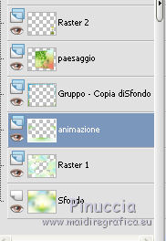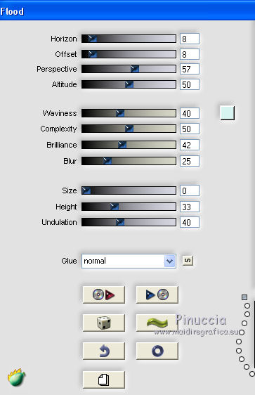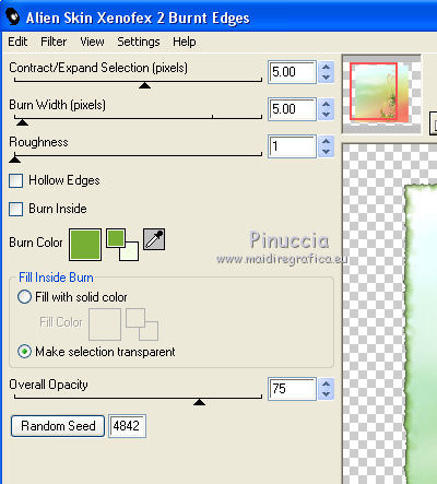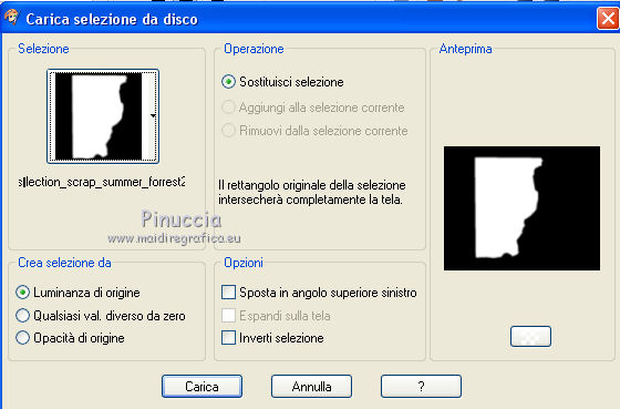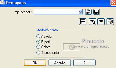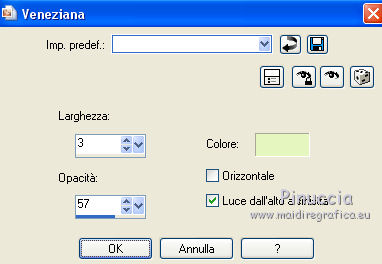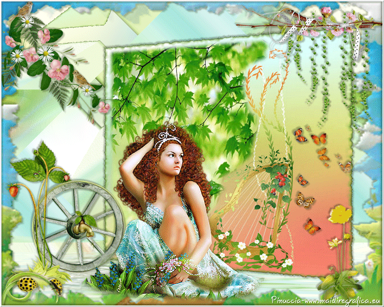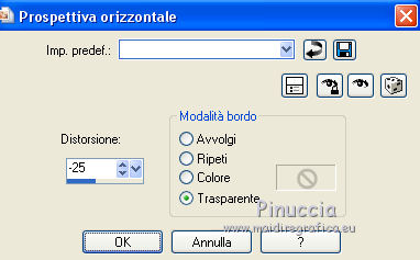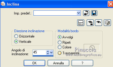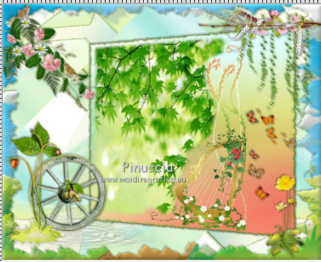 qui puoi trovare qualche risposta ai tuoi dubbi. Se l'argomento che ti interessa non è presente, ti prego di segnalarmelo. Questo tutorial è una creazione di ©Titoune e non può essere copiato su altri siti nè essere offerto per il download. Lo stesso vale per la mia traduzione. Il tutorial è stato creato con Corel17, ma può essere eseguito anche con le altre versioni di PSP. Secondo la versione utilizzata (anteriore a PSP X) potresti ottenere dei risultati differenti. Dalla versione X4, il comando Immagine>Rifletti è stato sostituito con Immagine>Capovolgi in orizzontale, e il comando Immagine>Capovolgi con Immagine>Capovolgi in verticale. Nelle versioni X5 e X6, le funzioni sono state migliorate rendendo disponibile il menu Oggetti. Con il nuovo X7 sono tornati i comandi Rifletti/Capovolgi, ma con nuove differenze. Vedi la scheda sull'argomento qui Per tradurre il tutorial ho usato PSP X. Occorrente: Un tube a scelta. Il resto del materiale qui Il tube utilizzato è di AnaRidzi. Filtri in caso di dubbi, ricorda di consultare la mia sezione filtri qui Alien Skin Xenofex 2.0 - Burnt Edges qui Simple - Diamonds qui Simple - Left Right Wrap (bonus) qui Flaming Pear - Flood qui Animation Shop qui ![]() Metti la maschera nella cartella Maschere. Metti le selezioni nella cartella Selezioni. 1. Apri una nuova immagine bianca 750 x 600 pixels. ![]() Selezione>Seleziona tutto. 2. Apri l'immagine 16, e vai a Modifica>Copia. Torna al tuo lavoro e vai a Modifica>Incolla nella selezione. Selezione>Deseleziona. 3. Livelli>Duplica. Chiudi questo livello e attiva il livello sottostante dell'originale. 4. Effetti>Effetti d'immagine>Motivo unico, con i settaggi standard. ![]() 5. Regola>Sfocatura>Sfocatura gaussiana - raggio 25. ![]() 6. Riapri e attiva il livello superiore della copia. Livalli>Carica/Salva maschera>Carica maschera da disco. Cerca e carica la maschera cat023. ![]() Livelli>Unisci>Unisci gruppo. 7. Effetti>Effetti 3D>Smusso a incasso. ![]() 8. Effetti>Effetti 3D>Sfalsa ombra, colore #1a2509. ![]() Ripeti l'Effetto Sfalsa ombra, cambiando verticale e orizzontale con -3. 9. Apri l'immagine "spring-lute-scene-vector-abstract-flowers-lute-pastels-spring-vector". Rimani su questa immagine: Selezione>Carica/Salva selezione>Carica selezione da disco. Cerca e carica la selezione "selection_scrap_summer_forrest". ![]() Modifica>Copia, e minimizza l'immagine senza deselezionare. Torna al tuo scrap e vai a Modifica>Incolla come nuovo livello. 10. Effetti>Plugins>Alien Skin Xenofex 2 - Burnt Edges colore #77af34. ![]() 11. Selezione>Carica/Salva selezione>Carica selezione da disco. Cerca e carica la selezione "selection_scrap_summer_forrest2". ![]() 12. Apri l'immagine st-patricks-day-powerpoint-background-2 e vai a Modifica>Copia. Torna al tuo lavoro e vai a Modifica>Incolla nella selezione. Selezione>Deseleziona. 13. Effetti>Effetti geometrici>Prospettiva orizzontale. ![]() 14. Effetti>Effetti di immagine>Scostamento. ![]() 15. Effetti>Effetti 3D>Sfalsa ombra, con i settaggi precedenti. Rinomina questo livello "paesaggio". 16. Attiva nuovamente l'immagine "spring-lute-scene-vector-abstract-flowers-lute-pastels-spring-vector", con la selezione ancora attiva". Selezione>Inverti. Modifica>Copia (puoi chiuderla perchè non ti serve più, senza salvare le modifiche). Torna al tuo lavoro e vai a Modifica>Incolla come nuovo livello. 17. Effetti>Plugins>Alien Skin Xenofex 2 - Burnt Edges, con i settaggi precedenti. 18. Effetti>Plugins>Simple - Left Right Wrap. 19. Effetti>Effetti di trama>Veneziana, con un colore chiaro della tua immagine. ![]() 20. Effetti>Effetti geometrici>Inclina. ![]() 21. Effetti>Effetti geometrici>Pentagono. ![]() 22. Effetti>Plugins>Simple - Diamonds. Livelli>Disponi>Sposta giù - 2 volte. 23. Attiva il livello superiore. Apri l'elemento 0_8fb78_a6c6636d_L, e vai a Modifica>Copia. Torna al tuo lavoro e vai a Modifica>Incolla come nuovo livello. Spostalo in basso a destra.![]() 24. Effetti>Effetti 3D>Sfalsa ombra, con i settaggi precedenti. 25. Apri l'elemento 0_73a98_8ed74bbc_L, e vai a Modifica>Copia. Torna al tuo lavoro e vai a Modifica>Incolla come nuovo livello. Spostalo in alto a destra.26. Effetti>Effetti 3D>Sfalsa ombra, con i settaggi precedenti. 27. Apri il tube butterfly, e vai a Modifica>Copia. Torna al tuo lavoro e vai a Modifica>Incolla come nuovo livello. Spostalo a destra.Vedi l'esempio finale. 28. Effetti>Effetti 3D>Sfalsa ombra, con i settaggi precedenti. 29. Apri l'elemento 0_ACE4~3, e vai a Modifica>Copia. Torna al tuo lavoro e vai a Modifica>Incolla come nuovo livello. Spostalo in basso a sinistra.Vedi l'esempio finale. 30. Effetti>Effetti 3D>Sfalsa ombra, con i settaggi precedenti. 31. Apri l'elemento 0_770d1_270968e3_L, e vai a Modifica>Copia. Torna al tuo lavoro e vai a Modifica>Incolla come nuovo livello. Spostalo in alto a sinistra.![]() 32. Effetti>Effetti 3D>Sfalsa ombra, con i settaggi precedenti. 33. Apri l'elemento 0_7d651_30ab918a_L, e vai a Modifica>Copia. Torna al tuo lavoro e vai a Modifica>Incolla come nuovo livello. Spostalo in basso a sinistra.Vedi l'esempio finale. 34. Effetti>Effetti 3D>Sfalsa ombra, con i settaggi precedenti. 35. Apri il tuo tube, e vai a Modifica>Copia. Torna al tuo lavoro e vai a Modifica>Incolla come nuovo livello. Immagine>Ridimensiona, se e quanto necessario, tutti i livelli non selezionato. Regola>Messa a fuoco>Metti a fuoco. Spostalo a sinistra.Vedi l'esempio finale. 36. Effetti>Effetti 3D>Sfalsa ombra, colore #1a2509. ![]() 37. Assicurati di essere posizionato sul livello superiore. Imposta il colore di primo piano con il colore bianco. Livelli>Nuovo livello raster. Riempi con il colore bianco.38. Selezione>Seleziona tutto. Selezione>Modifica>Contrai - 3 pixels. Premi sulla tastiera il tasto CANC ![]() Selezione>inverti. 39. Effetti>Effetti 3D>Smusso a incasso, con i settaggi precedenti. Selezione>Deseleziona. 40. Effetti>Effetti 3D>Sfalsa ombra, colore #1a2509. ![]() Ripeti l'Effetto Sfalsa ombra, cambiando ve