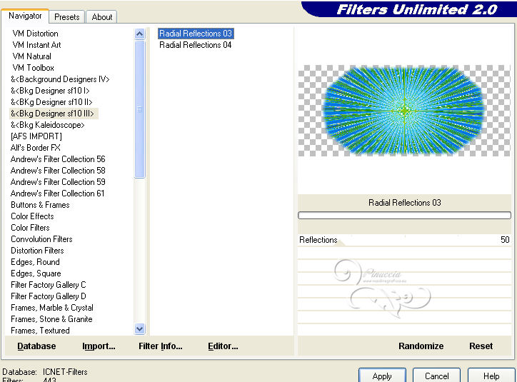 16. Effetti>Plugins>Filters Unlimited 2.0 - &<Bkg Designer sf10III> - Radial Reflections 03,