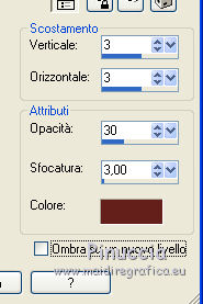 qui puoi trovare qualche risposta ai tuoi dubbi. Se l'argomento che ti interessa non è presente, ti prego di segnalarmelo. Questo tutorial è una creazione di ©Titoune e non può essere copiato su altri siti nè essere offerto per il download. Lo stesso vale per la mia traduzione. Il tutorial è stato creato con PSP X5, ma può essere eseguito anche con le altre versioni di PSP. Secondo la versione utilizzata (anteriore a PSP X) potresti ottenere dei risultati differenti. Vedi la mia scheda riguardante le funzioni Rifletti>Capovolgi in X4 e X5 qui Per tradure il tutorial ho usato PSP X. Occorrente: Un tube a scelta. Il resto del materiale qui Tube utilizzato "[Ming Yue] Women body Bunny" du " di Ming Yue ![]() 1. Apri una nuova immagine trasparente 750 x 600 pixels. Selezione>Seleziona tutto. 2. Apri l'elemento SD-Sweet Bunny-p12 e vai a Modifica>Copia. Torna al tuo lavoro e vai a Modifica>Incolla nella selezione. Selezione>Deseleziona. 3. Apri l'elemento frame e vai a Modifica>Copia. Torna al tuo lavoro e vai a Modifica>Incolla come nuovo livello. Lascialo come sta. 4. Attiva lo strumento Bacchetta magica ![]() e clicca al centro della cornice per selezionarla. Selezione>Modifica>Espandi - 5 pixels. 5. Livelli>Nuovo livello raster. Livelli>Disponi>Sposta giù. Apri l'immagine "SD-Sweet Bunny-p3" e vai a Modifica>Copia. Torna al tuo lavoro e vai a Modifica>Incolla nella selezione. Selezione>Deseleziona. 6. Attiva il livello della cornice. Effetti>Effetti 3D>Sfalsa ombra, colore #64201b. ![]() Ripeti l'Effetto Sfalsa ombra, cambiando verticale e orizzontale con -3. 7. Apri l'elemento SD-Sweet Bunny-easter lilies1 e vai a Modifica>Copia. Torna al tuo lavoro e vai a Modifica>Incolla come nuovo livello. Spostalo nella parte superiore della cornice.Vedi l'esempio finale. Effetti>Effetti 3D>Sfalsa ombra, con i settaggi precedenti. 8. Apri l'elemento SD-Sweet Bunny-leaf2 e vai a Modifica>Copia. Torna al tuo lavoro e vai a Modifica>Incolla come nuovo livello. Spostalo nella parte inferiore della cornice.Vedi l'esempio finale. Effetti>Effetti 3D>Sfalsa ombra, con i settaggi precedenti. 9. Apri l'elemento SD-Sweet Bunny-flower2 e vai a Modifica>Copia. Torna al tuo lavoro e vai a Modifica>Incolla come nuovo livello. Spostalo in alto a sinistra.Vedi l'esempio finale. Effetti>Effetti 3D>Sfalsa ombra, con i settaggi precedenti. 10. Apri l'elemento SD-Sweet Bunny-jellycarrot1 e vai a Modifica>Copia. Torna al tuo lavoro e vai a Modifica>Incolla come nuovo livello. Spostalo in alto a destra.![]() Effetti>Effetti 3D>Sfalsa ombra, con i settaggi precedenti. 11. Apri l'elemento SD-Sweet Bunny-cherries1 e vai a Modifica>Copia. Torna al tuo lavoro e vai a Modifica>Incolla come nuovo livello. Spostalo nella parte superiore destra della cornice.Vedi l'esempio finale. Effetti>Effetti 3D>Sfalsa ombra, con i settaggi precedenti. 12. Apri l'elemento SD-Sweet Bunny-bunny ears2 e vai a Modifica>Copia. Torna al tuo lavoro e vai a Modifica>Incolla come nuovo livello. Spostalo nella parte inferiore destra della cornice.Vedi l'esempio finale. Effetti>Effetti 3D>Sfalsa ombra, con i settaggi precedenti. 13. Apri l'elemento SD-Sweet Bunny-eggpop2 e vai a Modifica>Copia. Torna al tuo lavoro e vai a Modifica>Incolla come nuovo livello. Spostalo in basso a destra.Vedi l'esempio finale. Effetti>Effetti 3D>Sfalsa ombra, con i settaggi precedenti. 14. Apri l'elemento SD-Sweet Bunny-carott cupcake1 e vai a Modifica>Copia. Torna al tuo lavoro e vai a Modifica>Incolla come nuovo livello. Spostalo in basso a destra.![]() Effetti>Effetti 3D>Sfalsa ombra, con i settaggi precedenti. 15. Apri l'elemento SD-Sweet Bunny-bunny1 e vai a Modifica>Copia. Torna al tuo lavoro e vai a Modifica>Incolla come nuovo livello. Spostalo nella parte inferiore della cornice.Vedi l'esempio finale. Effetti>Effetti 3D>Sfalsa ombra, con i settaggi precedenti. 16. Apri l'elemento Beautiful Easter Day_Basket with Eggs_Scrap and Tubes e vai a Modifica>Copia. Torna al tuo lavoro e vai a Modifica>Incolla come nuovo livello. Spostalo in basso.![]() Effetti>Effetti 3D>Sfalsa ombra, con i settaggi precedenti. 17. Apri l'elemento SD-Sweet Bunny-easter lilies2 e vai a Modifica>Copia. Torna al tuo lavoro e vai a Modifica>Incolla come nuovo livello. Spostalo in basso a sinistra.Vedi l'esempio finale. Effetti>Effetti 3D>Sfalsa ombra, con i settaggi precedenti. 18. Apri l'elemento SD-Sweet Bunny-lollipop2 e vai a Modifica>Copia. Torna al tuo lavoro e vai a Modifica>Incolla come nuovo livello. Sposta anche questo elemento in basso a sinistra.Vedi l'esempio finale. Effetti>Effetti 3D>Sfalsa ombra, con i settaggi precedenti. 19. Apri l'elemento egg_chcolate e vai a Modifica>Copia. Torna al tuo lavoro e vai a Modifica>Incolla come nuovo livello. Spostalo in basso a sinistra.Vedi l'esempio finale. Effetti>Effetti 3D>Sfalsa ombra, con i settaggi precedenti. 20. Apri l'elemento SD-Sweet Bunny-carott cupcake2 e vai a Modifica>Copia. Torna al tuo lavoro e vai a Modifica>Incolla come nuovo livello. Spostalo in basso a sinistra.![]() Effetti>Effetti 3D>Sfalsa ombra, con i settaggi precedenti. 21. Apri l'elemento SD-Sweet Bunny-bunny3 e vai a Modifica>Copia. Torna al tuo lavoro e vai a Modifica>Incolla come nuovo livello. Spostalo in basso.Vedi l'esempio finale. Effetti>Effetti 3D>Sfalsa ombra, con i settaggi precedenti. 22. Apri l'elemento SD-Sweet Bunny-jellycarrot2 e vai a Modifica>Copia. Torna al tuo lavoro e vai a Modifica>Incolla come nuovo livello. Spostalo a destra.![]() Effetti>Effetti 3D>Sfalsa ombra, con i settaggi precedenti. 23. Apri il tuo tube e vai a Modifica>Copia. Torna al tuo lavoro e vai a Modifica>Incolla come nuovo livello. Immagine>Ridimensiona, se e quanto necessario, tutti i livelli non selezionato. Spostalo dove preferisci o vedi il mio esempio.Effetti>Effetti 3D>Sfalsa ombra, con i settaggi precedenti. 24. Apri l'elemento titoune_border e vai a Modifica>Copia. Torna al tuo lavoro e vai a Modifica>Incolla come nuovo livello. Firma il tuo lavoro. Livelli>Uni