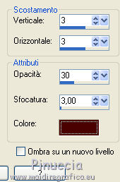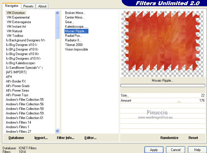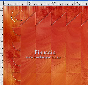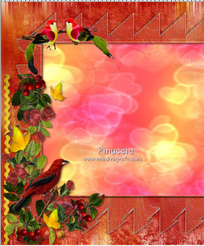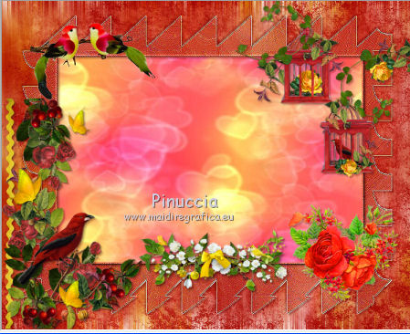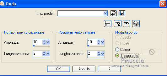 qui puoi trovare qualche risposta ai tuoi dubbi. Se l'argomento che ti interessa non è presente, ti prego di segnalarmelo. Questo tutorial è una creazione di ©Titoune e non può essere copiato su altri siti nè essere offerto per il download. Lo stesso vale per la mia traduzione. Il tutorial è stato creato con PSP X5, ma può essere eseguito anche con le altre versioni di PSP. Secondo la versione utilizzata (anteriore a PSP X) potresti ottenere dei risultati differenti. Vedi la mia scheda riguardante le funzioni Rifletti>Capovolgi in X4 e X5 qui Per tradure il tutorial ho usato PSP X. Occorrente: Un tube a scelta. Il resto del materiale qui Il tube utilizzato "Open Heart_LR-01-22-11" di Lori Rhae Filtri in caso di dubbi, ricorda di consultare la mia sezione filtri qui Penta.com - Jeans qui VM Distortion - Mosaic Ripple qui Filters Unlimited 2.0 qui I filtri VM Distortion e Penta.com si possono usare da soli o importati in Filters Unlimited (come fare vedi qui) Se un filtro fornito appare con questa icona ![]() 1. Apri una nuova immagine trasparente 750 x 600 pixels. Selezione>Seleziona tutto. Apri l'elemento paper10 e vai a Modifica>Copia. Torna al tuo lavoro e vai a Modifica>Incolla nella selezione. 2. Selezione>Modifica>Contrai - 55 pixels. Selezione>Innalza selezione a livello. 3. Regola>Sfocatura>Sfocatura radiale. ![]() Selezione>Deseleziona. Effetti>Effetti di bordo>Aumenta. 4. Effetti>Plugins>Filters Unlimited 2.0 - VM Distortion - Mosaic Ripple, con i settaggi standard. ![]() Modifica>Taglia (questo comando oltre a tagliare tiene anche in memoria). Modifica>incolla come nuovo livello. Effetti>Effetti di bordo>Aumenta. 5. Effetti>Effetti 3D>Sfalsa ombra, colore #4c0000. ![]() Ripeti l'Effetto Sfalsa ombra, cambiando verticale e orizzontale con -3. 6. Attiva lo strumento Selezione a mano libera , da punto a punto,e seleziona la parte indicata. ![]() Premi sulla tastiera il tasto CANC ![]() Selezione>Deseleziona. Effetti>Effetti di bordo>Aumenta. Rinomina questo livello "motivo". 7. Attiva lo strumento Selezione ![]() clicca sull'icona Selezione personalizzata ![]() e imposta i seguenti settaggi. ![]() Livelli>Nuovo livello raster. 8. Apri l'elemento 375 e vai a Modifica>Copia. Torna al tuo lavoro e vai a Modifica>Incolla nella selezione. 9. Selezione>Modifica>Seleziona bordature selezione. ![]() Attiva il livello "motivo". Selezione>Innalza selezione a livello. Livelli>Disponi>Porta in alto. Effetti>Plugins>Penta.com - Jeans, con i settaggi standard. ![]() 10. Effetti>Effetti 3D>Smusso a incasso. ![]() 11. Effetti>Effetti 3D>Sfalsa ombra, colore #4c0000. ![]() 12. Apri l'elemento ABOB Page Cluster e vai a Modifica>Copia. Torna al tuo lavoro e vai a Modifica>Incolla come nuovo livello. Spostalo in basso a sinistra.Vedi l'esempio finale. Effetti>Effetti 3D>Sfalsa ombra, con i settaggi precedenti. 13. Apri l'elemento 34 e vai a Modifica>Copia. Torna al tuo lavoro e vai a Modifica>Incolla come nuovo livello. Spostalo in alto a sinistra.![]() Effetti>Effetti 3D>Sfalsa ombra, con i settaggi precedenti. 14. Apri l'elemento ABOB Cluster2 e vai a Modifica>Copia. Torna al tuo lavoro e vai a Modifica>Incolla come nuovo livello. Spostalo in alto a destra.Vedi l'esempio finale. Effetti>Effetti 3D>Sfalsa ombra, con i settaggi precedenti. 15. Apri l'elemento 2 e vai a Modifica>Copia. Torna al tuo lavoro e vai a Modifica>Incolla come nuovo livello. Spostalo in basso a destra.Effetti>Effetti 3D>Sfalsa ombra, con i settaggi precedenti. 16. Apri l'elemento flowers_border e vai a Modifica>Copia. Torna al tuo lavoro e vai a Modifica>Incolla come nuovo livello. Spostalo sulla parte inferiore della cornice.![]() Effetti>Effetti 3D>Sfalsa ombra, con i settaggi precedenti. 17. Apri il tuo tube e vai a Modifica>Copia. Torna al tuo lavoro e vai a Modifica>Incolla come nuovo livello. Immagine>Ridimensiona, se e quanto necessario, tutti i livelli non selezionato. Spostalo dove preferisci,o vedi il mio esempio. Effetti>Effetti 3D>Sfalsa ombra, con i settaggi precedenti. 18. Assicurati di essere posizionato sul livello superiore. Livelli>Nuovo livello raster. Imposta il colore di primo piano con un colore chiaro scelto dal tuo lavoro. Per l'esempio #e2c629. Riempi il livello con questo colore.19. Selezione>Seleziona tutto. Selezione>Modifica>Contrai - 2 pixels. Premi sulla tastiera il tasto CANC ![]() Selezione>Inverti. Effetti>Plugins>Penta.com - Jeans, con i settaggi standard. ![]() Effetti>Effetti di bordo>Aumenta. Selezione>Deseleziona. Effetti>Effetti 3D>Sfalsa ombra, con i settaggi precedenti. 20. Attiva il livello inferiore - Raster 1. Modifica>Copia. Selezione>Seleziona tutto. Immagine>Ritaglia la selezione. 21. Immagine>Dimensioni tela - 800 x 650 pixels. ![]() 22. Livelli>Nuovo livello raster. Livelli>Disponi>Sposta giù. Selezione>Seleziona tutto. Selezione>Modifica>Incolla nella selezione. 23. Selezione>Modifica>Contrai - 25 pixels. Selezione>Inverti. Selezione>Innalza selezione a livello. Livelli>Disponi>Porta in alto. Effetti>Effetti 3D>Smusso a incasso, con i settaggi precedenti. Livelli>Duplica. 24. Effetti>Effetti di distorsione>Onda. ![]() Selezione>Inverti. Premi sulla tastiera il tasto CANC. Selezione>Deseleziona. Per il mio esempio ho cambiato la modalità di miscelatura di questo livello in Sovrapponi. 25. Selezione>Seleziona tutto. Livelli>Nuovo livello raster. Riempi con il colore chiaro di primo piano #e2c629.Selezione>Modifica>Contrai - 2 pixels. Premi sulla tastiera il tasto CANC ![]() Selezione>Inverti. Effetti>Plugins>Penta.com - Jeans, con i settaggi standard. ![]() Effetti>Effetti di bordo>Aumenta. Selezione>Deseleziona. Effetti>Effetti 3D>Sfalsa ombra, con i settaggi precedenti. 26. Apri l'elemento titoune_corners e vai a Modifica>Copia. Torna al tuo lavoro e vai a Modifica>Incolla come nuovo livello. Effetti>Effetti 3D>Sfalsa ombra, con i settaggi precedenti. Firma il tuo lavoro. Livelli>Unisci>Unisci tutto e salva in formato jpg. ![]() Se hai problemi o dubbi, o trovi un lin