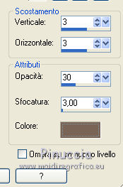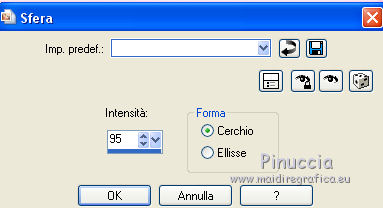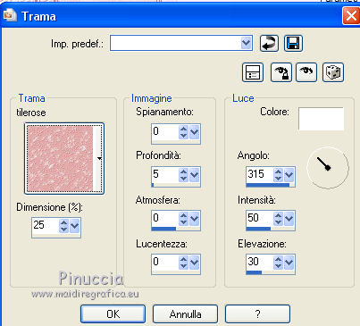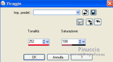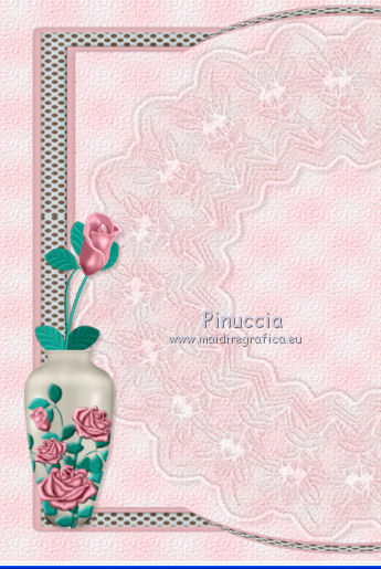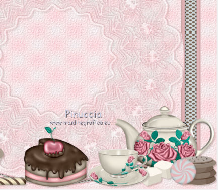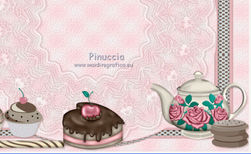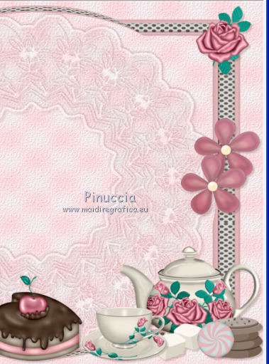 qui puoi trovare qualche risposta ai tuoi dubbi. Se l'argomento che ti interessa non è presente, ti prego di segnalarmelo. Questo tutorial è una creazione di ©Titoune e non può essere copiato su altri siti nè essere offerto per il download. Lo stesso vale per la mia traduzione. Il tutorial è stato creato con PSP X5, ma può essere eseguito anche con le altre versioni di PSP. Secondo la versione utilizzata (anteriore a PSP X) potresti ottenere dei risultati differenti. Dalla versione X4, il comando Immagine>Rifletti è stato sostituito con Immagine>Capovolgi in orizzontale, e il comando Immagine>Capovolgi con Immagine>Capovolgi in verticale. Nelle versioni X5 e X6, le funzioni sono state migliorate rendendo disponibile il menu Oggetti. Vedi la scheda sull'argomento qui Per tradure il tutorial ho usato PSP X. Occorrente: Un tube a scelta. Il resto del materiale qui Tube utilizzato è di Moroccan Filtri in caso di dubbi, ricorda di consultare la mia sezione filtri qui Penta.com - Jeans qui ![]() 1. Apri una nuova immagine trasparente 750 x 600 pixels. Selezione>Seleziona tutto. 2. Apri l'elemento BWC TeaParty_PP2, e vai a Modifica>Copia. Torna al tuo lavoro e vai a Modifica>Incolla nella selezione. Selezione>Deseleziona. Regola>Sfocatura>Sfocatura gaussiana - raggio 10. ![]() Livelli>Duplica. Immagine>Rifletti. Abbassa l'opacità di questo livelo al 50%. Livelli>Unisci>Unisci giù. Livelli>Duplica. 3. Effetti>Effetti di trama>Trama - seleziona la trama "tilerose" con i seguenti settaggi. ![]() Cambia la modalità di miscelatura di questo livello in Luce netta. 4. Apri l'elemento BWC_TeaParty_EL4 e vai a Modifica>Copia. Torna al tuo lavoro e vai a Modifica>Incolla come nuovo livello. Non spostarlo. 5. Effetti>Effetti geometrici>Sfera. ![]() 6. Attiva lo strumento Bacchetta magica ![]() e clicca al centro della cornice per selezionarla. Livelli>Nuovo livello raster. Livelli>Disponi>Sposta giù. 7. Apri l'elemento KaraLace103 e vai a Modifica>Copia. Torna al tuo lavoro e vai a Modifica>Incolla nella selezione. Selezione>Deseleziona. 8. Regola>Tonalità e saturazione>Viraggio. ![]() Abbassa l'opacità di questo livello al 40%. 9. Attiva il livello della cornice. Effetti>Effetti 3D>Sfalsa ombra, colore #7a6456. ![]() Ripeti l'Effetto Sfalsa ombra, cambiando verticale e orizzontale con -3. 10. Apri l'elemento BWC_TeaParty_EL12, e vai a Modifica>Copia. Torna al tuo lavoro e vai a Modifica>Incolla come nuovo livello. Spostalo in basso a sinistra.Vedi l'esempio finale. Effetti>Effetti 3D>Sfalsa ombra, colore #7a6456. ![]() 11. Apri l'elemento BWC_TeaParty_EL9, e vai a Modifica>Copia. Torna al tuo lavoro e vai a Modifica>Incolla come nuovo livello. Spostalo sopra il vaso.Livelli>Disponi>Sposta giù. ![]() Effetti>Effetti 3D>Sfalsa ombra, con i settaggi precedenti. 12. Attiva nuovamente il livello superiore. Apri l'elemento BWC_TeaParty_EL18, e vai a Modifica>Copia. Torna al tuo lavoro e vai a Modifica>Incolla come nuovo livello. Spostalo nella parte inferiore.Vedi l'esempio finale. Effetti>Effetti 3D>Sfalsa ombra, con i settaggi precedenti. 13. Apri l'elemento BWC_TeaParty_EL15, e vai a Modifica>Copia. Torna al tuo lavoro e vai a Modifica>Incolla come nuovo livello. Sposta anche questo elemento nella parte inferiore.Vedi l'esempio finale. Effetti>Effetti 3D>Sfalsa ombra, con i settaggi precedenti. 14. Apri l'elemento BWC_TeaParty_EL2, e vai a Modifica>Copia. Torna al tuo lavoro e vai a Modifica>Incolla come nuovo livello. Spostalo in basso.![]() Effetti>Effetti 3D>Sfalsa ombra, con i settaggi precedenti. 15. Apri l'elemento BWC_TeaParty_EL13, e vai a Modifica>Copia. Torna al tuo lavoro e vai a Modifica>Incolla come nuovo livello. Spostalo in basso.Vedi l'esempio finale. Effetti>Effetti 3D>Sfalsa ombra, con i settaggi precedenti. 16. Apri l'elemento BWC_TeaParty_EL8, e vai a Modifica>Copia. Torna al tuo lavoro e vai a Modifica>Incolla come nuovo livello. Spostalo in basso a destra.Vedi l'esempio finale. Effetti>Effetti 3D>Sfalsa ombra, con i settaggi precedenti. 17. Activer l'élément BWC_TeaParty_EL1, e vai a Modifica>Copia. Torna al tuo lavoro e vai a Modifica>Incolla come nuovo livello. Sposta anche questo elemento in basso a destra.![]() Effetti>Effetti 3D>Sfalsa ombra, con i settaggi precedenti. 18. Apri l'elemento BWC_TeaParty_EL16, e vai a Modifica>Copia. Torna al tuo lavoro e vai a Modifica>Incolla come nuovo livello. Spostalo in basso a destra.Vedi l'esempio finale. Effetti>Effetti 3D>Sfalsa ombra, con i settaggi precedenti. 19. Apri l'elemento BWC_TeaParty_EL11, e vai a Modifica>Copia. Torna al tuo lavoro e vai a Modifica>Incolla come nuovo livello. Sposta anche questo elemento in basso a destra.Vedi l'esempio finale. Effetti>Effetti 3D>Sfalsa ombra, con i settaggi precedenti. 20. Apri l'elemento BWC_TeaParty_EL3, e vai a Modifica>Copia. Torna al tuo lavoro e vai a Modifica>Incolla come nuovo livello. Spostalo in basso a destra.![]() Effetti>Effetti 3D>Sfalsa ombra, con i settaggi precedenti. 21. Apri l'elemento BWC_TeaParty_EL6, e vai a Modifica>Copia. Torna al tuo lavoro e vai a Modifica>Incolla come nuovo livello. Spostalo sul bordo della cornice, a destra.Vedi l'esempio finale. Effetti>Effetti 3D>Sfalsa ombra, con i settaggi precedenti. Livelli>Duplica, Posiziona il duplicato un po' scalata dall'originale.Vedi l'esempio finale. 22. Apri BWC_TeaParty_EL10, e vai a Modifica>Copia. Torna al tuo lavoro e vai a Modifica>Incolla come nuovo livello. Spostalo sul bordo della cornice in alto a destra.![]() Effetti>Effetti 3D>Sfalsa ombra, con i settaggi precedenti. 23. Apri l'elemento BWC_TeaParty_EL17, e vai a Modifica>Copia. Torna al tuo lavoro e vai a Modifica>Incolla come nuovo livello. Spostalo in alto.Vedi l'esempio finale. Effetti>Effetti 3D>Sfalsa ombra, con i settaggi precedenti. 24. Apri l'elemento BWC_TeaParty_EL20, e vai a Modifica>Copia. Torna al tuo lavoro e vai a Modifica>Incolla come nuovo livello. Immagine>Rifletti. Spostalo sul bordo della cornice, in alto a sinistra.Vedi