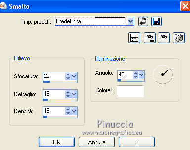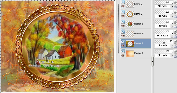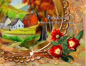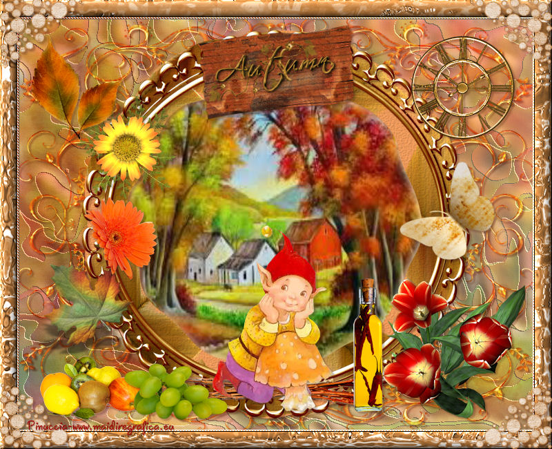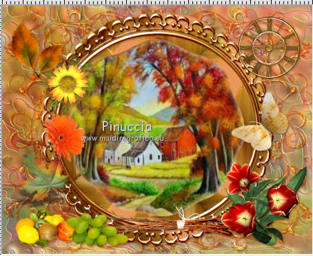 qui puoi trovare qualche risposta ai tuoi dubbi. Se l'argomento che ti interessa non è presente, ti prego di segnalarmelo. Questo tutorial è una creazione di ©Titoune e non può essere copiato su altri siti nè essere offerto per il download. Lo stesso vale per la mia traduzione. Il tutorial è stato creato con PSP X5, ma può essere eseguito anche con le altre versioni di PSP. Secondo la versione utilizzata (anteriore a PSP X) potresti ottenere dei risultati differenti. Dalla versione X4, il comando Immagine>Rifletti è stato sostituito con Immagine>Capovolgi in orizzontale, e il comando Immagine>Capovolgi con Immagine>Capovolgi in verticale. Nelle versioni X5 e X6, le funzioni sono state migliorate rendendo disponibile il menu Oggetti. Con il nuovo X7 sono tornati i comandi Rifletti/Capovolgi, ma con nuove differenze. Vedi la scheda sull'argomento qui Per tradure il tutorial ho usato PSP X. Occorrente: Un tube a scelta. Il resto del materiale qui Il tube utilizzato è di Krys. Filtri in caso di dubbi, ricorda di consultare la mia sezione filtri qui Filters Unlimited 2.0 qui Penta.com - Jeans qui Simple - Top Left Mirror qui I filtri Penta.com e Simple si possono usare da soli o importati in Filters Unlimited (come fare vedi qui) Se un filtro fornito appare con questa icona ![]() 1. Apri una nuova immagine trasparente 750 x 600 pixels. Selezione>Seleziona tutto. 2. Apri l'elemento SCS_Ray Of Light_Paper (16), e vai a Modifica>Copia. Torna al tuo lavoro e vai a Modifica>Incolla nella selezione. 3. Livelli>Nuovo livello raster. Apri l'elemento SCS_Ray Of Light_Frame 4, e vai a Modifica>Copia. Torna al tuo lavoro e vai a Modifica>Incolla nella selezione. Selezione>Deseleziona. Cambia la modalità di miscelatura di questo livelloi n Luce netta. Rinomina questo livello "cornice 4". 4. apri l'elemento SCS_Ray Of Light_Frame 3, e vai a Modifica>Copia. Torna al tuo lavoro e vai a Modifica>Incolla nella come nuovo livello. Non spostarlo. Rinomina questo elemento "cornice 3". 5. Apri l'elemento SCS_Ray Of Light_Frame 2, e vai a Modifica>Copia. Torna al tuo lavoro e vai a Modifica>Incolla come nuovo livello. Non spostarlo. Rinomina questo livello "cornice 2". 6. Attiva il livello "cornice 3". Attiva lo strumento Bacchetta magica ![]() e clicca al centro della cornice per selezionarla. Selezione>Modifica>Sfuma - 15 pixels. 7. Livelli>Nuovo livello raster. Livelli>Disponi>Sposta giù. 8. Apri l'immagine imageD3KTYL3Z, e vai a Modifica>Copia. Torna al tuo lavoro e vai a Modifica>Incolla nella selezione. Selezione>Inverti. 9. Attiva il livello Raster 1. Livelli>Nuovo livello raster. Modifica>Incolla nella selezione (l'immagine è ancora in memoria). Selezione>Deseleziona. Abbassa l'opacità di questo livello al 50%. Risultato. ![]() 10. Effetti>Effetti di trama>Nappa, con i settaggi standard. ![]() 11. Effetti>Effetti artistici>Smalto, con i settaggi standard. ![]() 12. Attiva il livello "cornice 4". Effetti>Effetti 3D>Sfalsa ombra, colore #4b2213. 13. Attiva il livello "cornice 2". Effetti>Effetti 3D>Sfalsa ombra, con i settaggi precedenti. 15. Attiva il livello "cornice 3". Effetti>Effetti 3D>Sfalsa ombra, con i settaggi precedenti. 16. Attiva il livello superiore. Apri l'elemento SCS_Ray Of Light_Twigg Bundle, e vai a Modifica>Copia. Torna al tuo lavoro e vai a Modifica>Incolla come nuovo livello. Spostalo nella parte inferiore della cornice.Vedi l'esempio finale. Effetti>Effetti 3D>Sfalsa ombra, con i settaggi precedenti. 16. Apri l'elemento SCS_Ray Of Light_Flower 7, e vai a Modifica>Copia. Torna al tuo lavoro e vai a Modifica>Incolla come nuovo livello. Spostalo nella parte inferiore destra della cornice.![]() Effetti>Effetti 3D>Sfalsa ombra, con i settaggi precedenti. 17. Apri l'elemento SCS_Ray Of Light_Fruit, e vai a Modifica>Copia. Torna al tuo lavoro e vai a Modifica>Incolla come nuovo livello. Spostalo nella parte inferiore sinistra della cornice.Vedi l'esempio finale. Effetti>Effetti 3D>Sfalsa ombra, con i settaggi precedenti. 18. Apri l'elemento SCS_Ray Of Light_Grapes, e vai a Modifica>Copia. Torna al tuo lavoro e vai a Modifica>Incolla come nuovo livello. Spostalo nella parte inferiore sinistra della cornice.![]() Effetti>Effetti 3D>Sfalsa ombra, con i settaggi precedenti. 19. Apri l'elemento SCS_Ray Of Light_Flower 6, e vai a Modifica>Copia. Torna al tuo lavoro e vai a Modifica>Incolla come nuovo livello. Spostalo nella parte superiore sinistra della cornice.Vedi l'esempio finale. Effetti>Effetti 3D>Sfalsa ombra, con i settaggi precedenti. 20. Apri l'elemento 0_7019f_f7ce16c5_L, e vai a Modifica>Copia. Torna al tuo lavoro e vai a Modifica>Incolla come nuovo livello. Spostalo in alto a sinistra.Vedi l'esempio finale. Effetti>Effetti 3D>Sfalsa ombra, con i settaggi precedenti. 21. Apri l'elemento 0_701c8_55cefd2e_L, e vai a Modifica>Copia. Torna al tuo lavoro e vai a Modifica>Incolla come nuovo livello. Spostalo in basso a sinistra.![]() Effetti>Effetti 3D>Sfalsa ombra, con i settaggi precedenti. 22. Apri l'elemento SCS_Ray Of Light_Metal Clock, e vai a Modifica>Copia. Torna al tuo lavoro e vai a Modifica>Incolla come nuovo livello. Spostalo nella parte superiore destra della cornice.Vedi l'esempio finale. Effetti>Effetti 3D>Sfalsa ombra, con i settaggi precedenti. 23. Apri l'elemento SCS_Ray Of Light_Paper Butterfly 1, e vai a Modifica>Copia. Torna al tuo lavoro e vai a Modifica>Incolla come nuovo livello. Spostalo a destra della cornice.Vedi l'esempio finale. Effetti>Effetti 3D>Sfalsa ombra, con i settaggi precedenti. 24. Apri l'elemento SCS_Ray Of Light_Flower 9, e vai a Modifica>Copia. Torna al tuo lavoro e vai a Modifica>Incolla come nuovo livello. Spostalo a sinistra della cornice.![]() Effetti>Effetti 3D>Sfalsa ombra, con i settaggi precedenti. 25. Apri l'elemento SCS_Ray Of Light_Rustic Plate, e vai a Modifica>Copia. Torna al tuo lavoro e vai a Modifica>Incolla come nuovo livello. Spostalo nella parte superiore della cornice.Vedi l'esempio finale. Effetti>Effetti 3D>Sfalsa om