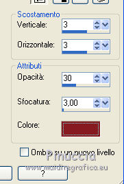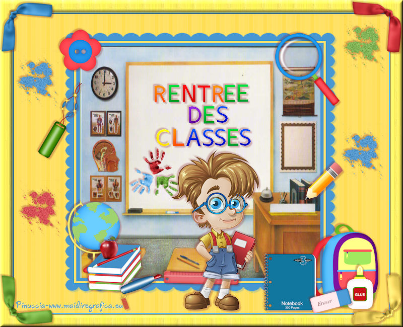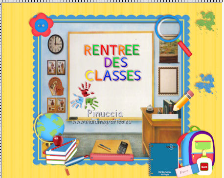qui puoi trovare qualche risposta ai tuoi dubbi. Se l'argomento che ti interessa non è presente, ti prego di segnalarmelo. Questo tutorial è una creazione di ©Titoune e non può essere copiato su altri siti nè essere offerto per il download. Lo stesso vale per la mia traduzione. Il tutorial è stato creato con Corel17, ma può essere eseguito anche con le altre versioni di PSP. Secondo la versione utilizzata (anteriore a PSP X) potresti ottenere dei risultati differenti. Dalla versione X4, il comando Immagine>Rifletti è stato sostituito con Immagine>Capovolgi in orizzontale, e il comando Immagine>Capovolgi con Immagine>Capovolgi in verticale. Nelle versioni X5 e X6, le funzioni sono state migliorate rendendo disponibile il menu Oggetti. Con il nuovo X7 sono tornati i comandi Rifletti/Capovolgi, ma con nuove differenze. Vedi la scheda sull'argomento qui Per tradurre il tutorial ho usato PSP X. Occorrente: Un tube a scelta. Il resto del materiale qui ![]() 1. Apri una nuova immagine trasparente 750 x 600 pixels. Selezione>Seleziona tutto. 2. Apri l'immagine nq-element34, e vai a Modifica>Copia. Torna al tuo lavoro e vai a Modifica>Incolla nella selezione. Selezione>Deseleziona. 3. Apri l'elemento nq-element 29, e vai a Modifica>Copia. Torna al tuo lavoro e vai a Modifica>Incolla come nuovo livello. Non spostarlo. 4. Attiva lo strumento Bacchetta magica ![]() e clicca nella cornice per selezionarla. Selezione>Modifica>Espandi - 5 pixels. Livelli>Nuovo livello raster. Livelli>Disponi>Sposta giù. 5. Apri l'immagine pt_school, e vai a Modifica>Copia. Torna al tuo lavoro e vai a Modifica>Incolla nella selezione. Selezione>Deseleziona. 6. Apri l'elemento wordart_rentree, e vai a Modifica>Copia. Torna al tuo lavoro e vai a Modifica>Incolla come nuovo livello. Spostalo sulla lavagna.Vedi l'esempio finale. 7. Effetti>Effetti 3D>Sfalsa ombra, colore #861c21. ![]() Ripeti l'Effetto Sfalsa ombra, cambiando verticale e orizzontale con -3. 8. Apri l'elemento nq-element 19, e vai a Modifica>Copia. Torna al tuo lavoro e vai a Modifica>Incolla come nuovo livello. Sposta anche questo elemento sulla lavagna.Vedi l'esempio finale. Effetti>Effetti 3D>Sfalsa ombra, con i settaggi precedenti. 9. Attiva il livello della cornice. 10. Apri l'elemento nq-element 15, e vai a Modifica>Copia. Torna al tuo lavoro e vai a Modifica>Incolla come nuovo livello. Spostalo nella parte superiore sinistra della cornice.Vedi l'esempio finale. Effetti>Effetti 3D>Sfalsa ombra, con i settaggi precedenti. 11. Apri l'elemento nq-element 13, e vai a Modifica>Copia. Torna al tuo lavoro e vai a Modifica>Incolla come nuovo livello. Spostalo nella parte superiore destra della cornice.Vedi l'esempio finale. Effetti>Effetti 3D>Sfalsa ombra, con i settaggi precedenti. 12. Apri l'elemento nq-element 27, e vai a Modifica>Copia. Torna al tuo lavoro e vai a Modifica>Incolla come nuovo livello. Spostalo nella parte destra della cornice.Vedi l'esempio finale. Effetti>Effetti 3D>Sfalsa ombra, con i settaggi precedenti. 13. Apri l'elemento nq-element 26, e vai a Modifica>Copia. Torna al tuo lavoro e vai a Modifica>Incolla come nuovo livello. Spostalo nella parte destra della cornice.Vedi l'esempio finale. Effetti>Effetti 3D>Sfalsa ombra, con i settaggi precedenti. 14. Apri l'elemento nq-element 20, e vai a Modifica>Copia. Torna al tuo lavoro e vai a Modifica>Incolla come nuovo livello. Spostalo nella parte destra della cornice.Vedi l'esempio finale. Effetti>Effetti 3D>Sfalsa ombra, con i settaggi precedenti. 15. Apri l'elemento nq-element 22, e vai a Modifica>Copia. Torna al tuo lavoro e vai a Modifica>Incolla come nuovo livello. Spostalo nella parte inferiore destra della cornice.Vedi l'esempio finale. Effetti>Effetti 3D>Sfalsa ombra, con i settaggi precedenti. 16. Apri l'elemento nq-element 14, e vai a Modifica>Copia. Torna al tuo lavoro e vai a Modifica>Incolla come nuovo livello. Spostalo nella parte inferiore destra della cornice.![]() Effetti>Effetti 3D>Sfalsa ombra, con i settaggi precedenti. 17. Apri l'elemento nq-element 16, e vai a Modifica>Copia. Torna al tuo lavoro e vai a Modifica>Incolla come nuovo livello. Spostalo nella parte inferiore della cornice.Vedi l'esempio finale. Effetti>Effetti 3D>Sfalsa ombra, con i settaggi precedenti. 18. Apri l'elemento nq-element 11, e vai a Modifica>Copia. Torna al tuo lavoro e vai a Modifica>Incolla come nuovo livello. Spostalo nella parte inferiore della cornice.Vedi l'esempio finale. Effetti>Effetti 3D>Sfalsa ombra, con i settaggi precedenti. 19. Apri l'elemento nq-element 8, e vai a Modifica>Copia. Torna al tuo lavoro e vai a Modifica>Incolla come nuovo livello. Spostalo nella parte inferiore della cornice.Vedi l'esempio finale. Effetti>Effetti 3D>Sfalsa ombra, con i settaggi precedenti. 20. Apri l'elemento nq-element 1, e vai a Modifica>Copia. Torna al tuo lavoro e vai a Modifica>Incolla come nuovo livello. Spostalo nella parte inferiore sinistra della cornice.Vedi l'esempio finale. Effetti>Effetti 3D>Sfalsa ombra, con i settaggi precedenti. 21. Apri l'elemento nq-element 21, e vai a Modifica>Copia. Torna al tuo lavoro e vai a Modifica>Incolla come nuovo livello. Spostalo nella parte inferiore della cornice.Vedi l'esempio finale. Effetti>Effetti 3D>Sfalsa ombra, con i settaggi precedenti. 22. Apri l'elemento nq-element 12, e vai a Modifica>Copia. Torna al tuo lavoro e vai a Modifica>Incolla come nuovo livello. Spostalo nella parte inferiore della cornice.![]() Effetti>Effetti 3D>Sfalsa ombra, con i settaggi precedenti. 23. Apri l'elemento nq-element 3, e vai a Modifica>Copia. Torna al tuo lavoro e vai a Modifica>Incolla come nuovo livello. Spostalo nella parte sinistra della cornice.Vedi l'esempio finale. Effetti>Effetti 3D>Sfalsa ombra, con i settaggi precedenti. 24. Apri l'elemento nq-element 26, e vai a Modifica>Copia. Torna al tuo lavoro e vai a Modifica>Incolla come nuovo livello. Spostalo nella parte sinistra della cornice.Vedi l'esempio finale. Effetti>Effetti 3D>Sfalsa ombra, con i s