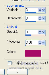 qui puoi trovare qualche risposta ai tuoi dubbi. Se l'argomento che ti interessa non è presente, ti prego di segnalarmelo. Questo tutorial è una creazione di ©Titoune e non può essere copiato su altri siti nè essere offerto per il download. Lo stesso vale per la mia traduzione. Il tutorial è stato creato con PSP X5, ma può essere eseguito anche con le altre versioni di PSP. Secondo la versione utilizzata (anteriore a PSP X) potresti ottenere dei risultati differenti. Dalla versione X4, il comando Immagine>Rifletti è stato sostituito con Immagine>Capovolgi in orizzontale, e il comando Immagine>Capovolgi con Immagine>Capovolgi in verticale. Nelle versioni X5 e X6, le funzioni sono state migliorate rendendo disponibile il menu Oggetti. Vedi la scheda sull'argomento qui Per tradure il tutorial ho usato PSP X. Occorrente: Un tube a scelta. Il resto del materiale qui Il tube utilizzato è di Min#64;a. 1. Apri una nuova immagine trasparente 750 600 pixels. Selezione>Seleziona tutto. 2. Apri l'elemento Paper 8 e vai a Modifica>Copia. Torna al tuo lavoro e vai a Modifica>Incolla nella selezione. Selezione>Deseleziona. 3. Apri l'elemento 3 e vai a Modifica>Copia. Torna al tuo lavoro e vai a Modifica>Incolla come nuovo livello. Non spostarlo. 4. Effetti>Effetti 3D>Sfalsa ombra, colore #a70b67. ![]() 5. Apri l'elemento Scattered Herats 2 e vai a Modifica>Copia. Torna al tuo lavoro e vai a Modifica>Incolla come nuovo livello. Posiziona l'elemento al centro della cornice.Effetti>Effetti 3D>Sfalsa ombra, con i settaggi precedenti. Livelli>Disponi>Sposta giù. 6. Rimani su questo livello. Apri l'elemento lanterna e vai a Modifica>Copia. Torna al tuo lavoro e vai a Modifica>Incolla come nuovo livello. Spostalo nella parte superiore della cornice.![]() Effetti>Effetti 3D>Sfalsa ombra, con i settaggi precedenti. 7. Attiva nuovamente il livello superiore della cornice. Apri l'elemento Ballet Slippers e vai a Modifica>Copia. Torna al tuo lavoro e vai a Modifica>Incolla come nuovo livello. Spostalo in alto a sinistra.Vedi l'esempio finale. Effetti>Effetti 3D>Sfalsa ombra, con i settaggi precedenti. 8. Apri l'elemento Hummingbird e vai a Modifica>Copia. Torna al tuo lavoro e vai a Modifica>Incolla come nuovo livello. Spostalo in alto a destra.![]() Effetti>Effetti 3D>Sfalsa ombra, con i settaggi precedenti. 9. Apri l'elemento Ribbon e vai a Modifica>Copia. Torna al tuo lavoro e vai a Modifica>Incolla come nuovo livello. Spostalo a destra.Vedi l'esempio finale. Effetti>Effetti 3D>Sfalsa ombra, con i settaggi precedenti. 10. Apri l'elemento Flower Branch e vai a Modifica>Copia. Torna al tuo lavoro e vai a Modifica>Incolla come nuovo livello. Spostalo in basso a destra.Vedi l'esempio finale. Effetti>Effetti 3D>Sfalsa ombra, con i settaggi precedenti. 11. Apri l'elemento Rose 1 e vai a Modifica>Copia. Torna al tuo lavoro e vai a Modifica>Incolla come nuovo livello. Spostalo in basso a destra, sul ramo.![]() Effetti>Effetti 3D>Sfalsa ombra, con i settaggi precedenti. 12. Apri l'elemento Glass e vai a Modifica>Copia. Torna al tuo lavoro e vai a Modifica>Incolla come nuovo livello. Spostalo in basso a destra.Effetti>Effetti 3D>Sfalsa ombra, con i settaggi precedenti. Livelli>Disponi>Sposta giù. ![]() 13. Attiva il livello superiore. Apri l'elemento Cupcake 1 e vai a Modifica>Copia. Torna al tuo lavoro e vai a Modifica>Incolla come nuovo livello. Spostalo accanto al bicchiere.Vedi l'esempio finale. Effetti>Effetti 3D>Sfalsa ombra, con i settaggi precedenti. 14. Apri l'elemento hat e vai a Modifica>Copia. Torna al tuo lavoro e vai a Modifica>Incolla come nuovo livello. Spostalo in basso.![]() Effetti>Effetti 3D>Sfalsa ombra, con i settaggi precedenti. 15. Apri l'elemento Stool e vai a Modifica>Copia. Torna al tuo lavoro e vai a Modifica>Incolla come nuovo livello. Spostalo in basso.Vedi l'esempio finale. Effetti>Effetti 3D>Sfalsa ombra, con i settaggi precedenti. 16. Apri l'elemento Kitty e vai a Modifica>Copia. Torna al tuo lavoro e vai a Modifica>Incolla come nuovo livello. Spostalo sullo sgabello.![]() Effetti>Effetti 3D>Sfalsa ombra, con i settaggi precedenti. 17. Apri l'elemento Flowers 1 e vai a Modifica>Copia. Torna al tuo lavoro e vai a Modifica>Incolla come nuovo livello. Spostalo in basso a sinistra.Vedi l'esempio finale. Effetti>Effetti 3D>Sfalsa ombra, con i settaggi precedenti. 18. Apri il tuo tube e vai a Modifica>Copia. Torna al tuo lavoro e vai a Modifica>Incolla come nuovo livello. Immagine>Ridimensiona, se e quanto necessario, tutti i livelli non selezionato. Spostalo dove preferisci,o vedi il mio esempio. Effetti>Effetti 3D>Sfalsa ombra, con i settaggi precedenti. 19. Attiva il livello Raster 1. Apri l'elemento border e vai a Modifica>Copia. Torna al tuo lavoro e vai a Modifica>Incolla come nuovo livello. Effetti>Effetti 3D>Sfalsa ombra, con i settaggi precedenti. 20. Attiva il livello superiore. Firma il tuo lavoro. Livelli>Unisci>Unisci tutto e salva in formato jpg. ![]() Se hai problemi o dubbi, o trovi un link non funzionante, scrivimi. 24 Maggio 2014 |