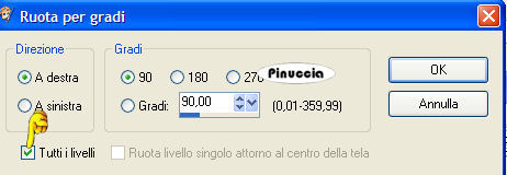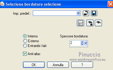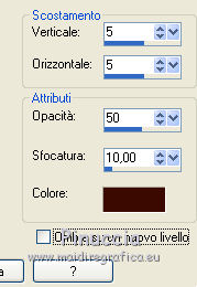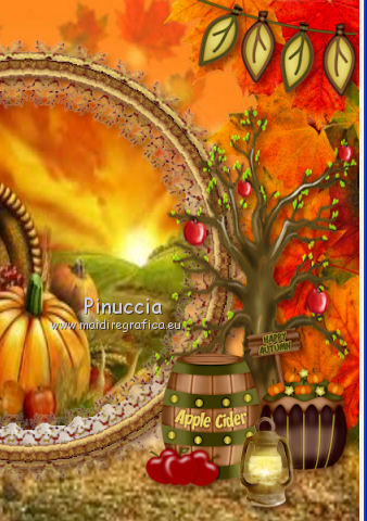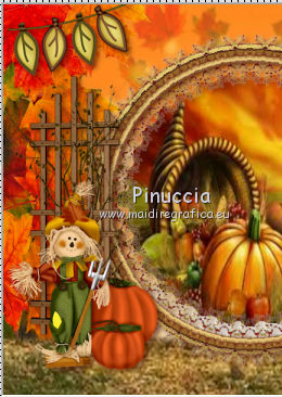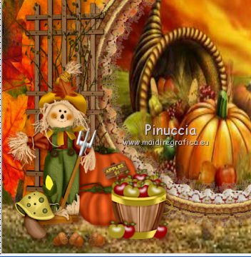 qui puoi trovare qualche risposta ai tuoi dubbi. Se l'argomento che ti interessa non è presente, ti prego di segnalarmelo. Questo tutorial è una creazione di ©Titoune e non può essere copiato su altri siti nè essere offerto per il download. Lo stesso vale per la mia traduzione. Il tutorial è stato creato con PSP X5, ma può essere eseguito anche con le altre versioni di PSP. Secondo la versione utilizzata (anteriore a PSP X) potresti ottenere dei risultati differenti. Vedi la mia scheda riguardante le funzioni Rifletti>Capovolgi in X4 e X5 qui Per tradure il tutorial ho usato PSP X. Occorrente: Un tube a scelta. Il resto del materiale qui Filtri in caso di dubbi, ricorda di consultare la mia sezione filtri qui Penta.com - Jeans qui ![]() 1. Apri una nuova immagine trasparente 750 x 600 pixels. Selezione>Seleziona tutto. 2. Apri l'elemento 2ec08dcb_2 e vai a Modifica>Copia. Torna al tuo lavoro e vai a Modifica>Incolla nella selezione. Selezione>Deseleziona. Livelli>Duplica. Cambia la modalità di miscelatura di questo livello in Moltiplica. Livelli>Unisci>Unisci giù. 3. Apri l'elemento "frame" e vai a Modifica>Copia. Torna al tuo lavoro e vai a Modifica>Incolla come nuovo livello. Lascialo come sta. 4. Attiva lo strumento Bacchetta magica ![]() e clicca al centro della cornice per selezionarla. ![]() Selezione>Modifica>Espandi - 10 pixels. Liveli>Nuovo livello raster. Livelli>Disponi>Sposta giù. 5. Apri l'elemento thanksgiving e vai a Modifica>Copia. Torna al tuo lavoro e vai a Modifica>Incolla nella selezione. Selezione>Deseleziona. 6. Attiva nuovamente il livello della cornice. Effetti>Effetti 3D>Sfalsa ombra, colore #3d0b00. ![]() 7. Apri l'elemento frame2 e vai a Modifica>Copia. Torna al tuo lavoro e vai a Modifica>Incolla come nuovo livello. Lascialo come sta. Effetti>Effetti 3D>Sfalsa ombra, con i settaggi precedenti. Livelli>Unisci>Unisci giù. Rinomina questo livello "cornice". 8. Apri l'elemento ground e vai a Modifica>Copia. Torna al tuo lavoro e vai a Modifica>Incolla come nuovo livello. Spostalo sotto la cornice.Vedi l'esempio finale. Nella paletta dei livelli porta questo livello sopra il livello cornice. 9. Attiva nuovamente il livello superiore. Apri l'elemento LKD_GivingThanksTS_flags2 e vai a Modifica>Copia. Torna al tuo lavoro e vai a Modifica>Incolla come nuovo livello. Spostalo in alto.Vedi l'esempio finale. Effetti>Effetti 3D>Sfalsa ombra, con i settaggi precedenti. 10. Apri l'elemento LKD_GivingThanksTS_climbingvine e vai a Modifica>Copia. Torna al tuo lavoro e vai a Modifica>Incolla come nuovo livello. Spostalo a sinistra.Vedi l'esempio finale. Effetti>Effetti 3D>Sfalsa ombra, con i settaggi precedenti. 11. Apri l'elemento LKD_GivingThanksTS_scarecrow e vai a Modifica>Copia. Torna al tuo lavoro e vai a Modifica>Incolla come nuovo livello. Spostalo in basso a sinistra.![]() Effetti>Effetti 3D>Sfalsa ombra, con i settaggi precedenti. 12. Apri l'elemento LKD_GivingThanksTS_mushroom e vai a Modifica>Copia. Torna al tuo lavoro e vai a Modifica>Incolla come nuovo livello. Spostalo in basso a sinistra.Vedi l'esempio finale. Effetti>Effetti 3D>Sfalsa ombra, con i settaggi precedenti. 13. Apri l'elemento LKD_GivingThanksTS_acorns e vai a Modifica>Copia. Torna al tuo lavoro e vai a Modifica>Incolla come nuovo livello. Spostalo in basso.Vedi l'esempio finale. Effetti>Effetti 3D>Sfalsa ombra, con i settaggi precedenti. 14. Apri l'elemento LKD_GivingThanksTS_applesbucket e vai a Modifica>Copia. Torna al tuo lavoro e vai a Modifica>Incolla come nuovo livello. Spostalo in basso.![]() Effetti>Effetti 3D>Sfalsa ombra, con i settaggi precedenti. 15. Apri l'elemento apple_tree e vai a Modifica>Copia. Torna al tuo lavoro e vai a Modifica>Incolla come nuovo livello. Spostalo a destra.Vedi l'esempio finale. Effetti>Effetti 3D>Sfalsa ombra, con i settaggi precedenti. 16. Apri l'elemento LKD_GivingThanksTS_ciderbarrel e vai a Modifica>Copia. Torna al tuo lavoro e vai a Modifica>Incolla come nuovo livello. Spostalo in basso a destra.Vedi l'esempio finale. Effetti>Effetti 3D>Sfalsa ombra, con i settaggi precedenti. 17. Apri l'elemento LKD_GivingThanksTS_cupcake1 e vai a Modifica>Copia. Torna al tuo lavoro e vai a Modifica>Incolla come nuovo livello. Spostalo in basso a destra.Vedi l'esempio finale. Effetti>Effetti 3D>Sfalsa ombra, con i settaggi precedenti. 18. Apri l'elemento LKD_GivingThanksTS_lantern e vai a Modifica>Copia. Torna al tuo lavoro e vai a Modifica>Incolla come nuovo livello. Spostalo in basso.![]() Effetti>Effetti 3D>Sfalsa ombra, con i settaggi precedenti. 19. Apri l'elemento LKD_GivingThanksTS_bird e vai a Modifica>Copia. Torna al tuo lavoro e vai a Modifica>Incolla come nuovo livello. Spostalo a destra della cornice.Vedi l'esempio finale. Porta il livello sotto quello della cornice. Livelli>Duplica. Livelli>Disponi>Sposta su. 20. Attiva lo strumento Gomma ![]() e cancella l'estremità del ramo che deborda dalla cornice. ![]() Attiva nuovamente il livello originale. Effetti>Effetti 3D>Sfalsa ombra, con i settaggi precedenti. 21. Attiva il livello superiore. Apri l'elemento LKD_GivingThanksTS_flowers1 e vai a Modifica>Copia. Torna al tuo lavoro e vai a Modifica>Incolla come nuovo livello. Spostalo sopra la cornice.Vedi l'esempio finale. Effetti>Effetti 3D>Sfalsa ombra, con i settaggi precedenti. 22. Apri il tuo tube e vai a Modifica>Copia. Torna al tuo lavoro e vai a Modifica>Incolla come nuovo livello. Immagine>Ridimensiona, se e quanto necessario, tutti i livelli non selezionato. Spostalo dove preferisci,o vedi il mio esempio. Effetti>Effetti 3D>Sfalsa ombra, con i settaggi precedenti. 23. Attiva il livello inferiore. Selezione>Seleziona tutto. Immagine>Ritaglia la selezione. 24. Immagine>Dimensioni tela - 800 x 650 pixels. ![]() 25. Livelli>Nuovo livello raster. Livelli>Disponi>Sposta giù. Selezione>Seleziona tutto. Attiva nuovamente l'elemento 2ec08dcb_2. Prima di copiare l'elemento: Immagine>Ruota per gradi - 90 gradi a destra, tutti i livelli selezionato. ![](