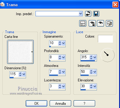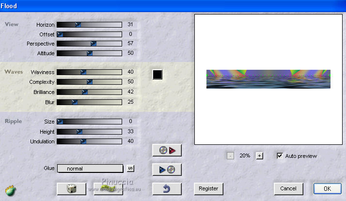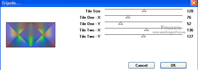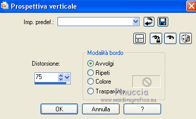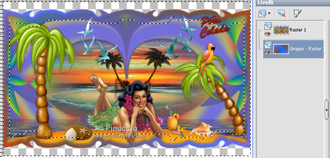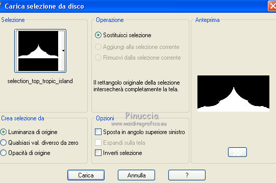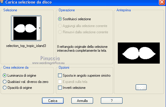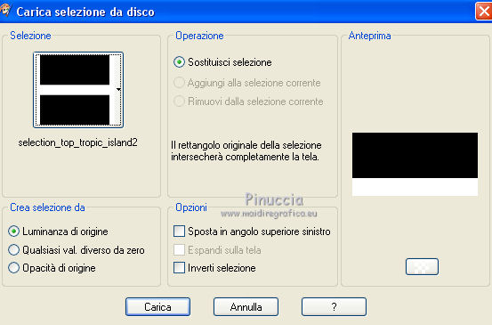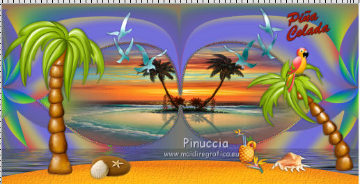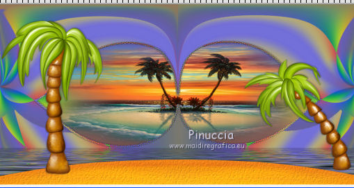 qui puoi trovare qualche risposta ai tuoi dubbi. Se l'argomento che ti interessa non è presente, ti prego di segnalarmelo. Questo tutorial è una creazione di ©Titoune e non può essere copiato su altri siti nè essere offerto per il download. Lo stesso vale per la mia traduzione. Il tutorial è stato creato con PSP X5, ma può essere eseguito anche con le altre versioni di PSP. Secondo la versione utilizzata (anteriore a PSP X) potresti ottenere dei risultati differenti. Vedi la mia scheda riguardante le funzioni Rifletti>Capovolgi in X4 e X5 qui Per tradure il tutorial ho usato PSP X. Occorrente: Un tube a scelta. Il resto del materiale qui Il tube utilizzato è di Paci. Filtri: Filters Unlimited 2.0 qui VM Instant Art - Tripolis qui Flaming Pear - Flood qui Flaming Pear - Flexify qui ![]() Metti il gradiente "winterchaos_gradient029" nella cartella Gradienti. Metti le selezioni nella cartella Selezioni. Apri la maschera ClubDingInverse_chickmask" in PSP e minimizzala con il resto del materiale. 1. Apri una nuova immagine trasparente 1280 x 650 pixels. Selezione>Seleziona tutto. 2. Apri l'elemento tuile_départ e vai a Modifica>Copia. Torna al tuo lavoro e vai a Modifica>Incolla nella selezione. Mantieni selezionato. 3. Livelli>Nuovo livello raster. Apri il tube Varie 8_OBG e vai a Modifica>Copia. Torna al tuo lavoro e vai a Modifica>Incolla nella selezione. Selezione>Deseleziona. 4. Effetti>Effetti di immagine>Motivo unico. ![]() Regola>Sfocatura>Sfocatura gaussiana - raggio 45. ![]() Livelli>Unisci>Unisci visibile. 5. Effetti>Plugins>VM Instant Art - Tripolis. ![]() 6. Effetti>Effetti geometrici>Prospettiva verticale. ![]() 7. Effetti>Effetti geometrici>Cilindro verticale. ![]() Livelli>Duplica. 8. Effetti>Plugins>Flaming Pear - Flexify. ![]() 9. Selezione>Carica/Salva selezione>Carica selezione da disco. Cerca e carica la selezione "sélection_top_tropic_island". ![]() Premi sulla tastiera il tasto CANC ![]() Selezione>Deseleziona. Di nuovo Effetti>Plugins>Flaming Pear - Flexify, con i settaggi precedenti. 10. Attiva il livello inferiore. Selezione>Carica/Salva selezione>Carica selezione da disco. Cerca e carica la selezione "sélection_top_tropic_island2". ![]() 11. Effetti>Plugins>Flaming Pear - Flood. ![]() Selezione>Deseleziona. 12. Attiva nuovamente il livello superiore. Selezione>Carica/Salva selezione>Carica selezione da disco. Cerca e carica la selezione "sélection_top_tropic_island3". ![]() 13. Livelli>Nuovo livello raster. Apri il tube walfrido_Close-to-You_ice. Con lo strumento che preferisci elimina il watermark. Modifica>Copia. Torna al tuo lavoro e vai a Modifica>Incolla nella selezione. 14. Selezione>Modifica>Seleziona bordature selezione. ![]() Attiva il livello inferiore. Selezione>Innalza selezione a livello. Livelli>Disponi>Porta in alto. 15. Effetti>Effetti 3D>Smusso a incasso. ![]() 16. Effetti>Effetti artistici>Mezzitoni. ![]() Selezione>Deseleziona. 17. Effetti>Effetti 3D>Sfalsa ombra, con il colore #30354f. ![]() Ripeti l'Effetto Sfalsa ombra, cambiando verticale e orizzontale con -3/3. ![]() 18. Apri l'elemento sable e vai a Modifica>Copia. Torna al tuo lavoro e vai a Modifica>Incolla come nuovo livello. Spostalo contro il bordo inferiore.Vedi l'esempio finale. Effetti>Effetti 3D>Sfalsa ombra, con i settaggi precedenti. 19. Apri l'elemento palmier e vai a Modifica>Copia. Torna al tuo lavoro e vai a Modifica>Incolla come nuovo livello. Spostalo a sinistra.Vedi l'esempio finale. Effetti>Effetti 3D>Sfalsa ombra, con i settaggi precedenti. 20. Apri l'elemento palmier 2 e vai a Modifica>Copia. Torna al tuo lavoro e vai a Modifica>Incolla come nuovo livello. Spostalo a destra.![]() Effetti>Effetti 3D>Sfalsa ombra, con i settaggi precedenti. 21. Apri l'elemento parrot e vai a Modifica>Copia. Torna al tuo lavoro e vai a Modifica>Incolla come nuovo livello. Spostalo dove preferisci, o vedi il mio esempio.Effetti>Effetti 3D>Sfalsa ombra, con i settaggi precedenti. 22. Apri l'elemento summer_birds e vai a Modifica>Copia. Torna al tuo lavoro e vai a Modifica>Incolla come nuovo livello. Spostalo in alto.![]() Effetti>Effetti 3D>Sfalsa ombra, con i settaggi precedenti. 23. Apri l'elemento shells e vai a Modifica>Copia. Torna al tuo lavoro e vai a Modifica>Incolla come nuovo livello. Spostalo in basso a sinistra.Vedi l'esempio finale. Effetti>Effetti 3D>Sfalsa ombra, con i settaggi precedenti. 24. Apri l'elemento shell e vai a Modifica>Copia. Torna al tuo lavoro e vai a Modifica>Incolla come nuovo livello. Immagine>Ruota per gradi - 10 gradi a destra. ![]() Spostalo in basso a destra.Vedi l'esempio finale. Effetti>Effetti 3D>Sfalsa ombra, con i settaggi precedenti. 25. Apri l'elemento drink e vai a Modifica>Copia. Torna al tuo lavoro e vai a Modifica>Incolla come nuovo livello. Spostalo dove preferisci o vedi il mio esempio.Effetti>Effetti 3D>Sfalsa ombra, con i settaggi precedenti. 26. Apri l'elemento wordart e vai a Modifica>Copia. Torna al tuo lavoro e vai a Modifica>Incolla come nuovo livello. Spostalo in alto a destra.![]() Effetti>Effetti 3D>Sfalsa ombra, con i settaggi precedenti. 27. Apri il tuo tube e vai a Modifica>Copia. Torna al tuo lavoro e vai a Modifica>Incolla come nuovo livello. Immagine>Ridimensiona, se e quanto necessario, tutti i livelli non selezionato. Spostalo dove preferisci, o vedi il mio esempio.Effetti>Effetti 3D>Sfalsa ombra, con i settaggi precedenti. Livelli>Unisci>Unisci visibile. 28. Apri una nuova immagine trasparente 1280 x 800 pixels. Selezione>Seleziona tutto. 29. Attiva nuovamente l'elemento tuile_départ e vai a Modifica>Copia. Torna al tuo lavoro e vai a Modifica>Incolla nella selezione. Selezione>Deseleziona. 30. Livelli>Nuovo livello maschera>Da immagine. Apri il menu sotto la finestra di origine e vedrai la lista dei files aperti. Seleziona la maschera "ClubDingInverse_chickmask", con i seguenti settaggi. ![]() Livelli>Unisci>Unisci gruppo. 31. Effetti>Effetti di trama>Trama - seleziona la trama Carta fine con i seguenti settagg