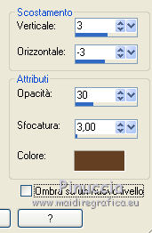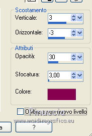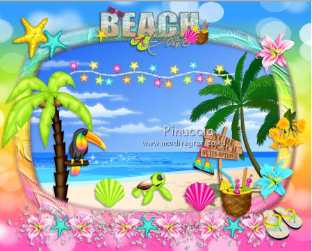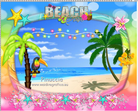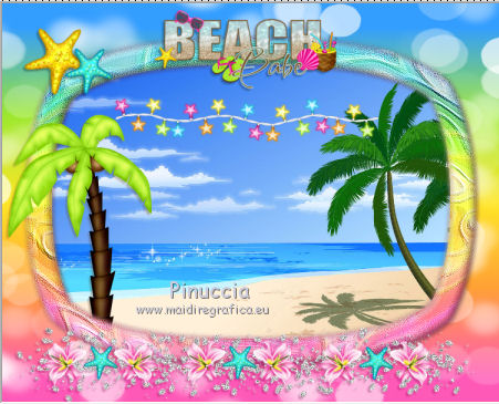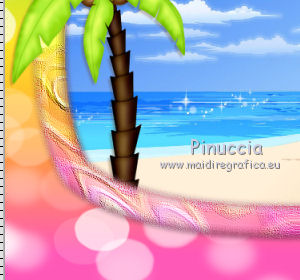 qui puoi trovare qualche risposta ai tuoi dubbi. Se l'argomento che ti interessa non è presente, ti prego di segnalarmelo. Questo tutorial è una creazione di ©Titoune e non può essere copiato su altri siti nè essere offerto per il download. Lo stesso vale per la mia traduzione. Il tutorial è stato creato con PSP X5, ma può essere eseguito anche con le altre versioni di PSP. Secondo la versione utilizzata (anteriore a PSP X) potresti ottenere dei risultati differenti. Dalla versione X4, il comando Immagine>Rifletti è stato sostituito con Immagine>Capovolgi in orizzontale, e il comando Immagine>Capovolgi con Immagine>Capovolgi in verticale. Nelle versioni X5 e X6, le funzioni sono state migliorate rendendo disponibile il menu Oggetti. Vedi la scheda sull'argomento qui Per tradure il tutorial ho usato PSP X. Occorrente: Un tube a scelta. Il resto del materiale qui Il tube utilizzato è di Radyga. Filtri in caso di dubbi, ricorda di consultare la mia sezione filtri qui Adjust - Variations qui Animation Shop qui ![]() 1, Apri una nuova immagine trasparente 750 x 600 pixels. Selezione>Seleziona tutto. 2. Apri l'elemento MC Tropixx P2, e vai a Modifica>Copia. Torna al tuo lavoro e vai a Modifica>Incolla nella selezione. Selezione>Modifica>Contrai - 55 pixels. Selezione>Innalza selezione a livello. Regola>Sfocatura>Sfocatura gaussiana - raggio 20. ![]() Selezione>Deseleziona. 3. Effetti>Effetti geometrici>Cerchio. ![]() 4. Effetti>Effetti geometrici>Cilindro verticale. ![]() 5. Selezione>Seleziona tutto. Selezione>Mobile. Selezione>Immobilizza. Selezione>Modifica>Seleziona bordature selezione. ![]() Selezione>Innalza selezione a livello. Selezione>Inverti. Attiva il livello sottostante. Premi sulla tastiera il tasto CANC ![]() Selezione>Deseleziona. 6. Attiva nuovamente il livello della cornice. Effetti>Effetti di trama>Plastica morbida. ![]() 7. Effetti>Effetti 3D>Smusso a incasso. ![]() Effetti>Effetti di bordo>Aumenta. Livelli>Duplica. Cambia la modalità di miscelatura di questo livello in Luce diffusa. 8. Attiva il livello originale. Effetti>Effetti 3D>Sfalsa ombra, colore #820a50. ![]() Ripeti l'Effetto Sfalsa ombra, cambiando verticale e orizzontale con -3. Attiva il livello superiore. Livelli>Unisci>Unisci giù. Rinomina questo livello "cornice". 9. Attiva lo strumento Bacchetta magica ![]() e clicca al centro della cornice per selezionarla. Selezione>Modifica>Espandi - 10 pixels. 10. Livelli>Nuovo livello raster. Livelli>Disponi>Sposta giù 2 volte. Apri l'elemento 98c6766a5fa3fc1ea003e70398c2a103_large e vai a Modifica>Copia. Torna al tuo lavoro e vai a Modifica>Incolla nella selezione. Selezione>Deseleziona. 11. Attiva nuovamente il livello superiore. Apri l'elemento MC_Tropixx_E5, e vai a Modifica>Copia. Torna al tuo lavoro e vai a Modifica>Incolla come nuovo livello. Spostalo nella parte sinistra della cornice.Vedi l'esempio finale. Porta questo livello sotto il livello della cornice. Livelli>Duplica. Livelli>Disponi>Sposta su. ![]() 12. Attiva lo strumento Gomma ![]() e cancella la parte del tronco che deborda sulla cornice. ![]() Attiva il livello originale. Effetti>Effetti 3D>Sfalsa ombra, colore 644023. ![]() 13. Attiva nuovamente il livello superiore. Apri l'elemento MC_Tropixx_E34, e vai a Modifica>Copia. Torna al tuo lavoro e vai a Modifica>Incolla come nuovo livello. Spostalo in basso.se stai usando X15 o X16: Oggetti>Allinea>Inferiore. ![]() 14. Effetti>Effetti 3D>Sfalsa ombra, colore #86024f. ![]() 15. Effetti>Effetti 3D>Sfalsa ombra, colore #0a0a0a. ![]() 16. Apri l'elemento MC_Tropixx_E10, e vai a Modifica>Copia. Torna al tuo lavoro e vai a Modifica>Incolla come nuovo livello. Spostalo in alto a sinistra.Vedi l'esempio finale. Effetti>Effetti 3D>Sfalsa ombra, con i settaggi precedenti. 17. Apri l'elemento MC_Tropixx_E11, e vai a Modifica>Copia. Torna al tuo lavoro e vai a Modifica>Incolla come nuovo livello. Spostalo in alto a sinistra,scalato con l'elemento precedente. ![]() Effetti>Effetti 3D>Sfalsa ombra, con i settaggi precedenti. 18. Apri l'elemento MC_Tropixx_E1, e vai a Modifica>Copia. Torna al tuo lavoro e vai a Modifica>Incolla come nuovo livello. Spostalo in alto.Vedi l'esempio finale. Effetti>Effetti 3D>Sfalsa ombra, con i settaggi precedenti. 19. Apri l'elemento MC_Tropixx_E9, e vai a Modifica>Copia. Torna al tuo lavoro e vai a Modifica>Incolla come nuovo livello. Spostalo in alto.![]() Effetti>Effetti 3D>Sfalsa ombra, con i settaggi precedenti. Rinomina questo livello "animazione". 20. Apri l'elemento MC_Tropixx_E25, e vai a Modifica>Copia. Torna al tuo lavoro e vai a Modifica>Incolla come nuovo livello. Spostalo in alto a destra.Vedi l'esempio finale. Effetti>Effetti 3D>Sfalsa ombra, con i settaggi precedenti. 21. Apri l'elemento MC_Tropixx_E17, e vai a Modifica>Copia. Torna al tuo lavoro e vai a Modifica>Incolla come nuovo livello. Immagine>Rifletti. Spostalo a sinistra.![]() Effetti>Effetti 3D>Sfalsa ombra, con i settaggi precedenti. 22. Apri l'elemento MC_Tropixx_E8, e vai a Modifica>Copia. Torna al tuo lavoro e vai a Modifica>Incolla come nuovo livello. Spostalo a destra.Vedi l'esempio finale. Effetti>Effetti 3D>Sfalsa ombra, con i settaggi precedenti. 23. Apri l'elemento MC_Tropixx_E24, e vai a Modifica>Copia. Torna al tuo lavoro e vai a Modifica>Incolla come nuovo livello. Spostalo in basso a destra.Vedi l'esempio finale. Effetti>Effetti 3D>Sfalsa ombra, con i settaggi precedenti. 24. Apri l'elemento MC_Tropixx_E27, e vai a Modifica>Copia. Torna al tuo lavoro e vai a Modifica>Incolla come nuovo livello. Spostalo in basso a destra.Vedi l'esempio finale. Effetti>Effetti 3D>Sfalsa ombra, con i settaggi precedenti. 25. Apri l'elemento MC_Tropixx_E3, e vai a Modifica>Copia. Torna al tuo lavoro e vai a Modifica>Incolla come nuovo livello. Spostalo in basso a destra.Vedi l'esempio finale. Effetti>Effetti 3D>Sfalsa ombra, con i settaggi precedenti. 26. Apri l'elemento MC_Tropixx_E16, e vai a Modifica>Copia. Torna al tuo lavoro e vai a Modifica>Incolla
