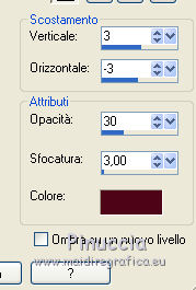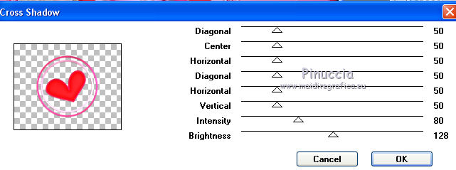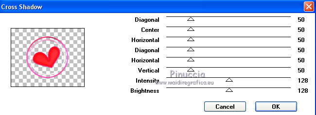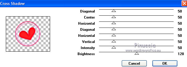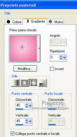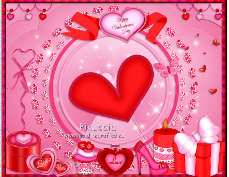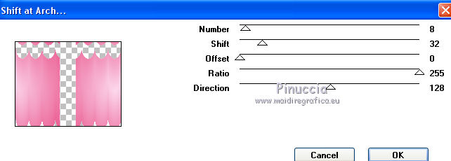qui puoi trovare qualche risposta ai tuoi dubbi. Se l'argomento che ti interessa non è presente, ti prego di segnalarmelo. Per tradurre questo tutorial ho usato PSP X. Questo tutorial è una creazione di ©Titoune e non può essere copiato su altri siti nè essere offerto per il download. Lo stesso vale per la mia traduzione. Per tradurlo, ho usato PSP X, ma può essere eseguito anche con le altre versioni di PSP. Grazie ai creatori dei tubes che mettono a disposizione il loro lavoro in vari gruppi di condivisione. Rispetta il lavoro degli autori, non cambiare il nome del file e non cancellare il watermark. Occorrente: Un tube a scelta. Il resto del materiale qui Il tube utilizzato è di K@rine Dreams. Filtri: Mura's Seamless - Shift at Arch qui Graphics Plus - Cross Shadow qui Simple - Left Right Wrap (bonus) qui Animation Shop qui ![]() Se stai usando le nuove versioni X14 X15 e X16 le funzioni Immagine>Rifletti/Capovolgi hanno cambiato denominazione e comportamento. Vedi la mia scheda sull'argomento qui 1. Imposta il colore di primo piano con #fcd9ee, e il colore di sfondo con #eb5d92. Passa il colore di primo piano a Gradiente di primo piano/sfondo, stile Sprazzo di luce. ![]() 2. Apri una nuova immagine trasparente 750 x 600 pixels, e riempila con il gradiente.Livelli>Duplica. 3. Immagine>Ridimensiona, all'85%, tutti i livelli non selezionato. Effetti>Effetti di bordo>Aumenta. 4. Effetti>Plugins>Simple - Left Right Wrap. 5. Effetti>Plugins>Mura's Seamless - Shift At Arch. ![]() 6. Effetti>Effetti di distorsione>Coordinate polari. ![]() 7. Effetti>Effetti 3D>Sfalsa ombra, colore #4f0518. ![]() 8. Apri l'elemento nq-element 12 e vai a Modifica>Copia. Torna al tuo lavoro e vai a Modifica>Incolla come nuovo livello. Non spostarlo. Lascialo come sta. 9. Apri l'elemento frame e vai a Modifica>Copia. Torna al tuo lavoro e vai a Modifica>Incolla come nuovo livello. Non spostarlo. Effetti>Effetti 3D>Sfalsa ombra, con i settaggi precedenti. 10. Apri l'elemento nq-element 3 e vai a Modifica>Copia. Torna al tuo lavoro e vai a Modifica>Incolla come nuovo livello. Non spostarlo. Effetti>Effetti 3D>Sfalsa ombra, con i settaggi precedenti. Porta questo livello sotto quello della cornice, e rinomina il livello "animazione". 11. Apri l'elemento border e vai a Modifica>Copia. Torna al tuo lavoro e vai a Modifica>Incolla come nuovo livello. Effetti>Effetti 3D>Sfalsa ombra, con i settaggi precedenti. 12. Apri l'elemento nq-element 15 e vai a Modifica>Copia. Torna al tuo lavoro e vai a Modifica>Incolla come nuovo livello. Spostalo in alto.Vedi l'esempio finale. Effetti>Effetti 3D>Sfalsa ombra, con i settaggi precedenti. Porta questo livello sotto il livello del bordo. 13. Attiva nuovamente il livello superiore. Apri l'elemento nq-element 22 e vai a Modifica>Copia. Torna al tuo lavoro e vai a Modifica>Incolla come nuovo livello. Spostalo in alto.Vedi l'esempio finale. Effetti>Effetti 3D>Sfalsa ombra, con i settaggi precedenti. 14. Apri l'elemento nq-element 33 e vai a Modifica>Copia. Torna al tuo lavoro e vai a Modifica>Incolla come nuovo livello. Spostalo a destra.Effetti>Effetti 3D>Sfalsa ombra, con i settaggi precedenti. Porta il livello sotto il livello del bordo. ![]() 15. Attiva nuovamente il livello superiore. Torna al tuo lavoro e vai a Modifica>Incolla come nuovo livello. Spostalo in basso a destra.Vedi l'esempio finale. Effetti>Effetti 3D>Sfalsa ombra, con i settaggi precedenti. 16. Apri l'elemento nq-element 1 e vai a Modifica>Copia. Torna al tuo lavoro e vai a Modifica>Incolla come nuovo livello. Spostalo in basso a destra.Vedi l'esempio finale. Effetti>Effetti 3D>Sfalsa ombra, con i settaggi precedenti. 17. Apri l'elemento nq-element 17 e vai a Modifica>Copia. Torna al tuo lavoro e vai a Modifica>Incolla come nuovo livello. Spostalo in basso a destra.![]() Effetti>Effetti 3D>Sfalsa ombra, con i settaggi precedenti. 18. Apri l'elemento nq-element 20 e vai a Modifica>Copia. Torna al tuo lavoro e vai a Modifica>Incolla come nuovo livello. Spostalo in basso, sopra la candela.![]() Effetti>Effetti 3D>Sfalsa ombra, con i settaggi precedenti. 19. Apri l'elemento nq-element 31 e vai a Modifica>Copia. Torna al tuo lavoro e vai a Modifica>Incolla come nuovo livello. Spostalo in basso.Vedi l'esempio finale. Effetti>Effetti 3D>Sfalsa ombra, con i settaggi precedenti. 20. Apri l'elemento nq-element 14 e vai a Modifica>Copia. Torna al tuo lavoro e vai a Modifica>Incolla come nuovo livello. Spostalo in basso.![]() Effetti>Effetti 3D>Sfalsa ombra, con i settaggi precedenti. 21. Apri l'elemento nq-element 28 e vai a Modifica>Copia. Torna al tuo lavoro e vai a Modifica>Incolla come nuovo livello. Spostalo a sinistra.Vedi l'esempio finale. Effetti>Effetti 3D>Sfalsa ombra, con i settaggi precedenti. 22. Apri l'elemento nq-element 18 e vai a Modifica>Copia. Torna al tuo lavoro e vai a Modifica>Incolla come nuovo livello. Spostalo in basso a sinistra.![]() Effetti>Effetti 3D>Sfalsa ombra, con i settaggi precedenti. 23. Apri il tuo tube e vai a Modifica>Copia. Torna al tuo lavoro e vai a Modifica>Incolla come nuovo livello. Immagine>Ridimensiona, se e quanto necessario, tutti i livelli non selezionato. Spostalo dove preferisci,o vedi il mio esempio. Effetti>Effetti 3D>Sfalsa ombra, con i settaggi precedenti. Firma il tuo lavoro. 24. Animazione. Attiva il livello "animazione". Livelli>Duplica, 2 volte e rimani posizionato sul livello della seconda copia. 25. Effetti>Plugins>Graphics Plus - Cross Shadow, con i settaggi standard. ![]() Chiudi questo livello e attiva il livello della prima copia. 26. Effetti>Plugins>Graphics Plus - Cross Shadow, cambia Intensity con 80 e ok. ![]() Chiudi questo livello e attiva il livello "animazione". 27. Effetti>Plugins>Graphics Plus - Cross Shadow, cambia Intensity con 50 e ok. ![]() Lascia il livello visibile. 28. Modifica>Copia Unione. Apri Animation Shop e vai a Modifica>Incolla>Incolla come nuova animazione. 29. Torna in PSP. Chiudi il livello "animazione" e apri il livello del