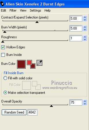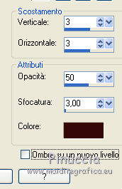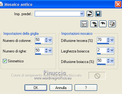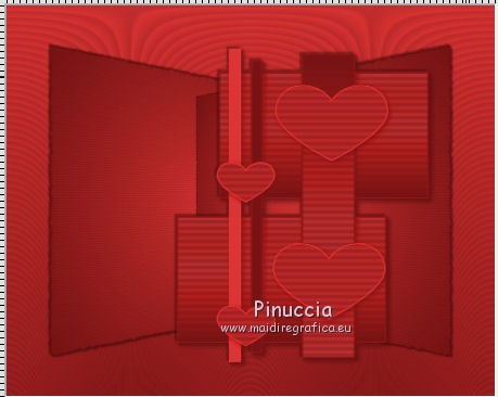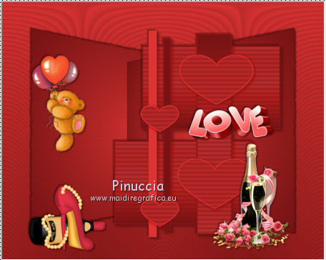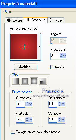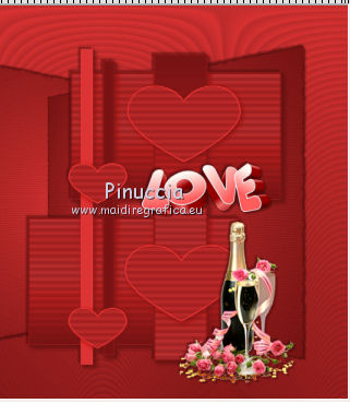 qui puoi trovare qualche risposta ai tuoi dubbi. Se l'argomento che ti interessa non è presente, ti prego di segnalarmelo. Per tradurre questo tutorial ho usato PSP X. Questo tutorial è una creazione di ©Titoune e non può essere copiato su altri siti nè essere offerto per il download. Lo stesso vale per la mia traduzione. Per tradurlo, ho usato PSP X, ma può essere eseguito anche con le altre versioni di PSP. Grazie ai creatori dei tubes che mettono a disposizione il loro lavoro in vari gruppi di condivisione. Rispetta il lavoro degli autori, non cambiare il nome del file e non cancellare il watermark. Occorrente: Un tube a scelta. Il resto del materiale qui Filtri: Andromeda - Perspective qui Alien Skin Xenofex 2.0 - Burnt Edges qui DSB Flux - Bright Noise qui Animation Shop qui ![]() Se stai usando le nuove versioni X14 X15 e X16 le funzioni Immagine>Rifletti/Capovolgi hanno cambiato denominazione e comportamento. Vedi la mia scheda sull'argomento qui 1. Imposta il colore di primo piano con #dc3434, e il colore di sfondo con #791515. Passa il colore di primo piano a Gradiente di primo piano/sfondo, stile Sprazzo di luce. ![]() 2. Apri una nuova immagine trasparente 750 x 600 pixels, e riempila con il gradiente.3. Effetti>Effetti di trama>Veneziana - colore #1e0606. ![]() 4. Livelli>Duplica. Chiudi questo livello e attiva il livello sottostante dell'originale. Effetti>Effetti di distorsione>Coordinate polari. ![]() 5. Riapri e attiva il livello superiore. Immagine>Ridimensiona, al 95%, tutti i livelli non selezionato. 6. Effetti>Plugins>Alien Skin Xenofex 2.0 - Burnt Edges - colore #791515. ![]() 7. Effetti>Plugins>Andromeda - Perspective. Clicca sull'icona Presets ![]() imposta i seguenti settaggi e clicca sul segno di spunta in basso a destra per applicare. ![]() Di nuovo clicca sul segno di spunta per chiudere il filtro. ![]() per il mio esempio ho ridimensionato al 95%, tutti i livelli non selezionato. Livelli>Duplica. Immagine>Rifletti. Livelli>Unisci>Unisci giù. Ancora, per il mio esempio, ho ridimensionato al 95%, tutti i livelli non selezionato 8. Effetti>Effetti 3D>Sfalsa ombra, colore #350909. ![]() Ripeti l'Effetto Sfalsa ombra, cambiando verticale e orizzontale con -3. 9. Apri l'elemento R&R_TAGBACKS_HEARTS e vai a Modifica>Copia. Torna al tuo lavoro e vai a Modifica>Incolla come nuovo livello. Spostalo a destra.![]() Effetti>Effetti 3D>Sfalsa ombra, con i settaggi precedenti. 10. Apri l'elemento 0_77328_b2767b9f_XL (love) e vai a Modifica>Copia. Torna al tuo lavoro e vai a Modifica>Incolla come nuovo livello. Spostalo a destra.Vedi l'esempio finale. 11. Apri l'elemento 0_b0d18_bc086564_XL (Champagne) e vai a Modifica>Copia. Torna al tuo lavoro e vai a Modifica>Incolla come nuovo livello. Spostalo in basso a destra.![]() Effetti>Effetti 3D>Sfalsa ombra, con i settaggi precedenti. 12. Apri l'elemento 0_be5c2_a3ae917a_L (scarpa) e vai a Modifica>Copia. Torna al tuo lavoro e vai a Modifica>Incolla come nuovo livello. Spostalo in basso a sinistra.![]() Effetti>Effetti 3D>Sfalsa ombra, con i settaggi precedenti. 13. Apri il tube chlovours e vai a Modifica>Copia. Torna al tuo lavoro e vai a Modifica>Incolla come nuovo livello. Spostalo in alto a sinistra.![]() 14. Attiva il livello Raster 1. Apri l'elemento "frame" e vai a Modifica>Copia. Torna al tuo lavoro e vai a Modifica>Incolla come nuovo livello. Livelli>Duplica. Attiva il livello sottostante dell'originale. 15. Effetti>Effetti di trama>Mosaico antico. ![]() Effetti>Effetti di bordo>Aumenta. Rinomina questo livello "animazione". Attiva il livello della copia. Effetti>Effetti 3D>Sfalsa ombra, con i settaggi precedenti. br> 16. Attiva il livello superiore. Apri il tuo tube e vai a Modifica>Copia. Torna al tuo lavoro e vai a Modifica>Incolla come nuovo livello. Immagine>Ridimensiona, se e quanto necessario, tutti i livelli non selezionato. Spostalo dove preferisci,o vedi il mio esempio. Effetti>Effetti 3D>Sfalsa ombra, con i settaggi precedenti. 17. Apri l'elemento Titoune_bordure e vai a Modifica>Copia. Torna al tuo lavoro e vai a Modifica>Incolla come nuovo livello. Firma il tuo lavoro. 18. Animazione. Attiva il livello "animazione". Livelli>Duplica, 2 volte, e rimani posizionato sul livello della seconda copia. Effetti>Plugins>DSB Flux - Bright Noise. ![]() Chiudi questo livello e attiva il livello della prima copia. 19. Effetti>Plugins>DSB Flux - Bright Noise, clicca sul puntino di Mix per cambiare l'aspetto del disturbo e ok. Chiudi questo livello e attiva il livello "animazione". 20. Effetti>Plugins>DSB Flux - Bright Noise, clicca sul puntino di Mix per cambiare l'aspetto del disturbo e ok. Lascia il livello visibile. 21. Modifica>Copia Unione. Apri Animation Shop e vai a Modifica>Incolla>Incolla come nuova animazione. 21. Torna in PSP. Chiudi il livello "animazione" e apri il livello della prima copia. Modifica>Copia Unione. Torna in Animation Shop e vai a Modifica>Incolla>Incolla dopo il fotogramma corrente. 22. In PSP. Chiudi il livello della prima copia e apri il livello della seconda copia. Modifica>Copia Unione. In Animation Shop: Modifica>Incolla>Incolla dopo il fotogramma corrente. 23. Controlla il risultato cliccando su Visualizza e salva in formato gif.![]() Se hai problemi o dubbi, o trovi un link non funzionante, scrivimi. 8 Febbraio 2014 |