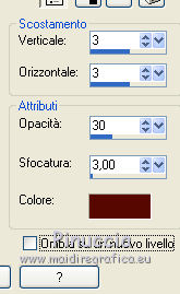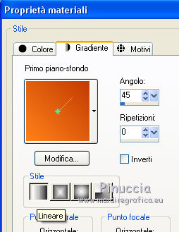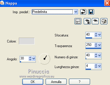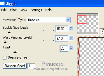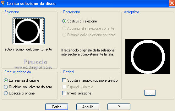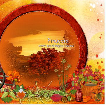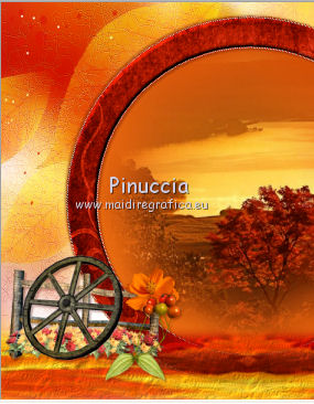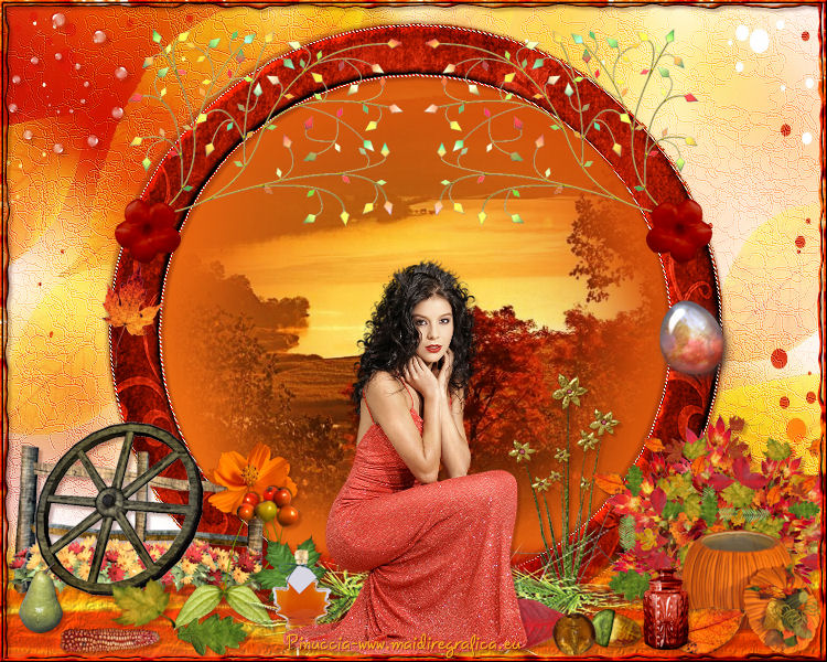 qui puoi trovare qualche risposta ai tuoi dubbi. Se l'argomento che ti interessa non è presente, ti prego di segnalarmelo. Questo tutorial è una creazione di ©Titoune e non può essere copiato su altri siti nè essere offerto per il download. Lo stesso vale per la mia traduzione. Il tutorial è stato creato con Corel17, ma può essere eseguito anche con le altre versioni di PSP. Secondo la versione utilizzata (anteriore a PSP X) potresti ottenere dei risultati differenti. Dalla versione X4, il comando Immagine>Rifletti è stato sostituito con Immagine>Capovolgi in orizzontale, e il comando Immagine>Capovolgi con Immagine>Capovolgi in verticale. Nelle versioni X5 e X6, le funzioni sono state migliorate rendendo disponibile il menu Oggetti. Con il nuovo X7 sono tornati i comandi Rifletti/Capovolgi, ma con nuove differenze. Vedi la scheda sull'argomento qui Per tradurre il tutorial ho usato PSP X. Occorrente: Un tube a scelta. Il resto del materiale qui Filtri in caso di dubbi, ricorda di consultare la mia sezione filtri qui Filters Unlimited 2.0 qui Penta.com - Jeans qui Eye Candy 4000 - Jiggle qui I filtri Penta.com si possono usare da soli o importati in Filters Unlimited (come fare vedi qui) Se un filtro fornito appare con questa icona ![]() Metti la selezione nella cartella Selezioni. 1. Imposta il colore di primo piano con #ff8119, e il colore di sfondo con #c23b03. Passa il colore di primo piano a Gradiente di primo piano/sfondo, stile Lineare. ![]() 2. Apri una nuova immagine trasparente 750 x 600 pixels, e riempila con il gradiente.Selezione>Carica/Salva selezione>Carica selezione da disco. Cerca e carica la selezione "selection_scrap_welcome_to_autumn. ![]() 3. Livelli>Nuovo livello raster. Apri l'elemento Paper 2 e vai a Modifica>Copia. Torna al tuo lavoro e vai a Modifica>Incolla nella selezione. 4. Selezione>Modifica>Seleziona bordature selezione. ![]() 5. Livelli>Nuovo livello raster. Modifica>Incolla nella selezione (l'elemento Paper 2 è sempre in memoria). Effetti>Plugins>Penta.com - Jeans, con i settaggi standard. ![]() Selezione>Deseleziona. Effetti>Effetti di bordo>Aumenta. 6. Attiva il livello della cornice. Effetti>Effetti 3D>Smusso a incasso. ![]() Attiva il livello superiore. Livelli>Unisci>Unisci giù. 7. Immagine>Ridimensiona, al 95%, tutti i livelli non selezionato. Regola>Messa a fuoco>Metti a fuoco. 8. Attiva lo strumento Bacchetta magica ![]() e clicca nella parte esterna della cornice per selezionarla. Livelli>Nuovo livello raster. Livelli>Disponi>Sposta giù. 9. Apri l'immagine Autum-Fall-Background e vai a Modifica>Copia. Torna al tuo lavoro e vai a Modifica>Incolla nella selezione. Selezione>Deseleziona. 10. Livelli>Duplica. Effetti>Effetti di trama>Nappa. ![]() Effetti>Effetti di bordo>Aumenta. Cambia la modalità di miscelatura di questo livello in Luce diffusa. 11. Attiva nuovamente il livello della cornice. Clicca al centro della cornice con la bacchetta magica ![]() Selezione>Modifica>Espandi - 3 pixels. 12. Attiva il livello inferiore. Livelli>Nuovo livello raster. Apri l'immagine AutumnLandscape e vai a Modifica>Copia. Torna al tuo lavoro e vai a Modifica>Incolla nella selezione. Selezione>Deseleziona. Per l'esempio: Livelli>Duplica. Cambia la modalità di miscelatura di questo livello in Luce diffusa. 13. Attiva il livello della cornice. Effetti>Effetti 3D>Sfalsa ombra, colore #580800. ![]() Ripeti l'Effetto Sfalsa ombra, cambiando verticale e orizzontale con -3. 14. Apri l'elemento ground, e vai a Modifica>Copia. Torna al tuo lavoro e vai a Modifica>Incolla come nuovo livello. Spostalo nella parte inferiore.Vedi l'esempio finale. Porta questo livello sotto il livello della cornice. Livelli>Duplica. 15. Attiva nuovamente il livello superiore. Apri l'elemento Fence, e vai a Modifica>Copia. Torna al tuo lavoro e vai a Modifica>Incolla come nuovo livello. Spostalo in basso a sinistra.Vedi l'esempio finale. Effetti>Effetti 3D>Sfalsa ombra, ombra #580800. ![]() 16. Apri l'elemento Flower, e vai a Modifica>Copia. Torna al tuo lavoro e vai a Modifica>Incolla come nuovo livello. Spostalo nella parte inferiore sinistra della cornice.![]() Effetti>Effetti 3D>Sfalsa ombra, con i settaggi precedenti. 17. Apri l'elemento Pear, e vai a Modifica>Copia. Torna al tuo lavoro e vai a Modifica>Incolla come nuovo livello. Spostalo nella parte inferiore sinistra della cornice.Vedi l'esempio finale. Effetti>Effetti 3D>Sfalsa ombra, con i settaggi precedenti. 18. Apri l'elemento Leaf2, e vai a Modifica>Copia. Torna al tuo lavoro e vai a Modifica>Incolla come nuovo livello. Spostalo nella parte inferiore.Vedi l'esempio finale. Effetti>Effetti 3D>Sfalsa ombra, con i settaggi precedenti. 19. Apri l'elemento Corn, e vai a Modifica>Copia. Torna al tuo lavoro e vai a Modifica>Incolla come nuovo livello. Spostalo nella parte inferiore.Vedi l'esempio finale. Effetti>Effetti 3D>Sfalsa ombra, con i settaggi precedenti. 20. Apri l'elemento Flower2, e vai a Modifica>Copia. Torna al tuo lavoro e vai a Modifica>Incolla come nuovo livello. Spostalo nella parte inferiore destra della cornice.Vedi l'esempio finale. Effetti>Effetti 3D>Sfalsa ombra, con i settaggi precedenti. 21. Apri l'elemento Grass, e vai a Modifica>Copia. Torna al tuo lavoro e vai a Modifica>Incolla come nuovo livello. Spostalo nella parte inferiore della cornice.Vedi l'esempio finale. Effetti>Effetti 3D>Sfalsa ombra, con i settaggi precedenti. 22. Apri l'elemento AutumnBottle, e vai a Modifica>Copia. Torna al tuo lavoro e vai a Modifica>Incolla come nuovo livello. Spostalo nella parte inferiore.Vedi l'esempio finale. Effetti>Effetti 3D>Sfalsa ombra, con i settaggi precedenti. 23. Apri l'elemento Ivy, e vai a Modifica>Copia. Torna al tuo lavoro e vai a Modifica>Incolla come nuovo livello. Spostalo in basso a destra.Vedi l'esempio finale. Effetti>Effetti 3D>Sfalsa ombra, con i settaggi precedenti. 24. Apri l'elemento Pumpkin, e vai a Modifica>Copia. Torna al tuo lavoro e vai a Modifica>Incolla come nuovo livello. Spost