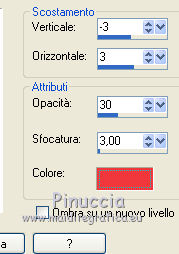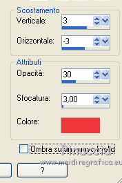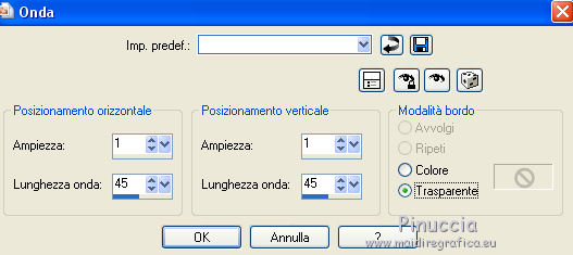 qui puoi trovare qualche risposta ai tuoi dubbi. Se l'argomento che ti interessa non è presente, ti prego di segnalarmelo. Questo tutorial è una creazione di ©Titoune e non può essere copiato su altri siti nè essere offerto per il download. Lo stesso vale per la mia traduzione. Il tutorial è stato creato con PSP X5, ma può essere eseguito anche con le altre versioni di PSP. Secondo la versione utilizzata (anteriore a PSP X) potresti ottenere dei risultati differenti. Vedi la mia scheda riguardante le funzioni Rifletti>Capovolgi in X4 e X5 qui Per tradure il tutorial ho usato PSP X. Occorrente: Un tube a scelta. Il resto del materiale qui Il tube è di Tchounette ![]() 1. Imposta il colore di primo piano con il colore nero. Apri una nuova immagine trasparente 750 x 600 pixels, e riempila con il colore nero.Selezione>Seleziona tutto. Selezione>Modifica>Contrai - 35 pixels. 2. Livelli>Nuovo livello raster. Apri l'elemento Paper4 e vai a Modifica>Copia. Torna al tuo lavoro e vai a Modifica>Incolla nella selezione. 3. Attiva il livello Raster 1. Selezione>Innalza selezione a livello. Livelli>Disponi>Sposta su. Abbassa l'opacità di questo livello al 48%. Selezione>Inverti. 4. Attiva il livello inferiore. Selezione>Innalza selezione a livello. 5. Livelli>Nuovo livello raster. Apri l'elemento Paper 2 e vai a Modifica>Copia. Torna al tuo lavoro e vai a Modifica>Incolla nella selezione. 6. Regola>Tonalità e saturazione>Viraggio. ![]() 7. Effetti>Effetti 3D>Smusso a incasso. ![]() 8. Effetti>Effetti di distorsione>Onda. ![]() Selezione>Deseleziona. Livelli>Disponi>Porta in alto. Effetti>Effetti di bordo>Aumenta. 9. Apri l'elemento "Element6" e vai a Modifica>Copia. Torna al tuo lavoro e vai a Modifica>Incolla come nuovo livello. Spostalo a sinistra.Vedi l'esempio finale. 10. Effetti>Effetti 3D>Sfalsa ombra, colore #f0383c. ![]() Ripeti l'Effetto Sfalsa ombra, cambiando verticale e orizzontale con -3/3. ![]() 11. Apri l'elemento "Element36" e vai a Modifica>Copia. Torna al tuo lavoro e vai a Modifica>Incolla come nuovo livello. Spostalo in alto a destra.Vedi l'esempio finale. Effetti>Effetti 3D>Sfalsa ombra, con i settaggi precedenti. 12. Apri l'elemento "Element4" e vai a Modifica>Copia. Torna al tuo lavoro e vai a Modifica>Incolla come nuovo livello. Sposta anche questo elemento in alto a destra.![]() Effetti>Effetti 3D>Sfalsa ombra, con i settaggi precedenti. 13. Apri l'elemento "Element5" e vai a Modifica>Copia. Torna al tuo lavoro e vai a Modifica>Incolla come nuovo livello. Spostalo in alto a destra.Vedi l'esempio finale. Effetti>Effetti 3D>Sfalsa ombra, con i settaggi precedenti. 14. Apri l'elemento "Element8" e vai a Modifica>Copia. Torna al tuo lavoro e vai a Modifica>Incolla come nuovo livello. Spostalo in alto a sinistra.![]() Effetti>Effetti 3D>Sfalsa ombra, con i settaggi precedenti. 15. Apri l'elemento "Element1" e vai a Modifica>Copia. Torna al tuo lavoro e vai a Modifica>Incolla come nuovo livello. Spostalo sotto l'elemento precedente.![]() Effetti>Effetti 3D>Sfalsa ombra, con i settaggi precedenti. 16. Apri l'elemento "Element21" e vai a Modifica>Copia. Torna al tuo lavoro e vai a Modifica>Incolla come nuovo livello. Spostalo in basso a sinistra.Vedi l'esempio finale. Effetti>Effetti 3D>Sfalsa ombra, con i settaggi precedenti. 17. Apri l'elemento "Element35" e vai a Modifica>Copia. Torna al tuo lavoro e vai a Modifica>Incolla come nuovo livello. Sposta anche questo elemento in basso a sinistra.![]() Effetti>Effetti 3D>Sfalsa ombra, con i settaggi precedenti. 18. Apri l'elemento "Element39" e vai a Modifica>Copia. Torna al tuo lavoro e vai a Modifica>Incolla come nuovo livello. Spostalo sopra i pacchetti.![]() Effetti>Effetti 3D>Sfalsa ombra, con i settaggi precedenti. 19. Apri l'elemento "Element18" e vai a Modifica>Copia. Torna al tuo lavoro e vai a Modifica>Incolla come nuovo livello. Spostalo in basso a destra.Vedi l'esempio finale. Effetti>Effetti 3D>Sfalsa ombra, con i settaggi precedenti. 20. Apri l'elemento "Element45" e vai a Modifica>Copia. Torna al tuo lavoro e vai a Modifica>Incolla come nuovo livello. Spostalo nell'angolo in basso a destra.![]() Effetti>Effetti 3D>Sfalsa ombra, con i settaggi precedenti. 21. Apri l'elemento "Element20" e vai a Modifica>Copia. Torna al tuo lavoro e vai a Modifica>Incolla come nuovo livello. Spostalo in basso al centro.Porta questo livello sotto il livello dei pacchetti. ![]() Effetti>Effetti 3D>Sfalsa ombra, con i settaggi precedenti. 23. Apri il tuo tube e vai a Modifica>Copia. Torna al tuo lavoro e vai a Modifica>Incolla come nuovo livello. Immagine>Ridimensiona, se e quanto necessario, tutti i livelli non selezionato. Spostalo dove preferisci,o vedi il mio esempio. Effetti>Effetti 3D>Sfalsa ombra, con i settaggi precedenti. 24. Firma il tuo lavoro. Livelli>Unisci>Unisci tutto e salva in formato jpg. ![]() Se hai problemi o dubbi, o trovi un link non funzionante, scrivimi. 31 Dicembre 2013 |