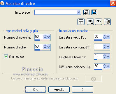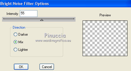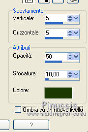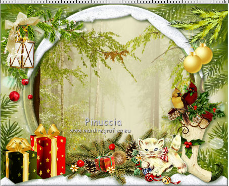 qui puoi trovare qualche risposta ai tuoi dubbi. Se l'argomento che ti interessa non è presente, ti prego di segnalarmelo. Questo tutorial è una creazione di ©Titoune e non può essere copiato su altri siti nè essere offerto per il download. Lo stesso vale per la mia traduzione. Il tutorial è stato creato con PSP X5, ma può essere eseguito anche con le altre versioni di PSP. Secondo la versione utilizzata (anteriore a PSP X) potresti ottenere dei risultati differenti. Dalla versione X4, il comando Immagine>Rifletti è stato sostituito con Immagine>Capovolgi in orizzontale, e il comando Immagine>Capovolgi con Immagine>Capovolgi in verticale. Nelle versioni X5 e X6, le funzioni sono state migliorate rendendo disponibile il menu Oggetti. Con il nuovo X7 sono tornati i comandi Rifletti/Capovolgi, ma con nuove differenze. Vedi la scheda sull'argomento qui Per tradure il tutorial ho usato PSP X. Occorrente: Un tube a scelta. Il resto del materiale qui Il tube utilizzato è di Chouchou86 Filtri in caso di dubbi, ricorda di consultare la mia sezione filtri qui Penta.com - Jeans qui DSB Flux - Bright Noise qui Xero - Improver qui Animation Shop qui ![]() Metti la selezione nella cartella Selezioni. 1. Apri una nuova immagine trasparente 750 x 600 pixels. Selezione>Seleziona tutto. 2. Apri l'immagine 6a1f6fc2, e vai a Modifica>Copia. Torna al tuo lavoro e vai a Modifica>Incolla nella selezione. Selezione>Deseleziona. 3. Regola>Sfocatura>Sfocatura gaussiana - raggio 25. ![]() 4. Selezione>Carica/Salva selezione>Carica selezione da disco. Cerca e carica la selezione "selection_tag_wishes of the year". ![]() Livelli>Nuovo livello raster. Modifica>Incolla nella selezione (l'immagine è ancora in memoria). Selezione>Inverti. 5. Attiva il livello inferiore. Selezione>Modifica>Seleziona bordature selezione. ![]() Selezione>Innalza selezione a livello. Livelli>Disponi>Porta in alto. 6. Effetti>Effetti di trama>Plastica morbida. ![]() 7. Effetti>Effetti 3D>Smusso a incasso. ![]() Selezione>Deseleziona. Livelli>Duplica. Cambia la modalità di miscelatura di questo livello in Moltiplica. Livelli>Unisci>Unisci giù. 8. Attiva lo strumento Bacchetta magica ![]() e clicca al centro della cornice per selezionarla. Selezione>Modifica>Espandi - 5 pixels. 9. Livelli>Nuovo livello raster. Livelli>Disponi>Sposta giù. Apri l'immagine "hiver", e vai a Modifica>Copia. Torna al tuo lavoro e vai a Modifica>Incolla nella selezione. Selezione>Deseleziona. 10. Attiva il livello della cornice. Effetti>Effetti 3D>Sfalsa ombra, colore #1d3a02. ![]() Ripeti l'Effetto Sfalsa ombra, cambiando verticale e orizzontale con -5. 11. Apri l'elemento "snow", e vai a Modifica>Copia. Torna al tuo lavoro e vai a Modifica>Incolla come nuovo livello. Effetti>Effetti 3D>Sfalsa ombra, con i settaggi precedenti. 12. Apri l'elemento f45380d4 (lanterna), e vai a Modifica>Copia. Torna al tuo lavoro e vai a Modifica>Incolla come nuovo livello. Spostalo in alto a sinistra.Vedi l'esempio finale. Livelli>Duplica. Cambia la modalità di miscelatura di questo livello in Luce diffusa. 13. Attiva il livello sottostante dell'originale. Effetti>Plugins>Xero - Improver. ![]() 14. Effetti>Effetti 3D>Sfalsa ombra, colore #1d3a02. ![]() 15. Apri l'elemento f45380d4 (palline gialle), e vai a Modifica>Copia. Torna al tuo lavoro e vai a Modifica>Incolla come nuovo livello. Spostalo in alto a destra.Vedi l'esempio finale. Livelli>Duplica. Cambia la modalità di miscelatura di questo livello in Luce diffusa. Attiva il livello sottostante dell'originale, con i settaggi precedenti. Effetti>Effetti 3D>Sfalsa ombra, con i settaggi precedenti. 16. Apri l'elemento e93e85d5 (il fascio con gli uccelli), e vai a Modifica>Copia. Torna al tuo lavoro e vai a Modifica>Incolla come nuovo livello. Spostalo in basso a destra.![]() Livelli>Duplica. Cambia la modalità di miscelatura di questo livello in Luce diffusa. Attiva il livello sottostante dell'originale, con i settaggi precedenti. Effetti>Effetti 3D>Sfalsa ombra, con i settaggi precedenti. 17. Apri l'elemento 0_a5552_140f053c_XL (ramo_deco), e vai a Modifica>Copia. Torna al tuo lavoro e vai a Modifica>Incolla come nuovo livello. Immagine>Rifletti. Spostalo nella parte inferiore.Vedi l'esempio finale. Livelli>Duplica. Cambia la modalità di miscelatura di questo livello in Luce diffusa. Attiva il livello sottostante dell'originale, con i settaggi precedenti. Effetti>Effetti 3D>Sfalsa ombra, con i settaggi precedenti. 18. Apri l'elemento 402edc14 (pacchetti), e vai a Modifica>Copia. Torna al tuo lavoro e vai a Modifica>Incolla come nuovo livello. Spostalo in basso a sinistra.Vedi l'esempio finale. Livelli>Duplica. Cambia la modalità di miscelatura di questo livello in Luce diffusa. Attiva il livello sottostante dell'originale, con i settaggi precedenti. Effetti>Effetti 3D>Sfalsa ombra, con i settaggi precedenti. 19. Apri il tube Chaton_121_dedinelle, e vai a Modifica>Copia. Torna al tuo lavoro e vai a Modifica>Incolla come nuovo livello. Spostalo in basso a destra.![]() Livelli>Duplica. Cambia la modalità di miscelatura di questo livello in Luce diffusa. Attiva il livello sottostante dell'originale, con i settaggi precedenti. Effetti>Effetti 3D>Sfalsa ombra, con i settaggi precedenti. 20. Apri il tuo tube, e vai a Modifica>Copia. Torna al tuo lavoro e vai a Modifica>Incolla come nuovo livello. Immagine>Ridimensiona, se e quanto necessario, tutti i livelli non selezionato. Spostalo dove preferisci o vedi il mio esempio.Livelli>Duplica. Cambia la modalità di miscelatura di questo livello in Luce diffusa. Attiva il livello sottostante dell'originale, con i settaggi precedenti. Effetti>Effetti 3D>Sfalsa ombra, con i settaggi precedenti. 21. Assicurati di essere posizionato sul livello superiore. Livelli>Nuovo livello raster. Selezione>Seleziona tutto. 22. Apri l'immagine 6a1f6fc2, e vai a Modifica>Copia. Torna al tuo lavoro e vai a Modifica>Incolla nella selezione. Selezione>Modifica>Contrai - 3 pixels. Premi sulla tastie