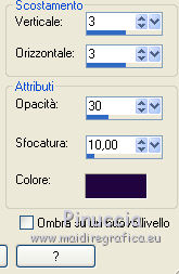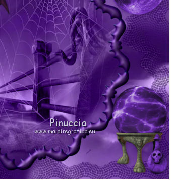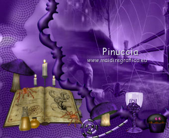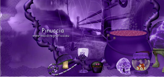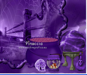 qui puoi trovare qualche risposta ai tuoi dubbi. Se l'argomento che ti interessa non è presente, ti prego di segnalarmelo. Questo tutorial è una creazione di ©Titoune e non può essere copiato su altri siti nè essere offerto per il download. Lo stesso vale per la mia traduzione. Il tutorial è stato creato con PSP X5, ma può essere eseguito anche con le altre versioni di PSP. Secondo la versione utilizzata (anteriore a PSP X) potresti ottenere dei risultati differenti. Vedi la mia scheda riguardante le funzioni Rifletti>Capovolgi in X4 e X5 qui Per tradure il tutorial ho usato PSP X. Occorrente: Un tube a scelta. Il resto del materiale qui Filtri in caso di dubbi, ricorda di consultare la mia sezione filtri qui Penta.com - Jeans qui ![]() 1. Al momento della creazione di questo tutorial, gli elementi forniti sono stati colorizzati. Se vuoi usare e colorizzare altri elementi: Regola>Tonalità e Saturazione>Viraggio. ![]() 2. Apri una nuova immagine trasparente 750 x 600 pixels. Selezione>Seleziona tutto. 3. Apri l'elemento DCD_WiHo_Paper06 e vai a Modifica>Copia. Torna al tuo lavoro e vai a Modifica>Incolla nella selezione. 4. Livelli>Nuovo livello raster. Apri il tube 4361 e vai a Modifica>Copia. Torna al tuo lavoro e vai a Modifica>Incolla nella selezione. Selezione>Deseleziona. Immagine>Capovolgi. 5. Effetti>Effetti di immagine>Motivo unico, con i settaggi standard. ![]() Cambia la modalità di miscelatura di questo livello in Luminanza (esistente). 6. Apri l'elemento witching_mosaique e vai a Modifica>Copia. Torna al tuo lavoro e vai a Modifica>Incolla come nuovo livello. 7. Effetti>Effetti 3D>Sfalsa ombra, colore #220440. ![]() Cambia la modalità di miscelatura di questo livello in Luminanza (esistente). 8. Apri l'elemento DCD_WiHo_Frame01 e vai a Modifica>Copia. Torna al tuo lavoro e vai a Modifica>Incolla come nuovo livello. Attiva lo strumento Bacchetta magica ![]() e clicca al centro della cornice per selezionarla. Selezione>Modifica>Espandi - 5 pixels. Livelli>Nuovo livello raster. Livelli>Disponi>Sposta giù. Apri l'immagine fornita (Halloweenmisto16) e vai a Modifica>Copia. Torna al tuo lavoro e vai a Modifica>Incolla nella selezione. Selezione>Deseleziona. Cambia la modalità di miscelatura di questo livello in Luminanza (esistente). Attiva il livello della cornice. Effetti>Effetti 3D>Sfalsa ombra, con i settaggi precedenti. 9. Apri l'elemento DCD_WiHo_Eyeball Beads e vai a Modifica>Copia. Torna al tuo lavoro e vai a Modifica>Incolla come nuovo livello. Spostalo nella parte superiore.Vedi l'esempio finale. Effetti>Effetti 3D>Sfalsa ombra, con i settaggi precedenti. 10. Apri l'elemento DCD_WiHo_Full Moon e vai a Modifica>Copia. Torna al tuo lavoro e vai a Modifica>Incolla come nuovo livello. Spostalo in alto a destra.![]() Effetti>Effetti 3D>Sfalsa ombra, con i settaggi precedenti. 11. Apri l'elemento DCD_WiHo_Brad01 e vai a Modifica>Copia. Torna al tuo lavoro e vai a Modifica>Incolla come nuovo livello. Spostalo in alto a destra.Vedi l'esempio finale. Effetti>Effetti 3D>Sfalsa ombra, con i settaggi precedenti. 12. Apri l'elemento DCD_WiHo_Crazed Bat02 e vai a Modifica>Copia. Torna al tuo lavoro e vai a Modifica>Incolla come nuovo livello. Spostalo nella cornice.![]() Effetti>Effetti 3D>Sfalsa ombra, con i settaggi precedenti. 13. Apri l'elemento DCD_WiHo_Crystal Ball e vai a Modifica>Copia. Torna al tuo lavoro e vai a Modifica>Incolla come nuovo livello. Spostalo in basso a destra.Vedi l'esempio finale. Effetti>Effetti 3D>Sfalsa ombra, con i settaggi precedenti. 14. Apri l'elemento DCD_WiHo_Potion Bottle e vai a Modifica>Copia. Torna al tuo lavoro e vai a Modifica>Incolla come nuovo livello. Spostalo davanti all'elemento precedente.![]() Effetti>Effetti 3D>Sfalsa ombra, con i settaggi precedenti. 15. Apri l'elemento DCD_WiHo_Cauldron01 e vai a Modifica>Copia. Torna al tuo lavoro e vai a Modifica>Incolla come nuovo livello. Spostalo in basso.Vedi l'esempio finale. Effetti>Effetti 3D>Sfalsa ombra, con i settaggi precedenti. 16. Apri l'elemento DCD_WiHo_Eye Candy e vai a Modifica>Copia. Torna al tuo lavoro e vai a Modifica>Incolla come nuovo livello. Spostalo in basso, davanti al calderone.Vedi l'esempio finale. Effetti>Effetti 3D>Sfalsa ombra, con i settaggi precedenti. 17. Apri l'elemento DCD_WiHo_Tattoo Skull e vai a Modifica>Copia. Torna al tuo lavoro e vai a Modifica>Incolla come nuovo livello. Sposta anche questo elemento davanti al calderone.![]() Effetti>Effetti 3D>Sfalsa ombra, con i settaggi precedenti. 18. Apri l'elemento DCD_WiHo_Halloween Cake01 e vai a Modifica>Copia. Torna al tuo lavoro e vai a Modifica>Incolla come nuovo livello. Spostalo in basso.Vedi l'esempio finale. Effetti>Effetti 3D>Sfalsa ombra, con i settaggi precedenti. 19. Apri l'elemento DCD_WiHo_Goblet e vai a Modifica>Copia. Torna al tuo lavoro e vai a Modifica>Incolla come nuovo livello. Sposta anche questo elemento nella parte inferiore.Vedi l'esempio finale. Effetti>Effetti 3D>Sfalsa ombra, con i settaggi precedenti. 20. Apri l'elemento DCD_WiHo_Mushroom01 e vai a Modifica>Copia. Torna al tuo lavoro e vai a Modifica>Incolla come nuovo livello. Spostalo in basso.Vedi l'esempio finale. Effetti>Effetti 3D>Sfalsa ombra, con i settaggi precedenti. 21. Apri l'elemento DCD_WiHo_Candied Rat Tail02 e vai a Modifica>Copia. Torna al tuo lavoro e vai a Modifica>Incolla come nuovo livello. Spostalo in basso.![]() Effetti>Effetti 3D>Sfalsa ombra, con i settaggi precedenti. 22. Apri l'elemento DCD_WiHo_Mushroom03 e vai a Modifica>Copia. Torna al tuo lavoro e vai a Modifica>Incolla come nuovo livello. Spostalo in basso a sinistra.Vedi l'esempio finale. Effetti>Effetti 3D>Sfalsa ombra, con i settaggi precedenti. 23. Apri l'elemento DCD_WiHo_Spell Book03 e vai a Modifica>Copia. Torna al tuo lavoro e vai a Modifica>Incolla come nuovo livello. Spostalo in basso a sinistra.![]() Effetti>Effetti 3D>Sfalsa ombra, con i settaggi precedenti. 24. Apri l'elemento DCD_WiHo_Flower02 e vai a Modifica>Copia. Torna al tuo 