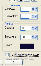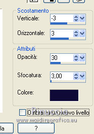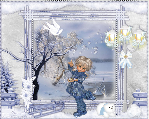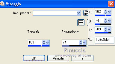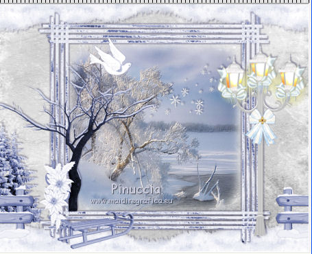 qui puoi trovare qualche risposta ai tuoi dubbi. Se l'argomento che ti interessa non è presente, ti prego di segnalarmelo. Per tradurre questo tutorial ho usato PSP X. Questo tutorial è una creazione di ©Titoune e non può essere copiato su altri siti nè essere offerto per il download. Lo stesso vale per la mia traduzione. Per tradurlo, ho usato PSP X, ma può essere eseguito anche con le altre versioni di PSP. Grazie ai creatori dei tubes che mettono a disposizione il loro lavoro in vari gruppi di condivisione. Rispetta il lavoro degli autori, non cambiare il nome del file e non cancellare il watermark. Occorrente: Un tube a scelta. Il resto del materiale qui Il tube utilizzato è di Leilana. Il tube del paesaggio è condivisi sul sito Zezette2. Filtri: FM Tile Tools - Blend Emboss qui Simple - Left Righ Wrap (bonus) qui Animation Shop qui ![]() Se stai usando le nuove versioni X14 X15 e X16 le funzioni Immagine>Rifletti/Capovolgi hanno cambiato denominazione e comportamento. Vedi la mia scheda sull'argomento qui 1. Imposta il colore di primo piano con un colore scelto dal tuo tube. Prendi nota dei valori di tonalità (H) e saturazione (S) del tuo colore, che ti serviranno per colorizzare gl elementi dello scrap. Per l'esempio #c3c8de. 2. Apri una nuova immagine trasparente 750 x 600 pixels. Selezione>Seleziona tutto. 3. Apri l'elemento Paper1 e vai a Modifica>Copia. Torna al tuo lavoro e vai a Modifica>Incolla nella selezione. Selezione>Deseleziona. Regola>Tonalità e Saturazione>Viraggio, trascrivi i valori annotati del tuo colore di primo piano. ![]() 4. Apri l'elemento frame3 e vai a Modifica>Copia. Torna al tuo lavoro e vai a Modifica>Incolla come nuovo livello. 5. Immagine>Ridimensiona, al 115%, tutti i livelli non selezionarlo. Non spostare la cornice. Regola>Tonalità e saturazione>Viraggio, con i settaggi precedenti. 6. Attiva lo strumento Selezione , rettangolo,e traccia un rettangolo intorno alla cornice. ![]() Selezione>Modifica>Contrai - 25 pixels. Selezione>Modifica>Sfuma - 30 pixels. 7. Livelli>Nuovo livello raster. Livelli>Disponi>Sposta giù. 8. Apri il tube del paesaggio cde2be0e e vai a Modifica>Copia. Torna al tuo lavoro e vai a Modifica>Incolla nella selezione. Selezione>Deseleziona. Livelli>Duplica. 9. Effetti>Plugins>FM Tile Tools - Blend Emboss, con i settaggi standard. ![]() 10. Attiva il livello della cornice. Effetti>Effetti 3D>Sfalsa ombra, colore #110b39. ![]() Ripeti l'Effetto Sfalsa ombra, cambiando verticale e orizzontale con -3. Rinomina questo livello "animazione". 11. Apri l'elemento elem15 e vai a Modifica>Copia. Torna al tuo lavoro e vai a Modifica>Incolla come nuovo livello. Spostalo nella parte superiore del paesaggio.![]() 12. Effetti>Effetti 3D>Sfalsa ombra, colore 110b39. ![]() 13. Attiva il livello Raster 1. Apri l'elemento elem10 e vai a Modifica>Copia. Torna al tuo lavoro e vai a Modifica>Incolla come nuovo livello. Spostalo in basso .Effetti>Effetti 3D>Sfalsa ombra, con i settaggi precedenti. 14. Livelli>Duplica. Immagine>Capovolgi. Dovresti avere questo. ![]() 15. Apri l'elemento elem31 e vai a Modifica>Copia. Torna al tuo lavoro e vai a Modifica>Incolla come nuovo livello. Regola>Tonalità e saturazione>Viraggio, con i settaggi precedenti. Effetti>Plugins>Simple - Left Right Wrap. Sposta l'elemento in basso.Vedi l'esempio finale. Nella paletta dei livelli porta questo livello sotto quello della cornice. 16. Effetti>Effetti geometrici>Cilindro verticale. ![]() 17. Effetti>Effetti 3D>Sfalsa ombra, colore #110b39. ![]() 18. Apri l'elemento elem8 e vai a Modifica>Copia. Torna al tuo lavoro e vai a Modifica>Incolla come nuovo livello. Regola>Tonalità e saturazione>Viraggio, con i settaggi precedenti. Spostalo a sinistra.![]() Effetti>Effetti 3D>Sfalsa ombra, colore #110b39. ![]() 19. Apri l'elemento elem3 e vai a Modifica>Copia. Torna al tuo lavoro e vai a Modifica>Incolla come nuovo livello. Regola>Tonalità e saturazione>Viraggio, con i settaggi precedenti. Spostalo in basso a sinistra.Porta questo livello sotto il livello della cornice. ![]() Livelli>Duplica. Porta questo livello sopra il livello della cornice. 20. Attiva lo strumento Gomma ![]() e cancella la base del tronco che deborda sulla cornice. ![]() Attiva il livello originale. Effetti>Effetti 3D>Sfalsa ombra, con i settaggi precedenti. 21. Attiva il livello superiore. Apri l'elemento elem32 e vai a Modifica>Copia. Torna al tuo lavoro e vai a Modifica>Incolla come nuovo livello. Regola>Tonalità e saturazione>Viraggio, con i settaggi precedenti. Spostalo in basso a sinistra.![]() Effetti>Effetti 3D>Sfalsa ombra, con i settaggi precedenti. 22. Apri l'elemento elem28 e vai a Modifica>Copia. Torna al tuo lavoro e vai a Modifica>Incolla come nuovo livello. Spostalo in basso a destra.Vedi l'esempio finale. 23. Attiva lo strumento Gomma ![]() e cancella la base del lampione. Effetti>Effetti 3D>Sfalsa ombra, con i settaggi precedenti. 24. Apri l'elemento elem36 e vai a Modifica>Copia. Torna al tuo lavoro e vai a Modifica>Incolla come nuovo livello. Spostalo sulla parte superiore del lampione.![]() 25. Effetti>Effetti 3D>Sfalsa ombra, colore #110b39. ![]() 26. Apri l'elemento el39 e vai a Modifica>Copia. Torna al tuo lavoro e vai a Modifica>Incolla come nuovo livello. Spostalo in alto.Vedi l'esempio finale. Effetti>Effetti 3D>Sfalsa ombra, colore #110b39. 27. Apri l'elemento elem33 e vai a Modifica>Copia. Torna al tuo lavoro e vai a Modifica>Incolla come nuovo livello. Regola>Tonalità e saturazione>Viraggio, con i settaggi precedenti. Spostalo in basso.![]() 28. Effetti>Effetti 3D>Sfalsa ombra, colore #110b39. ![]() Ripeti l'Effetto Sfalsa ombra, cambiando verticale e orizzontale con -3. 29. Apri l'elemento elem2 e vai a Modifica>Copia. Torna al tuo lavoro e vai a Modifica>Incolla come nuovo livello. Spostalo in basso a destra.Vedi l'esempio finale. 30. Effetti>Effetti 3D>Sfalsa ombra, colore #110b39. ![]() 31. Apri l'elemento elem12 e vai a Modifica>Copia. Torna al tuo lavoro e vai a