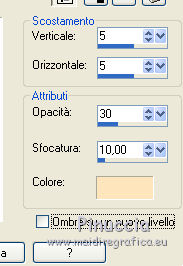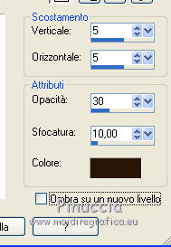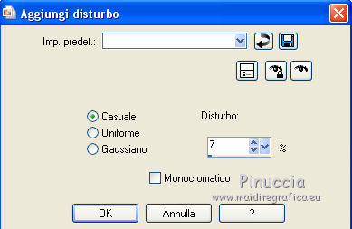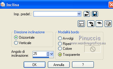 qui puoi trovare qualche risposta ai tuoi dubbi. Se l'argomento che ti interessa non è presente, ti prego di segnalarmelo. Questo tutorial è una creazione di ©Titoune e non può essere copiato su altri siti nè essere offerto per il download. Lo stesso vale per la mia traduzione. Il tutorial è stato creato con PSP X5, ma può essere eseguito anche con le altre versioni di PSP. Secondo la versione utilizzata (anteriore a PSP X) potresti ottenere dei risultati differenti. Vedi la mia scheda riguardante le funzioni Rifletti>Capovolgi in X4 e X5 qui Per tradure il tutorial ho usato PSP X. Occorrente: Un tube a scelta. Il resto del materiale qui Tube utilizzato 1Patries_tiny gift from the hart_2-12-08, di Patries. Filtri in caso di dubbi, ricorda di consultare la mia sezione filtri qui Penta.com - Jeans qui Filters Unlimited 2.0 qui I filtri Penta.com si possono usare da soli o importati in Filters Unlimited (come fare vedi qui) Se un filtro fornito appare con questa icona Animation Shop qui ![]() 1. Apri una nuova immagine trasparente 750 x 600 pixels. Apri l'elemento DBV Xmas Memories frame 2 e vai a Modifica>Copia. Torna al tuo lavoro e vai a Modifica>Incolla come nuovo livello. Non spostarlo. 2. Attiva lo strumento Bacchetta magica ![]() e clicca al centro della cornice per selezionarla. ![]() Livelli>Nuovo livello raster. Livelli>Disponi>Sposta giù. Apri l'immagine 70-new-beautiful-christmas-for-your-desktop-part-04 e vai a Modifica>Copia. Torna al tuo lavoro e vai a Modifica>Incolla nella selezione. Rinomina questo livello "decoro". Selezione>Inverti. 3. Attiva il livello Raster 1. Modifica>Incolla nella selezione (l'immagine è ancora in memoria). Selezione>Deseleziona. 4. Regola>Sfocatura>Sfocatura gaussiana - raggio 35. ![]() Livelli>Duplica. 5. Effetti>Effetti geometrici>Inclina. ![]() Effetti>Effetti di bordo>Aumenta. 6. Effetti>Effetti geometrici>Prospettiva verticale. ![]() Modifica>Ripeti Prospettiva verticale. 7. Effetti>Effetti di riflesso>Specchio rotante. ![]() 8. Attiva il livello inferiore. Regola>Aggiungi/Rimuovi disturbo>Aggiungi disturbo. ![]() 9. Attiva nuovamente il livello immediatamente sopra. Effetti>Effetti 3D>Sfalsa ombra, colore #fee5bc. ![]() 10. Attiva il livello della cornice. Effetti>Effetti 3D>Smusso a incasso. ![]() 11. Effetti>Effetti 3D>Sfalsa ombra, colore #291709. ![]() 12. Apri l'elemento "snow" e vai a Modifica>Copia. Torna al tuo lavoro e vai a Modifica>Incolla come nuovo livello. Spostalo in basso, sul bordo.Vedi l'esempio finale. Porta questo livello sotto il livello "decoro". 13. Attiva nuovamente il livello superiore. Apri il tube 13508436269_noel_nikita e vai a Modifica>Copia. Torna al tuo lavoro e vai a Modifica>Incolla come nuovo livello. Elimina la firma. 14. Immagine>Ridimensiona, al 60%, tutti i livelli non selezionato. Sposta il tube in basso a destra.Vedi l'esempio finale. Effetti>Effetti 3D>Sfalsa ombra, con i settaggi precedenti. 15. Apri l'elemento 0_b3c60_2c981718_XL e vai a Modifica>Copia. Torna al tuo lavoro e vai a Modifica>Incolla come nuovo livello. Spostalo ai piedi dell'albero.Vedi l'esempio finale. Effetti>Effetti 3D>Sfalsa ombra, con i settaggi precedenti. 16. Apri l'elemento DBV Xmas Memories Ornament 6 e vai a Modifica>Copia. Torna al tuo lavoro e vai a Modifica>Incolla come nuovo livello. Spostalo in alto a destra.Vedi l'esempio finale. Effetti>Effetti 3D>Sfalsa ombra, con i settaggi precedenti. 17. Apri l'elemento CM_Christmas_2012_Merry_Christmas_Banner_04 e vai a Modifica>Copia. Torna al tuo lavoro e vai a Modifica>Incolla come nuovo livello. Spostalo in alto.![]() Effetti>Effetti 3D>Sfalsa ombra, con i settaggi precedenti. 18. Apri l'elemento DBV Xmas Memories Ornament 5 e vai a Modifica>Copia. Torna al tuo lavoro e vai a Modifica>Incolla come nuovo livello. Spostalo in alto a destra.Vedi l'esempio finale. Effetti>Effetti 3D>Sfalsa ombra, con i settaggi precedenti. 19. Apri l'elemento DBV Xmas Memories Holly 2 e vai a Modifica>Copia. Torna al tuo lavoro e vai a Modifica>Incolla come nuovo livello. Spostalo sul bordo della cornice, in alto a sinistra.![]() Effetti>Effetti 3D>Sfalsa ombra, con i settaggi precedenti. 20. Apri l'elemento DBV Xmas Memories bulb 1 e vai a Modifica>Copia. Torna al tuo lavoro e vai a Modifica>Incolla come nuovo livello. Spostalo sulla cornice a sinistra, sotto l'elemento precedente.Vedi l'esempio finale. Effetti>Effetti 3D>Sfalsa ombra, con i settaggi precedenti. 21. Apri l'elemento Christmas Lantern e vai a Modifica>Copia. Torna al tuo lavoro e vai a Modifica>Incolla come nuovo livello. Spostalo sulla cornice, sotto l'elemento precedente.Vedi l'esempio finale. Effetti>Effetti 3D>Sfalsa ombra, con i settaggi precedenti. 22. Apri l'elemento DBV Xmas Memories Bulb strand e vai a Modifica>Copia. Torna al tuo lavoro e vai a Modifica>Incolla come nuovo livello. Spostalo in basso a sinistra.Vedi l'esempio finale. Effetti>Effetti 3D>Sfalsa ombra, con i settaggi precedenti. 23. Apri l'elemento sc-goldstars e vai a Modifica>Copia. Torna al tuo lavoro e vai a Modifica>Incolla come nuovo livello. Spostalo in basso a sinistra.Vedi l'esempio finale. Effetti>Effetti 3D>Sfalsa ombra, con i settaggi precedenti. Livelli>Duplica. Immagine>Rifletti. 24. Apri il tuo tube e vai a Modifica>Copia. Torna al tuo lavoro e vai a Modifica>Incolla come nuovo livello. Immagine>Ridimensiona, se e quanto necessario, tutti i livelli non selezionato. Spostalo dove preferisci,o vedi il mio esempio. Effetti>Effetti 3D>Sfalsa ombra, con i settaggi precedenti. 25. Attiva il livello inferiore. Selezione>Seleziona tutto. Selezione>Modifica>Contrai - 3 pixels. Selezione>Inverti. Selezione>Innalza selezione a livello. Livelli>Disponi>Porta in alto. Effetti>Plugins>Penta.com - Jeans, con i settaggi standard. ![]() Effetti>Effetti di bordo>Aumenta. Effetti>Effetti 3D>Sfalsa ombra, con i settaggi precedenti. 26. Attiva nuovamente il livello Raster 1. Modifica>Copia. Selezione>Seleziona tutto. Immagine>Ritaglia la selezione. 27. Imm
