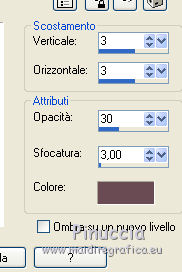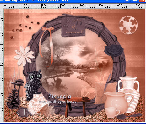 qui puoi trovare qualche risposta ai tuoi dubbi. Se l'argomento che ti interessa non è presente, ti prego di segnalarmelo. Questo tutorial è una creazione di ©Titoune e non può essere copiato su altri siti nè essere offerto per il download. Lo stesso vale per la mia traduzione. Il tutorial è stato creato con Corel17, ma può essere eseguito anche con le altre versioni di PSP. Secondo la versione utilizzata (anteriore a PSP X) potresti ottenere dei risultati differenti. Dalla versione X4, il comando Immagine>Rifletti è stato sostituito con Immagine>Capovolgi in orizzontale, e il comando Immagine>Capovolgi con Immagine>Capovolgi in verticale. Nelle versioni X5 e X6, le funzioni sono state migliorate rendendo disponibile il menu Oggetti. Con il nuovo X7 sono tornati i comandi Rifletti/Capovolgi, ma con nuove differenze. Vedi la scheda sull'argomento qui Per tradurre il tutorial ho usato PSP X. Occorrente: Un tube a scelta. Il resto del materiale qui ![]() 1. Apri una nuova immagine trasparente 750 x 600 pixels. Selezione>Seleziona tutto. 2. Apri l'elemento Paper1 e vai a Modifica>Copia. Torna al tuo lavoro e vai a Modifica>Incolla nella selezione. Selezione>Deseleziona. 3. Apri l'elemento ground e vai a Modifica>Copia. Torna al tuo lavoro e vai a Modifica>Incolla come nuovo livello. Spostalo nella parte inferiore.Vedi l'esempio finale. 4. Apri l'elemento Frame4 e vai a Modifica>Copia. Torna al tuo lavoro e vai a Modifica>Incolla come nuovo livello. Non spostarlo. 5. Attiva lo strumento Bacchetta magica e clicca al centro della cornice. per selezionarla. Selezione>Modifica>Espandi - 3 pixels. 6. Livelli>Nuovo livello raster. Livelli>Disponi>Sposta giù. 7. Apri l'elemento Tag e vai a Modifica>Copia. Torna al tuo lavoro e vai a Modifica>Incolla nella selezione. Selezione>Deseleziona. 8. Apri il tube SC~MistedFallScene06~09-25-13 e vai a Modifica>Copia. Torna al tuo lavoro e vai a Modifica>Incolla come nuovo livello. Non spostarlo. Cambia la modalità di miscelatura di questo livello in Luminanza (esistente), e abbassa l'opacità al 65%. alla fine, ho preferito modalità Normale, opacità 100 9. Attiva il livello della cornice. Effetti>Effetti 3D>Sfalsa ombra, colore #6a4a53. ![]() Ripeti l'Effetto Sfalsa ombra, cambiando verticale e orizzontale con -3. 10. Apri l'elemento Branch e vai a Modifica>Copia. Torna al tuo lavoro e vai a Modifica>Incolla come nuovo livello. Spostalo nella parte inferiore della cornice.Vedi l'esempio finale. Effetti>Effetti 3D>Sfalsa ombra, colore #6a4a53. ![]() 111. Apri l'elemento Leaf2 e vai a Modifica>Copia. Torna al tuo lavoro e vai a Modifica>Incolla come nuovo livello. Spostalo nella parte inferiore della cornice.Vedi l'esempio finale. Effetti>Effetti 3D>Sfalsa ombra, con i settaggi precedenti. 12. Apri l'elemento Pillow e vai a Modifica>Copia. Torna al tuo lavoro e vai a Modifica>Incolla come nuovo livello. Spostalo nella parte inferiore destra della cornice.Vedi l'esempio finale. Effetti>Effetti 3D>Sfalsa ombra, con i settaggi precedenti. 13. Apri l'elemento Weeds e vai a Modifica>Copia. Torna al tuo lavoro e vai a Modifica>Incolla come nuovo livello. Spostalo nella parte inferiore destra della cornice.Vedi l'esempio finale. Effetti>Effetti 3D>Sfalsa ombra, con i settaggi precedenti. 14. Apri l'elemento Vase e vai a Modifica>Copia. Torna al tuo lavoro e vai a Modifica>Incolla come nuovo livello. Spostalo nella parte inferiore destra della cornice.Vedi l'esempio finale. Effetti>Effetti 3D>Sfalsa ombra, con i settaggi precedenti. 15. Apri l'elemento Creamer e vai a Modifica>Copia. Torna al tuo lavoro e vai a Modifica>Incolla come nuovo livello. Spostalo nella parte inferiore destra della cornice.Vedi l'esempio finale. Effetti>Effetti 3D>Sfalsa ombra, con i settaggi precedenti. 16. Apri l'elemento Mug e vai a Modifica>Copia. Torna al tuo lavoro e vai a Modifica>Incolla come nuovo livello. Spostalo nella parte inferiore destra della cornice.Vedi l'esempio finale. Effetti>Effetti 3D>Sfalsa ombra, con i settaggi precedenti. 16. Apri l'elemento Spoon e vai a Modifica>Copia. Torna al tuo lavoro e vai a Modifica>Incolla come nuovo livello. Spostalo nella parte inferiore destra della cornice.![]() Effetti>Effetti 3D>Sfalsa ombra, con i settaggi precedenti. 17. Apri l'elemento Flower2 e vai a Modifica>Copia. Torna al tuo lavoro e vai a Modifica>Incolla come nuovo livello. Spostalo nella parte superiore destra della cornice.Vedi l'esempio finale. Effetti>Effetti 3D>Sfalsa ombra, con i settaggi precedenti. 18. Apri l'elemento Deco e vai a Modifica>Copia. Torna al tuo lavoro e vai a Modifica>Incolla come nuovo livello. Spostalo nella parte superiore destra della cornice.Vedi l'esempio finale. Effetti>Effetti 3D>Sfalsa ombra, con i settaggi precedenti. 19. Apri l'elemento OldEnvelope e vai a Modifica>Copia. Torna al tuo lavoro e vai a Modifica>Incolla come nuovo livello. Spostalo nella parte superiore della cornice.Vedi l'esempio finale. Effetti>Effetti 3D>Sfalsa ombra, con i settaggi precedenti. 20. Apri gli elementi WA WA2 et WA3 e vai a Modifica>Copia. Torna al tuo lavoro e vai a Modifica>Incolla come nuovo livello. Spostali sulla tabella.![]() Su ciascun livello: Effetti>Effetti 3D>Sfalsa ombra, con i settaggi precedenti. 21. Apri l'elemento Bow e vai a Modifica>Copia. Torna al tuo lavoro e vai a Modifica>Incolla come nuovo livello. Spostalo nella parte superiore sinistra della cornice.Vedi l'esempio finale. 22. Apri l'elemento Scatter e vai a Modifica>Copia. Torna al tuo lavoro e vai a Modifica>Incolla come nuovo livello. Spostalo nella parte superiore sinistra della cornice.Vedi l'esempio finale. Effetti>Effetti 3D>Sfalsa ombra, con i settaggi precedenti. 23. Apri l'elemento Flower1 e vai a Modifica>Copia. Torna al tuo lavoro e vai a Modifica>Incolla come nuovo livello. Spostalo nella parte sinistra della cornice.Vedi l'esempio finale. Effetti>Effetti 3D>Sfalsa ombra, con i settaggi precedenti. 24. Apri l'elemento Grass e vai a Modifica>Copia. Torna al tuo lavo