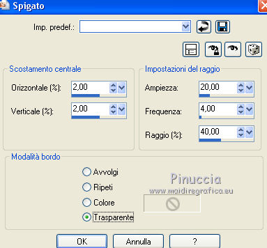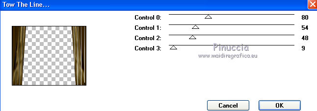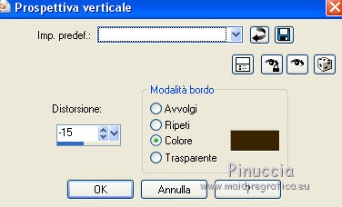 qui puoi trovare qualche risposta ai tuoi dubbi. Se l'argomento che ti interessa non è presente, ti prego di segnalarmelo. Questo tutorial è una creazione di ©Titoune e non può essere copiato su altri siti nè essere offerto per il download. Lo stesso vale per la mia traduzione. Il tutorial è stato creato con Corel17, ma può essere eseguito anche con le altre versioni di PSP. Secondo la versione utilizzata (anteriore a PSP X) potresti ottenere dei risultati differenti. Dalla versione X4, il comando Immagine>Rifletti è stato sostituito con Immagine>Capovolgi in orizzontale, e il comando Immagine>Capovolgi con Immagine>Capovolgi in verticale. Nelle versioni X5 e X6, le funzioni sono state migliorate rendendo disponibile il menu Oggetti. Con il nuovo X7 sono tornati i comandi Rifletti/Capovolgi, ma con nuove differenze. Vedi la scheda sull'argomento qui Per tradurre il tutorial ho usato PSP X. Occorrente: Un tube a scelta. Il resto del materiale qui Il tube utilizzato è di Ivo. Filtri in caso di dubbi, ricorda di consultare la mia sezione filtri qui Filters Unlimited 2.0 qui Tramages - Tow the line qui Mura's Meister - Perspective Tiling qui I filtri Tramages si possono usare da soli o importati in Filters Unlimited (come fare vedi qui) Se un filtro fornito appare con questa icona ![]() 1. Apri una nuova immagine trasparente 750 x 600 pixels. Selezione>Seleziona tutto. 2. Apri l'elemento Paper2 e vai a Modifica>Copia. Torna al tuo lavoro e vai a Modifica>Incolla nella selezione. Selezione>Deseleziona. 3. Attiva lo strumento Selezione ![]() (non importa il tipo di selezione impostato, perchè con la selezione personalizzata si ottiene sempre un rettangolo) clicca sull'icona Selezione personalizzata ![]() e imposta i seguenti settaggi. ![]() 4. Livelli>Nuovo livello raster. 5. Modifica>Incolla nella selezione (l'elemento Paper 2 è ancora in memoria). Selezione>Deseleziona. Livelli>Duplica. Immagine>Rifletti. Livelli>Unisci>Unisci giù. 6. Effetti>Effetti geometrici>Prospettiva verticale, colore #3a2400. ![]() 7. Attiva lo strumento Bacchetta magica mode Ajouter tolérance 2