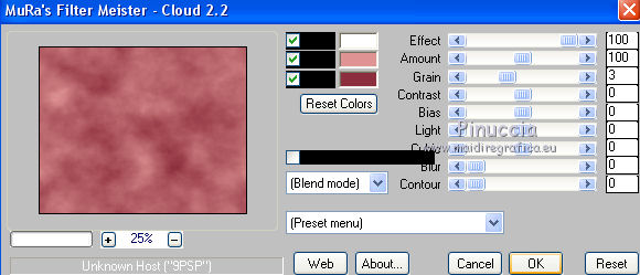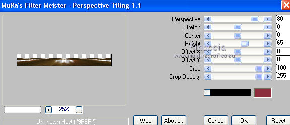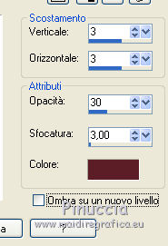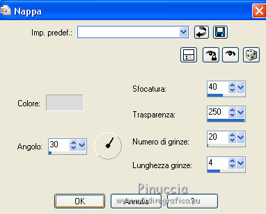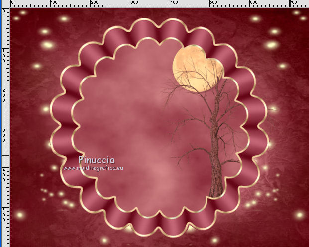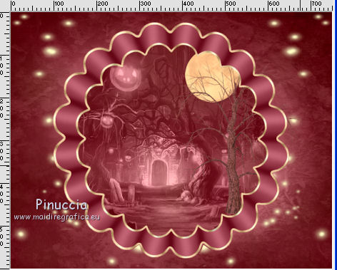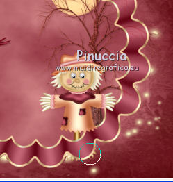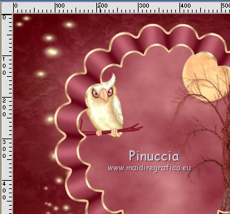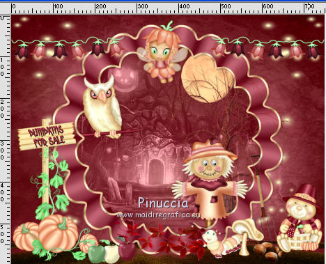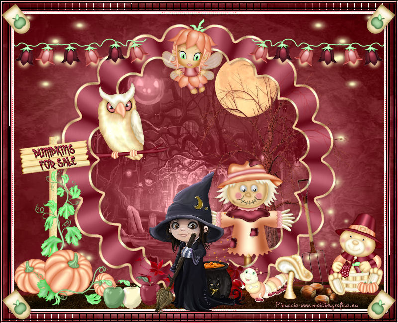 qui puoi trovare qualche risposta ai tuoi dubbi. Se l'argomento che ti interessa non è presente, ti prego di segnalarmelo. Questo tutorial è una creazione di ©Titoune e non può essere copiato su altri siti nè essere offerto per il download. Lo stesso vale per la mia traduzione. Il tutorial è stato creato con Corel17, ma può essere eseguito anche con le altre versioni di PSP. Secondo la versione utilizzata (anteriore a PSP X) potresti ottenere dei risultati differenti. Dalla versione X4, il comando Immagine>Rifletti è stato sostituito con Immagine>Capovolgi in orizzontale, e il comando Immagine>Capovolgi con Immagine>Capovolgi in verticale. Nelle versioni X5 e X6, le funzioni sono state migliorate rendendo disponibile il menu Oggetti. Con il nuovo X7 sono tornati i comandi Rifletti/Capovolgi, ma con nuove differenze. Vedi la scheda sull'argomento qui Per tradurre il tutorial ho usato PSP X. Occorrente: Un tube a scelta. Il resto del materiale qui Il tube utilizzato "bm_JamieKidd_Witchy-poo" è di BettyM Filtri in caso di dubbi, ricorda di consultare la mia sezione filtri qui Simple - Top Left Mirror qui Mura's Meister - Cloud qui Penta.com - Jeans qui Mura's Meister - Perspective Tiling qui Tramages - Tow the line qui Filters Unlimited 2.0 qui I filtri Simple, Penta.com e Tramages si possono usare da soli o importati in Filters Unlimited (come fare vedi qui) Se un filtro fornito appare con questa icona ![]() 1. Imposta il colore di primo piano con #df9493 e il colore di sfondo con #8c2e3d. 2. Apri una nuova immagine trasparente 750 x 600 pixels. Effetti>Plugins>Mura's Meister - Cloud, con i settaggi standard. ![]() 3. Apri l'elemento frame6fab e vai a Modifica>Copia. Torna al tuo lavoro e vai a Modifica>Incolla come nuovo livello. Non spostarlo. 4. Attiva lo strumento Bacchetta magica e clicca nella parte esterna della cornice per selezionarla. Attiva il livello Raster 1. 5. Livelli>Nuovo livello raster. Apri l'elemento Landscape e vai a Modifica>Copia. Torna al tuo lavoro e vai a Modifica>Incolla nella selezione. Cambia la modalità di miscelatura di questo livello in Luminanza (esistente). 6. Livelli>Nuovo livello raster. Apri l'elemento goldensparklefab e vai a Modifica>Copia. Torna al tuo lavoro e vai a Modifica>Incolla nella selezione. Selezione>Deseleziona. Livelli>Duplica. Immagine>Rifletti. 7. Attiva nuovamente il livello della cornice. Attiva lo strumento Bacchetta magica ![]() e clicca al centro della cornice per selezionarla. Selezione>Modifica>Espandi - 5 pixels. 8. Livelli>Nuovo livello raster. Livelli>Disponi>Sposta giù. Apri l'immagine "jack_o_latern_forest-887608" e vai a Modifica>Copia. Torna al tuo lavoro e vai a Modifica>Incolla nella selezione. Selezione>Deseleziona. Cambia la modalità di miscelatura di questo livello in Luminanza (esistente), e abbassa l'opacità al 75%. 9. Apri l'elemento autumnmoonfab e vai a Modifica>Copia. Torna al tuo lavoro e vai a Modifica>Incolla come nuovo livello. Spostalo nel paesaggio, a destra, vedi il mio esempio.10. Effetti>Effetti 3D>Sfalsa ombra, colore #5c1e28. ![]() 11. Apri l'elemento baretreefab e vai a Modifica>Copia. Torna al tuo lavoro e vai a Modifica>Incolla come nuovo livello. Spostalo nella parte destra del paesaggio.![]() Per vedere meglio, chiudi momentaneamente il livello del paesaggio. ![]() 12. Livelli>Duplica. Porta questo livello sopra il livello della cornice. Attiva lo strumentoGomma ![]() e cancella la parte inferiore del tronco che deborda sulla cornice. Cambia la modalità di miscelatura di questo livello in Luce diffusa. 13. Attiva il livello originale. Effetti>Effetti 3D>Sfalsa ombra, con i settaggi precedenti. 14. Apri l'elemento owlfab e vai a Modifica>Copia. Torna al tuo lavoro e vai a Modifica>Incolla come nuovo livello. Spostalo nella parte sinistra del paesaggio.![]() Livelli>Duplica. Porta questo livello sopra il livello della cornice. 15. Attiva lo strumento Gomma e cancella la parte del ramo che deborda sulla cornice. ![]() Attiva il livello originale. Effetti>Effetti 3D>Sfalsa ombra, con i settaggi precedenti. 16. Apri l'elemento screcrowfab e vai a Modifica>Copia. Torna al tuo lavoro e vai a Modifica>Incolla come nuovo livello. Spostalo nella parte inferiore destra della cornice.![]() Livelli>Duplica. Porta questo livello sopra il livello della cornice. Attiva lo strumento Gomma ![]() e cancella la parte inferiore che deborda sulla cornice. 17. Attiva il livello originale. Cancella la parte ancora visibile sotto la cornice.![]() Effetti>Effetti 3D>Sfalsa ombra, con i settaggi precedenti. Se lo hai chiuso, riapri il livello del paesaggio. 18. Attiva il livello della cornice. Effetti>Effetti 3D>Sfalsa ombra, colore #5c1e28. ![]() Ripeti l'Effetto Sfalsa ombra, cambiando verticale e orizzontale con -3. 19. Attiva lo strumento Selezione ![]() (non importa il tipo di selezione impostato, perchè con la selezione personalizzata si ottiene sempre un rettangolo) clicca sull'icona Selezione personalizzata ![]() e imposta i seguenti settaggi. ![]() 20. Attiva il livello sopra il livello Raster 1 (il secondo livello dal basso). Selezione>Innalza selezione a livello. 21. Effetti>Effetti di trama>Nappa ![]() 22. Effetti>Plugins>Mura's Meister - Perspective Tiling ![]() Selezione>Deseleziona. Cambia la modalità di miscelatura di questo livello in Luminanza (esistente). Porta questo livello sotto il livello del paesaggio. Livelli>Duplica. Cambia la modalità di miscelatura di questo livello in Luce diffusa. 23. Ritorna sul livello della cornice. Apri l'elemento autumnbellflowerfab e vai a Modifica>Copia. Torna al tuo lavoro e vai a Modifica>Incolla come nuovo livello. Spostalo nella parte superiore sinistra della cornice.Vedi l'esempio finale. Effetti>Effetti 3D>Sfalsa ombra, colore #5c1e28. ![]() Livelli>Duplica. Immagine>Rifletti. 24. Apri l'elemento autumnfairyfab e vai a Modifica>Copia. Torna al tuo lavoro e vai a Modifica>Incolla come nuovo livello. Spostalo nella parte superiore della cornice.Vedi