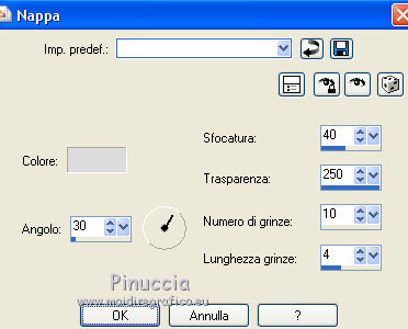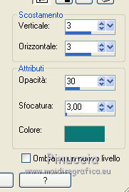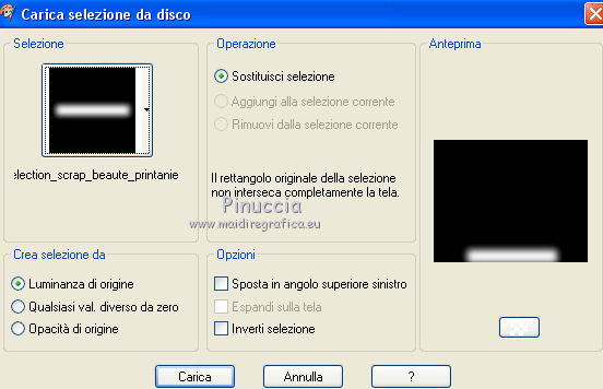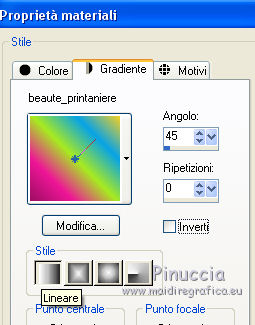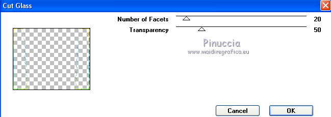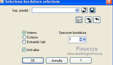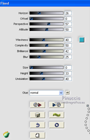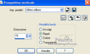 qui puoi trovare qualche risposta ai tuoi dubbi. Se l'argomento che ti interessa non è presente, ti prego di segnalarmelo. Questo tutorial è una creazione di ©Titoune e non può essere copiato su altri siti nè essere offerto per il download. Lo stesso vale per la mia traduzione. Il tutorial è stato creato con Corel17, ma può essere eseguito anche con le altre versioni di PSP. Secondo la versione utilizzata (anteriore a PSP X) potresti ottenere dei risultati differenti. Dalla versione X4, il comando Immagine>Rifletti è stato sostituito con Immagine>Capovolgi in orizzontale, e il comando Immagine>Capovolgi con Immagine>Capovolgi in verticale. Nelle versioni X5 e X6, le funzioni sono state migliorate rendendo disponibile il menu Oggetti. Con il nuovo X7 sono tornati i comandi Rifletti/Capovolgi, ma con nuove differenze. Vedi la scheda sull'argomento qui Per tradurre il tutorial ho usato PSP X. Occorrente: Un tube a scelta. Il resto del materiale qui Tube utilizzato "171298cookie_tiram__337_" Filtri in caso di dubbi, ricorda di consultare la mia sezione filtri qui Filters Unlimited 2.0 qui Graphics Plus - Cut Glass qui Flaming Pear - Flood qui I filtri Graphics Plus si possono usare da soli o importati in Filters Unlimited (come fare vedi qui) Se un filtro fornito appare con questa icona ![]() Metti la selezione nella cartella Selezioni. Metti il gradiente nella cartella Gradienti. 1. Passa il colore di primo piano a Gradiente, e seleziona il gradiente "beaute_printaniere. ![]() 2. Apri una nuova immagine trasparente 750 x 600 Pixels. Riempi l'immagine trasparente con il gradiente.Immagine>Rifletti. 3. Effetti>Effetti di riflesso>Specchio rotante. ![]() 4. Apri l'elemento 332259743c556f9cbf1cb4f952c19672be9738e, cancella la firma, e vai a Modifica>Copia. Torna al tuo lavoro e vai a Modifica>Incolla come nuovo livello. Non spostarlo. 5. Attiva il livello Raster 1. Attiva lo strumento Selezione ![]() (non importa il tipo di selezione impostato, perchè con la selezione personalizzata si ottiene sempre un rettangolo) clicca sull'icona Selezione personalizzata ![]() e imposta i seguenti settaggi. ![]() Selezione>Innalza selezione a livello. 6. Effetti>Effetti di trama>Plastica morbida. ![]() Selezione>Deseleziona. 7. Effetti>Effetti di distorsione>Onda. ![]() 8. Effetti>Effetti geometrici>Prospettiva verticale. ![]() Effetti>Effetti di riflesso>Specchio rotante, con i settaggi precedenti. Selezione>Seleziona tutto. Selezione>Mobile. Selezione>Immobilizza. 9. Selezione>Modifica>Seleziona bordature selezione. ![]() Selezione>Innalza selezione a livello. Selezione>Deseleziona. 10. Effetti>Plugins>Graphics plus - Cut Glass, con i settaggi standard. ![]() Livelli>Unisci>Unisci giù. 11. Effetti>Effetti 3D>Sfalsa ombra, colore #0e7876. ![]() Ripeti l'Effetto Sfalsa ombra, cambiando verticale e orizzontale con -3. 12. Attiva nuovamente il livello Raster 1. Selezione>Carica/Salva selezione>Carica selezione da disco. partir Cerca e carica la selezione "selection_scrap_beaute_printaniere". ![]() Selezione>Innalza selezione a livello. 13. Effetti>Plugins>Flaming pear - Flood - colore #30acc0. ![]() Effetti>Effetti di bordo>Aumenta. Selezione>Deseleziona. 14. Attiva il livello della cornice. Attiva lo strumento Bacchetta magica ![]() e clicca al centro della cornice per selezionarla. Selezione>Modifica>Espandi - 6 pixels. 15. Livelli>Nuovo livello raster. Livelli>Disponi>Sposta giù. Apri l'immagine Beautiful-farm-scenery-vectors-material-05 e vai a Modifica>Copia. Torna al tuo lavoro e vai a Modifica>Incolla nella selezione. Selezione>Deseleziona. 16. Attiva il livello della cornice. Effetti>Effetti 3D>Sfalsa ombra, con i settaggi precedenti. 17. Apri l'elemento daisies e vai a Modifica>Copia. Torna al tuo lavoro e vai a Modifica>Incolla come nuovo livello. Spostalo in basso a sinistra.Vedi l'esempio finale. Effetti>Effetti 3D>Sfalsa ombra, colore #0e7876. ![]() Livelli>Duplica. Immagine>Rifletti. 18. Apri l'elemento spring_leaves e vai a Modifica>Copia. Torna al tuo lavoro e vai a Modifica>Incolla come nuovo livello. Non spostarlo. Effetti>Effetti 3D>Sfalsa ombra, con i settaggi precedenti. 19. Apri l'elemento Spring_Branch_Transparent_PNG_Clipart_Picture e vai a Modifica>Copia. Torna al tuo lavoro e vai a Modifica>Incolla come nuovo livello. Spostalo in alto a sinistra.Vedi l'esempio finale. Effetti>Effetti 3D>Sfalsa ombra, con i settaggi precedenti. 20. Apri l'elemento Miz_SP_element(51) e vai a Modifica>Copia. Torna al tuo lavoro e vai a Modifica>Incolla come nuovo livello. Spostalo in alto a destra.Vedi l'esempio finale. Niente Sfalsa ombra. 21. Apri l'elemento Pink_and_Blue_Transparent_Butterfly_Clipart e vai a Modifica>Copia. Torna al tuo lavoro e vai a Modifica>Incolla come nuovo livello. Spostalo nel paesaggio.Vedi l'esempio finale. Effetti>Effetti 3D>Sfalsa ombra, con i settaggi precedenti. 22. Apri l'elemento Miz_SP_element(38) e vai a Modifica>Copia. Torna al tuo lavoro e vai a Modifica>Incolla come nuovo livello. Spostalo in basso a destra.Vedi l'esempio finale. Niente Sfalsa ombra. 23. Apri l'elemento f295a799 e vai a Modifica>Copia. Torna al tuo lavoro e vai a Modifica>Incolla come nuovo livello. Immagine>Ridimensiona, al 25%, tutti i livelli non selezionati. Spostalo in basso a destra.Vedi l'esempio finale. Effetti>Effetti 3D>Sfalsa ombra, con i settaggi precedenti. 24. Apri il tuo tube e vai a Modifica>Copia. Torna al tuo lavoro e vai a Modifica>Incolla come nuovo livello. Spostalo come preferisci, o vedi il mio esempio.Effetti>Effetti 3D>Sfalsa ombra, con i settaggi precedenti. 25. Attiva il livello inferiore. Modifica>Copia. Selezione>Seleziona tutto. Immagine>Ritaglia la selezione. 26. Immagine>Dimensioni tela - 800 x 650 pixels. ![]() 27. Livelli>Nuovo livello raster. Livelli>Disponi>Sposta giù. Selezione>Seleziona tutto. Modifica>Incolla nella selezione. 28. Selezione>Modifica>Contrai - 25 pixels. Selezione>Inverti. Selezione>Innalza selezione a livello. 29. Effetti>Effetti di