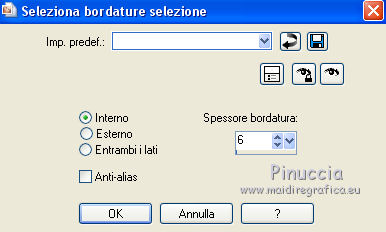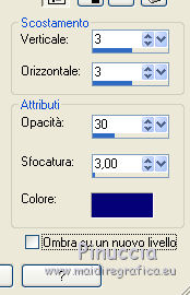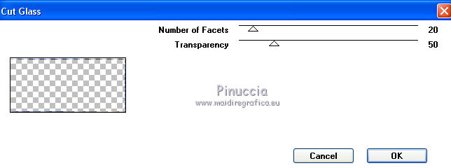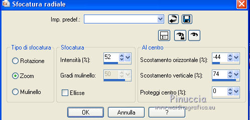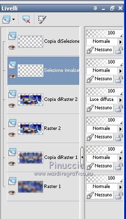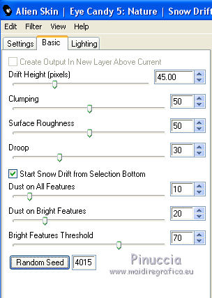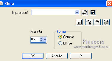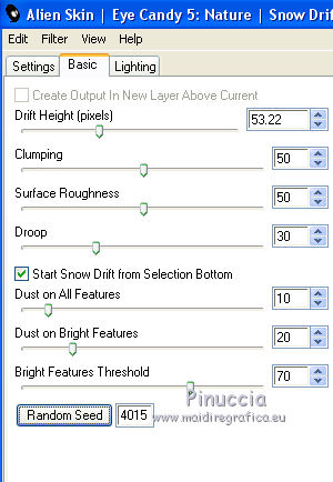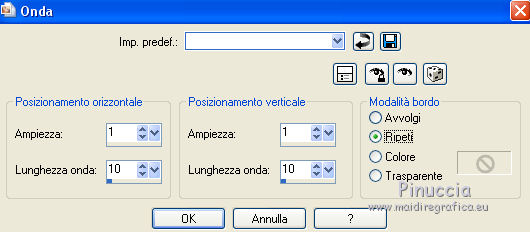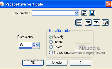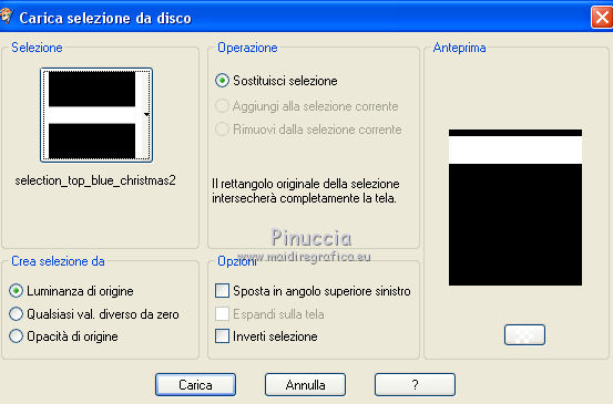 qui puoi trovare qualche risposta ai tuoi dubbi. Se l'argomento che ti interessa non è presente, ti prego di segnalarmelo. Questo tutorial è una creazione di ©Titoune e non può essere copiato su altri siti nè essere offerto per il download. Lo stesso vale per la mia traduzione. Il tutorial è stato creato con Corel15, ma può essere eseguito anche con le altre versioni di PSP. Secondo la versione utilizzata (anteriore a PSP X) potresti ottenere dei risultati differenti. Dalla versione X4, il comando Immagine>Rifletti è stato sostituito con Immagine>Capovolgi in orizzontale, e il comando Immagine>Capovolgi con Immagine>Capovolgi in verticale. Nelle versioni X5 e X6, le funzioni sono state migliorate rendendo disponibile il menu Oggetti. Con il nuovo X7 sono tornati i comandi Rifletti/Capovolgi, ma con nuove differenze. Vedi la scheda sull'argomento qui Per tradurre il tutorial ho usato PSP X. Occorrente: Un tube a scelta. Il resto del materiale qui Filtri in caso di dubbi, ricorda di consultare la mia sezione filtri qui Graphics Plus - Cross Shadow, Cut Glass qui Alien Skin Eye Candy 5 Impact - Nature - Snow Drift qui ![]() Metti le selezioni nella cartella Selezioni. Apri la maschera in PSP e minimizzala con il resto del materiale. 1. Apri una nuova immagine trasparente 1280 x 600 pixels. Selezione>Seleziona tutto. 2. Apri l'immagine 1628710-m], e vai a Modifica>Copia. Torna al tuo lavoro e vai a Modifica>Incolla nella selezione. Selezione>Deseleziona. 3. Effetti>Effetti di immagine>Motivo unico, con i settaggi standard. ![]() 4. Livelli>Duplica. Chiudi questo livello e attiva il livello sottostante dell'originale. Regola>Sfocatura>Sfocatura gaussiana - raggio 45. ![]() 5. Riapri e attiva il livello della copia. Regola>Sfocatura>Sfocatura radiale. ![]() 6. Effetti>Effetti di riflesso>Specchio rotante. ![]() Immagine>Ridimensiona, al 90%, tutti i livelli non selezionato. Selezione>Seleziona tutto. Selezione>Mobile. Selezione>Immobilizza. 7. Selezione>Modifica>Seleziona bordature selezione. ![]() 8. Attiva il livello Raster 1. Selezione>Innalza selezione a livello. Livelli>Disponi>Sposta su Effetti>Plugins>Graphics Plus - Cut Glass, con i settaggi standard. ![]() Selezione>Deseleziona. Effetti>Effetti di bordo>Aumenta. 9. Effetti>Effetti 3D>Sfalsa ombra, colore #040078. ![]() Ripeti l'Effetto Sfalsa ombra, cambiando verticale e orizzontale con -3. Livelli>Duplica. Attiva il livello originale. 10. Effetti>Effetti di distorsione>Onda. ![]() 11. Sempre posizionato sul livello originale (selezione innalzata). Attiva lo strumento Bacchetta magica ![]() e clicca al centro della cornice per selezionarla. Selezione>Modifica>Contrai - 25 pixels. Selezione>Modifica>Sfuma - 25 pixels. 12. Livelli>Nuovo livello raster. Livelli>Disponi>Sposta giù. Modifica>Incolla nella selezione (l'immagine 1628710-m] è ancora in memoria). Selezione>Deseleziona. Porta questo livello sotto il livello Selezione innalzata. 13. Livelli>Duplica, e cambia la modalità di miscelatura di questo livello in Luce diffusa. 14. Attiva il livello Selezione innalzata (il secondo dall'alto). ![]() 15. Attiva lo strumento Bacchetta magica ![]() e clicca al centro della cornice per selezionarla. Attiva il livello Raster 1. Selezione>Innalza selezione a livello. Effetti>Effetti di trama>Plastica morbida. ![]() Selezione>Deseleziona. Effetti>Effetti di bordo>Aumenta. 16. Effetti>Effetti geometrici>Prospettiva verticale. ![]() Livelli>Duplica. Immagine>Capovolgi. Livelli>Unisci>Unisci giù. 17. Effetti>Effetti geometrici>Sfera. ![]() Effetti>Effetti 3D>Sfalsa ombra, con i settaggi precedenti. 18. Effetti>Plugins>Alien Skin Eye Candy 5 Nature - Snow Drift. ![]() 19. Attiva il livello superiore. Apri l'elemento 2qncr46, e vai a Modifica>Copia. Torna al tuo lavoro e vai a Modifica>Incolla come nuovo livello. Spostalo nella parte superiore sinistra.Vedi l'esempio finale. Effetti>Effetti 3D>Sfalsa ombra, con i settaggi precedenti. 20. Apri l'elemento QBD_AnElvisBlueChristmas_TinselBorder, e vai a Modifica>Copia. Torna al tuo lavoro e vai a Modifica>Incolla come nuovo livello. Spostalo nella parte superiore destra.Vedi l'esempio finale. Effetti>Effetti 3D>Sfalsa ombra, con i settaggi precedenti. 21. Apri l'elemento DBV_LetItSnow_element (63), e vai a Modifica>Copia. Torna al tuo lavoro e vai a Modifica>Incolla come nuovo livello. Spostalo nella parte superiore destra.Vedi l'esempio finale. Effetti>Effetti 3D>Sfalsa ombra, con i settaggi precedenti. 22. Apri l'elemento wordart, e vai a Modifica>Copia. Torna al tuo lavoro e vai a Modifica>Incolla come nuovo livello. Spostalo in alto a destra.Vedi l'esempio finale. Effetti>Effetti 3D>Sfalsa ombra, con i settaggi precedenti. 23. Apri l'elemento QBD_AnElvisBlueChristmas_Lantern01, e vai a Modifica>Copia. Torna al tuo lavoro e vai a Modifica>Incolla come nuovo livello. Spostalo a destra.Vedi l'esempio finale. Effetti>Effetti 3D>Sfalsa ombra, con i settaggi precedenti. 24. Apri l'elemento QBD_AnElvisBlueChristmas_Poinsettia01, e vai a Modifica>Copia. Torna al tuo lavoro e vai a Modifica>Incolla come nuovo livello. Spostalo nella inferiore destra.Vedi l'esempio finale. Effetti>Effetti 3D>Sfalsa ombra, con i settaggi precedenti. 25. Apri l'elemento QBD_AnElvisBlueChristmas_Snowman01, e vai a Modifica>Copia. Torna al tuo lavoro e vai a Modifica>Incolla come nuovo livello. Spostalo nella parte destra del paesaggio.Vedi l'esempio finale. Effetti>Effetti 3D>Sfalsa ombra, con i settaggi precedenti. 26. Apri l'elemento QBD_AnElvisBlueChristmas_LootBag01, e vai a Modifica>Copia. Torna al tuo lavoro e vai a Modifica>Incolla come nuovo livello. Spostalo al centro.Vedi l'esempio finale. Effetti>Effetti 3D>Sfalsa ombra, con i settaggi precedenti. 27. Apri l'elemento QBD_AnElvisBlueChristmas_Stocking02, e vai a Modifica>Copia. Torna al tuo lavoro e vai a Modifica>Incolla come nuovo livello. Spostalo a sinistra.Vedi l'esempio finale. Effetti>Effetti 3D>Sfalsa ombra, con i settaggi precedenti. 28. Attiva il l