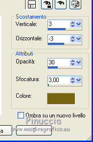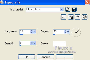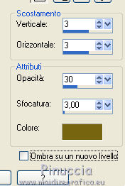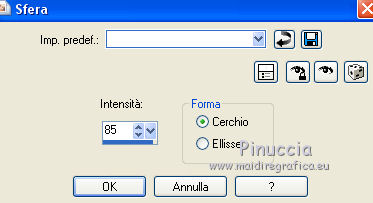 qui puoi trovare qualche risposta ai tuoi dubbi. Se l'argomento che ti interessa non è presente, ti prego di segnalarmelo. Questo tutorial è una creazione di ©Titoune e non può essere copiato su altri siti nè essere offerto per il download. Lo stesso vale per la mia traduzione. Il tutorial è stato creato con Corel17, ma può essere eseguito anche con le altre versioni di PSP. Secondo la versione utilizzata (anteriore a PSP X) potresti ottenere dei risultati differenti. Dalla versione X4, il comando Immagine>Rifletti è stato sostituito con Immagine>Capovolgi in orizzontale, e il comando Immagine>Capovolgi con Immagine>Capovolgi in verticale. Nelle versioni X5 e X6, le funzioni sono state migliorate rendendo disponibile il menu Oggetti. Con il nuovo X7 sono tornati i comandi Rifletti/Capovolgi, ma con nuove differenze. Vedi la scheda sull'argomento qui Per tradurre il tutorial ho usato PSP X. Occorrente: Un tube a scelta. Il resto del materiale qui Filtri in caso di dubbi, ricorda di consultare la mia sezione filtri qui Filters Unlimited 2.0 qui Penta.com - Jeans qui Simple - Top Left Mirror qui I filtri Penta.com e Simple si possono usare da soli o importati in Filters Unlimited (come fare vedi qui) Se un filtro fornito appare con questa icona ![]() 1. Apri una nuova immagine trasparente 750 x 600 pixels. Selezione>Seleziona tutto. Selezione>Modifica>Contrai - 45 pixels. 2. Selezione>Modifica>Seleziona bordature selezione. ![]() 3. Apri l'elemento hpd_CSM_P1 e vai a Modifica>Copia. Torna al tuo lavoro e vai a Modifica>Incolla nella selezione. 4. Effetti>Effetti 3D>Smusso a incasso. ![]() Selezione>Deseleziona. 5. Livelli>Duplica. Immagine>Ridimensiona, al 95%, tutti i livelli non selezionato. 6. Effetti>Effetti geometrici>Sfera. ![]() 7. Selezione>Seleziona tutto. Selezione>Mobile. Selezione>Immobilizza. Selezione>Modifica>Contrai - 5 pixels. Livelli>Nuovo livello raster. 8. Apri l'elemento hpd_CSM_P3 e vai a Modifica>Copia. Torna al tuo lavoro e vai a Modifica>Incolla nella selezione. Selezione>Deseleziona. 9. Effetti>Effetti di distorsione>Onda. ![]() 10. Effetti>Effetti 3D>Sfalsa ombra, colore #786510. ![]() Ripeti l'Effetto Sfalsa ombra, verticale e orizzontale -3. 11. Attiva il livello inferiore. Attiva lo strumento Bacchetta magica ![]() e clicca nella parte esterna per selezionarla. ![]() Selezione>Modifica>Espandi - 5 pixels. 12. Livelli>Nuovo livello raster. Livelli>Disponi>Sposta giù. Apri l'immagine 0d9baa9499dc e vai a Modifica>Copia. Torna al tuo lavoro e vai a Modifica>Incolla nella selezione. 13. Effetti>Effetti di riflesso>Specchio rotante. ![]() Selezione>Deseleziona. 14. Modifica>Incolla come nuovo livello (l'immagine 0d9baa9499dc è sempre in memoria). Livelli>Disponi>Porta sotto. Immagine>Ridimensiona, 1 volta al 50% e 2 volte al 75%, tutti i livelli non selezionato. Regola>Messa a fuoco>Metti a fuoco. Dovresti avere questo. ![]() Sui due livelli immediatamente sopra: Effetti>Effetti 3D>Sfalsa ombra, con i settaggi precedenti. 15. Attiva il livello superiore. Apri l'elemento hpd_CSM_El25 e vai a Modifica>Copia. Torna al tuo lavoro e vai a Modifica>Incolla come nuovo livello. 16. Immagine>Ridimensiona, al 55%, tutti i livelli non selezionato. Spostalo in basso a destra,vedi l'esempio finale. 17. Effetti>Effetti 3D>Sfalsa ombra, colore #786510. ![]() 18. Apri l'elemento hpd_CSM_El26 e vai a Modifica>Copia. Torna al tuo lavoro e vai a Modifica>Incolla come nuovo livello. Immagine>Ridimensiona, al 25%, tutti i livelli non selezionato. Spostalo in basso a destra,vedi l'esempio finale. Effetti>Effetti 3D>Sfalsa ombra, con i settaggi precedenti. 19. Apri l'elemento hpd_CSM_El34 e vai a Modifica>Copia. Torna al tuo lavoro e vai a Modifica>Incolla come nuovo livello. Immagine>Ridimensiona, al 55%, tutti i livelli non selezionato. Spostalo nella parte superiore della cornice.vedi l'esempio finale. Effetti>Effetti 3D>Sfalsa ombra, con i settaggi precedenti. 20. Apri l'elemento hpd_CSM_El14 e vai a Modifica>Copia. Torna al tuo lavoro e vai a Modifica>Incolla come nuovo livello. Immagine>Ridimensiona, al 30%, tutti i livelli non selezionato. Spostalo nel paesaggio.vedi l'esempio finale. Effetti>Effetti 3D>Sfalsa ombra, con i settaggi precedenti. 21. Apri l'elemento hpd_CSM_El27 e vai a Modifica>Copia. Torna al tuo lavoro e vai a Modifica>Incolla come nuovo livello. Immagine>Ridimensiona, al 45%, tutti i livelli non selezionato. Spostalo nella parte inferiore sinistra della cornice.Vedi l'esempio finale. Effetti>Effetti 3D>Sfalsa ombra, con i settaggi precedenti. 22. Apri l'elemento hpd_CSM_El35 e vai a Modifica>Copia. Torna al tuo lavoro e vai a Modifica>Incolla come nuovo livello. Immagine>Rifletti. Immagine>Ridimensiona, al 45%, tutti i livelli non selezionato. Spostalo nella parte inferiore della cornice,vedi l'esempio finale. Effetti>Effetti 3D>Sfalsa ombra, con i settaggi precedenti. 23. Apri l'elemento hpd_CSM_El39 e vai a Modifica>Copia. Torna al tuo lavoro e vai a Modifica>Incolla come nuovo livello. Immagine>Ridimensiona, al 50%, tutti i livelli non selezionato. Spostalo nella parte inferiore della cornice,vedi l'esempio finale. Effetti>Effetti 3D>Sfalsa ombra, con i settaggi precedenti. 24. Apri l'elemento hpd_CSM_El42 e vai a Modifica>Copia. Torna al tuo lavoro e vai a Modifica>Incolla come nuovo livello. Immagine>Ridimensiona, al 30%, tutti i livelli non selezionato. Spostalo nella parte inferiore della cornice,vedi l'esempio finale. Effetti>Effetti 3D>Sfalsa ombra, con i settaggi precedenti. 25. Apri l'elemento hpd_CSM_El43 e vai a Modifica>Copia. Torna al tuo lavoro e vai a Modifica>Incolla come nuovo livello. Immagine>Ridimensiona, al 20%, tutti i livelli non selezionato. Spostalo in basso a destra,vedi l'esempio finale. Effetti>Effetti 3D>Sfalsa ombra, con i settaggi precedenti. 26. Apri l'elemento hpd_CSM_El2 e vai a Modifica>Copia. Torna al tuo lavoro e vai a Modifica>Incolla come nuovo livello. Immagine>Ridimensiona, al 35%, tutti i livelli non selezionat