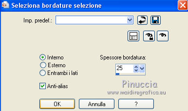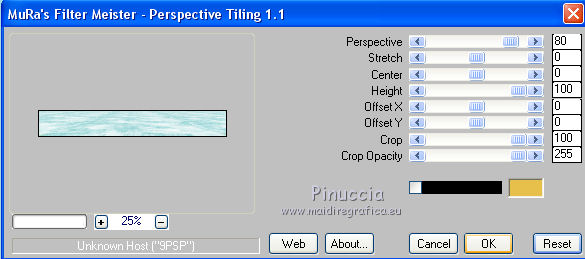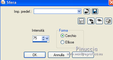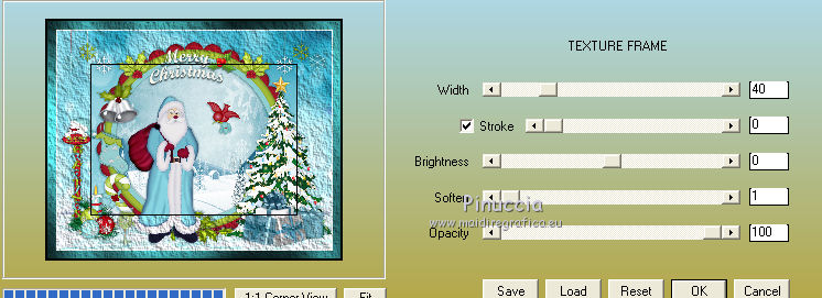 qui puoi trovare qualche risposta ai tuoi dubbi. Se l'argomento che ti interessa non è presente, ti prego di segnalarmelo. Questo tutorial è una creazione di ©Titoune e non può essere copiato su altri siti nè essere offerto per il download. Lo stesso vale per la mia traduzione. Il tutorial è stato creato con Corel17, ma può essere eseguito anche con le altre versioni di PSP. Secondo la versione utilizzata (anteriore a PSP X) potresti ottenere dei risultati differenti. Dalla versione X4, il comando Immagine>Rifletti è stato sostituito con Immagine>Capovolgi in orizzontale, e il comando Immagine>Capovolgi con Immagine>Capovolgi in verticale. Nelle versioni X5 e X6, le funzioni sono state migliorate rendendo disponibile il menu Oggetti. Con il nuovo X7 sono tornati i comandi Rifletti/Capovolgi, ma con nuove differenze. Vedi la scheda sull'argomento qui Per tradurre il tutorial ho usato PSP X. Occorrente: Un tube a scelta. Il resto del materiale qui Filtri in caso di dubbi, ricorda di consultare la mia sezione filtri qui Mura's Meister - Perspective Tiling qui Alien Skin Eye Candy 5 Nature - Snowdrift qui Graphics Plus - Cross Shadow qui AAA Frames - Texture Frame qui Filters Unlimited 2.0 qui I filtri Graphics Plus si possono usare da soli o importati in Filters Unlimited (come fare vedi qui) Se un filtro fornito appare con questa icona ![]() 1. Apri una nuova immagine trasparente de 750 x 600 pixels. Selezione>Seleziona tutto. 2. Apri l'immagine Beautiful-Christmas-Wallpaper e vai a Modifica>Copia. Torna al tuo lavoro e vai a Modifica>Incolla nella selezione. Selezione>Deseleziona. 3. Attiva lo strumento Selezione ![]() (non importa il tipo di selezione impostato, perchè con la selezione personalizzata si ottiene sempre un rettangolo) clicca sull'icona Selezione personalizzata ![]() e imposta i seguenti settaggi. ![]() Livelli>Nuovo livello raster. 4. Apri l'elemento paper7 e vai a Modifica>Copia. Torna al tuo lavoro e vai a Modifica>Incolla nella selezione. 5. Effetti>Plugins>Mura's Meister - Perspective Tiling. ![]() 6. Effetti>Plugins>Alien Skin Eye Candy 5 Nature - Snowdrift. ![]() Selezione>Deseleziona. 7. Effetti>Effetti geometrici>Sfera. ![]() 8. Apri l'elemento frame3 e vai a Modifica>Copia. Torna al tuo lavoro e vai a Modifica>Incolla come nuovo livello. Non spostarlo. 9. Attiva lo strumento Bacchetta magica ![]() e clicca al centro della cornice per selezionarla. Selezione>Modifica>Espandi - 5 pixels. 10. Livelli>Nuovo livello raster. Livelli>Disponi>Sposta giù. 11. Apri l'immagine Frozen-Christmas-Background_lg.jpg e vai a Modifica>Copia. Torna al tuo lavoro e vai a Modifica>Incolla nella selezione. Selezione>Deseleziona. 12. Apri l'elemento Winter_Ground_with_Trees_PNG_Clipart_Image e vai a Modifica>Copia. Torna al tuo lavoro e vai a Modifica>Incolla come nuovo livello. Spostalo nella parte interna della cornice.Vedi l'esempio finale. Porta questo livello sotto il livello della cornice. 13. Attiva nuovamente il livello della cornice. Attiva lo strumento Bacchetta magica ![]() e clicca all'esterno della cornice. 14. Ritorna sul livello del paesaggio e premi sulla tastiera il tasto CANC ![]() Selezione>Deseleziona. 15. Effetti>Effetti 3D>Sfalsa ombra, colore #155663. ![]() 16. Apri l'elemento bird e vai a Modifica>Copia. Torna al tuo lavoro e vai a Modifica>Incolla come nuovo livello. Spostalo nel paesaggio.Vedi l'esempio finale. Effetti>Effetti 3D>Sfalsa ombra, con i settaggi precedenti. Attiva nuovamente il livello della cornice. Effetti>Effetti 3D>Sfalsa ombra, colore #155663. ![]() Ripeti l'Effetto Sfalsa ombra, ma verticale e orizzontale -3/3. 17. Apri l'elemento Merry_Christmas_Decor_with_Mistletoe_PNG_Clipart-31 e vai a Modifica>Copia. Torna al tuo lavoro e vai a Modifica>Incolla come nuovo livello. Spostalo nella parte superiore della cornice.Vedi l'esempio finale. Effetti>Effetti 3D>Sfalsa ombra, con i settaggi precedenti. 18. Apri l'elemento holly e vai a Modifica>Copia. Torna al tuo lavoro e vai a Modifica>Incolla come nuovo livello. Spostalo nella parte superiore sinistra della cornice.Vedi l'esempio finale. Effetti>Effetti 3D>Sfalsa ombra, con i settaggi precedenti. Livelli>Duplica. Immagine>Rifletti. 19. Apri l'elemento snowflakes e vai a Modifica>Copia. Torna al tuo lavoro e vai a Modifica>Incolla come nuovo livello. Spostalo in alto a sinistra.Vedi l'esempio finale. Effetti>Effetti 3D>Sfalsa ombra, con i settaggi precedenti. Livelli>Duplica. Immagine>Rifletti. 20. Apri l'elemento Large_Deco_Christmas_Tree_Art e vai a Modifica>Copia. Torna al tuo lavoro e vai a Modifica>Incolla come nuovo livello. Spostalo nella parte superiore destra della cornice.Vedi l'esempio finale. Effetti>Effetti 3D>Sfalsa ombra, con i settaggi precedenti. 21. Apri l'elemento presents e vai a Modifica>Copia. Torna al tuo lavoro e vai a Modifica>Incolla come nuovo livello. Spostalo nella parte inferiore destra della cornice.Vedi l'esempio finale. Effetti>Effetti 3D>Sfalsa ombra, con i settaggi precedenti. 22. Apri l'elemento holly2 e vai a Modifica>Copia. Torna al tuo lavoro e vai a Modifica>Incolla come nuovo livello. Spostalo nella parte inferiore della cornice.Vedi l'esempio finale. Effetti>Effetti 3D>Sfalsa ombra, con i settaggi precedenti. 23. Apri l'elemento sign e vai a Modifica>Copia. Torna al tuo lavoro e vai a Modifica>Incolla come nuovo livello. Spostalo nella parte inferiore sinistra della cornice.Vedi l'esempio finale. Effetti>Effetti 3D>Sfalsa ombra, con i settaggi precedenti. 24. Apri l'elemento candle e vai a Modifica>Copia. Torna al tuo lavoro e vai a Modifica>Incolla come nuovo livello. Spostalo nella parte inferiore sinistra della cornice.Vedi l'esempio finale. Effetti>Effetti 3D>Sfalsa ombra, con i settaggi precedenti. Apri l'elemento candy cane e vai a Modifica>Copia. Torna al tuo lavoro e vai a Modifica>Incolla come nuovo livello. Spostalo nella parte inferiore sinistra della cornice.Vedi l'esempio finale. Effetti>Effetti 3D>Sfalsa ombra, con i settaggi precede