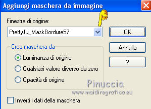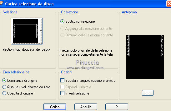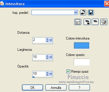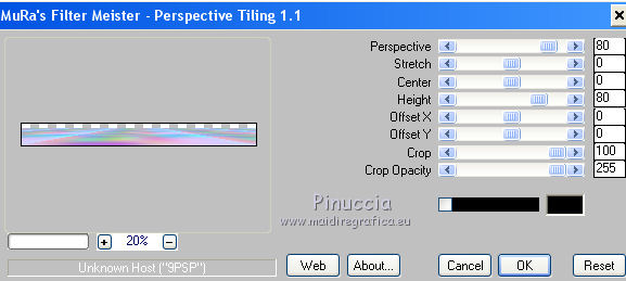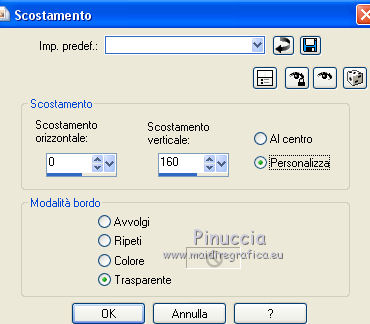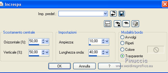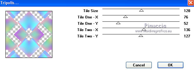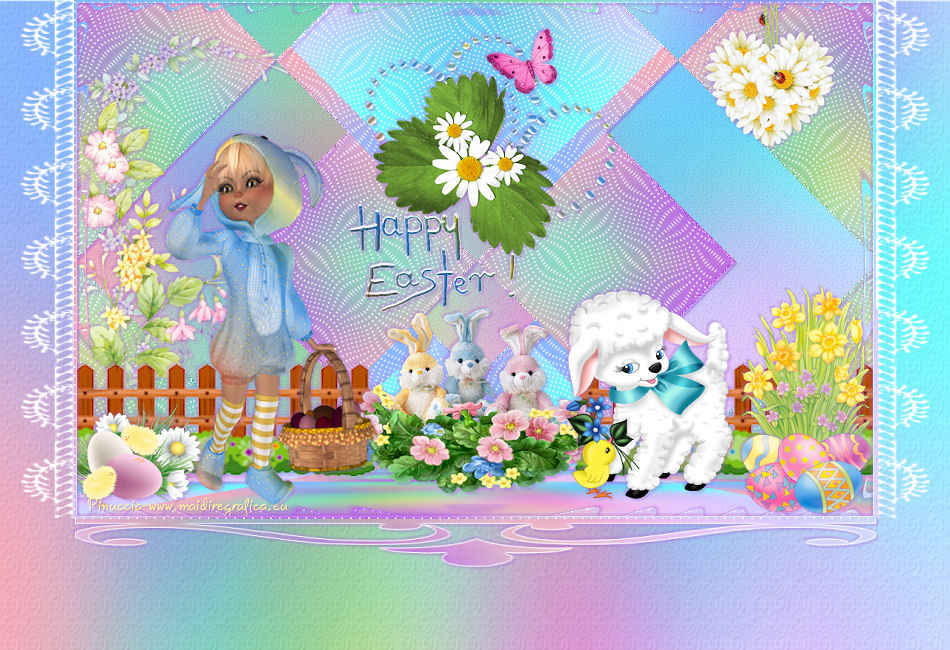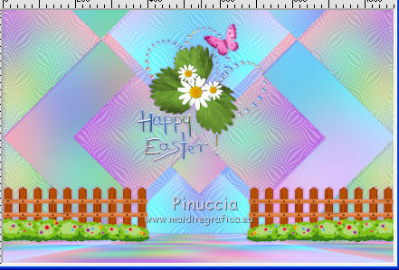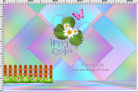 qui puoi trovare qualche risposta ai tuoi dubbi. Se l'argomento che ti interessa non è presente, ti prego di segnalarmelo. Questo tutorial è una creazione di ©Titoune e non può essere copiato su altri siti nè essere offerto per il download. Lo stesso vale per la mia traduzione. Il tutorial è stato creato con Corel17, ma può essere eseguito anche con le altre versioni di PSP. Secondo la versione utilizzata (anteriore a PSP X) potresti ottenere dei risultati differenti. Dalla versione X4, il comando Immagine>Rifletti è stato sostituito con Immagine>Capovolgi in orizzontale, e il comando Immagine>Capovolgi con Immagine>Capovolgi in verticale. Nelle versioni X5 e X6, le funzioni sono state migliorate rendendo disponibile il menu Oggetti. Con il nuovo X7 sono tornati i comandi Rifletti/Capovolgi, ma con nuove differenze. Vedi la scheda sull'argomento qui Per tradurre il tutorial ho usato PSP X. Occorrente: Un tube a scelta. Il resto del materiale qui Il paesaggio è di Luz Cristina. Gli elementi clipart sono di Yopriceville. Filtri in caso di dubbi, ricorda di consultare la mia sezione filtri qui Filters Unlimited 2.0 qui Simple - Half Wrap, Diamonds qui VM Instant Art - Tripolis qui Tramages - Tow the line qui Mura's Meister - Perspective Tiling qui I filtri Simple, VM Instant Art e Tramages si possono usare da soli o importati in Filters Unlimited (come fare vedi qui) Se un filtro fornito appare con questa icona ![]() Metti la selezione nella cartella Selezioni. Metti la trama Tilerose nella cartella Trame. Apri la maschera in PSP e minimizzala con il resto del materiale. 1. Apri una nuova immagine trasparente 1080 x 700 pixels. Selezione>Seleziona tutto. 2. Apri l'elemento background e vai a Modifica>Copia. Torna al tuo lavoro e vai a Modifica>Incolla nella selezione. Selezione>Deseleziona. 3. Livelli>Duplica. Immagine>Ruota per gradi - 90 gradi a sinistra. ![]() Effetti>Plugins>Simple - Half Wrap. Effetti>Plugins>Simple - Diamonds. Effetti>Plugins>VM Instant Art - Tripolis, con i settaggi standard. ![]() 4. Selezione>Seleziona tutto. Selezione>Mobile. Selezione>Immobilizza. 5. Selezione>Modifica>Seleziona bordature selezione. ![]() Selezione>Innalza selezione a livello. 6. Regola>Aggiungi/Rimuovi disturbo>Aggiungi disturbo. ![]() Selezione>Deseleziona. 7. Effetti>Effetti 3D>Sfalsa ombra, colore #a85eda. ![]() Ripeti l'Effetto Sfalsa ombra, cambiando verticale e orizzontale -3. 8. Attiva nuovamente il livello copia di Raster 1. Selezione>Seleziona tutto. Selezione>Mobile. Selezione>Immobilizza. 9. Livelli>Nuovo livello raster. Imposta il colore di primo piano con il colore bianco, e seleziona Trama. Cerca e seleziona la trama Griglia con i seguenti settaggi. ![]() Riempi il livello con questo colore tramato.Selezione>Deseleziona. 10. Effetti>Effetti di distorsione>Onda. ![]() 11. Attiva ancora il livello copia di Raster 1. Selezione>Seleziona tutto. Selezione>Mobile. Selezione>Immobilizza. 12. Selezione>Inverti. 13. Attiva il livello immediatamente sopra (il livello con l'effetto Onda). Premi sulla tastiera il tasto CANC ![]() Selezione>Deseleziona. 14. Attiva il livello copia di Raster 1. Effetti>Effetti 3D>Sfalsa ombra, con i settaggi precedenti. 15. Attiva il livello Raster 1. Effetti>Effetti di trama>Trama - seleziona la trama Tilerose con i seguenti settaggi. ![]() 16. Attiva il livello superiore. Livelli>Nuovo livello raster. Attiva lo strumento Selezione ![]() (non importa il tipo di selezione impostato, perchè con la selezione personalizzata si ottiene sempre un rettangolo) clicca sull'icona Selezione personalizzata ![]() e imposta i seguenti settaggi. ![]() 17. Modifica>Incolla nella selezione (l'immagine background è sempre in memoria). 18. Effetti>Plugins>Mura's Meister - Perspective Tiling. ![]() Selezione>Deseleziona. Effetti>Effetti 3D>Sfalsa ombra, con i settaggi precedenti. 19. Apri l'elemento Happy_Easter_Transparent_Text_with_Deco_PNG_Picture e vai a Modifica>Copia. Torna al tuo lavoro e vai a Modifica>Incolla come nuovo livello. Spostalo un po' più in alto.Vedi l'esempio finale. Effetti>Effetti 3D>Sfalsa ombra, con i settaggi precedenti. 20. Apri l'elemento picket-fence-border e vai a Modifica>Copia. Torna al tuo lavoro e vai a Modifica>Incolla come nuovo livello. Spostalo come nell'esempio.![]() Effetti>Effetti 3D>Sfalsa ombra, con i settaggi precedenti. Livelli>Duplica. Immagine>Rifletti. ![]() 22. Apri l'elemento Mira_flowers_unknown_GED, e vai a Modifica>Copia. Torna al tuo lavoro e vai a Modifica>Incolla come nuovo livello. Spostalo a sinistra.Vedi l'esempio finale. Porta questo livello sotto il livello dello steccato. Effetti>Effetti 3D>Sfalsa ombra, con i settaggi precedenti. 23. Attiva il livello superiore. Apri l'elemento Transparent_Easter_Chickens_and_Eggs_PNG_Clipart_Picture, e vai a Modifica>Copia. Torna al tuo lavoro e vai a Modifica>Incolla come nuovo livello. Spostalo nella parte inferiore sinistra.Vedi l'esempio finale. Effetti>Effetti 3D>Sfalsa ombra, con i settaggi precedenti. 24. Apri l'elemento kjb_Sophie_easter2009_00016_smaller, e vai a Modifica>Copia. Torna al tuo lavoro e vai a Modifica>Incolla come nuovo livello. Spostalo nella parte inferiore destra.Vedi l'esempio finale. Effetti>Effetti 3D>Sfalsa ombra, con i settaggi precedenti. 25. Apri l'elemento flowers_hearts, e vai a Modifica>Copia. Torna al tuo lavoro e vai a Modifica>Incolla come nuovo livello. Spostalo nella parte superiore destra.Vedi l'esempio finale. Effetti>Effetti 3D>Sfalsa ombra, con i settaggi precedenti. 26. Apri l'elemento 0_55f5d_c282e62_L, e vai a Modifica>Copia. Torna al tuo lavoro e vai a Modifica>Incolla come nuovo livello. Spostalo al centro dello steccato.Vedi l'esempio finale. Effetti>Effetti 3D>Sfalsa ombra, con i settaggi precedenti. 27. Apri l'elemento Transparent_Easter_Lamb_and_Chicken_PNG_Clipart_Picture, e vai a Modifica>Copia. Torna al tuo lavoro e vai a Modifica>Incolla come nuovo livello. Spostalo come nel mio esempio.Effetti>Effetti 3D>Sfalsa omb