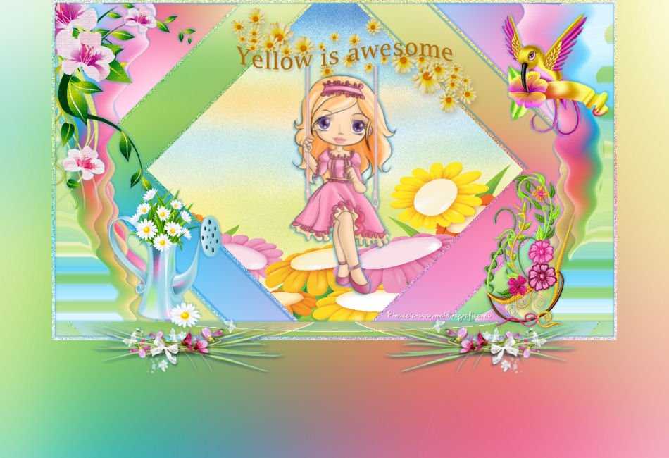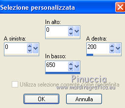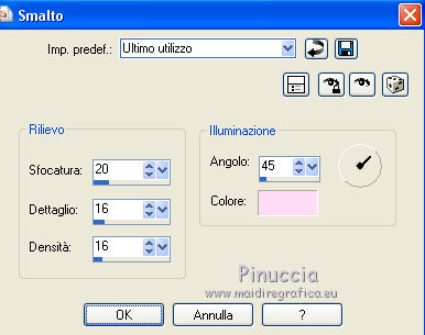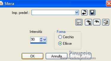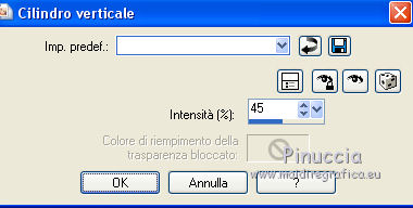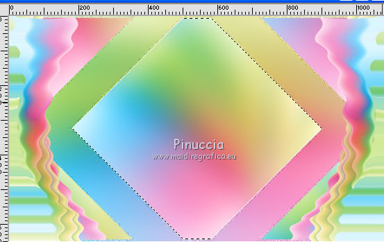 qui puoi trovare qualche risposta ai tuoi dubbi. Se l'argomento che ti interessa non è presente, ti prego di segnalarmelo. Questo tutorial è una creazione di ©Titoune e non può essere copiato su altri siti nè essere offerto per il download. Lo stesso vale per la mia traduzione. Il tutorial è stato creato con Corel17, ma può essere eseguito anche con le altre versioni di PSP. Secondo la versione utilizzata (anteriore a PSP X) potresti ottenere dei risultati differenti. Dalla versione X4, il comando Immagine>Rifletti è stato sostituito con Immagine>Capovolgi in orizzontale, e il comando Immagine>Capovolgi con Immagine>Capovolgi in verticale. Nelle versioni X5 e X6, le funzioni sono state migliorate rendendo disponibile il menu Oggetti. Con il nuovo X7 sono tornati i comandi Rifletti/Capovolgi, ma con nuove differenze. Vedi la scheda sull'argomento qui Per tradurre il tutorial ho usato PSP X. Occorrente: Un tube a scelta. Il resto del materiale qui Filtri in caso di dubbi, ricorda di consultare la mia sezione filtri qui Filters Unlimited 2.0 qui Simple - Diamonds qui I filtri Simple si possono usare da soli o importati in Filters Unlimited (come fare vedi qui) Se un filtro fornito appare con questa icona ![]() 1. Apri una nuova immagine trasparente 1080 x 650 pixels Selezione>Seleziona tutto. 2. Apri l'immagine P1-2 e vai a Modifica>Copia. Torna al tuo lavoro e vai a Modifica>Incolla nella selezione. Selezione>Deseleziona. 3. Regola>Sfocatura>Sfocatura gaussiana - raggio 45. ![]() 4. Livelli>Nuovo livello raster. Attiva lo strumento Selezione ![]() (non importa il tipo di selezione impostato, perchè con la selezione personalizzata si ottiene sempre un rettangolo) clicca sull'icona Selezione personalizzata ![]() e imposta i seguenti settaggi. ![]() 5. Modifica>Incolla nella selezione (l'immagine P1-2 è sempre in memoria). Selezione>Deseleziona. 6. Effetti>Effetti geometrici>Prospettiva verticale. ![]() 7. Effetti>Effetti di riflesso>Specchio rotante. ![]() 8. Effetti>Effetti geometrici>Cilindro verticale. ![]() 9. Effetti>Effetti di distorsione>Onda. ![]() Livelli>Duplica. Immagine>Capovolgi. Livelli>Unisci>Unisci giù. Effetti>Effetti geometrici>Prospettiva verticale, con i settaggi precedenti. 10. Effetti>Effetti geometrici>Sfera. ![]() Rinomina questo livello "bordi". 11. Attiva il livello inferiore. Livelli>Duplica. 12. Immagine>Ridimensiona, all'85%, tutti i livelli non selezionato. Effetti>Plugins>Simple - Diamonds. Rinomina questo livello "losanga". 13. Selezione>Seleziona tutto. Selezione>Mobile. Selezione>Immobilizza. 14. Selezione>Modifica>Seleziona bordature selezione. ![]() 15. Attiva il livello inferiore. Selezione>Innalza selezione a livello. Livelli>Disponi>Porta in alto. 16. Regola>Aggiungi/Rimuovi disturbo>Aggiungi disturbo. ![]() Selezione>Deseleziona. Rinomina questo livello "bordo-losanga". 17. Attiva lo strumento Bacchetta magica ![]() e clicca al centro della losanga per selezionarla. ![]() 18. Livelli>Nuovo livello raster. Livelli>Disponi>Sposta giù. 19. Apri l'immagine 0_c2d05_7724241d_orig e vai a Modifica>Copia. Torna al tuo lavoro e vai a Modifica>Incolla nella selezione. Selezione>Deseleziona. 20. Attiva il livello "bordo-losanga". Effetti>Effetti 3D>Sfalsa ombra, colore #2b94cd. ![]() Ripeti l'Effetto Sfalsa ombra, cambiando verticale e orizzontale con -3/3. Ripeti l'Effetto Sfalsa ombra sui livello "losanga" e "bordi". 21. Assicurati di essere posizionato sul livello superiore. Livelli>Nuovo livello raster. Selezione personalizzata ![]() ![]() 22. Attiva nuovamente il livello inferiore. Selezione>Innalza selezione a livello. Livelli>Disponi>Porta in alto. 23. Effetti>Effetti artistici>Smalto. ![]() Effetti>Effetti di riflesso>Specchio rotante, con i settaggi precedenti. Selezione>Inverti. Premi sulla tastiera il tasto CANC ![]() Selezione>Deseleziona. 24. Effetti>Effetti 3D>Scostamento. ![]() Immagine>Capovolgi. Effetti>Effetti 3D>Sfalsa ombra, con i settaggi precedenti. 25. Apri l'elemento yellowwa e vai a Modifica>Copia. Torna al tuo lavoro e vai a Modifica>Incolla come nuovo livello. Spostalo nella parte superiore della losanga.Niente Sfalsa ombra. 26. Apri l'elemento 120515_af20d e vai a Modifica>Copia. Torna al tuo lavoro e vai a Modifica>Incolla come nuovo livello. Spostalo nella parte superiore sinistra.Vedi l'esempio finale. Livelli>Duplica. Cambia la modalità di miscelatura di questo livello in Luce diffusa. 27. Attiva il livello originale. Effetti>Effetti 3D>Sfalsa ombra, con i settaggi precedenti. 28. Attiva nuovamente il livello superiore. Apri l'elemento banner_bird e vai a Modifica>Copia. Torna al tuo lavoro e vai a Modifica>Incolla come nuovo livello. Spostalo nella parte superore destra.Vedi l'esempio finale. Effetti>Effetti 3D>Sfalsa ombra, con i settaggi precedenti. 29. Apri l'elemento m_072814 e vai a Modifica>Copia. Torna al tuo lavoro e vai a Modifica>Incolla come nuovo livello. Spostalo nella parte inferiore destra.Vedi l'esempio finale. Effetti>Effetti 3D>Sfalsa ombra, con i settaggi precedenti. 30. Apri l'elemento 82a7e5ad e vai a Modifica>Copia. Torna al tuo lavoro e vai a Modifica>Incolla come nuovo livello. Spostalo nella parte inferiore sinistra.Vedi l'esempio finale. Effetti>Effetti 3D>Sfalsa ombra, con i settaggi precedenti. 31. Apri il tuo tube e vai a Modifica>Copia. Torna al tuo lavoro e vai a Modifica>Incolla come nuovo livello. Immagine>Ridimensiona, se e quanto necessario, tutti i livelli non selezionato. Spostalo dove preferisci o vedi il mio esempio.Effetti>Effetti 3D>Sfalsa ombra, con i settaggi precedenti. 32. Attiva il livello inferiore. Livelli>Duplica. Livelli>Disponi>Porta in alto. 33. Selezione>Seleziona tutto. Selezione>Modifica>Contrai - 5 pixels. Premi sulla tastiera il tasto CANC. Selezione>Inverti. Regola>Aggiungi/Rimuovi disturbo>Aggiungi disturbo, con i settaggi precedenti. Selezione>Deseleziona. Effetti>Effetti 3D>Sfalsa ombra, con i settaggi precedenti. 34. Attiva il livello inferiore. Modifica>Co