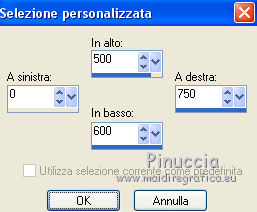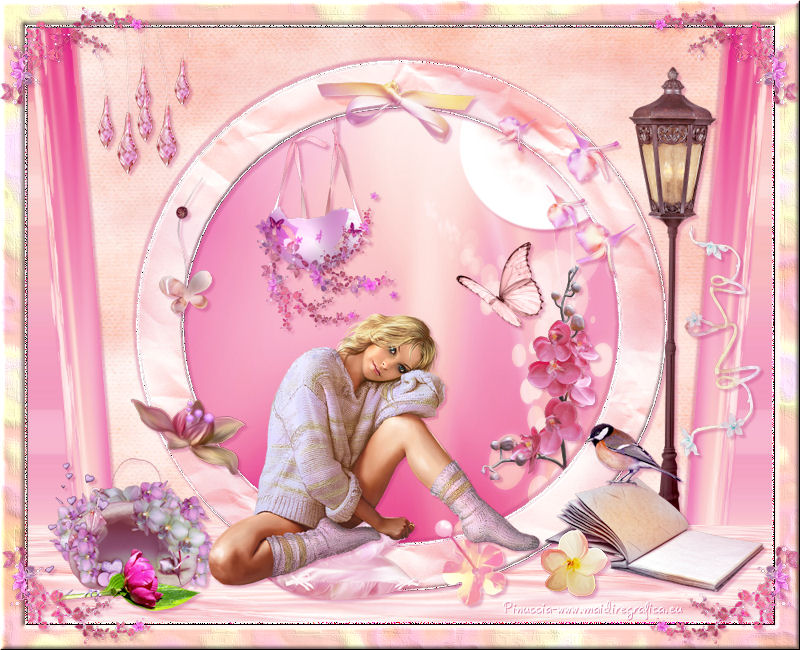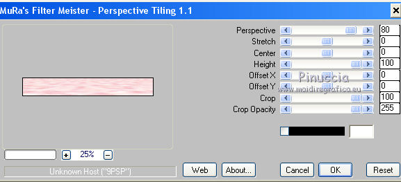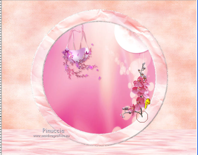 qui puoi trovare qualche risposta ai tuoi dubbi. Se l'argomento che ti interessa non è presente, ti prego di segnalarmelo. Questo tutorial è una creazione di ©Titoune e non può essere copiato su altri siti nè essere offerto per il download. Lo stesso vale per la mia traduzione. Il tutorial è stato creato con Corel17, ma può essere eseguito anche con le altre versioni di PSP. Secondo la versione utilizzata (anteriore a PSP X) potresti ottenere dei risultati differenti. Dalla versione X4, il comando Immagine>Rifletti è stato sostituito con Immagine>Capovolgi in orizzontale, e il comando Immagine>Capovolgi con Immagine>Capovolgi in verticale. Nelle versioni X5 e X6, le funzioni sono state migliorate rendendo disponibile il menu Oggetti. Con il nuovo X7 sono tornati i comandi Rifletti/Capovolgi, ma con nuove differenze. Vedi la scheda sull'argomento qui Per tradurre il tutorial ho usato PSP X. Occorrente: Un tube a scelta. Il resto del materiale qui Filtri in caso di dubbi, ricorda di consultare la mia sezione filtri qui Mura's Meister - Perspective Tiling qui ![]() Metti la selezione nella cartella Selezioni. 1. Apri una nuova immagine trasparente 750 x 600 pixels. Selezione>Seleziona tutto. 2. Apri l'elemento Paper9_CD_Fantasia e vai a Modifica>Copia. Torna al tuo lavoro e vai a Modifica>Incolla nella selezione. Selezione>Deseleziona. 3. Attiva lo strumento Selezione ![]() (non importa il tipo di selezione impostato, perchè con la selezione personalizzata si ottiene sempre un rettangolo) clicca sull'icona Selezione personalizzata ![]() e imposta i seguenti settaggi. ![]() 4. Livelli>Nuovo livello raster. Apri l'elemento Paper1_CD_Fantasia e vai a Modifica>Copia. Torna al tuo lavoro e vai a Modifica>Incolla nella selezione. 5. Effetti>Plugins>Mura's Meister - Perspective Tiling, con i settaggi standard. ![]() Selezione>Deseleziona. 6. Livelli>Nuovo livello raster. Selezione>Carica/Salva selezione>Carica selezione da disco. Cerca e carica la selezione selection_scrap_douceur_satinee ![]() 7. Modifica>Incolla nella selezione (l'elemento Paper1_CD_Fantasia è ancora in memoria). 8. Selezione>Modifica>Seleziona bordature selezione. ![]() 9. Regola>Aggiungi/Rimuovi disturbo>Aggiungi disturbo. ![]() Effetti>Effetti di bordo>Aumenta. Selezione>Deseleziona. 10. Attiva il livello sottostante della cornice. Effetti>Effetti 3D>Smusso a incasso. ![]() 10. Attiva nuovamente il livello superiore. Livelli>Unisci>Unisci giù. 11. Attiva lo strumento Bacchetta magica ![]() e clicca al centro della cornice per selezionarla. Selezione>Modifica>Espandi - 5 pixels. 13. Livelli>Nuovo livello raster. Livelli>Disponi>Sposta giù. Apri l'immagine pink-abstract-1680ox10450. Immagine>Rifletti. Modifica>Copia. Torna al tuo lavoro e vai a Modifica>Incolla nella selezione. Selezione>Deseleziona. 14. Apri l'elemento Moon_CD_Fantasia e vai a Modifica>Copia. Torna al tuo lavoro e vai a Modifica>Incolla come nuovo livello. Spostalo nella parte superiore destra della cornice.Vedi l'esempio finale. 15. Effetti>Effetti 3D>Sfalsa ombra, colore #b4226a. ![]() 16. Apri l'elemento FlowerSwing_CD_Fantasia e vai a Modifica>Copia. Torna al tuo lavoro e vai a Modifica>Incolla come nuovo livello. Spostalo nella parte superiore sinistra della cornice.Vedi l'esempio finale. Effetti>Effetti 3D>Sfalsa ombra, con i settaggi precedenti. 17. Apri l'elemento Branch_CD_Fantasia e vai a Modifica>Copia. Torna al tuo lavoro e vai a Modifica>Incolla come nuovo livello. Spostalo nella parte inferiore destra della cornice.Deve trovarsi sotto il livello della cornice. Livelli>Duplica. Porta questo livello sopra il livello della cornice. Attiva lo strumento Gomma ![]() e cancella lo stelo che deborda sulla cornice. ![]() 18. Attiva il livello originale. Effetti>Effetti 3D>Sfalsa ombra, con i settaggi precedenti. 19. Apri l'elemento Butterfly2_CD_Fantasia e vai a Modifica>Copia. Torna al tuo lavoro e vai a Modifica>Incolla come nuovo livello. Spostalo nel paesaggio.Vedi l'esempio finale. Effetti>Effetti 3D>Sfalsa ombra, con i settaggi precedenti. 20. Attiva nuovamente il livello della cornice. Effetti>Effetti 3D>Sfalsa ombra, colore #b4226a. ![]() Ripeti l'Effetto Sfalsa ombra, cambiando verticale e orizzontale con -3. 21. Attiva il livello Raster 1. Selezione personalizzata ![]() ![]() 22. Livelli>Nuovo livello raster. Attiva l'immagine pink-abstract-1680x1050 e vai a Modifica>Copia. Torna al tuo lavoro e vai a Modifica>Incolla nella selezione. Selezione>Deseleziona. 23. Effetti>Effetti geometrici>Prospettiva verticale. ![]() Immagine>Capovolgi. 24. Effetti>Effetti di riflesso>Specchio rotante. ![]() Effetti>Effetti 3D>Sfalsa ombra, con i settaggi precedenti. 25. Attiva nuovamente il livello superiore. Apri l'elemento Gems_CD_Fantasia e vai a Modifica>Copia. Torna al tuo lavoro e vai a Modifica>Incolla come nuovo livello. Spostalo in alto a sinistra.Vedi l'esempio finale. Effetti>Effetti 3D>Sfalsa ombra, colore #b4226a. ![]() 26. Apri l'elemento Bow_CD_Fantasia e vai a Modifica>Copia. Torna al tuo lavoro e vai a Modifica>Incolla come nuovo livello. Spostalo nella parte superiore della cornice.Vedi l'esempio finale. Effetti>Effetti 3D>Sfalsa ombra, con i settaggi precedenti. 27. Apri l'elemento Flowers_CD_Fantasia e vai a Modifica>Copia. Torna al tuo lavoro e vai a Modifica>Incolla come nuovo livello. Spostalo nella parte superiore destra della cornice.Vedi l'esempio finale. Effetti>Effetti 3D>Sfalsa ombra, con i settaggi precedenti. 28. Apri l'elemento Flowerstring_CD_Fantasia e vai a Modifica>Copia. Torna al tuo lavoro e vai a Modifica>Incolla come nuovo livello. Spostalo nella parte destra della cornice.Vedi l'esempio finale. Effetti>Effetti 3D>Sfalsa ombra, con i settaggi precedenti. 29. Apri l'elemento Lantern_CD_Fantasia e vai a Modifica>Copia. Torna al tuo lavoro e vai a Modifica>Incolla come nuovo livello. Spostalo nella parte destra della cornice.Vedi l'esempio finale. Effetti>Effetti 3D>Sfalsa ombra, con i settaggi precedenti. 30. Apr