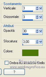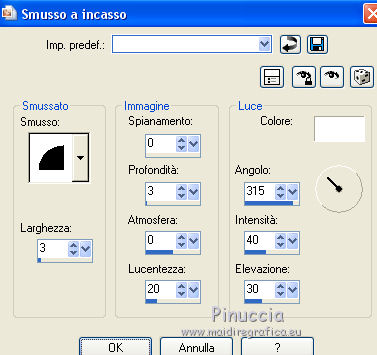 qui puoi trovare qualche risposta ai tuoi dubbi. Se l'argomento che ti interessa non è presente, ti prego di segnalarmelo. Questo tutorial è una creazione di ©Titoune e non può essere copiato su altri siti nè essere offerto per il download. Lo stesso vale per la mia traduzione. Il tutorial è stato creato con Corel17, ma può essere eseguito anche con le altre versioni di PSP. Secondo la versione utilizzata (anteriore a PSP X) potresti ottenere dei risultati differenti. Dalla versione X4, il comando Immagine>Rifletti è stato sostituito con Immagine>Capovolgi in orizzontale, e il comando Immagine>Capovolgi con Immagine>Capovolgi in verticale. Nelle versioni X5 e X6, le funzioni sono state migliorate rendendo disponibile il menu Oggetti. Con il nuovo X7 sono tornati i comandi Rifletti/Capovolgi, ma con nuove differenze. Vedi la scheda sull'argomento qui Per tradurre il tutorial ho usato PSP X. Occorrente: Un tube a scelta. Il resto del materiale qui Il tube usato è di Ruth Morehead Filtri: in caso di dubbi, ricorda di consultare la mia sezione filtri qui Filters Unlimited 2.0 qui Graphics Plus - Cut Glass qui Penta.com - Jeans qui I filtri Penta.com e Graphics Plus si possono usare da soli o importati in Filters Unlimited (come fare vedi qui) Se un filtro fornito appare con questa icona ![]() Metti la selezione nella cartella Selezioni. 1. Apri una nuova immagine trasparente 750 x 600 Pixels. Apri l'elemento MC_BA_JoysOfSpring_E17 e vai a Modifica>Copia. Torna al tuo lavoro e vai a Modifica>Incolla come nuovo livello. Spostalo in basso a sinistra.Vedi l'esempio. ![]() Livelli>Duplica. Immagine>Rifletti. Livelli>Unisci>Unisci giù. 2. Attiva il livello Raster 1. Selezione>Seleziona tutto. Apri l'immagine Spring-green-leaves-with-sunlight-background-vector-03 e vai a Modifica>Copia. Torna al tuo lavoro e vai a Modifica>Incolla nella selezione. Selezione>Deseleziona. 3. Attiva il livello superiore. Selezione>Carica/Salva selezione>Carica selezione da disco. Cerca e carica la selezione "selection_scrap_enchantement_printanier" ![]() 4. Livelli>Nuovo livello raster. Apri l'elemento MC_BA_JoysOfSpring_P04 e vai a Modifica>Copia. Torna al tuo lavoro e vai a Modifica>Incolla nella selezione. Selezione>Deseleziona. 5. Effetti>Effetti 3D>Smusso a incasso. ![]() Immagine>Ridimensiona, al 95%, tutti i livelli non selezionato. 6. Attiva lo strumento Bacchetta magica ![]() e clicca al centro della cornice per selezionarla. Selezione>Modifica>Espandi - 3 pixels. 7. Livelli>Nuovo livello raster. Livelli>Disponi>Sposta giù. 8. Attiva nuovamente l'immagine Spring-green-leaves-with-sunlight-background-vector-03 e vai a Modifica>Copia. Torna al tuo lavoro e vai a Modifica>Incolla nella selezione. Selezione>Deseleziona. 9. Attiva il livello della cornice. Effetti>Effetti 3D>Sfalsa ombra, colore #4e7909. ![]() Ripeti l'Effetto Sfalsa ombra, cambiando verticale e orizzontale con -3. 10. Apri l'elemento MC_BA_JoysOfSpring_E04 e vai a Modifica>Copia. Torna al tuo lavoro e vai a Modifica>Incolla come nuovo livello. Spostalo nella parte superiore del paesaggio.Vedi l'esempio finale. 11. Effetti>Effetti 3D>Sfalsa ombra, colore #4e7909. ![]() 12. Apri l'elemento Activer l'élément MC_BA_JoysOfSpring_E01 e vai a Modifica>Copia. Torna al tuo lavoro e vai a Modifica>Incolla come nuovo livello. Spostalo nel paesaggio.Vedi l'esempio finale. Effetti>Effetti 3D>Sfalsa ombra, con i settaggi precedenti. 13. Apri l'elemento MC_BA_JoysOfSpring_E38 e vai a Modifica>Copia. Torna al tuo lavoro e vai a Modifica>Incolla come nuovo livello. Spostalo nella parte inferiore sinistra del paesaggio.Vedi l'esempio finale. Effetti>Effetti 3D>Sfalsa ombra, con i settaggi precedenti. 14. Apri l'elemento MC_BA_JoysOfSpring_E15 e vai a Modifica>Copia. Torna al tuo lavoro e vai a Modifica>Incolla come nuovo livello. Spostalo nella parte superiore della cornice.Vedi l'esempio finale. Effetti>Effetti 3D>Sfalsa ombra, con i settaggi precedenti. 15. Apri l'elemento MC_BA_JoysOfSpring_E25 e vai a Modifica>Copia. Torna al tuo lavoro e vai a Modifica>Incolla come nuovo livello. Spostalo nella parte inferiore della cornice.Vedi l'esempio finale. Effetti>Effetti 3D>Sfalsa ombra, con i settaggi precedenti. 16. Apri l'elemento MC_BA_JoysOfSpring_E32 e vai a Modifica>Copia. Torna al tuo lavoro e vai a Modifica>Incolla come nuovo livello. Spostalo nella parte inferiore sinistra della cornice.Vedi l'esempio finale. Effetti>Effetti 3D>Sfalsa ombra, con i settaggi precedenti. Livelli>Duplica. Immagine>Rifletti. 17. Apri l'elemento MC_BA_JoysOfSpring_E23 e vai a Modifica>Copia. Torna al tuo lavoro e vai a Modifica>Incolla come nuovo livello. Spostalo nella parte inferiore destra della cornice.Vedi l'esempio finale. Effetti>Effetti 3D>Sfalsa ombra, con i settaggi precedenti. 18. Apri l'elemento MC_BA_JoysOfSpring_E20 e vai a Modifica>Copia. Torna al tuo lavoro e vai a Modifica>Incolla come nuovo livello. Spostalo nella parte inferiore destra della cornice.Vedi l'esempio finale. Effetti>Effetti 3D>Sfalsa ombra, con i settaggi precedenti. 19. Apri l'elemento MC_BA_JoysOfSpring_E31 e vai a Modifica>Copia. Torna al tuo lavoro e vai a Modifica>Incolla come nuovo livello. Spostalo nella parte inferiore destra della cornice.Vedi l'esempio finale. Effetti>Effetti 3D>Sfalsa ombra, con i settaggi precedenti. 20. Apri l'elemento MC_BA_JoysOfSpring_E40 e vai a Modifica>Copia. Torna al tuo lavoro e vai a Modifica>Incolla come nuovo livello. Spostalo nella parte inferiore della cornice.Vedi l'esempio finale. Effetti>Effetti 3D>Sfalsa ombra, con i settaggi precedenti. 21. Apri l'elemento MC_BA_JoysOfSpring_E07 e vai a Modifica>Copia. Torna al tuo lavoro e vai a Modifica>Incolla come nuovo livello. Spostalo nella parte inferiore destra della cornice.![]() Effetti>Effetti 3D>Sfalsa ombra, con i settaggi precedenti. 22. Apri l'elemento MC_BA_JoysOfSpring_E16 e vai a Modifica>Copia. Torna al tuo lavoro e vai a Modifica>Incolla come nuovo livello. Spostalo nella parte inferi