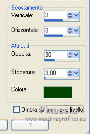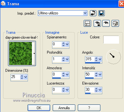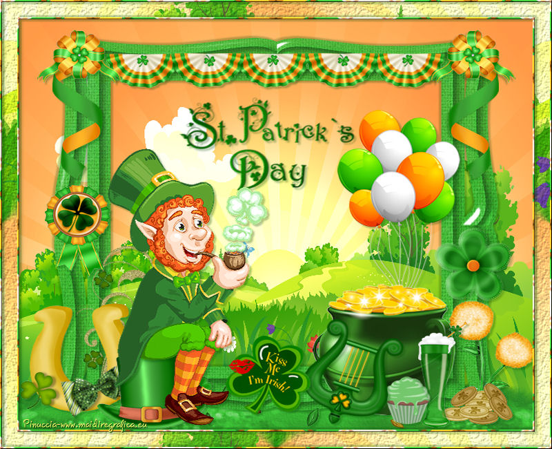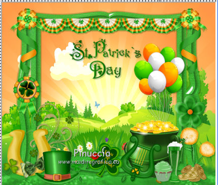 qui puoi trovare qualche risposta ai tuoi dubbi. Se l'argomento che ti interessa non è presente, ti prego di segnalarmelo. Questo tutorial è una creazione di ©Titoune e non può essere copiato su altri siti nè essere offerto per il download. Lo stesso vale per la mia traduzione. Il tutorial è stato creato con Corel18, ma può essere eseguito anche con le altre versioni di PSP. Secondo la versione utilizzata (anteriore a PSP X) potresti ottenere dei risultati differenti. Dalla versione X4, il comando Immagine>Rifletti è stato sostituito con Immagine>Capovolgi in orizzontale, e il comando Immagine>Capovolgi con Immagine>Capovolgi in verticale. Nelle versioni X5 e X6, le funzioni sono state migliorate rendendo disponibile il menu Oggetti. Con il nuovo X7 sono tornati i comandi Rifletti/Capovolgi, ma con nuove differenze. Vedi la scheda sull'argomento qui Per tradurre il tutorial ho usato PSP X. Occorrente: Un tube a scelta. Il resto del materiale qui Tube utilizzato "St_Patrick_Day_Transparent_Leprechaun_with_Pipe_PNG_Picture" de Yopriceville Filtri in caso di dubbi, ricorda di consultare la mia sezione filtri qui Simple - Top Left Mirror qui ![]() Metti la trama nella cartella Trame. 1. Apri una nuova immagine trasparente 750 x 600 pixels. Selezione>Seleziona tutto. 2. Apri l'immagine shutterstock_275083409 e vai a Modifica>Copia. Torna al tuo lavoro e vai a Modifica>Incolla nella selezione. Selezione>Deseleziona. 3. Apri l'elemento grass, e vai a Modifica>Copia. Torna al tuo lavoro e vai a Modifica>Incolla come nuovo livello. Posiziona come nell'esempio.![]() Livelli>Duplica. Immagine>Rifletti. 4. Apri l'elemento hpd_FL_El6 e vai a Modifica>Copia. Torna al tuo lavoro e vai a Modifica>Incolla come nuovo livello. Lascialo come sta. 5. Effetti>Effeti geometrici>Cilindro orizzontale. ![]() 6. Attiva lo strumento Bacchetta magica ![]() e clicca al centro della cornice per selezionarla. Selezione>Modifica>Espandi - 3 pixels. 7. Livelli>Nuovo livello raster. Livelli>Disponi>Sposta giù. Attiva nuovamente l'immagine hutterstock_275083409, e vai a Modifica>Copia. Torna al tuo lavoro e vai a Modifica>Incolla nella selezione. Selezione>Deseleziona. 8. Attiva nuovamente il livello della cornice. Effetti>Effetti 3D>Sfalsa ombra, colore #054503. ![]() Ripeti l'Effetto Sfalsa ombra, cambiando verticale e orizzontale con -3. 9. Apri l'elemento hpd_FL_El10 e vai a Modifica>Copia. Torna al tuo lavoro e vai a Modifica>Incolla come nuovo livello. Spostalo nella parte superiore della cornice.Vedi l'esempio finale. Effetti>Effetti 3D>Sfalsa ombra, colore #054503. ![]() 10. Activer l'élément hpd_FL_El41 e vai a Modifica>Copia. Torna al tuo lavoro e vai a Modifica>Incolla come nuovo livello. Spostalo nella parte superiore sinistra della cornice.Vedi l'esempio finale. Effetti>Effetti 3D>Sfalsa ombra, con i settaggi precedenti. Livelli>Duplica. Immagine>Rifletti. 11. Apri l'elemento hpd_FL_El11 e vai a Modifica>Copia. Torna al tuo lavoro e vai a Modifica>Incolla come nuovo livello. Spostalo nella parte superiore sinistra della cornice.Vedi l'esempio finale. Effetti>Effetti 3D>Sfalsa ombra, con i settaggi precedenti. Livelli>Duplica. Immagine>Rifletti. 12. Apri l'elemento St_Patricks_Day_Green_PNG_Clipart e vai a Modifica>Copia. Torna al tuo lavoro e vai a Modifica>Incolla come nuovo livello. Spostalo nel paesaggio.Vedi l'esempio finale. Effetti>Effetti 3D>Sfalsa ombra, con i settaggi precedenti. 13. Apri l'elemento hpd_FL_El32 e vai a Modifica>Copia. Torna al tuo lavoro e vai a Modifica>Incolla come nuovo livello. Spostalo nella parte destra della cornice.Vedi l'esempio finale. Effetti>Effetti 3D>Sfalsa ombra, con i settaggi precedenti. 14. Apri l'elemento hpd_FL_El45 e vai a Modifica>Copia. Torna al tuo lavoro e vai a Modifica>Incolla come nuovo livello. Spostalo nella parte inferiore della cornice.Vedi l'esempio finale. Effetti>Effetti 3D>Sfalsa ombra, con i settaggi precedenti. 15. Apri l'elemento hpd_FL_El37 e vai a Modifica>Copia. Torna al tuo lavoro e vai a Modifica>Incolla come nuovo livello. Spostalo nella parte inferiore destra della cornice.Vedi l'esempio finale. Effetti>Effetti 3D>Sfalsa ombra, con i settaggi precedenti. 16. Apri l'elemento hpd_FL_El29 e vai a Modifica>Copia. Torna al tuo lavoro e vai a Modifica>Incolla come nuovo livello. Spostalo nella parte inferiore destra della cornice.![]() Effetti>Effetti 3D>Sfalsa ombra, con i settaggi precedenti. 17. Apri l'elemento Green_Pot_of_Gold_PNG_Clipart_Image e vai a Modifica>Copia. Torna al tuo lavoro e vai a Modifica>Incolla come nuovo livello. Spostalo nella parte inferiore destra della cornice.Vedi l'esempio finale. Effetti>Effetti 3D>Sfalsa ombra, con i settaggi precedenti. 18. Apri l'elemento Irish_Balloons_Transparent_PNG_Image e vai a Modifica>Copia. Torna al tuo lavoro e vai a Modifica>Incolla come nuovo livello. Spostalo nella parte destra del paesaggio.Vedi l'esempio finale. Effetti>Effetti 3D>Sfalsa ombra, con i settaggi precedenti. Porta questo livello sotto il livello del calderone. 19. Attiva nuovamente il livello superiore. Apri l'elemento hpd_FL_El30 e vai a Modifica>Copia. Torna al tuo lavoro e vai a Modifica>Incolla come nuovo livello. Spostalo nella parte inferiore della cornice.Vedi l'esempio finale. Effetti>Effetti 3D>Sfalsa ombra, con i settaggi precedenti. 20. Apri l'elemento hpd_FL_El46 e vai a Modifica>Copia. Torna al tuo lavoro e vai a Modifica>Incolla come nuovo livello. Spostalo nella parte inferiore della cornice.Vedi l'esempio finale. Effetti>Effetti 3D>Sfalsa ombra, con i settaggi precedenti. 21. Apri l'elemento St_Patricks_Day_Green_Harp_PNG_Clipart e vai a Modifica>Copia. Torna al tuo lavoro e vai a Modifica>Incolla come nuovo livello. Spostalo nella parte inferiore della cornice.Vedi l'esempio finale. Effetti>Effetti 3D>Sfalsa ombra, con i settaggi precedenti. Livelli>Duplica. Immagine>Rifletti. 22. Apri l'elemento Transparent_Small_Shamrock_Kiss_me_I_am_Irish_PNG_Picture e vai a Modifica>Copia. Torna al tuo l