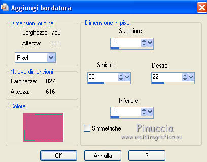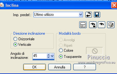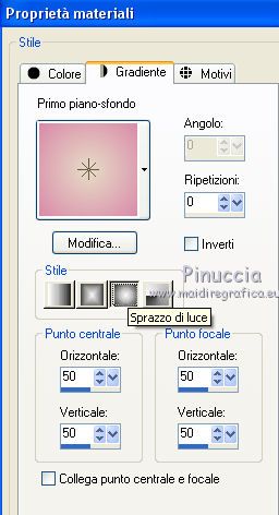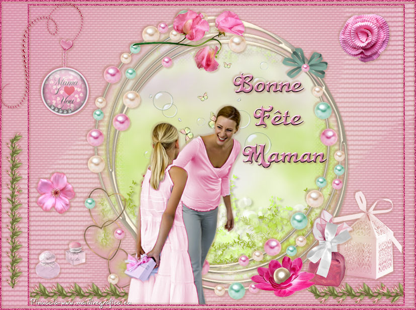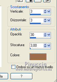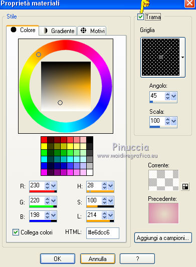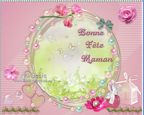 qui puoi trovare qualche risposta ai tuoi dubbi. Se l'argomento che ti interessa non è presente, ti prego di segnalarmelo. Questo tutorial è una creazione di ©Titoune e non può essere copiato su altri siti nè essere offerto per il download. Lo stesso vale per la mia traduzione. Il tutorial è stato creato con Corel17, ma può essere eseguito anche con le altre versioni di PSP. Secondo la versione utilizzata (anteriore a PSP X) potresti ottenere dei risultati differenti. Dalla versione X4, il comando Immagine>Rifletti è stato sostituito con Immagine>Capovolgi in orizzontale, e il comando Immagine>Capovolgi con Immagine>Capovolgi in verticale. Nelle versioni X5 e X6, le funzioni sono state migliorate rendendo disponibile il menu Oggetti. Con il nuovo X7 sono tornati i comandi Rifletti/Capovolgi, ma con nuove differenze. Vedi la scheda sull'argomento qui Per tradurre il tutorial ho usato PSP X. Occorrente: Un tube a scelta. Il resto del materiale qui Tube utilizzato "MR_Cadeau pour Maman" de Maryse ![]() 1. Imposta il colore di primo piano con #e6dcc6 e il colore di sfondo con #d989a9. 2. Passa il colore di primo piano a Gradiente di primo piano/sfondo, stile Lineare. ![]() 3. Apri una nuova immagine trasparente de 750 x 600 pixels. Riempi l'immagine con il gradiente.4. Apri l'elemento Beaded Frame_1 e vai a Modifica>Copia. Torna al tuo lavoro e vai a Modifica>Incolla come nuovo livello. Non spostarlo. 5. Attiva lo strumento Bacchetta magica ![]() e clicca nella parte esterna alla cornice per selezionarla. ![]() Apri la paletta del colore di primo piano e seleziona Trama. Imposta la trama Griglia con i seguenti settaggi. ![]() 6. Livelli>Nuovo livello raster. Riempi con il colore tramato (clicca 2 volte).7. Effetti>Effetti geometrici>Inclina. ![]() Selezione>Deseleziona. 8. Effetti>Effetti di distorsione>Vento. ![]() 9. Effetti>Effetti 3D>Sfalsa ombra, colore #a06b4c. ![]() Porta questo livello sopra il livello Raster 1. Livelli>Unisci>Unisci giù. 10. Attiva nuovamente il livello della cornice. Attiva lo strumento Bacchetta magica ![]() e clicca al centro della cornice per selezionarla. 11. Selezione>Modifica>Espandi - 3 pixels. Attiva il livello del colore tramato. Premi sulla tastiera il tasto CANC ![]() Selezione>Deseleziona. 12. Attiva nuovamente il livello della cornice. Effetti>Effetti 3D>Sfalsa ombra, colore #a06b4c. ![]() Ripeti l'Effetto Sfalsa ombra, cambiando verticale e orizzontale con -3. 13. Attiva il livello della cornice. Ancora attiva lo strumento Bacchetta magica ![]() e clicca all'esterno della cornice per selezionarla. Selezione>Inverti. 14. Selezione>Modifica>Contrai - 25 pixels. Selezione>Modifica>Sfuma - 25 pixels. Livelli>Nuovo livello raster. Livelli>Disponi>Sposta giù. 15. Apri l'elemento cajoline_happymothersday_pap3 e vai a Modifica>Copia. Torna al tuo lavoro e vai a Modifica>Incolla nella selezione. Selezione>Deseleziona. 16. Apri l'elemento cajoline_happymothersday_el55 e vai a Modifica>Copia. Torna al tuo lavoro e vai a Modifica>Incolla come nuovo livello. Posiziona al centro della cornice.Vedi l'esempio finale. Effetti>Effetti 3D>Sfalsa ombra, colore #a06b4c. ![]() Dovresti avere questo. ![]() 17. Attiva il livello della cornice. Apri l'elemento cajoline_happymothersday_el51 e vai a Modifica>Copia. Torna al tuo lavoro e vai a Modifica>Incolla come nuovo livello. Posiziona nella parte superiore della cornice.Vedi l'esempio finale. Effetti>Effetti 3D>Sfalsa ombra, con i settaggi precedenti. 18. Apri l'elemento cajoline_happymothersday_el45 e vai a Modifica>Copia. Torna al tuo lavoro e vai a Modifica>Incolla come nuovo livello. Spostalo nella parte superiore destra della cornice.Vedi l'esempio finale. Effetti>Effetti 3D>Sfalsa ombra, con i settaggi precedenti. 19. Apri l'elemento 8flower swag e vai a Modifica>Copia. Torna al tuo lavoro e vai a Modifica>Incolla come nuovo livello. Spostalo in basso.![]() Effetti>Effetti 3D>Sfalsa ombra, con i settaggi precedenti. 20. Apri l'elemento cajoline_happymothersday_el60 e vai a Modifica>Copia. Torna al tuo lavoro e vai a Modifica>Incolla come nuovo livello. Spostalo in basso a destra.du frame Vedi l'esempio finale. Effetti>Effetti 3D>Sfalsa ombra, con i settaggi precedenti. 21. Apri l'elemento cajoline_happymothersday_el63 e vai a Modifica>Copia. Torna al tuo lavoro e vai a Modifica>Incolla come nuovo livello. Spostalo in basso a destra.du frame Vedi l'esempio finale. Effetti>Effetti 3D>Sfalsa ombra, con i settaggi precedenti. 22. Apri l'elemento cajoline_happymothersday_el34 e vai a Modifica>Copia. Torna al tuo lavoro e vai a Modifica>Incolla come nuovo livello. Spostalo in basso a destra.du frame Vedi l'esempio finale. Effetti>Effetti 3D>Sfalsa ombra, con i settaggi precedenti. 23. Apri l'elemento cajoline_happymothersday_el67 e vai a Modifica>Copia. Torna al tuo lavoro e vai a Modifica>Incolla come nuovo livello. Spostalo in basso a sinistra.du frame Vedi l'esempio finale. Effetti>Effetti 3D>Sfalsa ombra, con i settaggi precedenti. 24. Apri l'elemento cajoline_happymothersday_el72 e vai a Modifica>Copia. Torna al tuo lavoro e vai a Modifica>Incolla come nuovo livello. Spostalo nella parte sinistra della cornice.Vedi l'esempio finale. Effetti>Effetti 3D>Sfalsa ombra, con i settaggi precedenti. 25. Apri i tre elementi "wordart" e vai a Modifica>Copia. Torna al tuo lavoro e vai a Modifica>Incolla come nuovo livello. Posiziona gli elementi nella cornice a tuo piacimento,o vedi il mio esempio. ![]() Sui tre livelli: Effetti>Effetti 3D>Sfalsa ombra, con i settaggi precedenti. 26. Apri il tuo tube e vai a Modifica>Copia. Torna al tuo lavoro e vai a Modifica>Incolla come nuovo livello. Immagine>Ridimensiona, se e quanto necessario, tutti i livelli non selezionato. Spostalo come preferisci, o vedi il mio esempio.Effetti>Effetti 3D>Sfalsa ombra, con i settaggi precedenti. 27. Assicurati di essere posizionato sul livello superiore. Livelli>Nuovo livello raster. Imposta il color di primo piano con #cc5285, e riempi il liv
